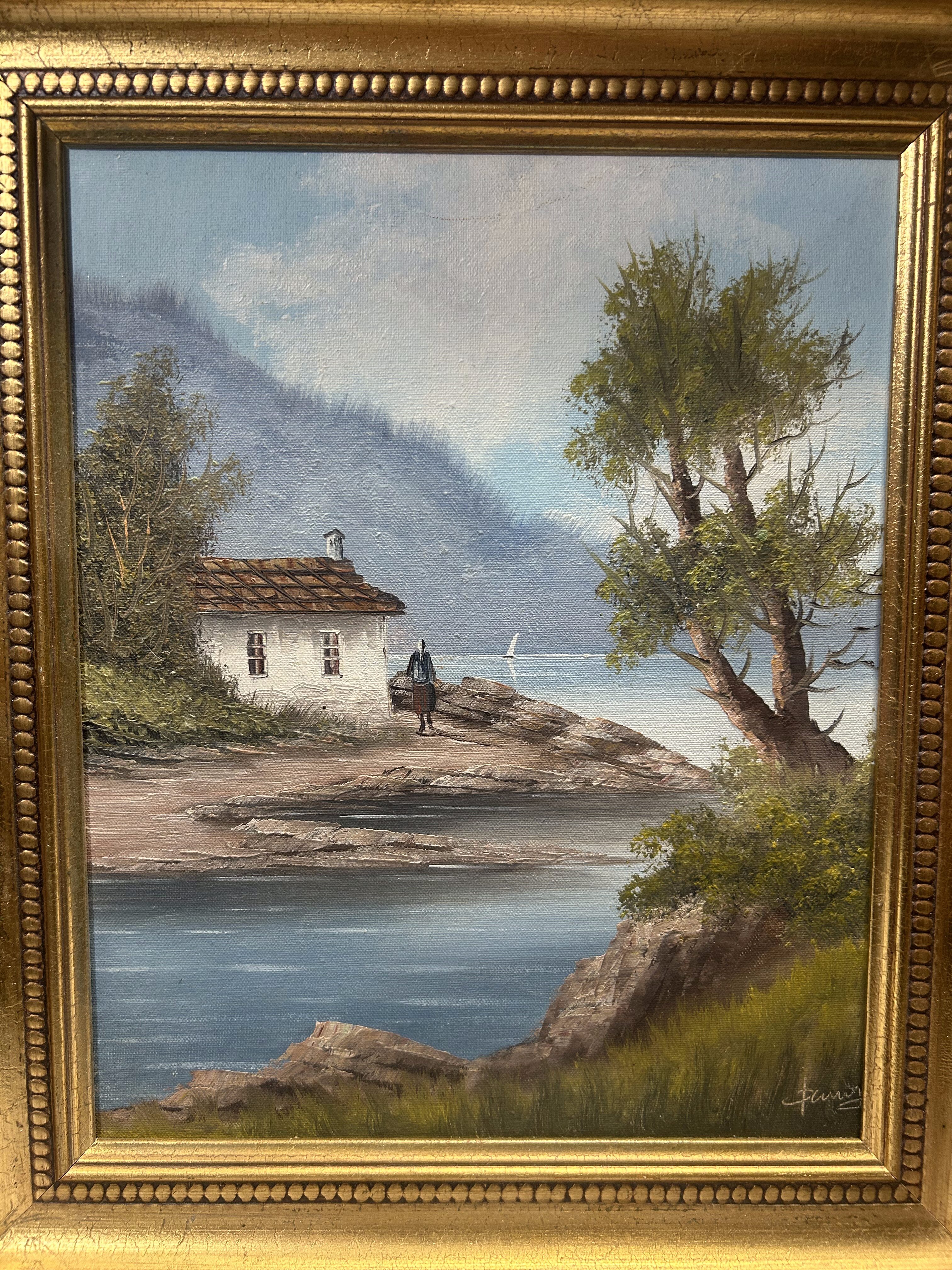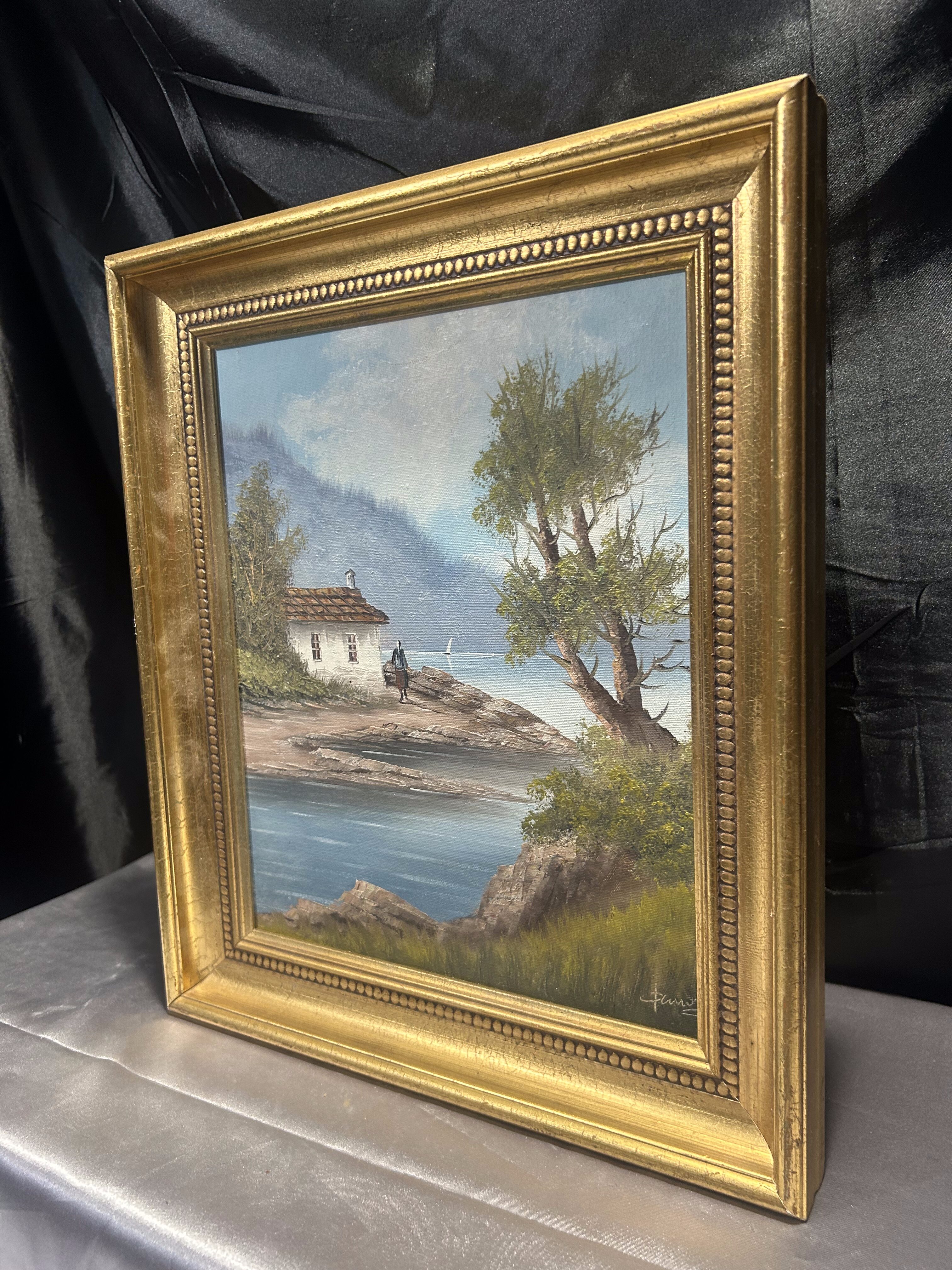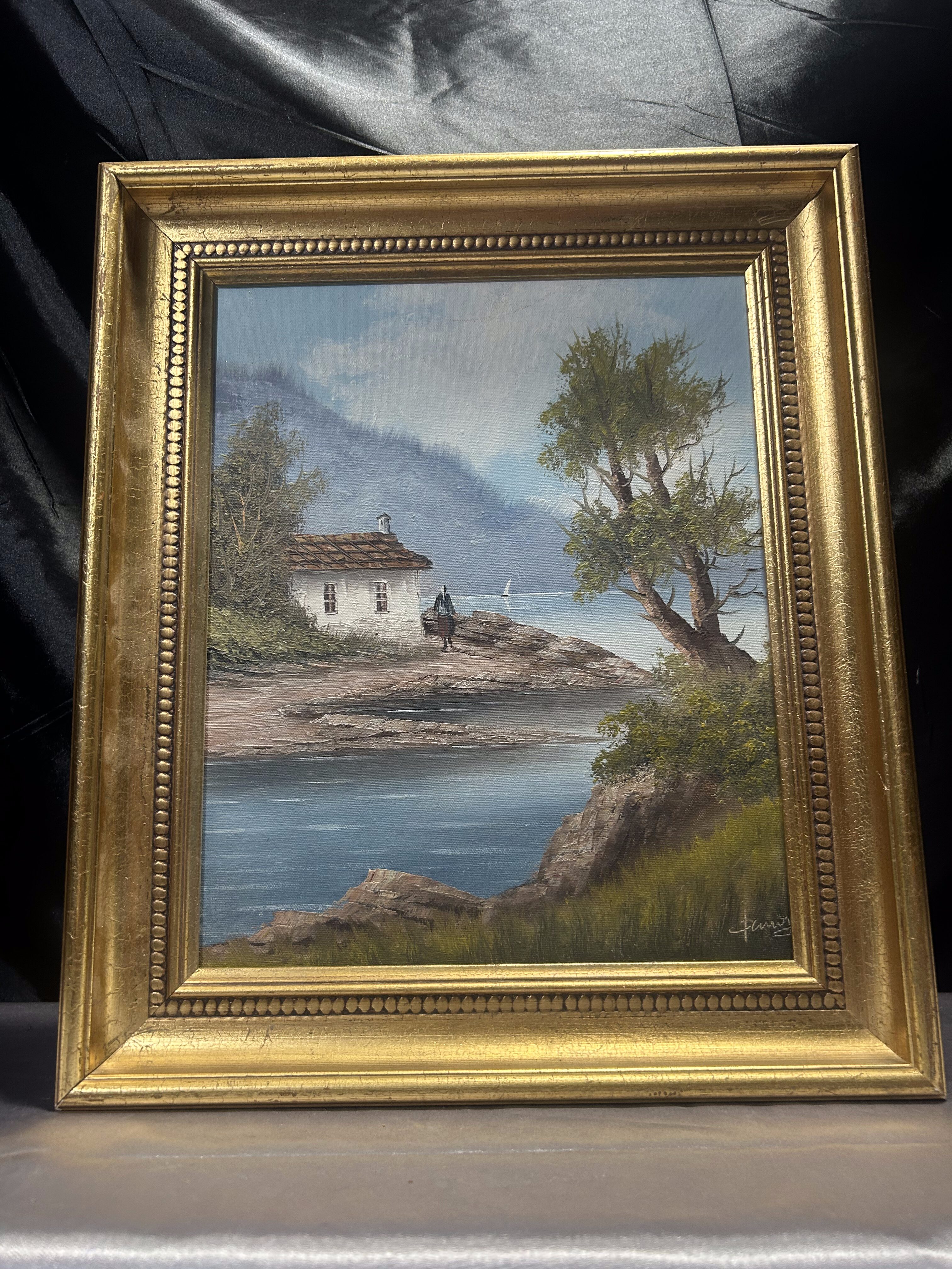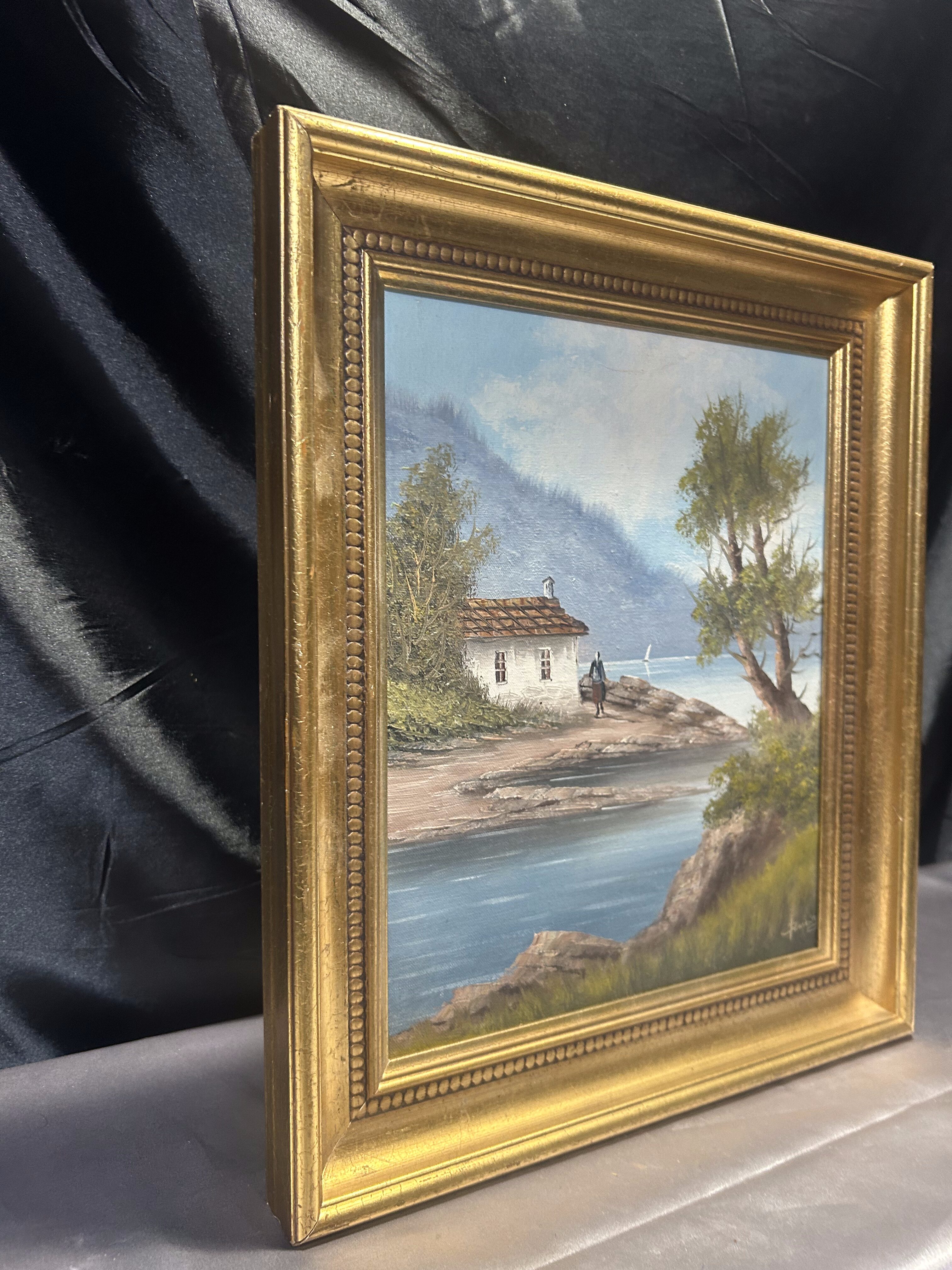 - Obraz – Pejzaż z domkiem nad brzegiem – olej na płótnie w złotej ramie