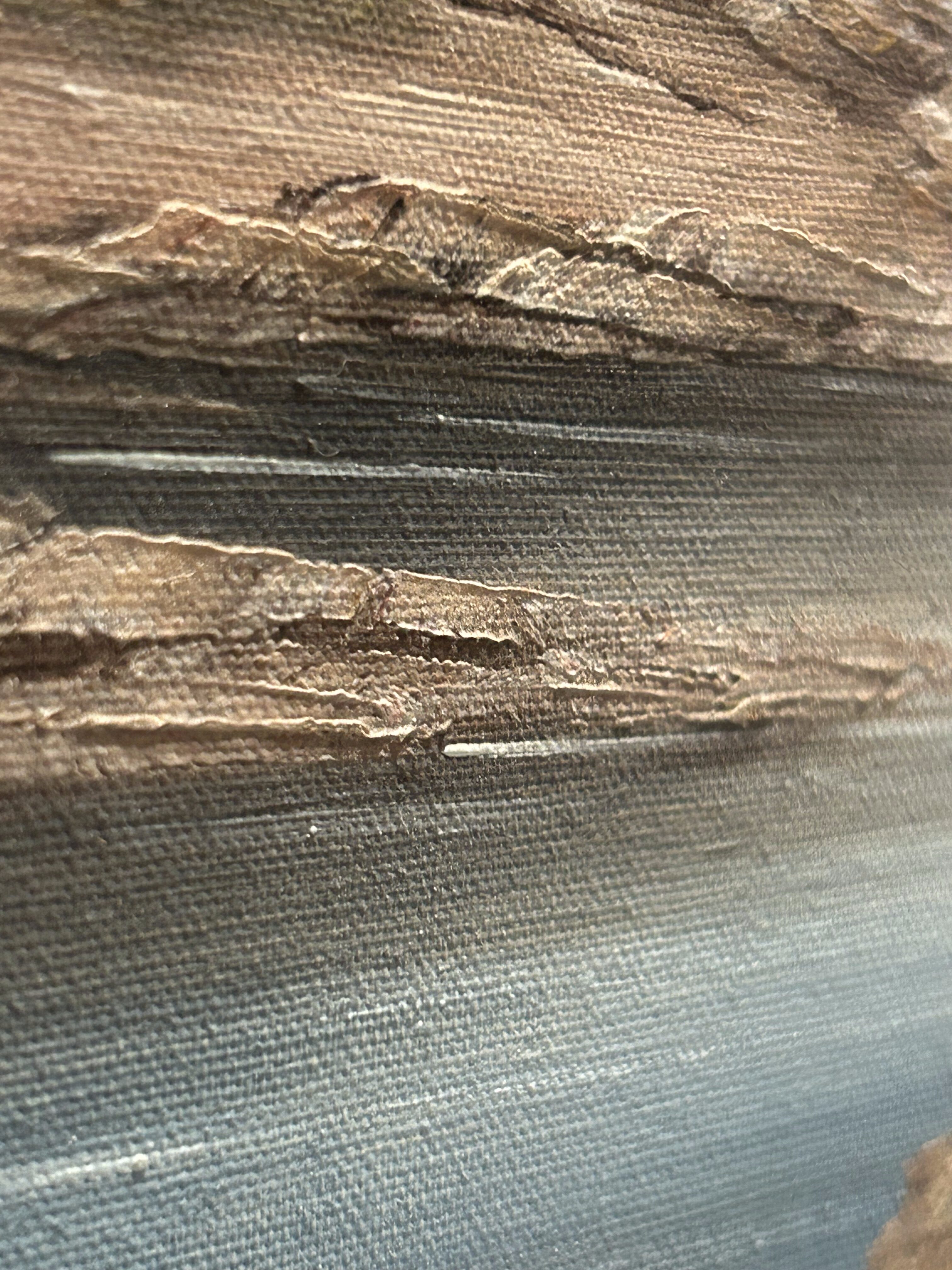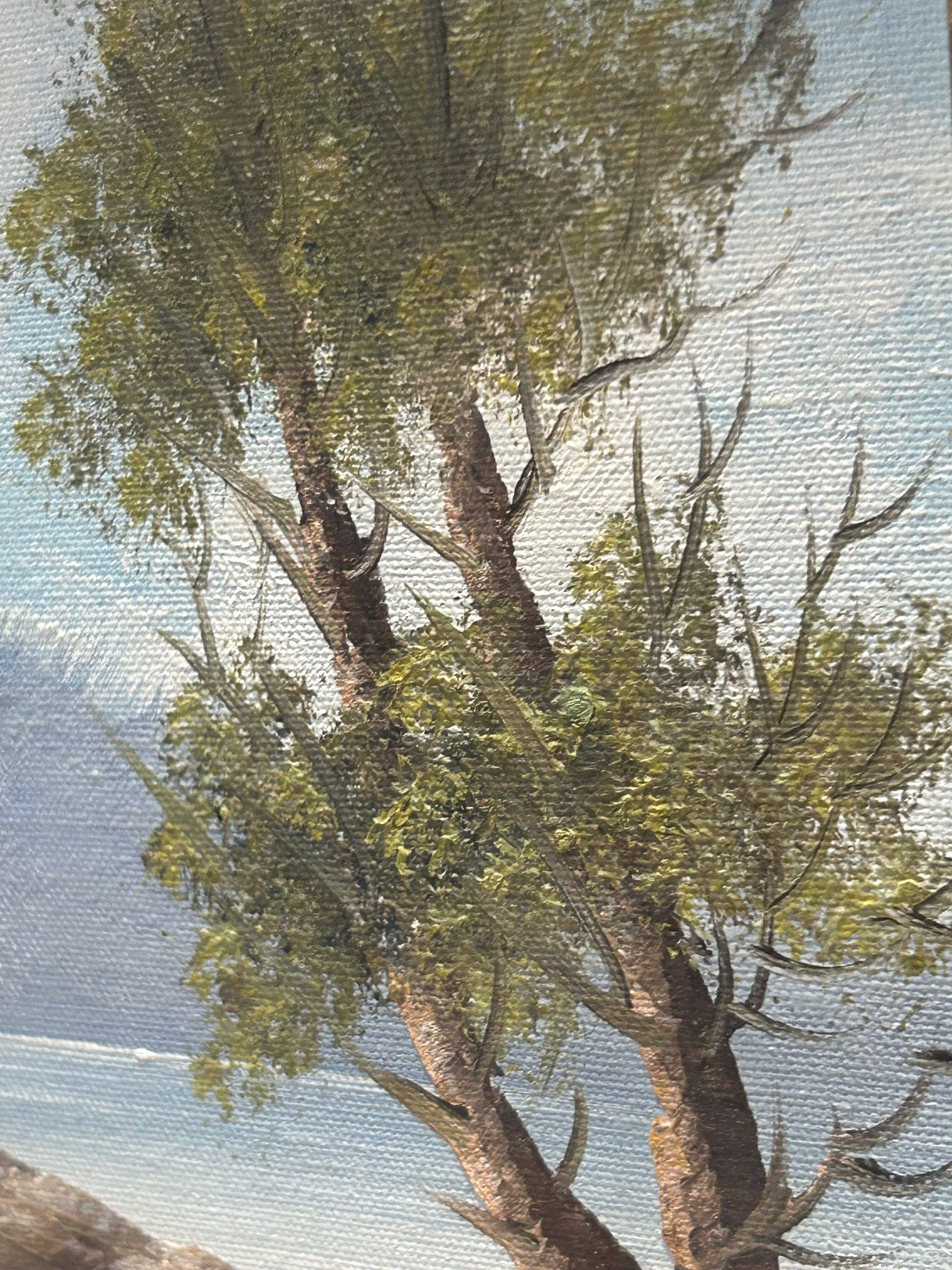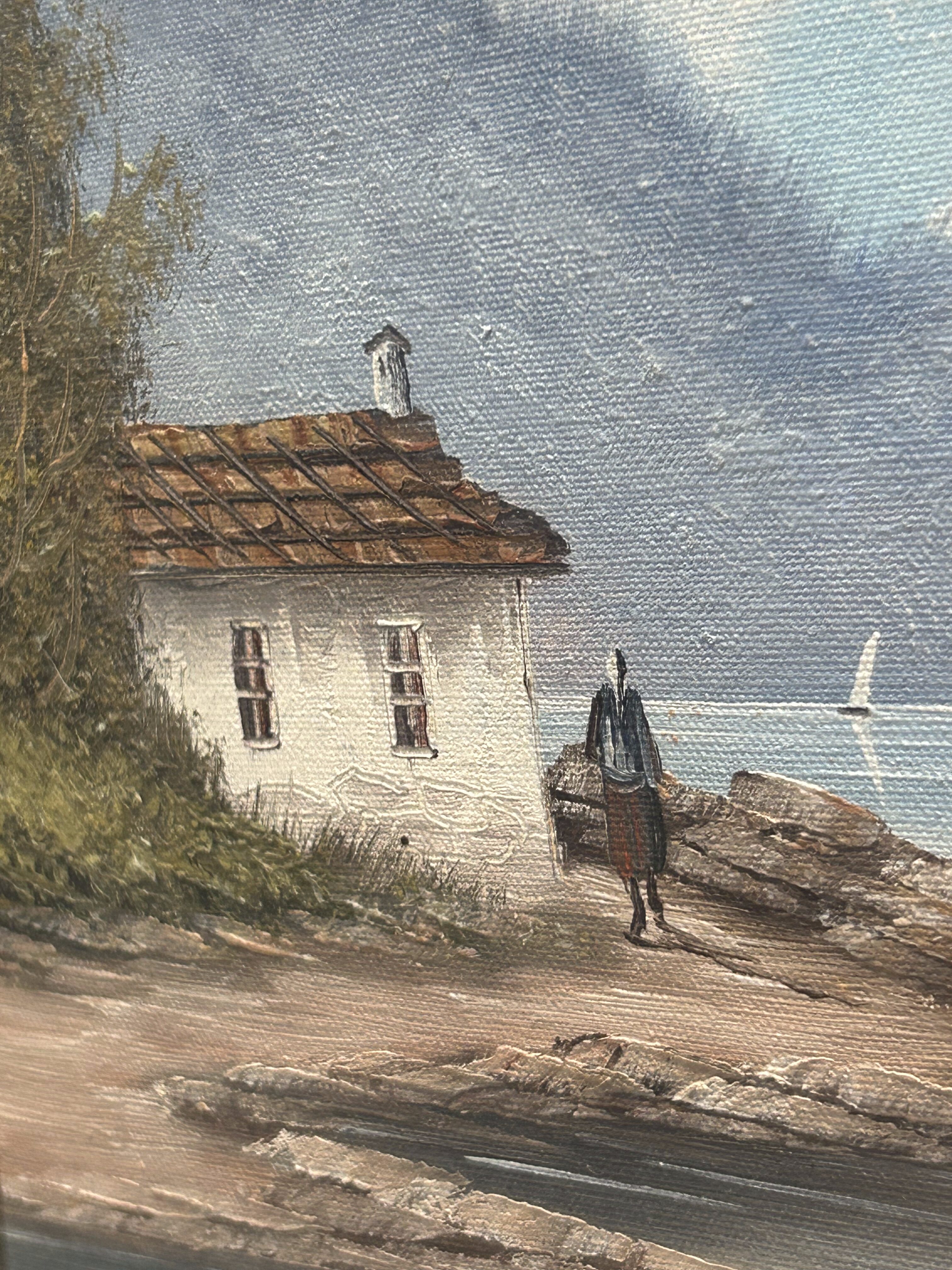 Malowniczy obraz olejny przedstawiający spokojny pejzaż z białym domkiem nad brzegiem wody. Scena utrzymana w kojących, naturalnych tonacjach – idealna do wnętrz w stylu klasycznym, rustykalnym lub vintage. Obraz wzbudza pozytywne emocje i przywołuje na myśl ciszę poranka nad jeziorem. Sygnowany, choć podpis autora jest nieczytelny.