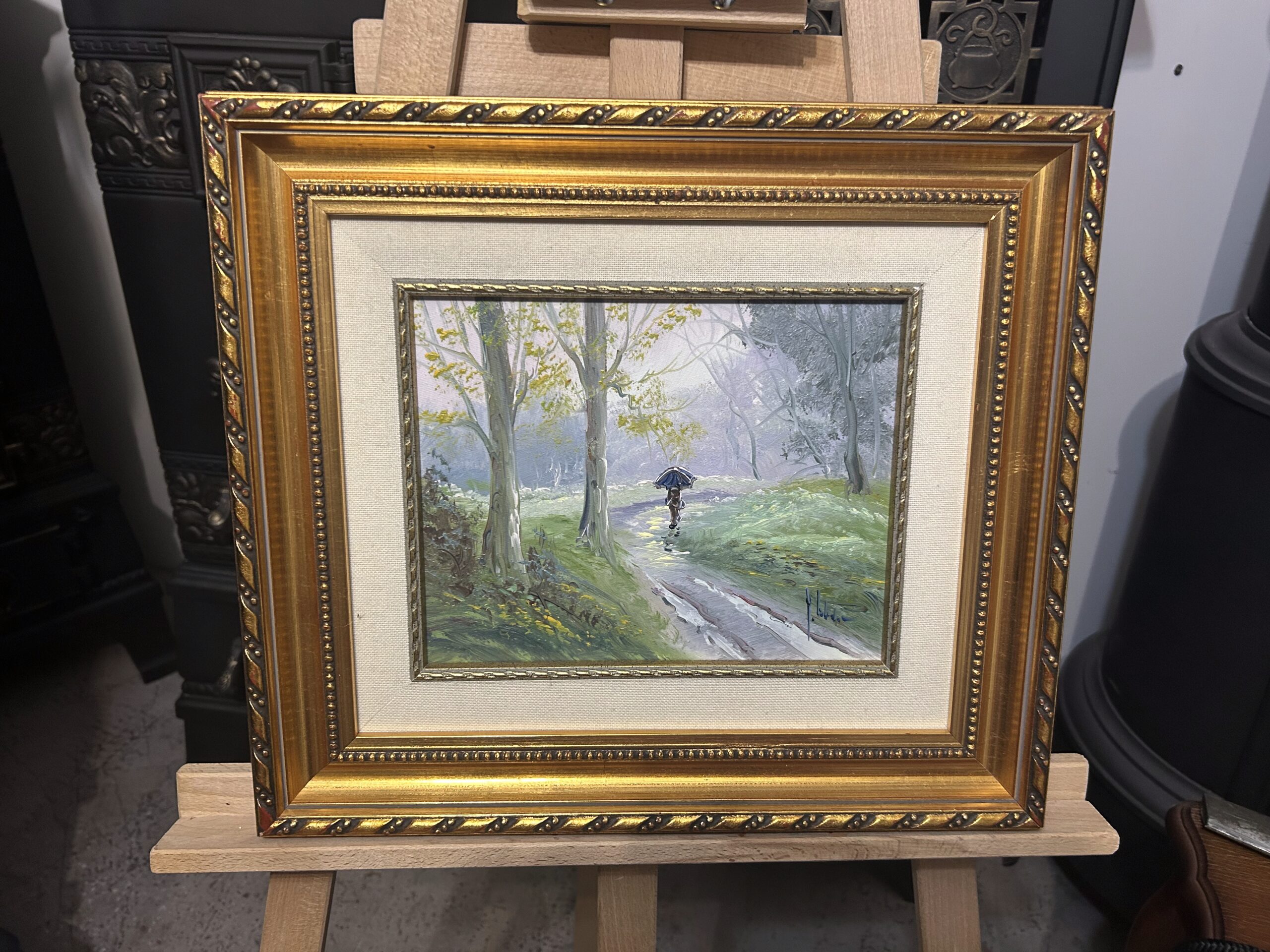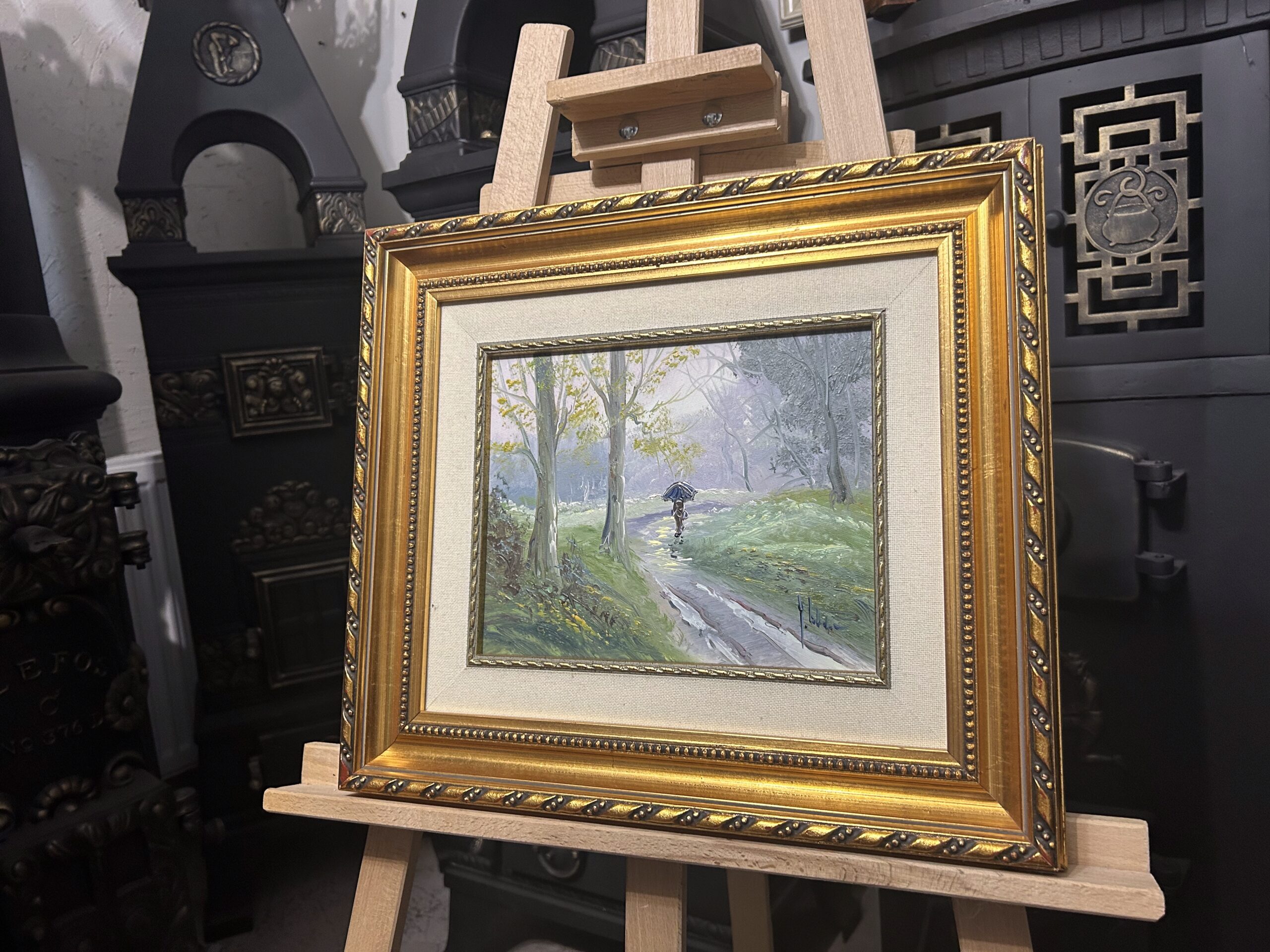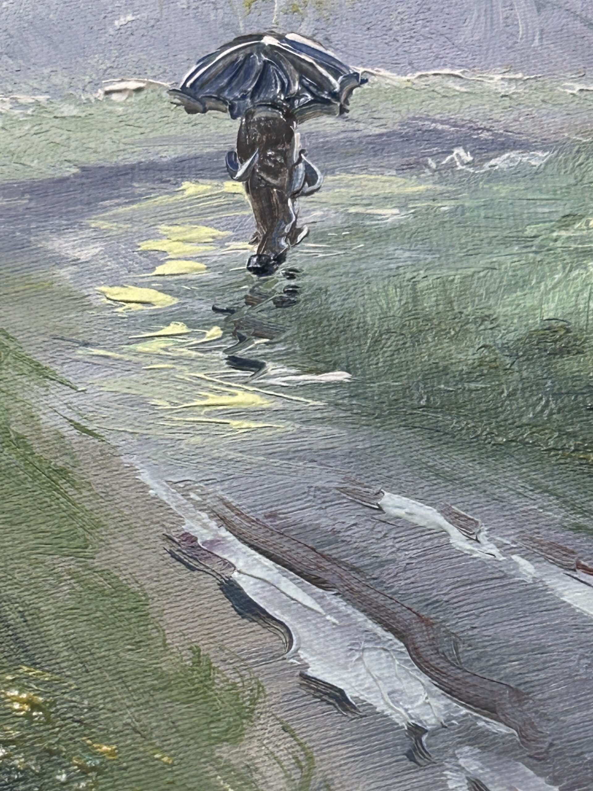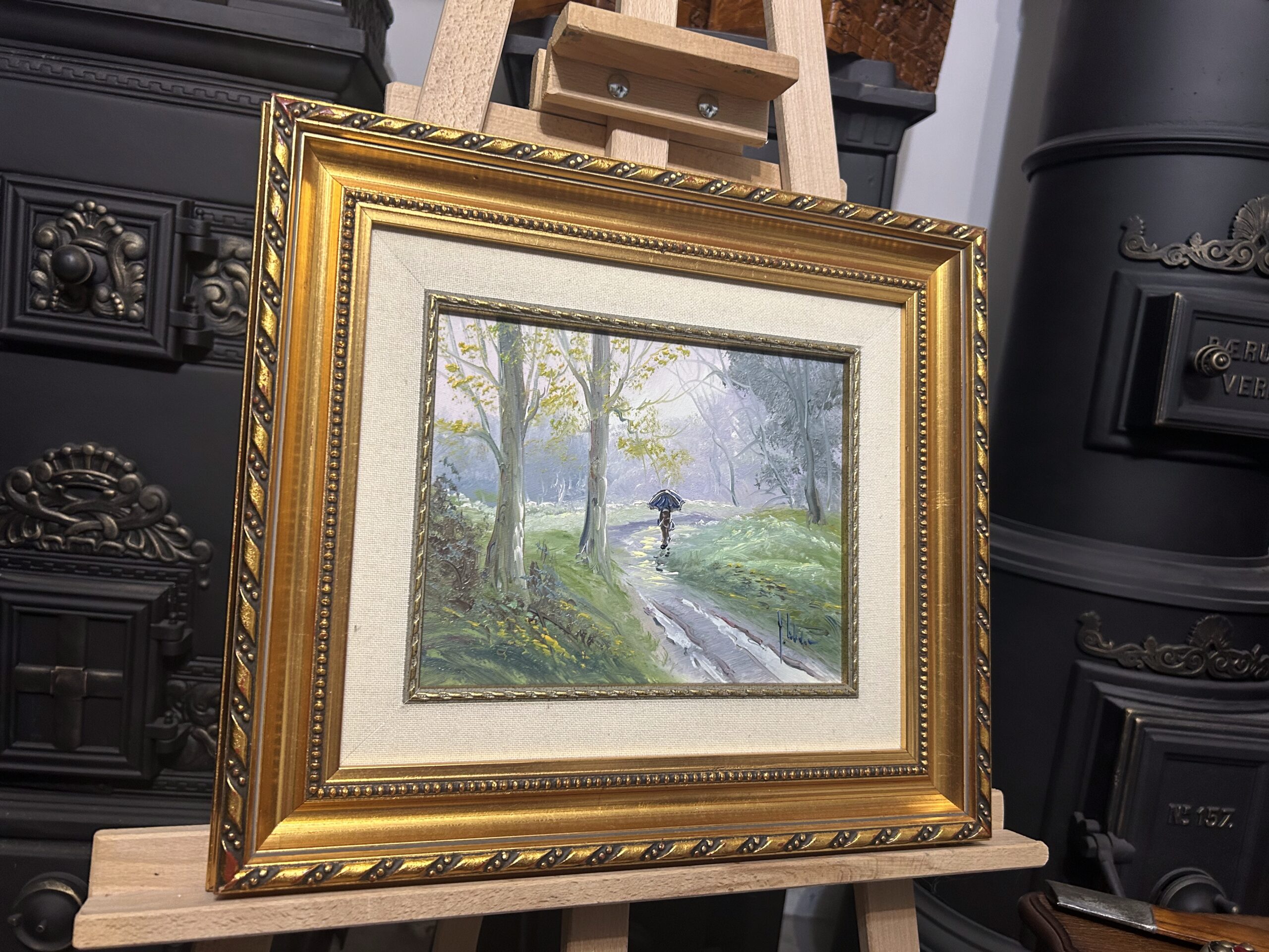 Klimatyczny obraz wykonany techniką oleju na płótnie, przedstawiający postać z parasolem idącą spokojną ścieżką przez malowniczy las. Scena emanuje ciszą i harmonią, oddając atmosferę deszczowego poranka lub mglistych letnich godzin. Subtelne barwy zieleni i szarości łączą się z delikatnymi refleksami światła przebijającymi się przez korony drzew.