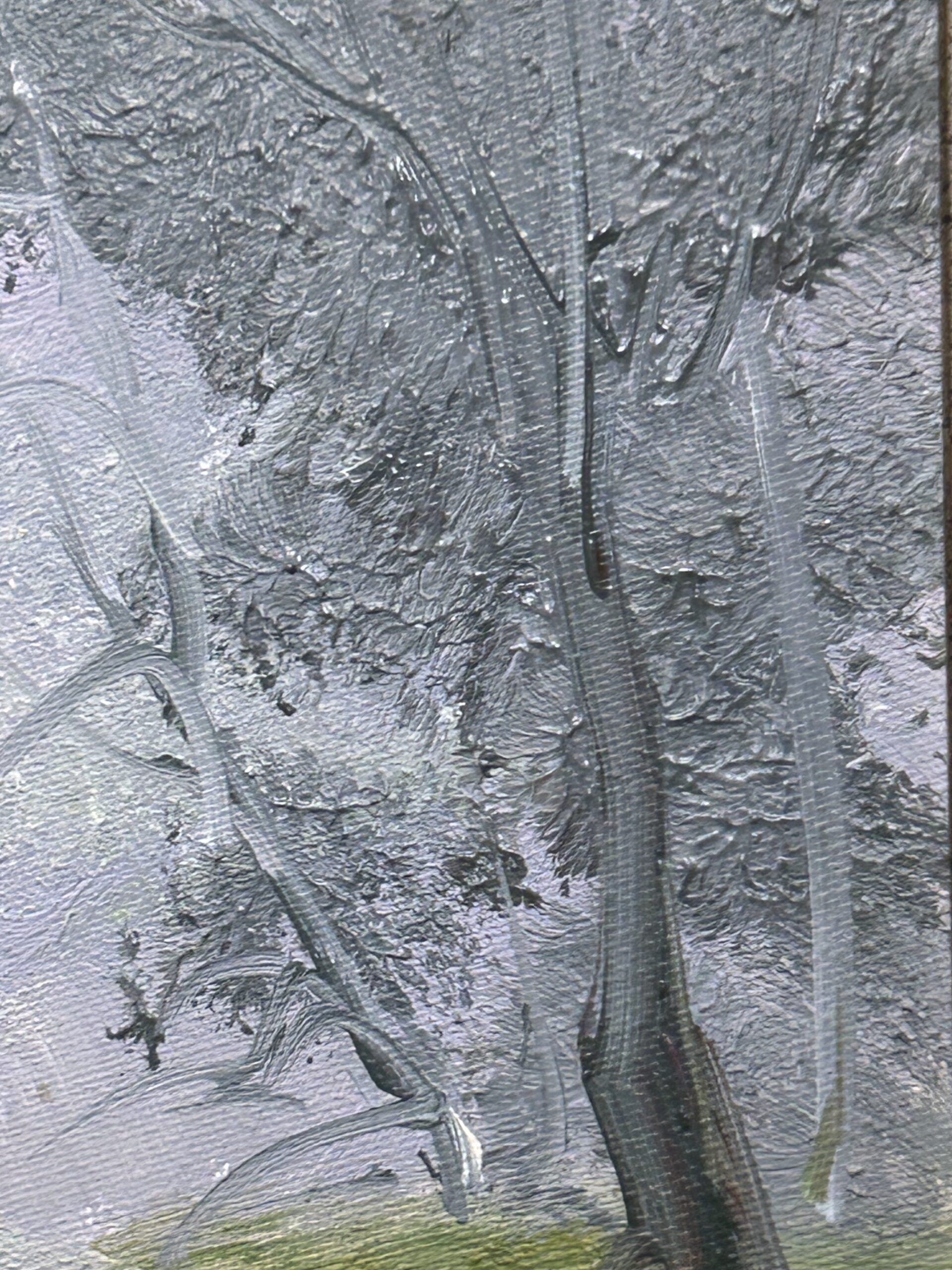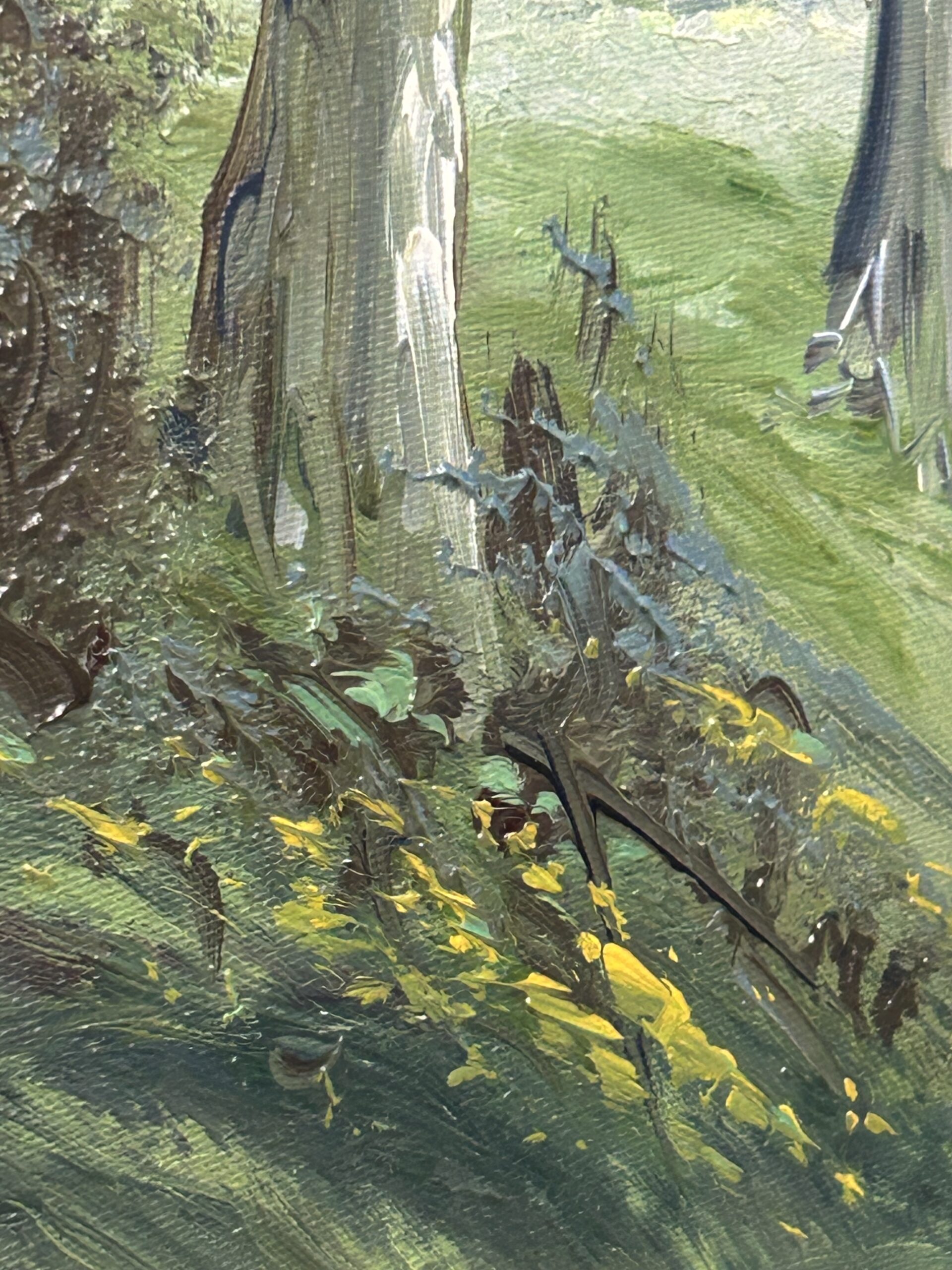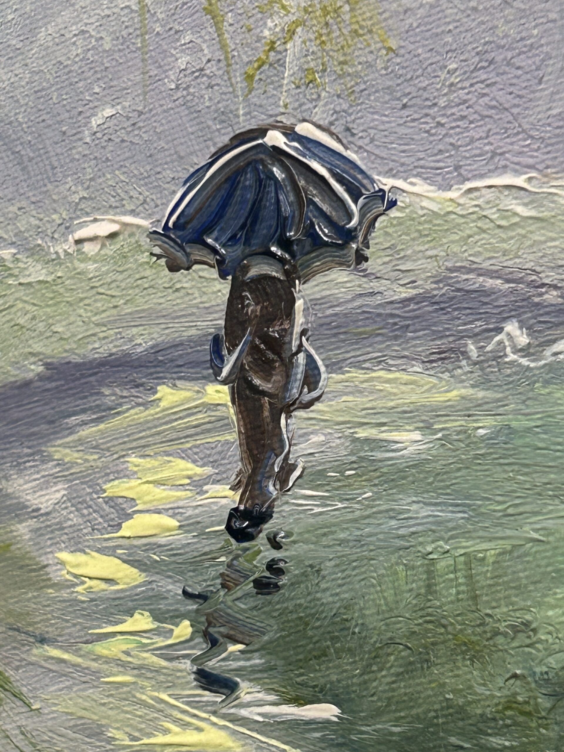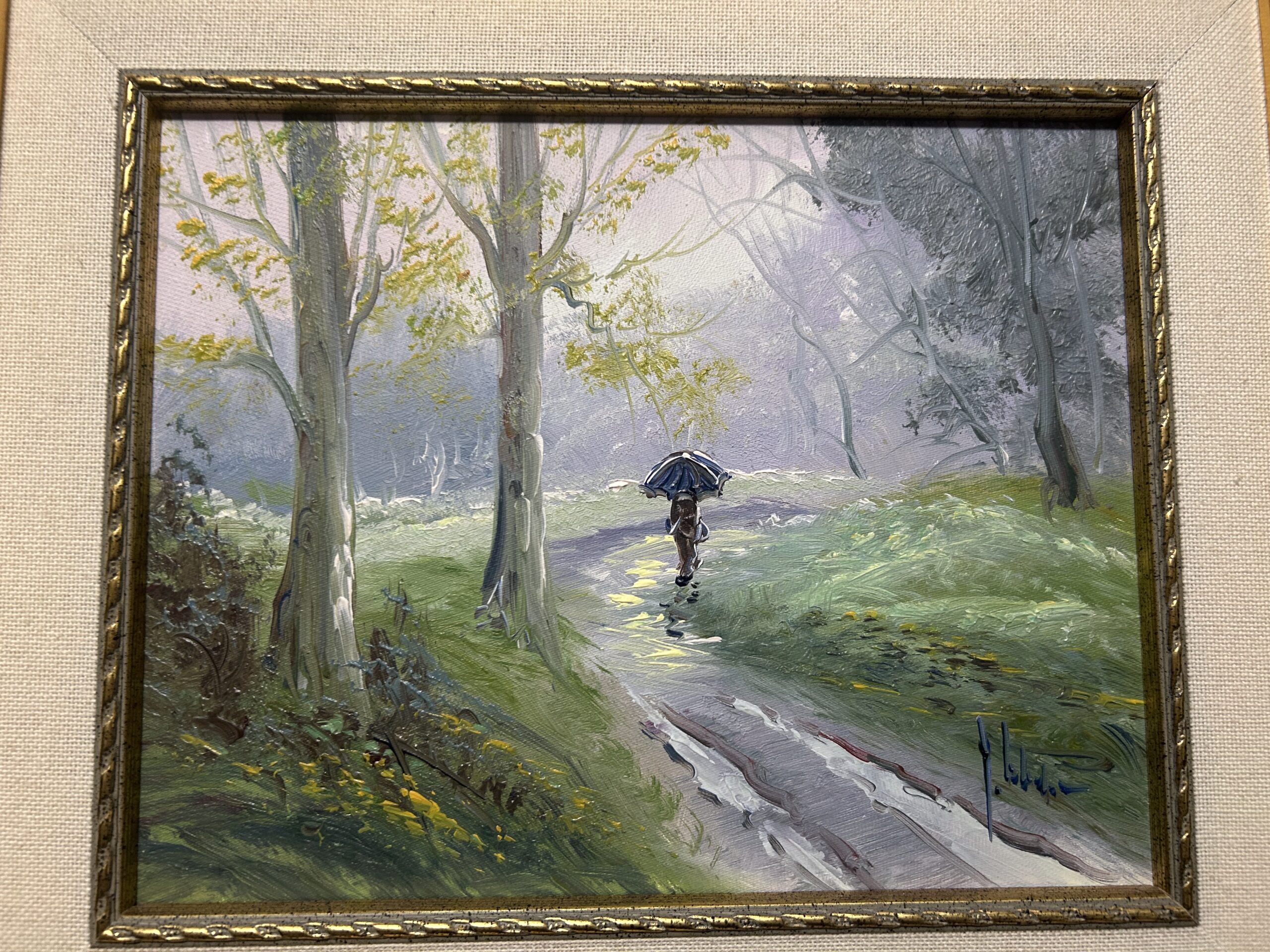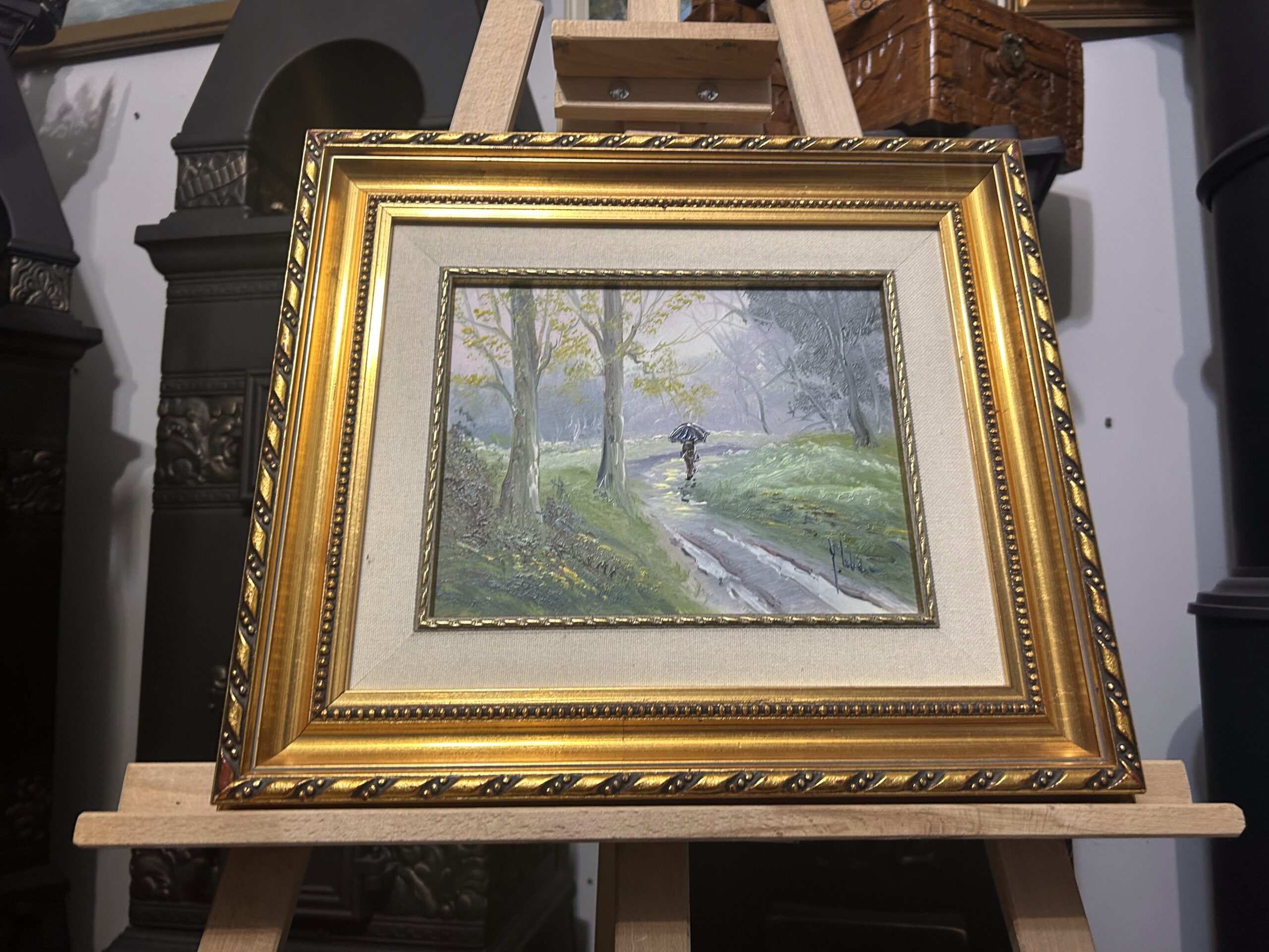 Klimatyczny obraz wykonany techniką oleju na płótnie, przedstawiający postać z parasolem idącą spokojną ścieżką przez malowniczy las. Scena emanuje ciszą i harmonią, oddając atmosferę deszczowego poranka lub mglistych letnich godzin. Subtelne barwy zieleni i szarości łączą się z delikatnymi refleksami światła przebijającymi się przez korony drzew.