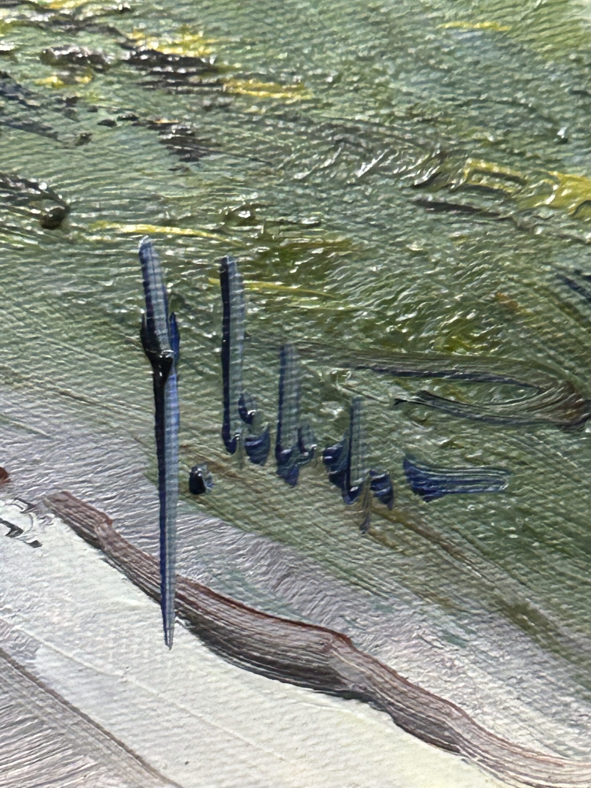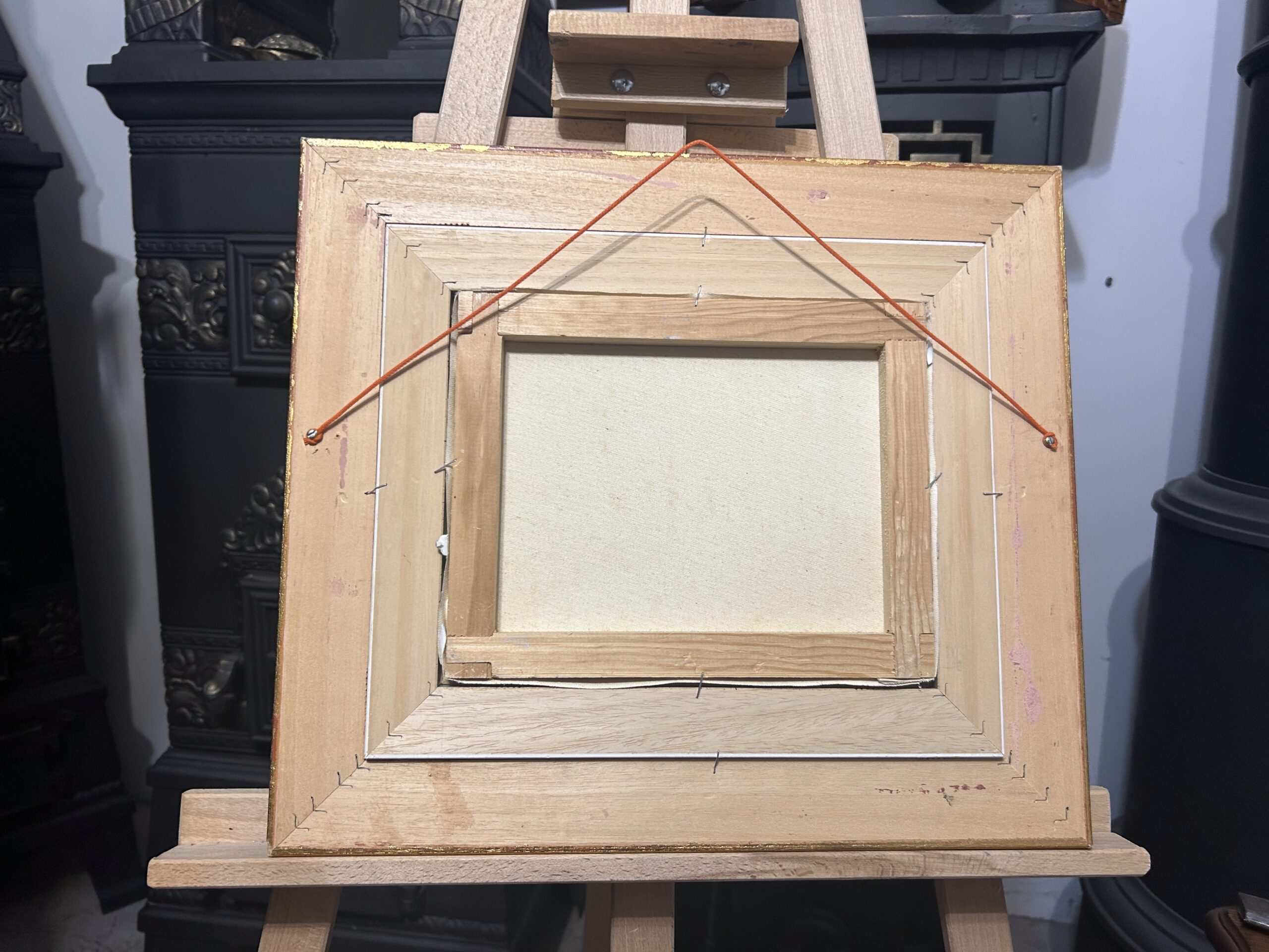 Obraz oprawiony jest w złotą, rzeźbioną ramę, która nadaje całości eleganckiego i klasycznego charakteru. Sygnatura autora widoczna w dolnym prawym rogu, choć trudna do odczytania, podkreśla oryginalność dzieła.