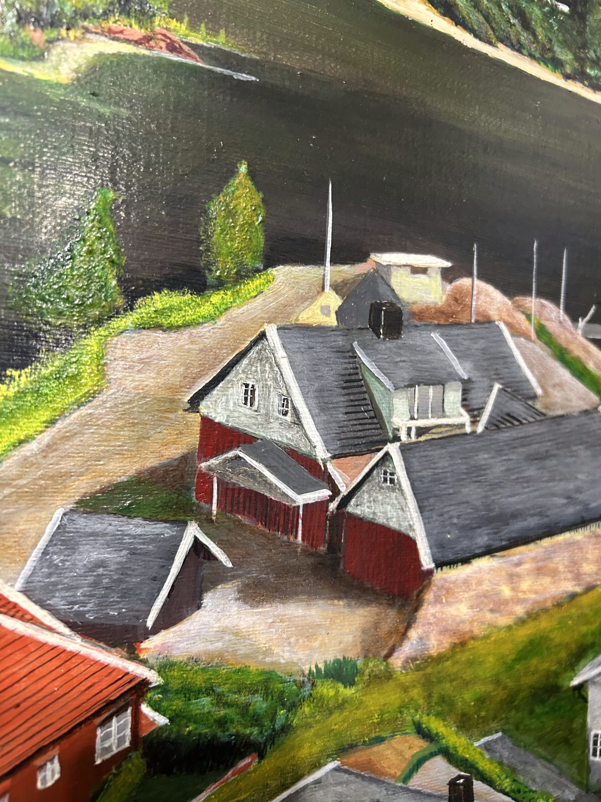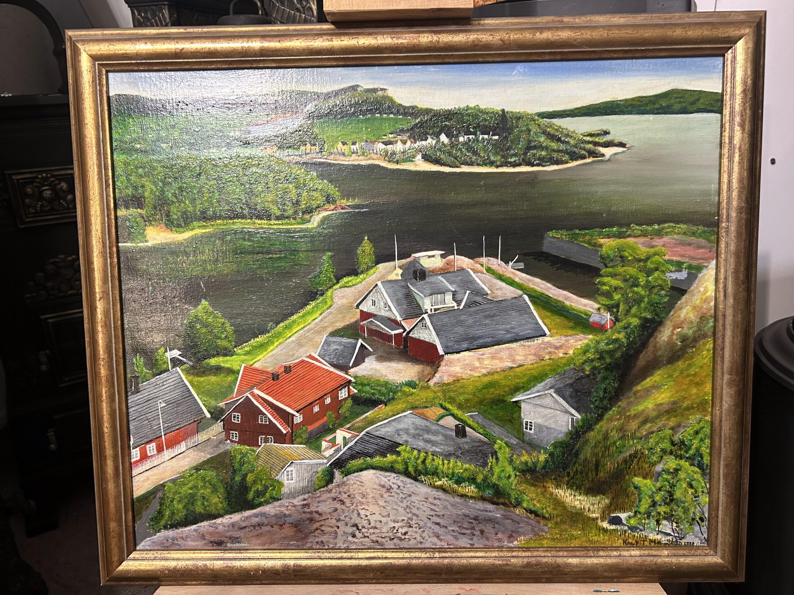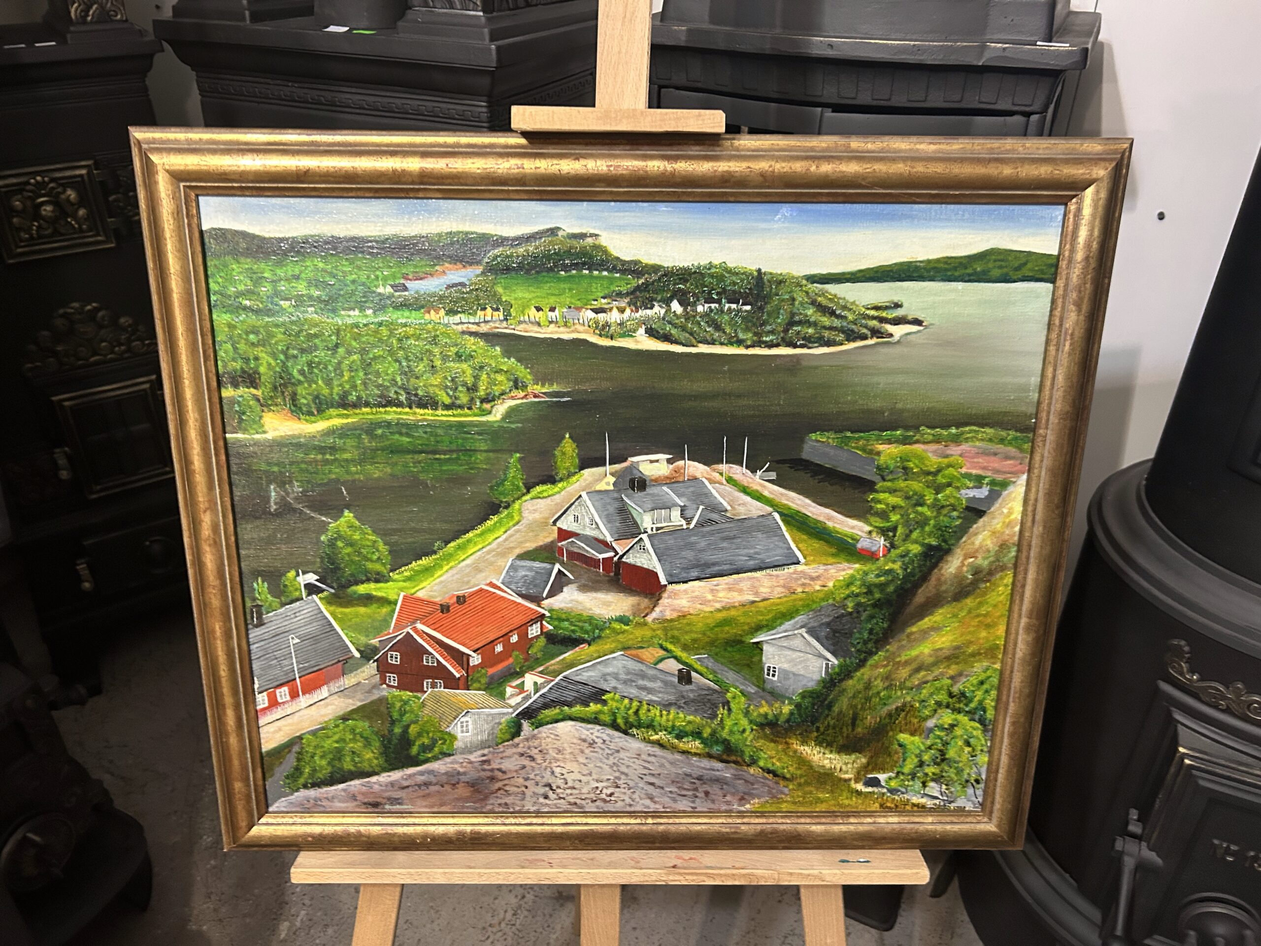 Nastrojowy obraz wykonany techniką oleju na płótnie, przedstawiający malowniczą uliczkę nad norweskim fjordem. Scena oddaje urok skandynawskiego krajobrazu, z charakterystycznymi budynkami i drogą prowadzącą w stronę majestatycznej przyrody. Kompozycja w stonowanych barwach wprowadza spokojny, a jednocześnie tajemniczy nastrój norweskich wybrzeży.