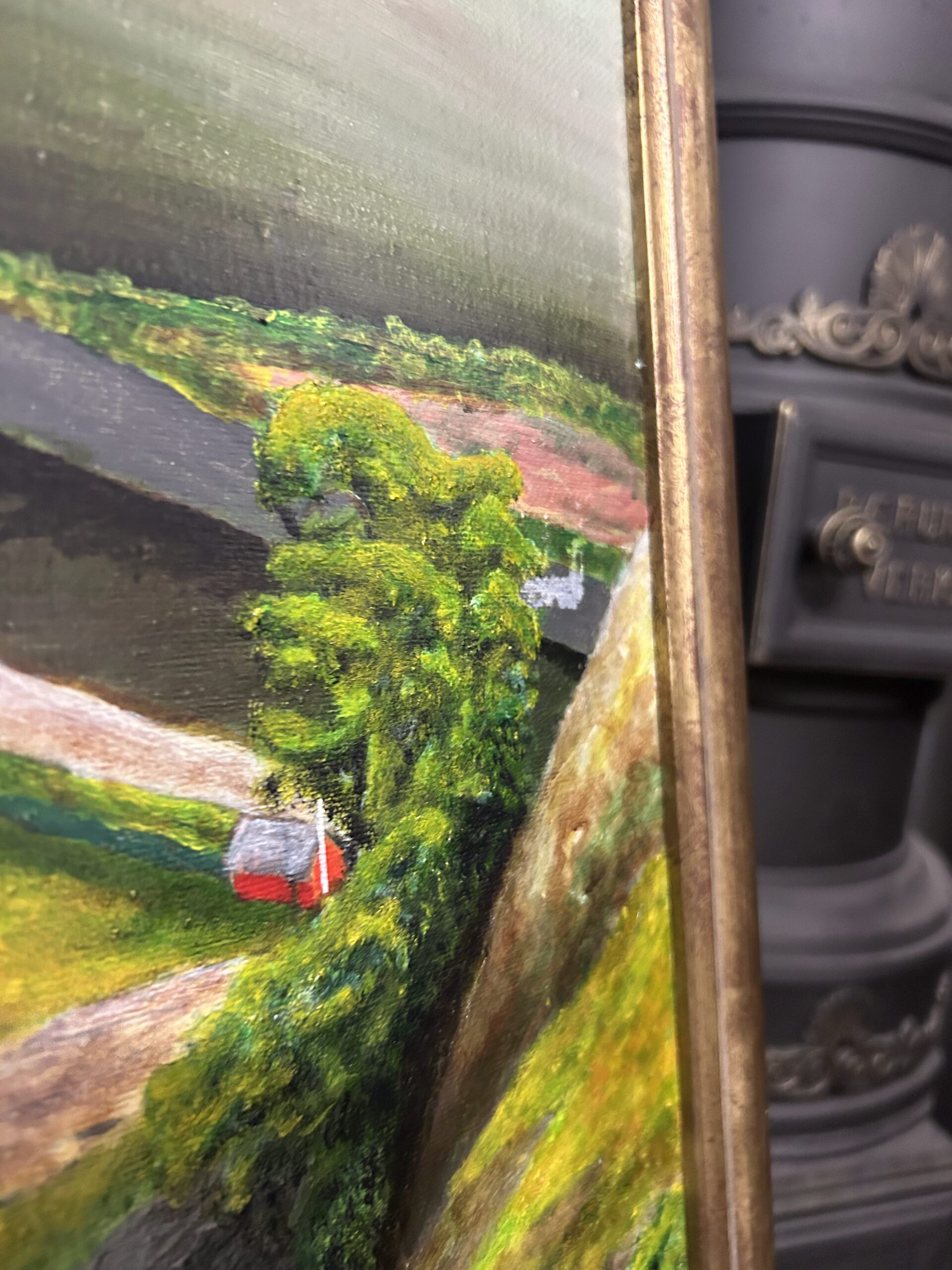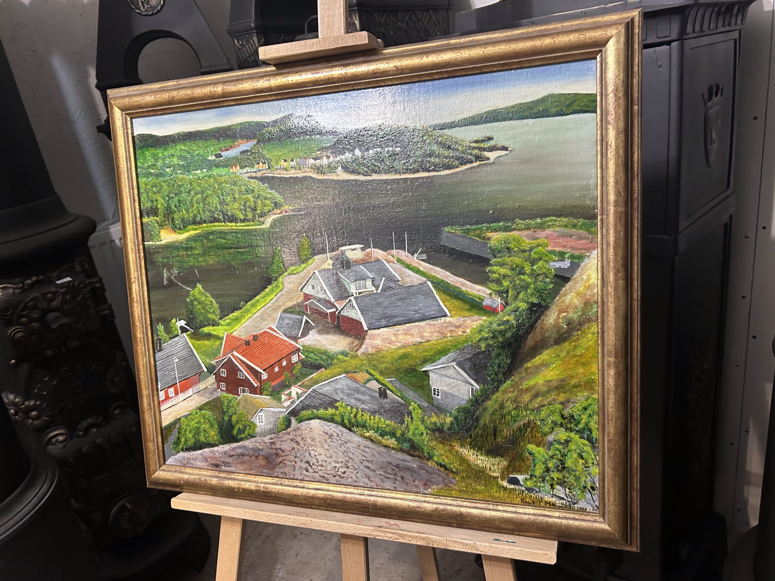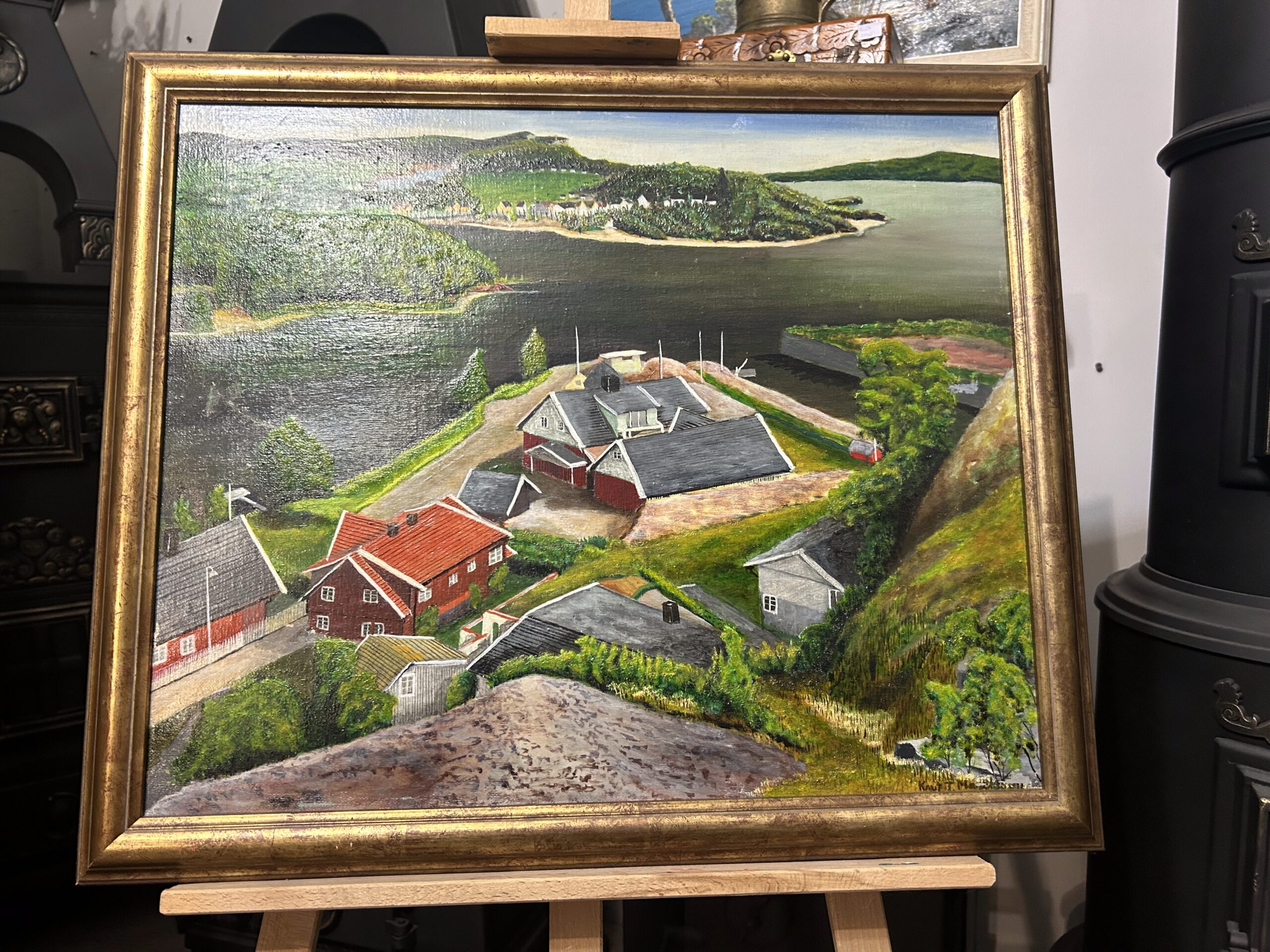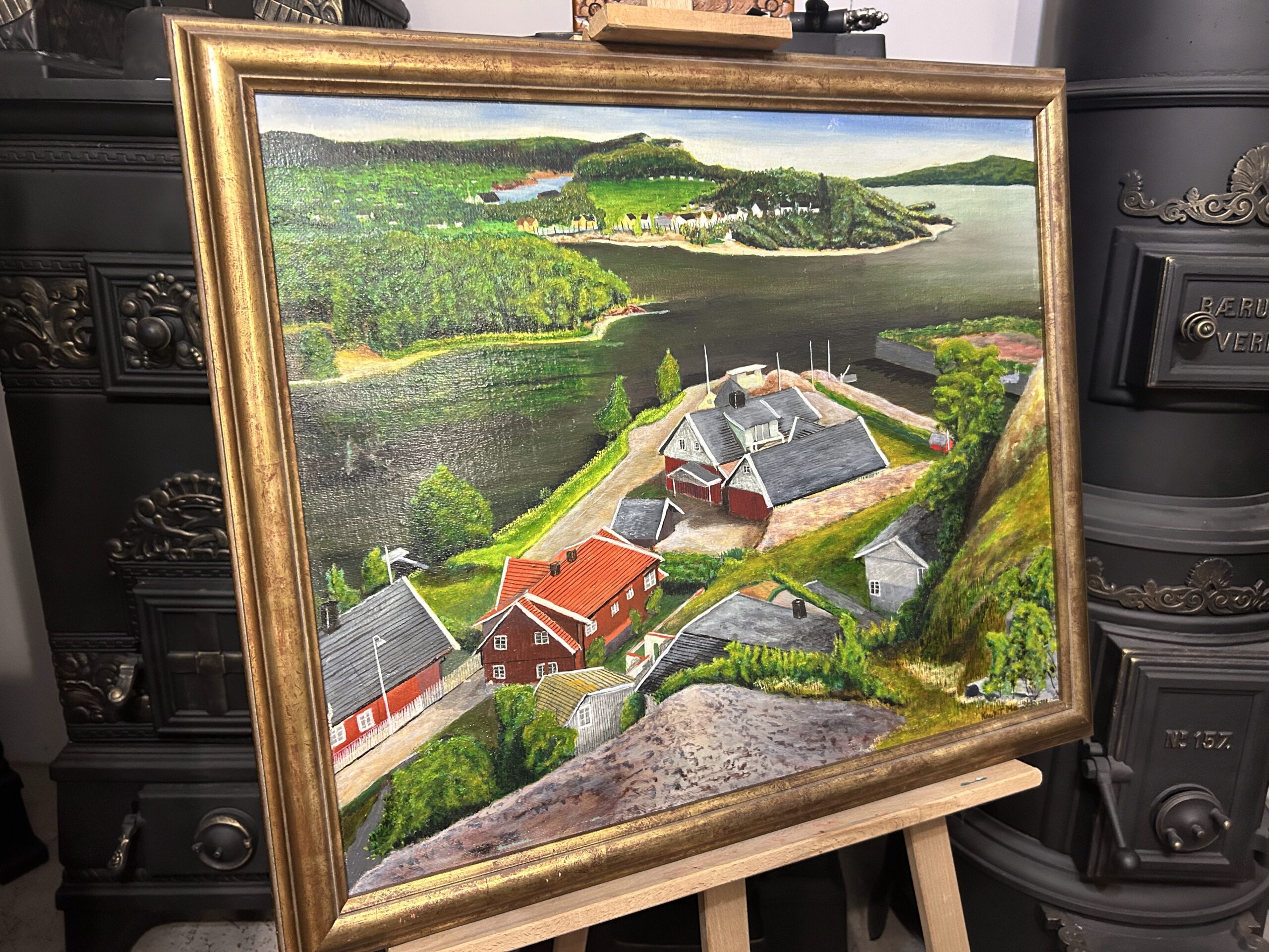 Nastrojowy obraz wykonany techniką oleju na płótnie, przedstawiający malowniczą uliczkę nad norweskim fjordem. Scena oddaje urok skandynawskiego krajobrazu, z charakterystycznymi budynkami i drogą prowadzącą w stronę majestatycznej przyrody. Kompozycja w stonowanych barwach wprowadza spokojny, a jednocześnie tajemniczy nastrój norweskich wybrzeży.