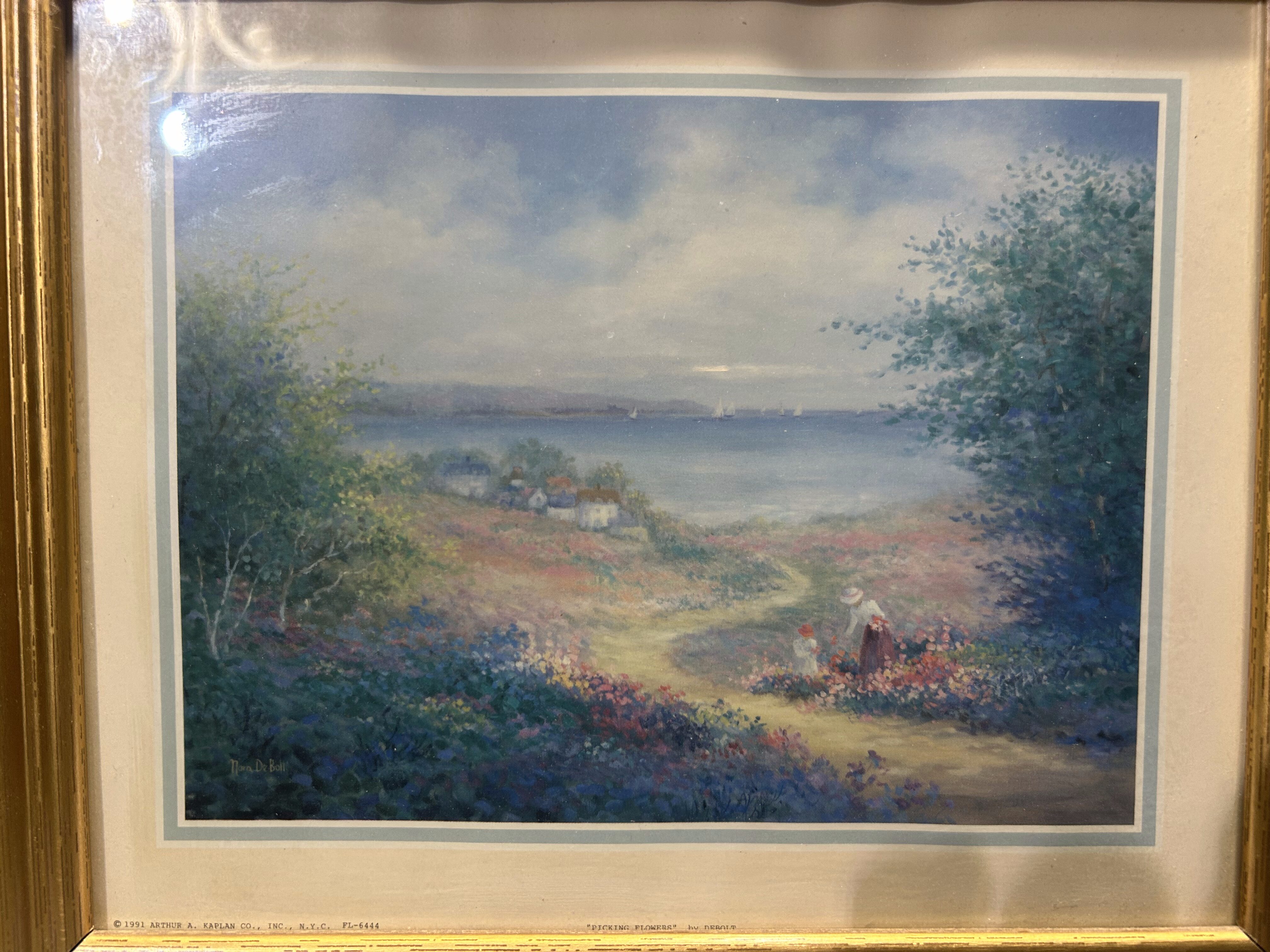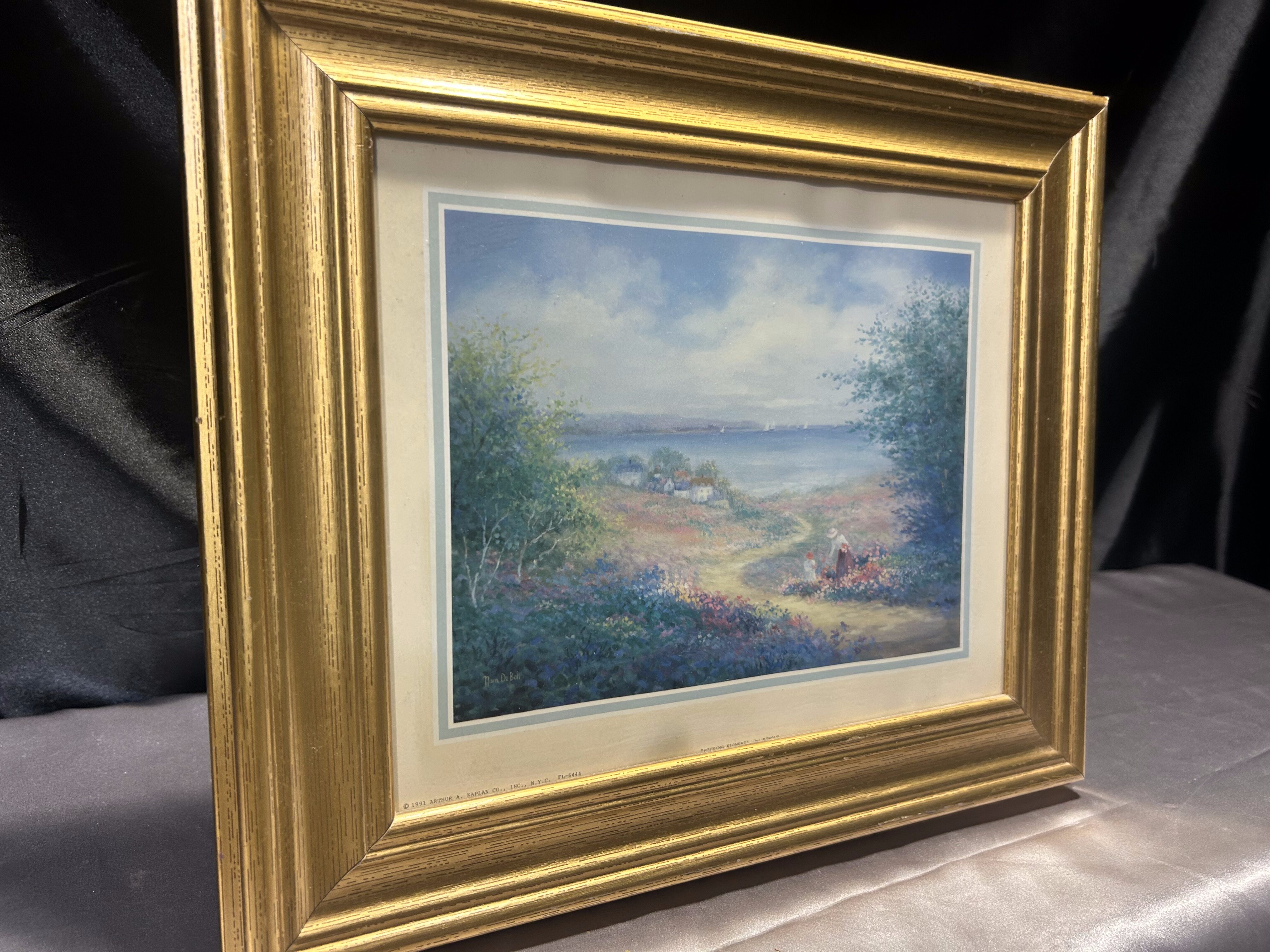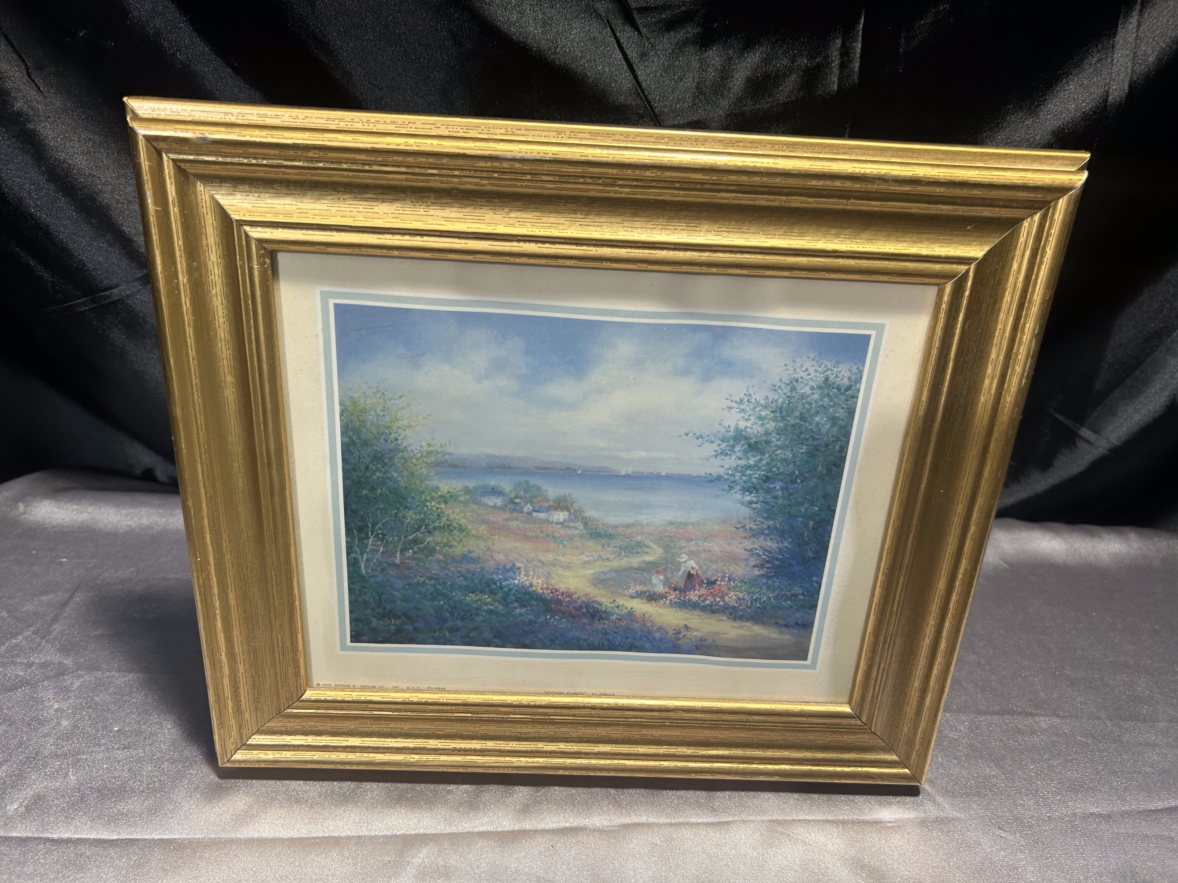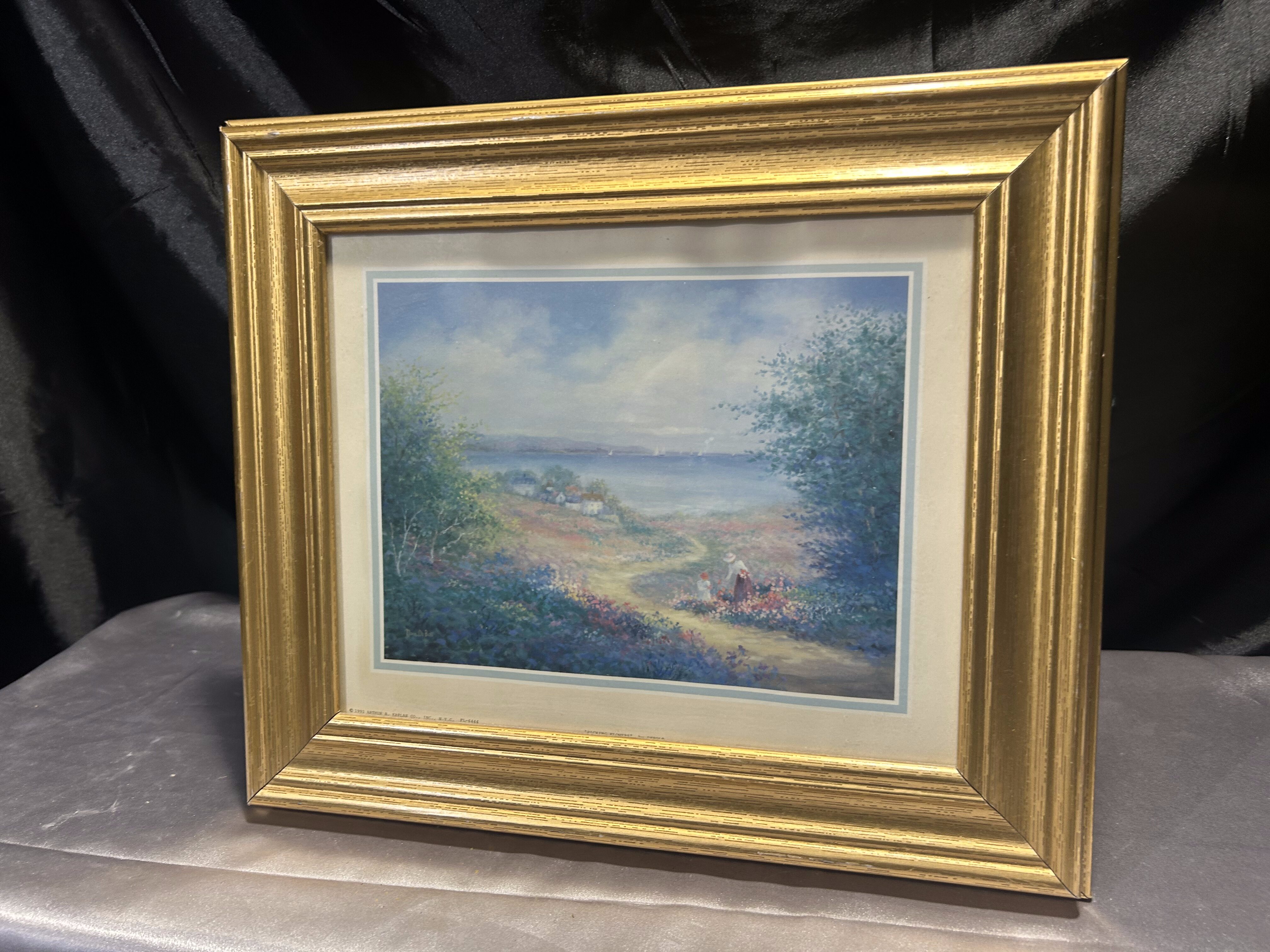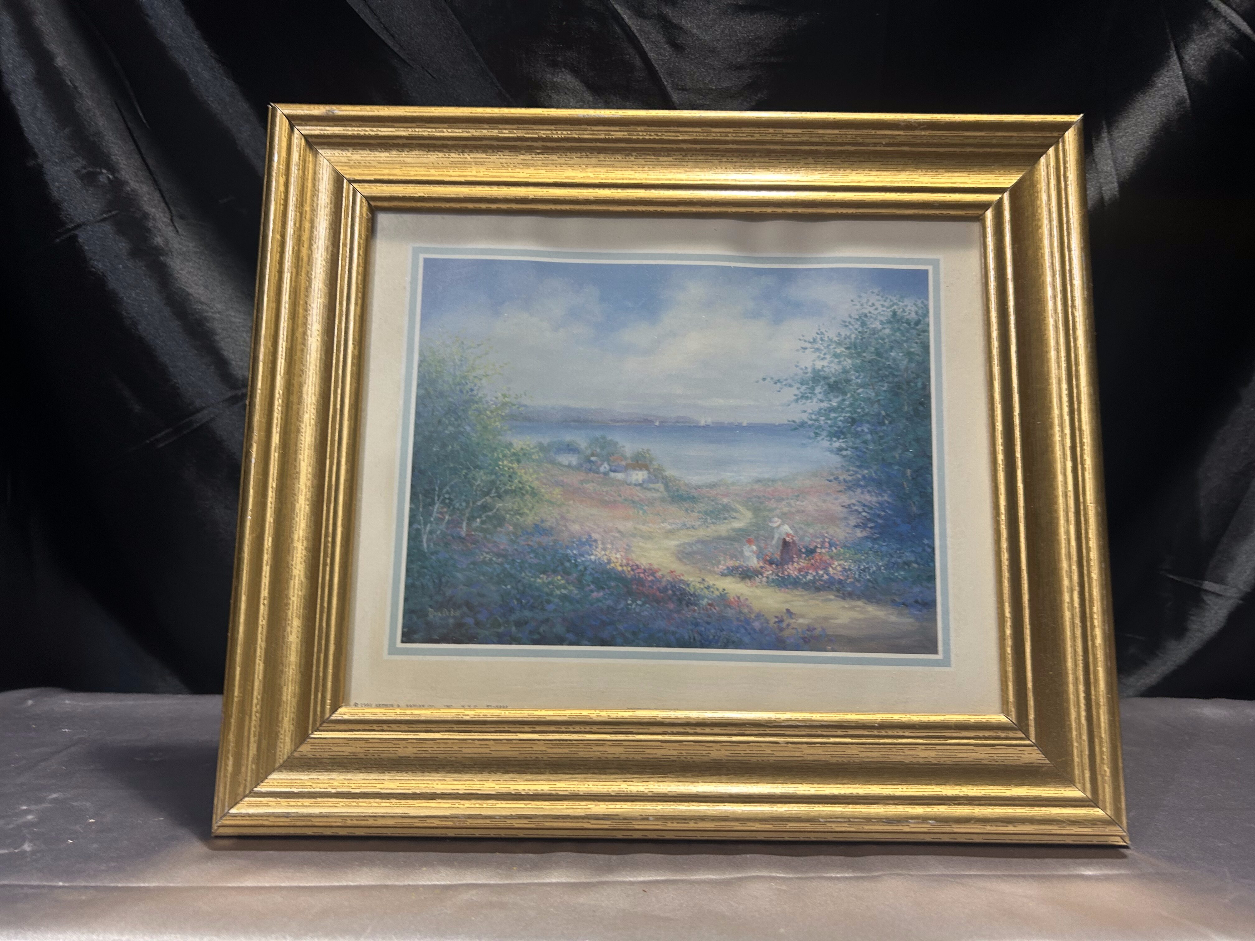 Delikatny, pastelowy pejzaż ukazujący kwiecistą ścieżkę prowadzącą ku wodzie. Nastrojowa scena z kobiecą postacią wśród kwiatów przyciąga wzrok subtelnymi barwami i romantycznym klimatem. Nadruk sygnowany (widoczny druk wydawniczy), oprawiony w elegancką, drewnianą ramę w kolorze złota. Idealny do wnętrz w stylu klasycznym, angielskim lub vintage.