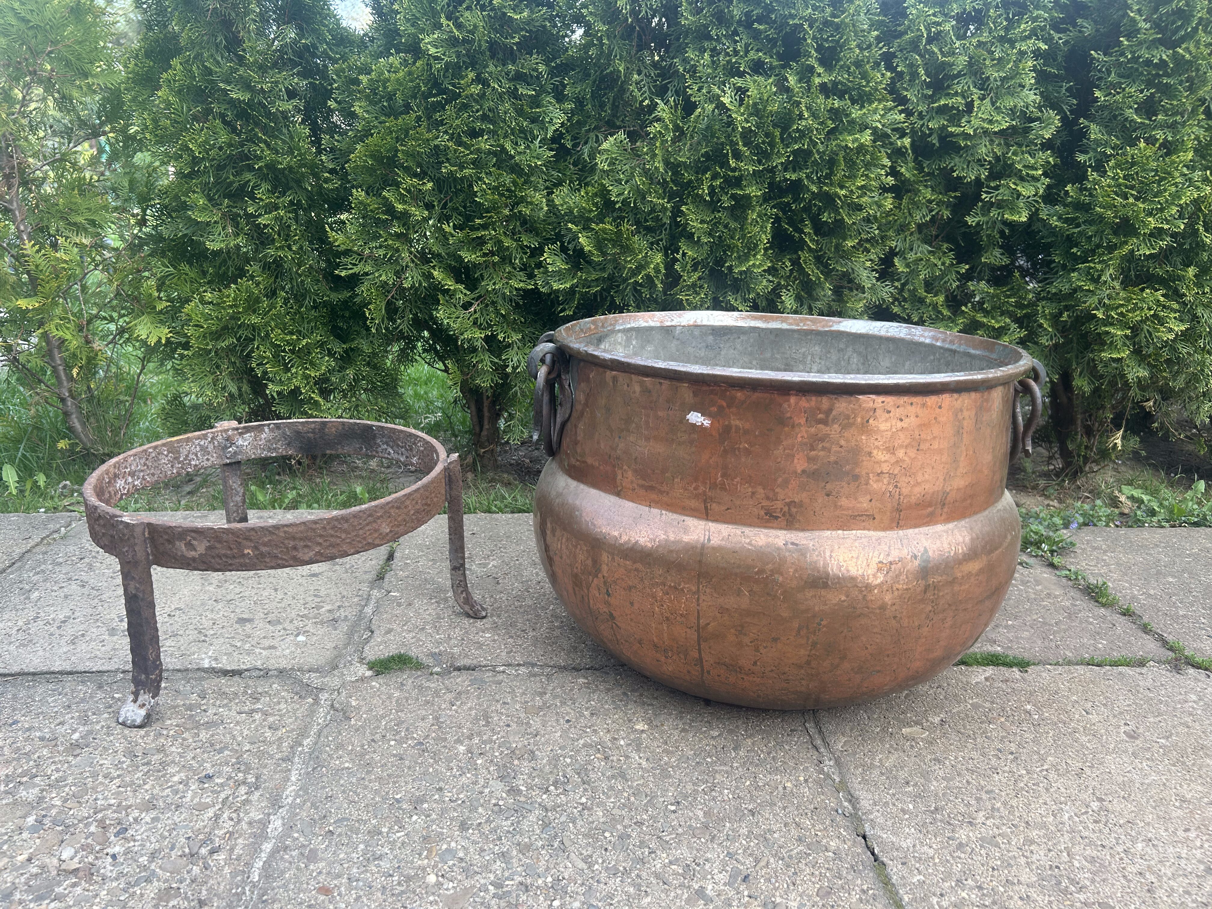Ogromny miedziany garnek – z kutymi uchwytami i podstawą – rzadki egzemplarz