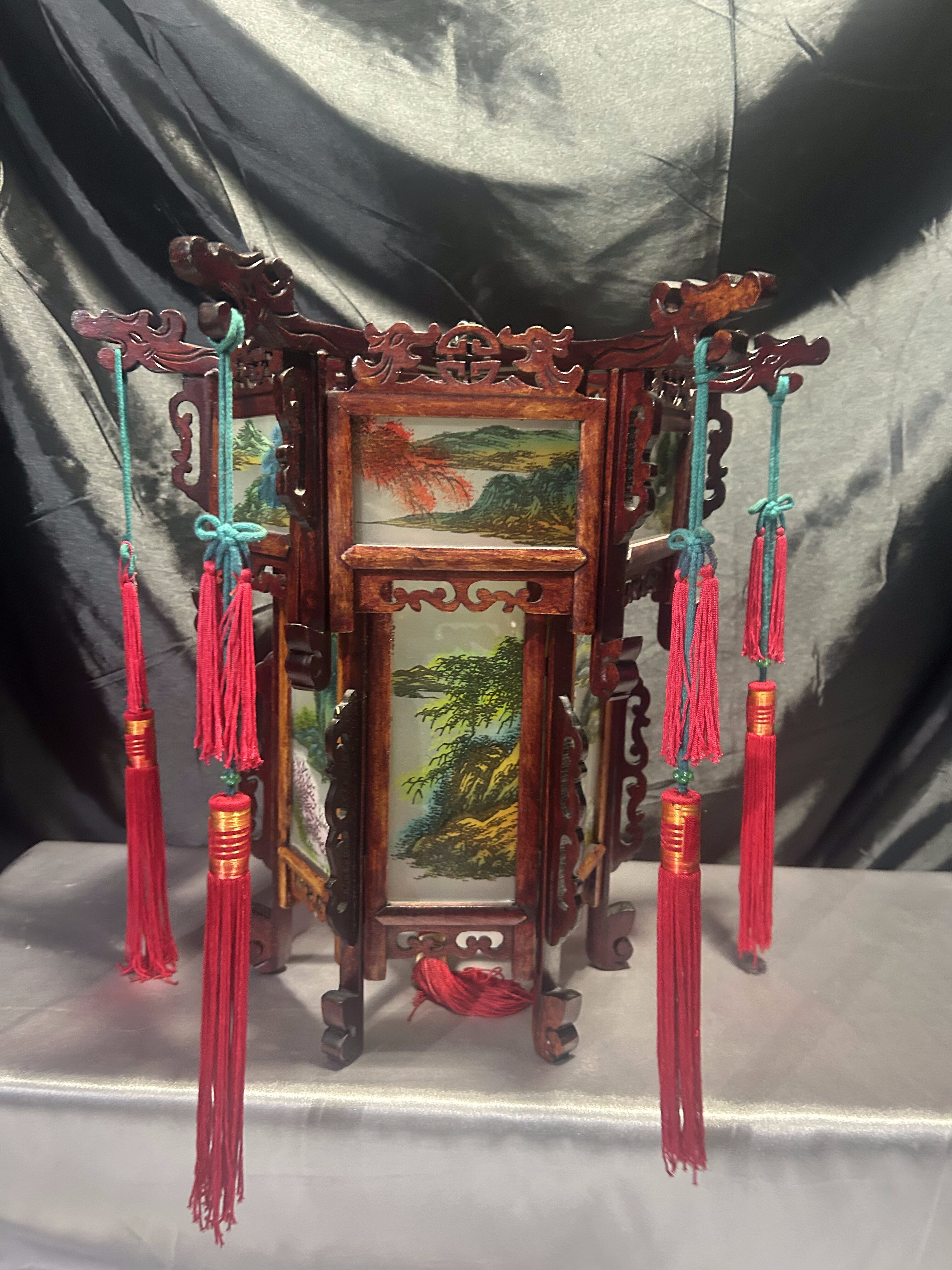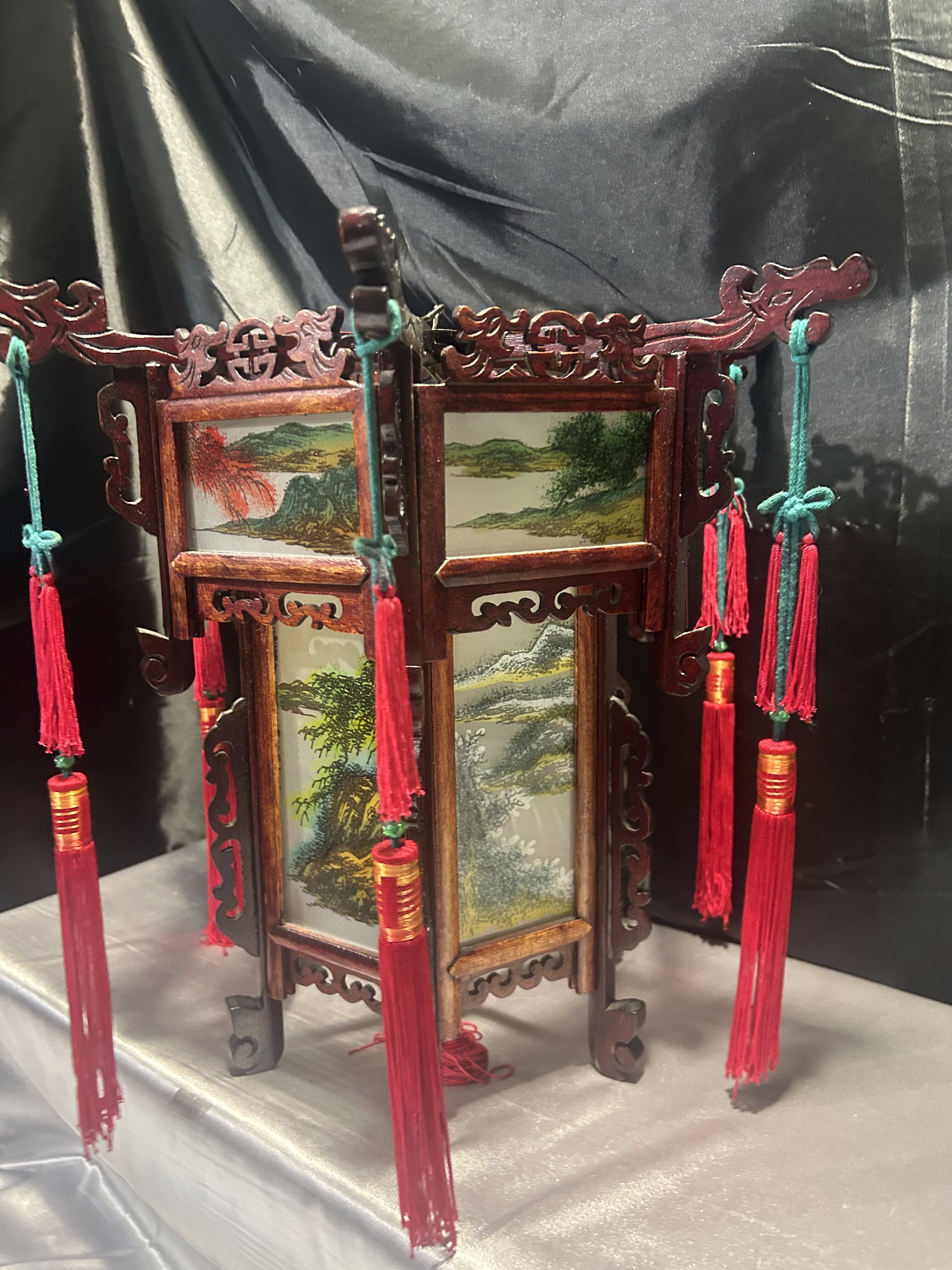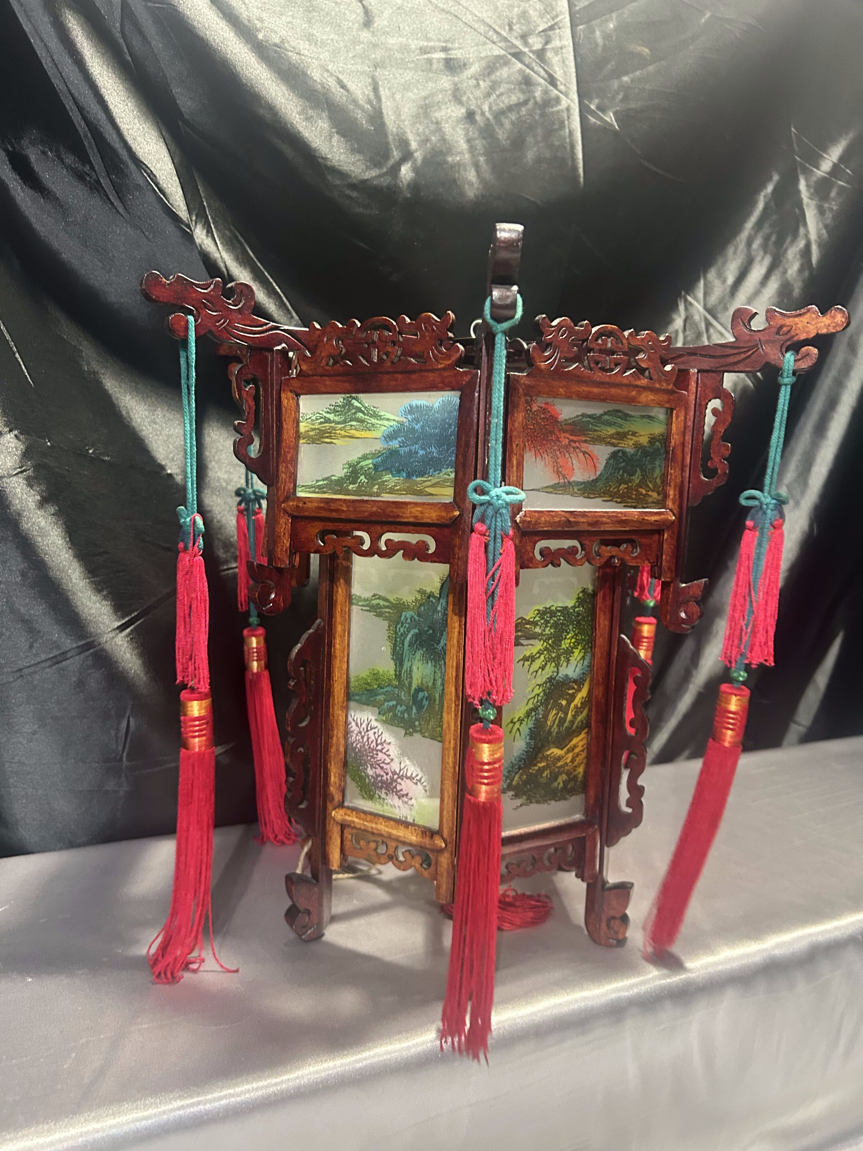 Ręcznie wykonany orientalny lampion dekoracyjny o unikatowym charakterze. Konstrukcja z ciemnego, misternie rzeźbionego drewna została wzbogacona o sześć ozdobnych smoków, symbolizujących siłę i ochronę. Wewnątrz umieszczono witraże z ręcznie malowanymi pejzażami, ukazującymi sielskie widoki natury w stylu azjatyckim. Całość dopełniają intensywnie czerwone frędzle, które dodają lampionowi lekkości oraz głębokiego orientalnego wyrazu.