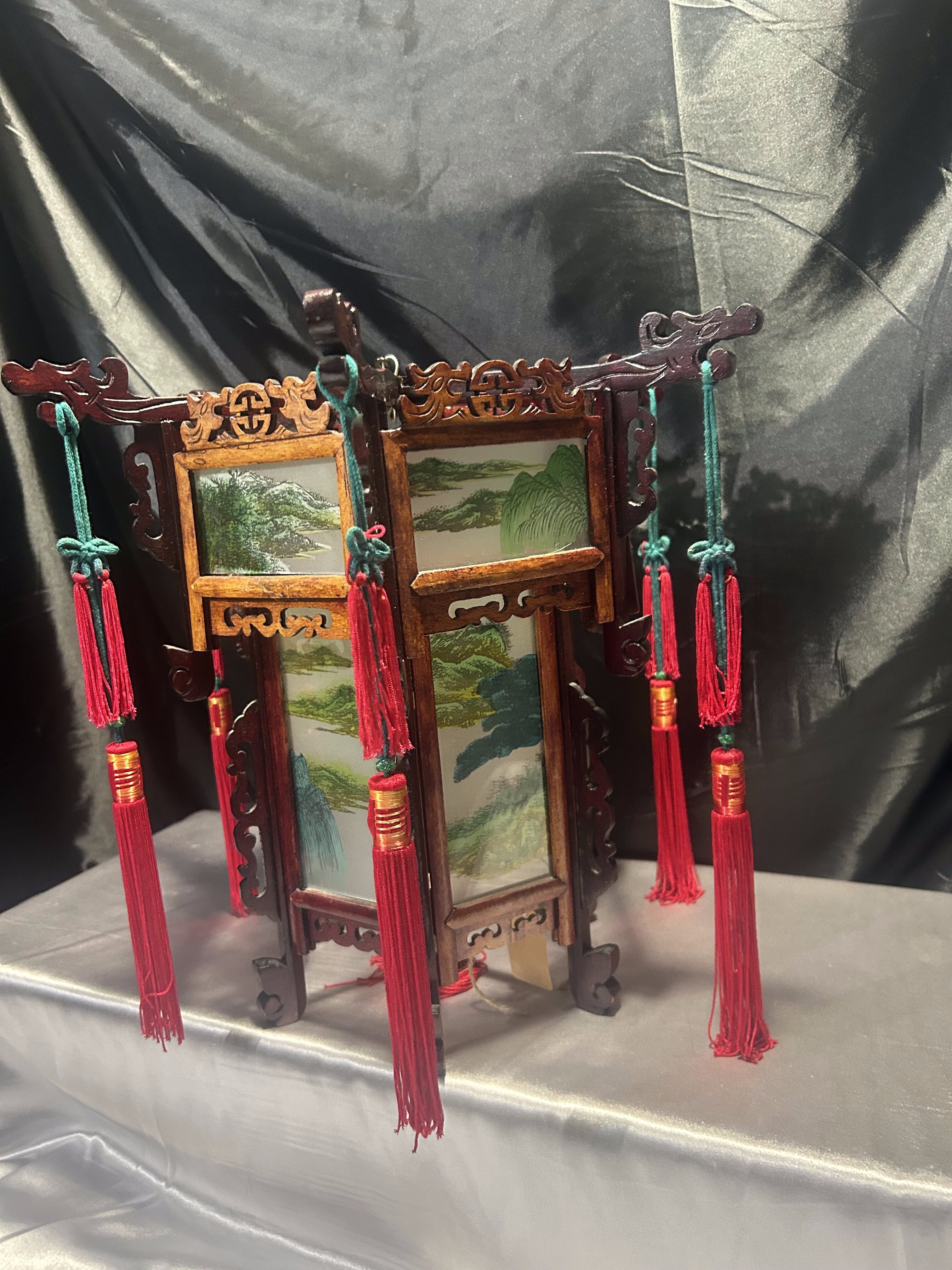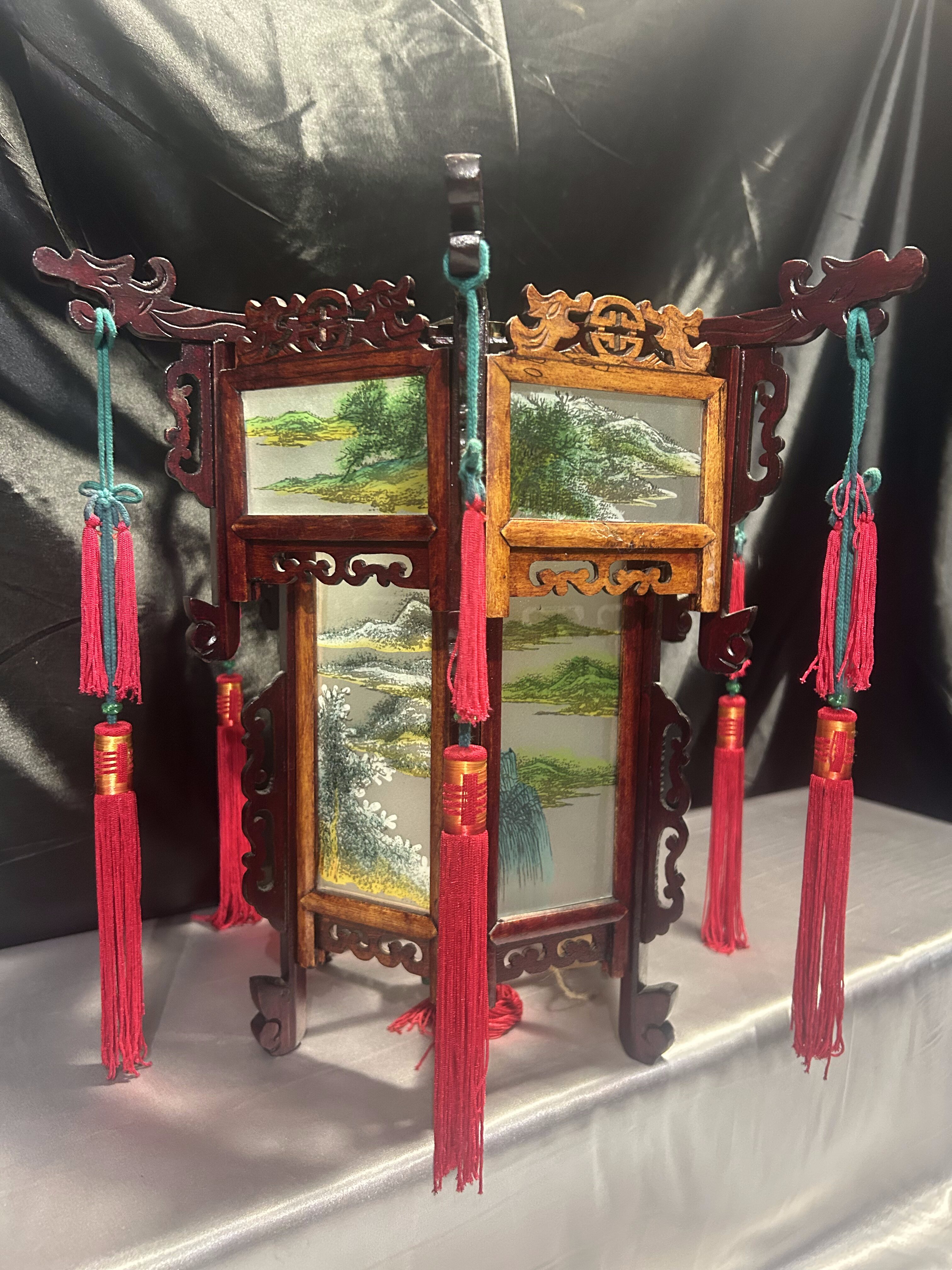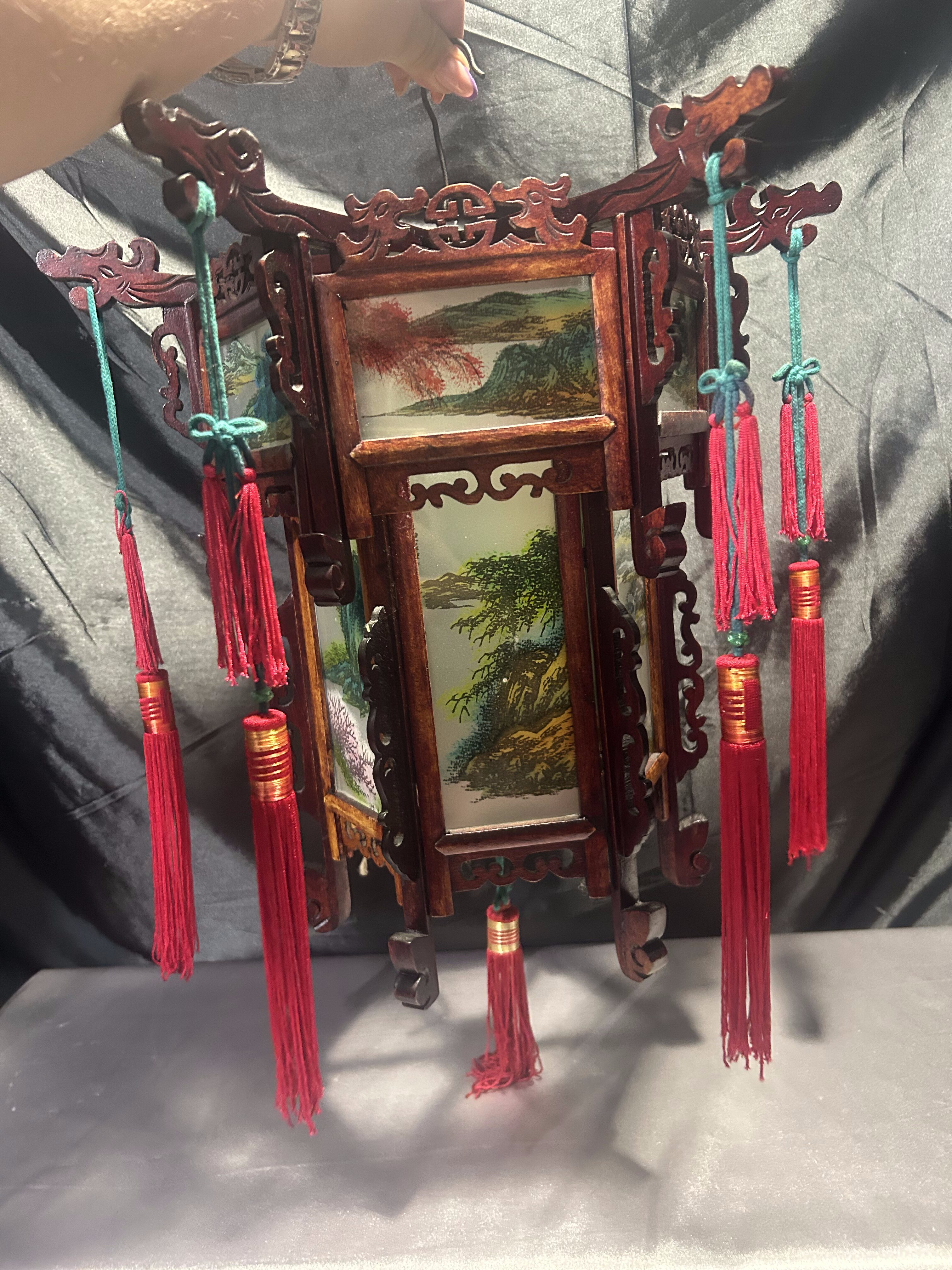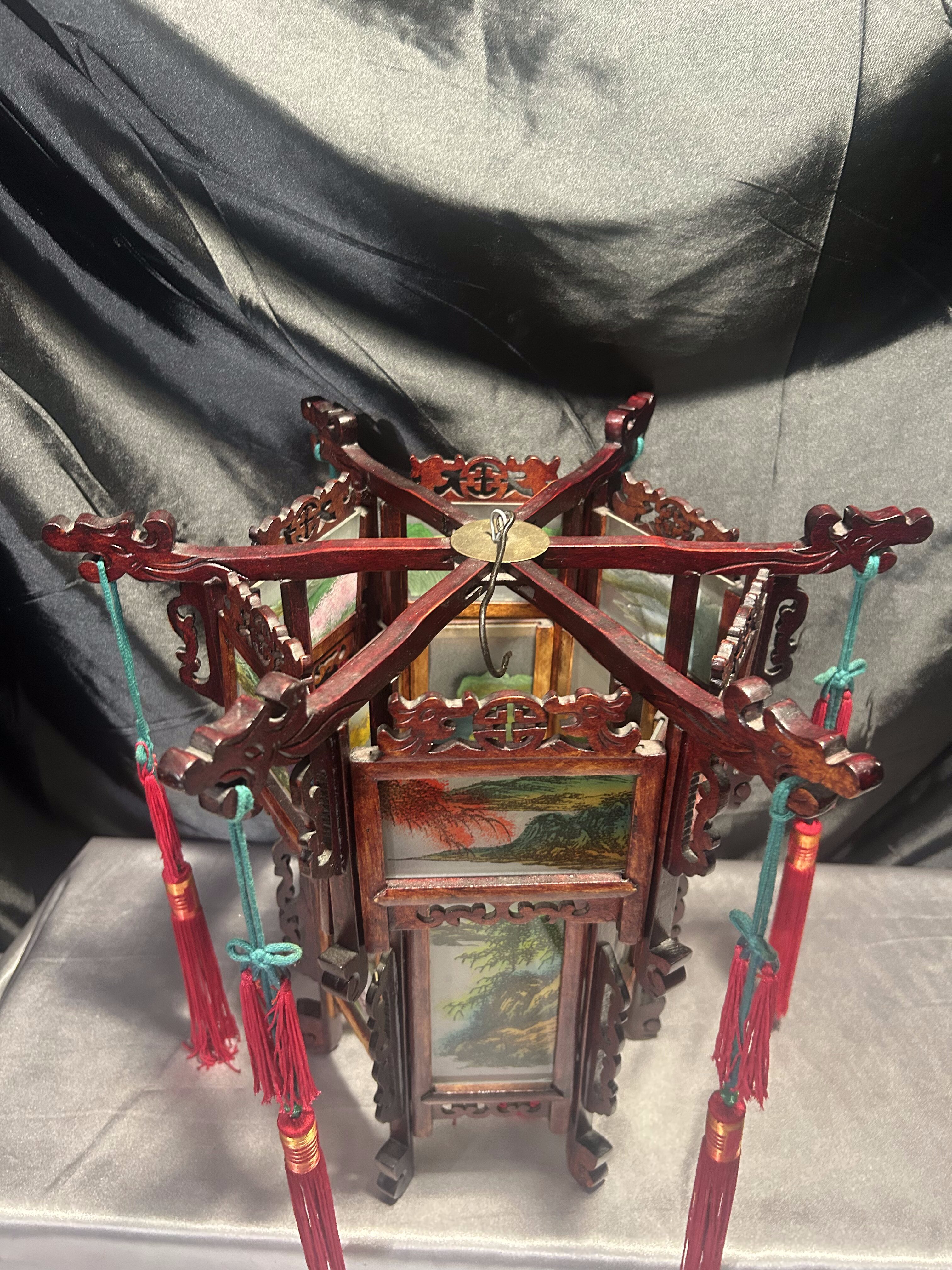 Ręcznie wykonany orientalny lampion dekoracyjny o unikatowym charakterze. Konstrukcja z ciemnego, misternie rzeźbionego drewna została wzbogacona o sześć ozdobnych smoków, symbolizujących siłę i ochronę. Wewnątrz umieszczono witraże z ręcznie malowanymi pejzażami, ukazującymi sielskie widoki natury w stylu azjatyckim. Całość dopełniają intensywnie czerwone frędzle, które dodają lampionowi lekkości oraz głębokiego orientalnego wyrazu.