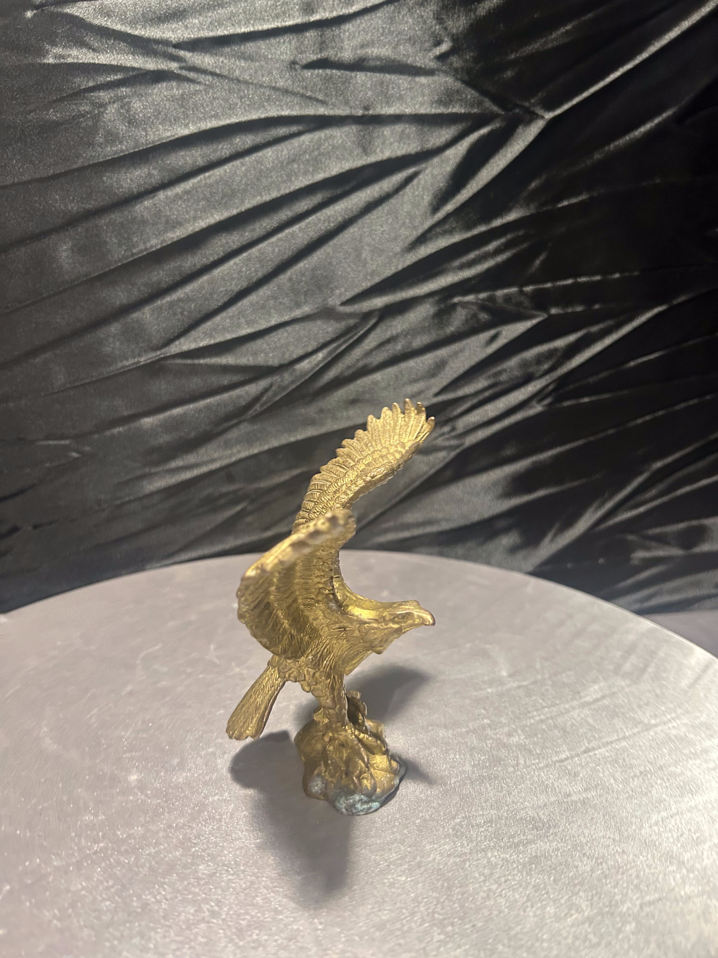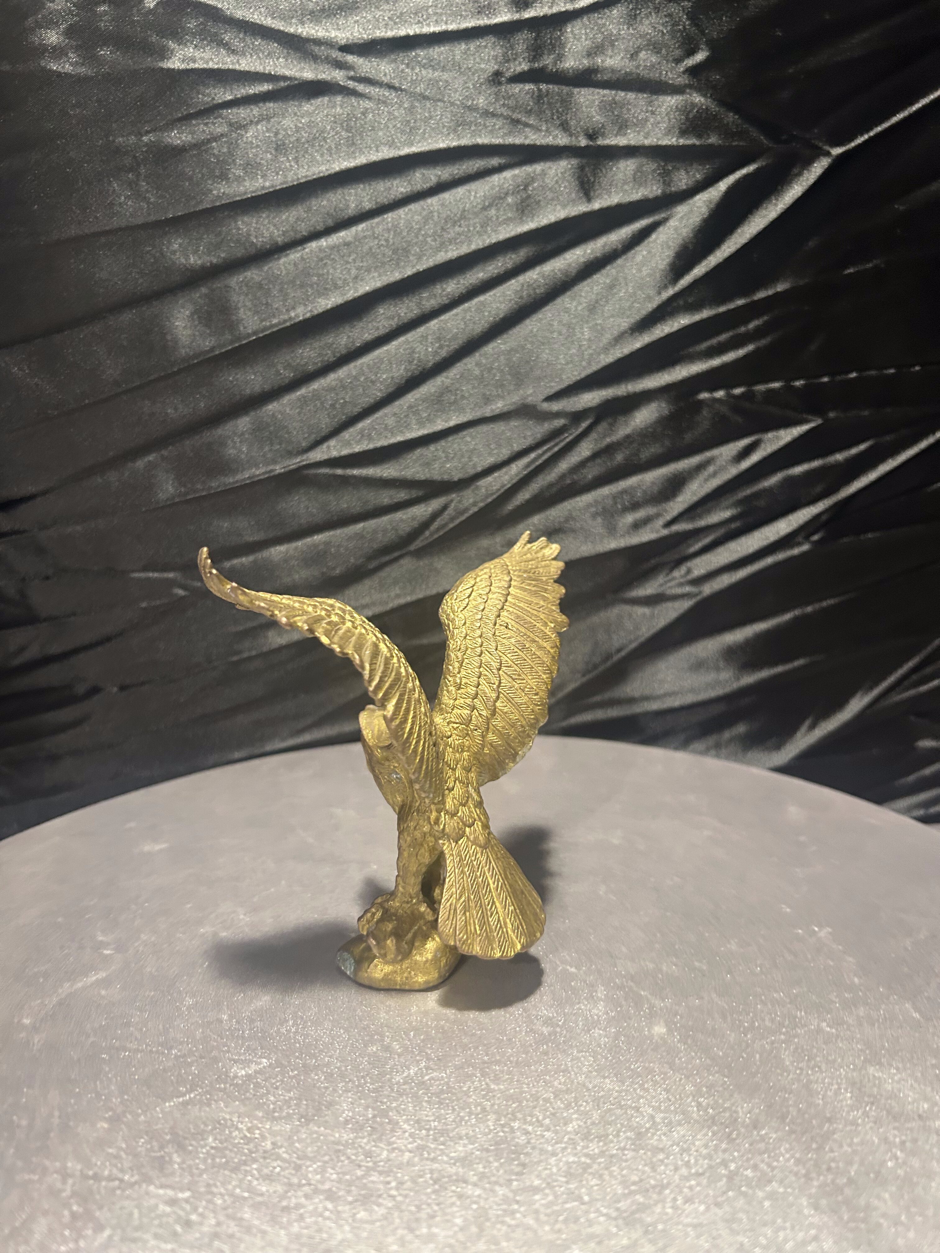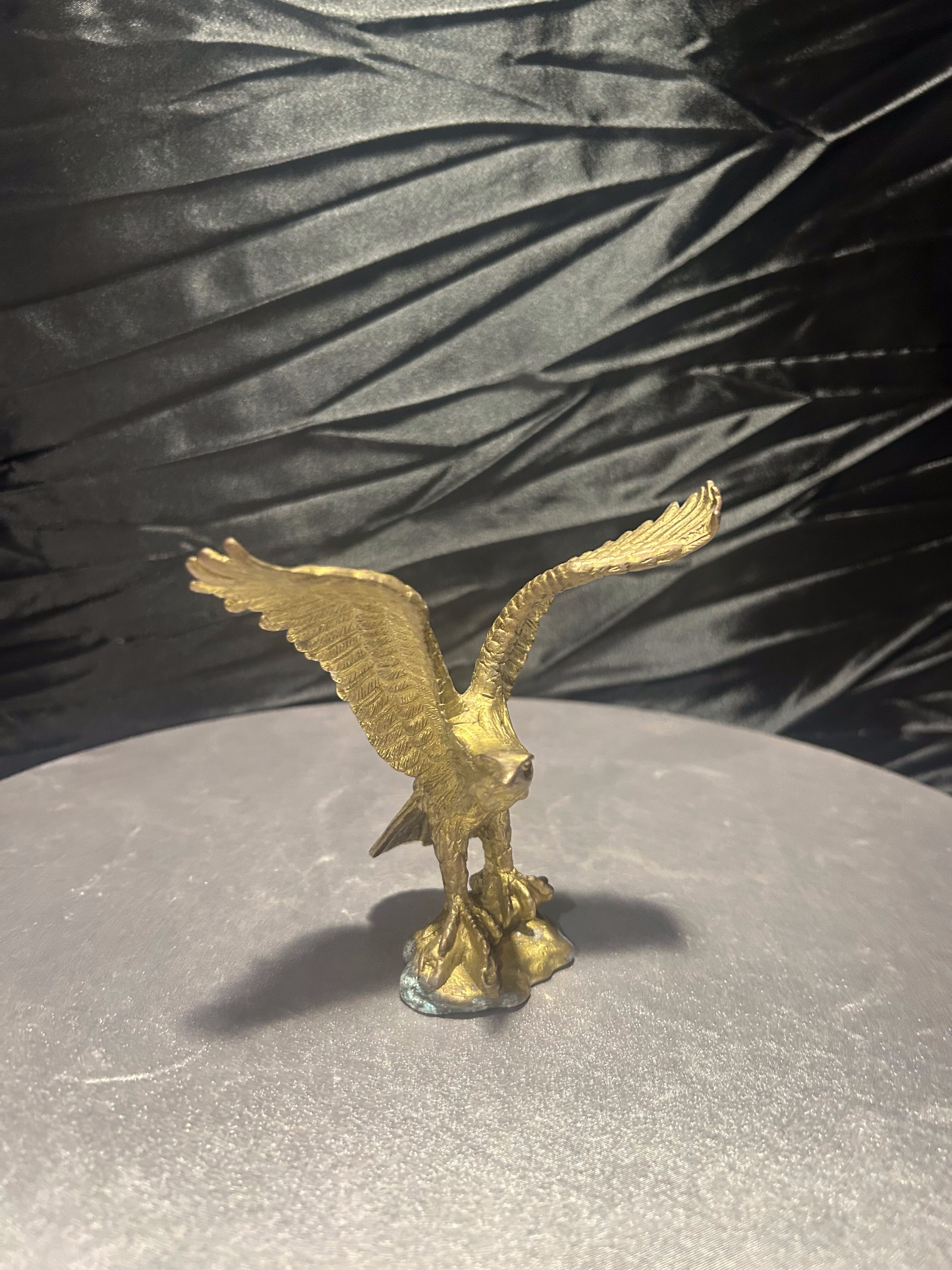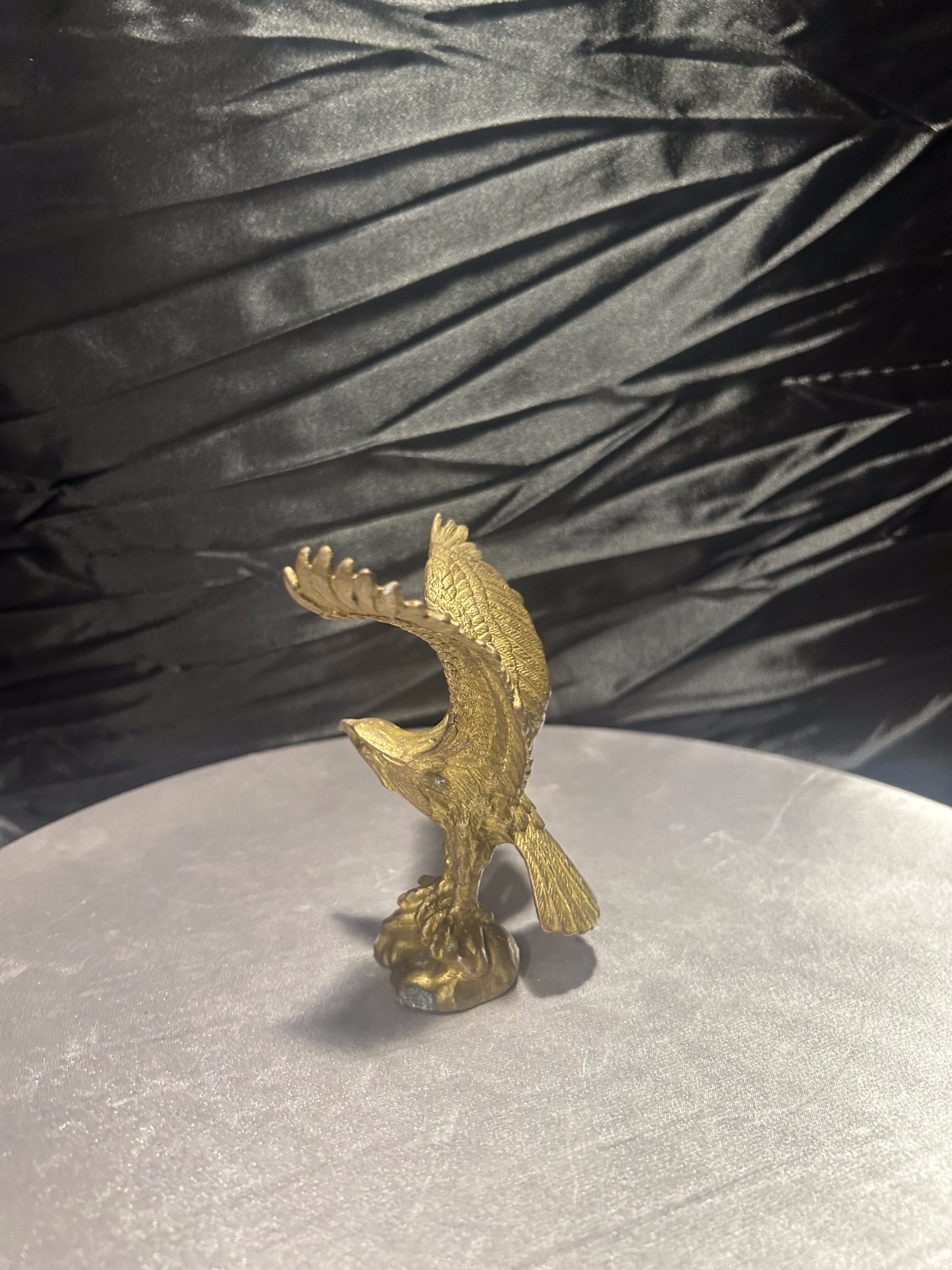 Elegancka figurka przedstawiająca orła wykonanego z mosiądzu, uchwyconego w momencie rozpostarcia skrzydeł. Rzeźba charakteryzuje się realistycznym odwzorowaniem detali – od precyzyjnie wyrzeźbionych piór, po dynamiczną sylwetkę ptaka.