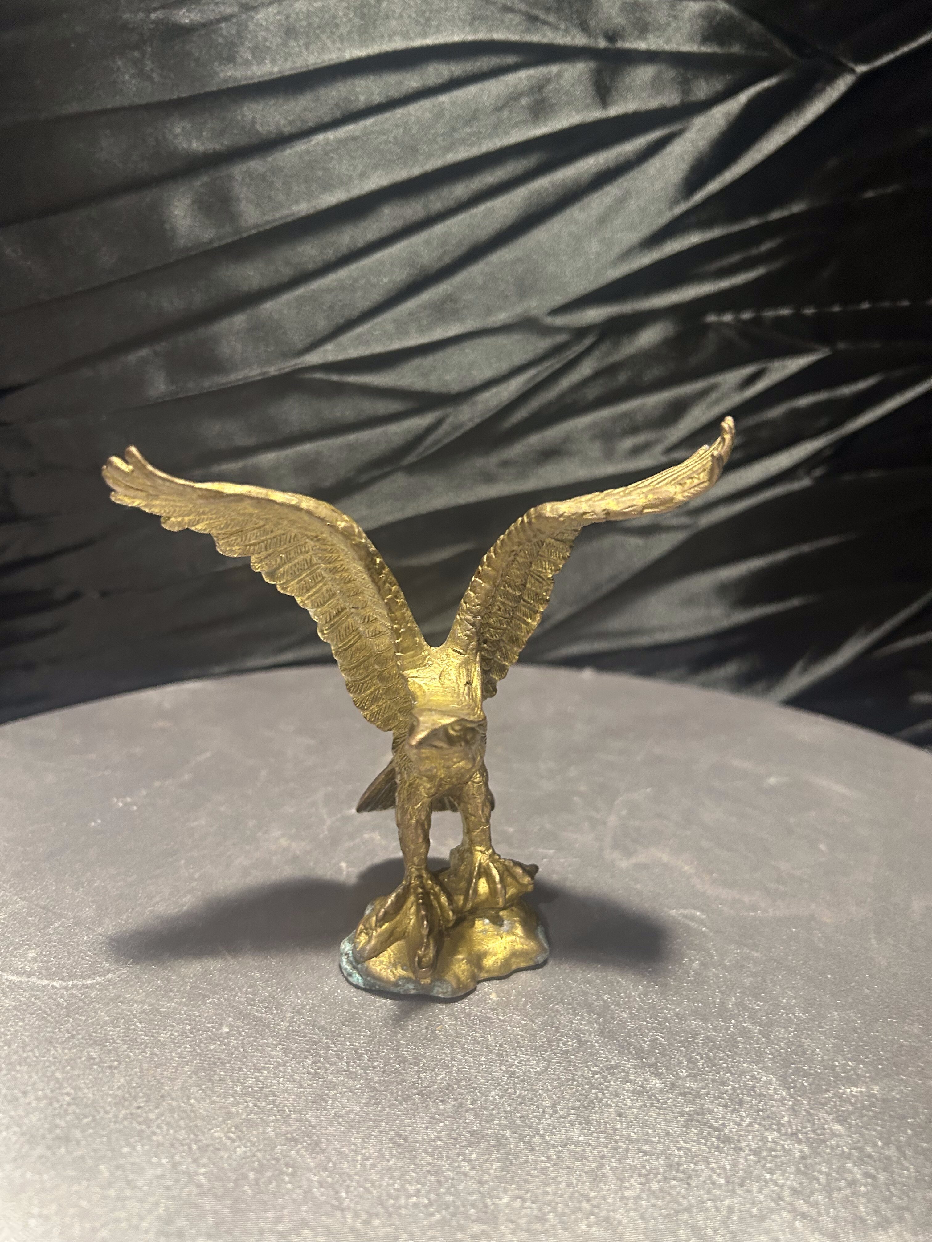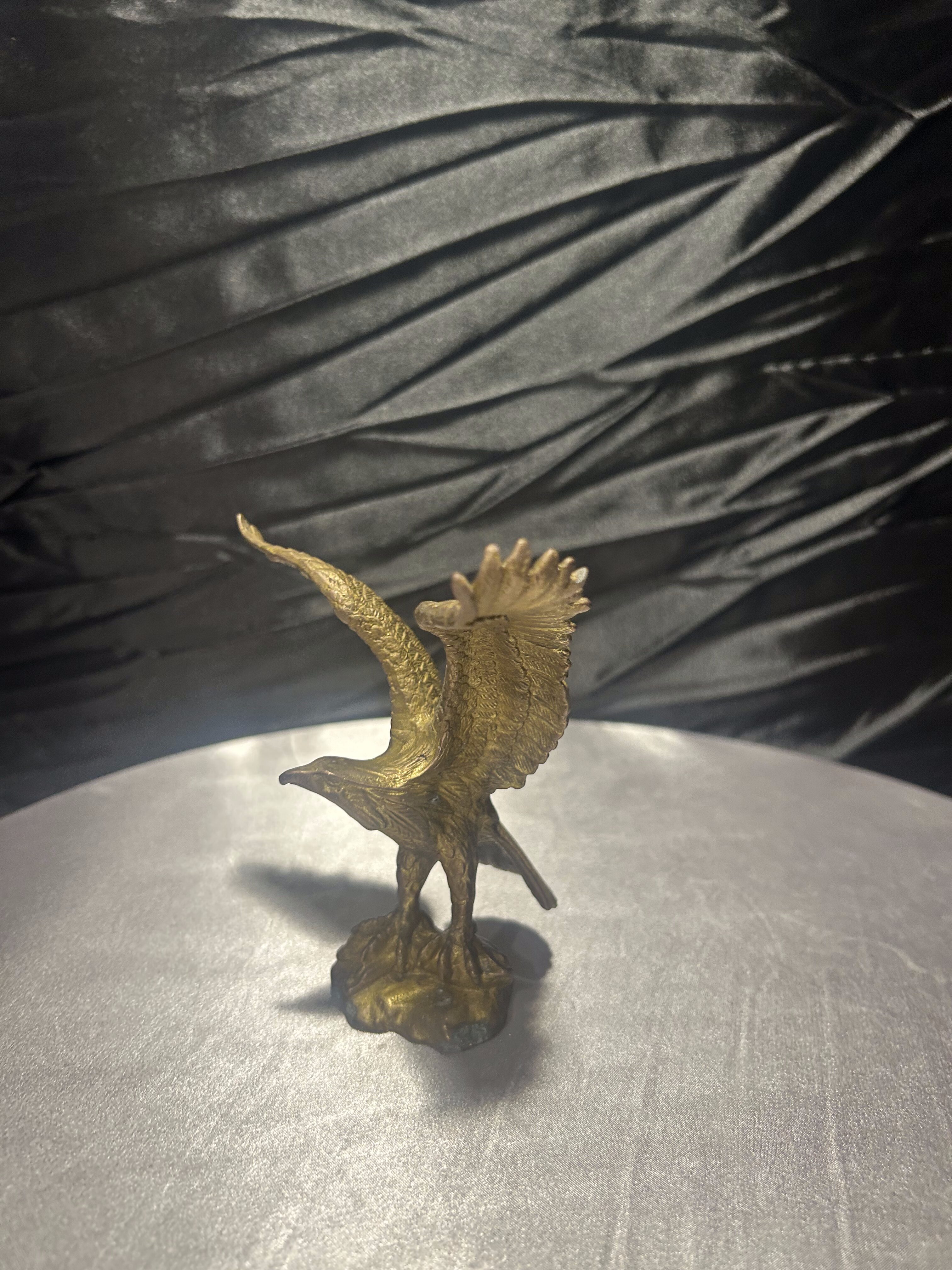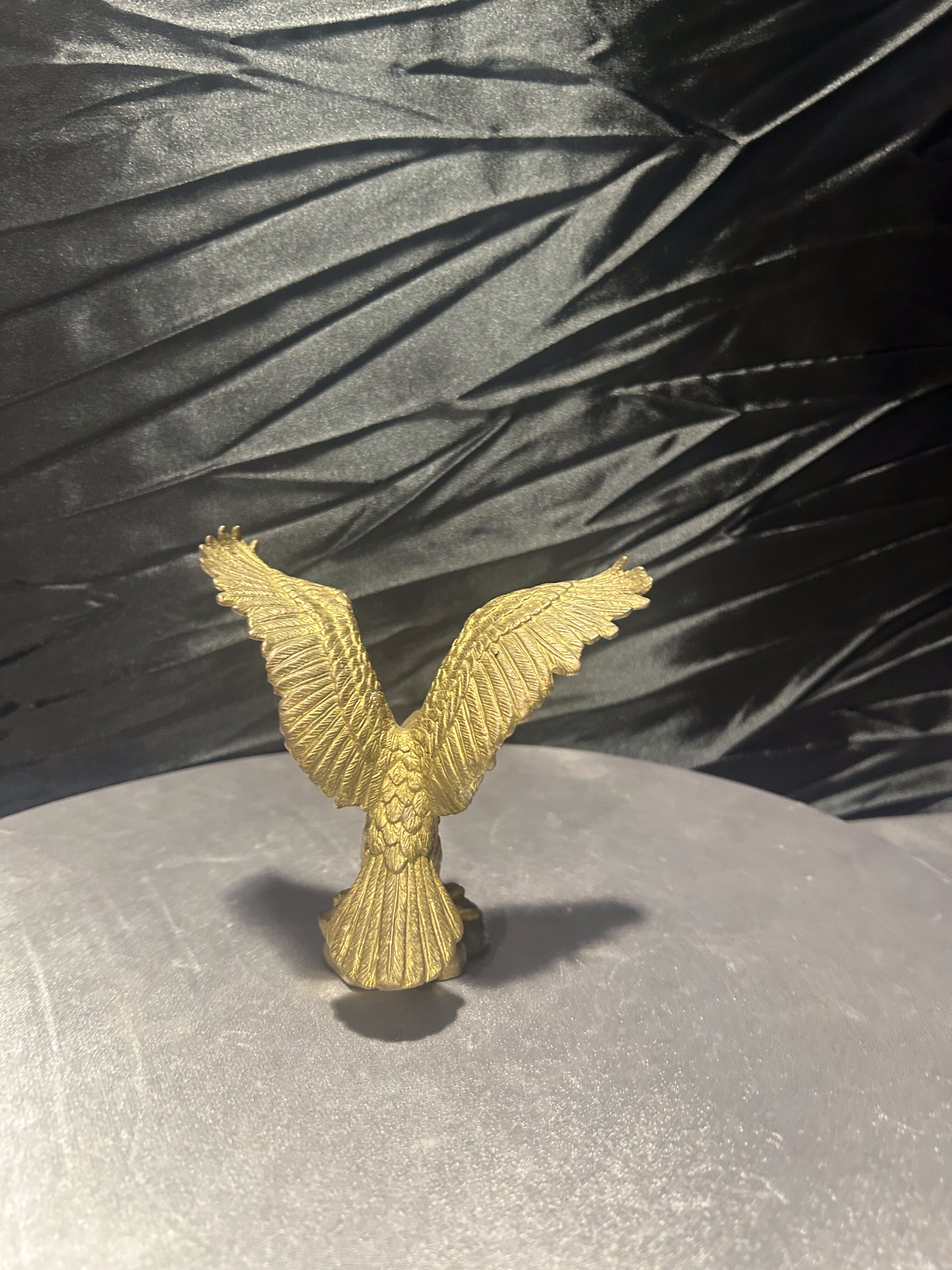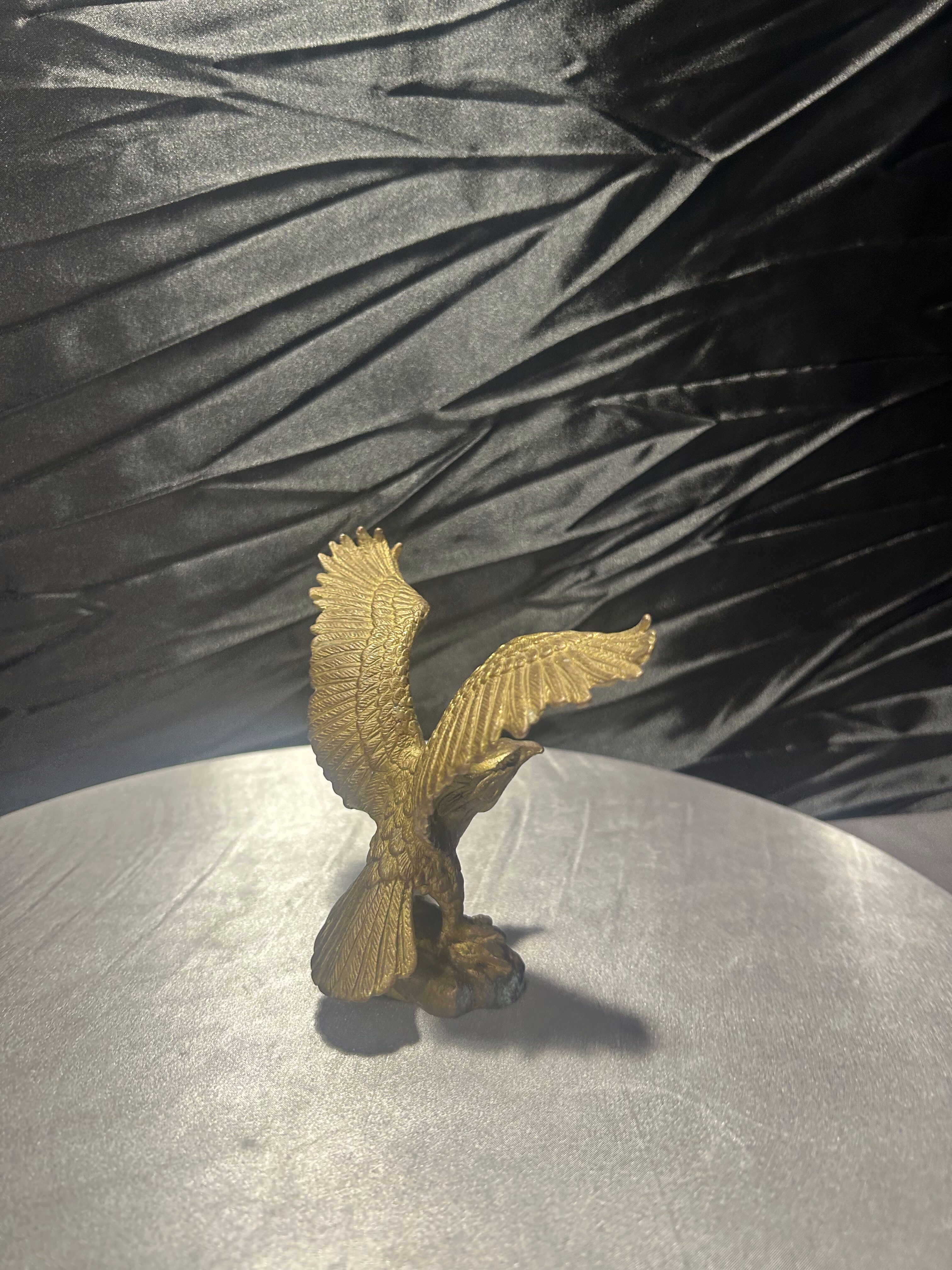 Elegancka figurka przedstawiająca orła wykonanego z mosiądzu, uchwyconego w momencie rozpostarcia skrzydeł. Rzeźba charakteryzuje się realistycznym odwzorowaniem detali – od precyzyjnie wyrzeźbionych piór, po dynamiczną sylwetkę ptaka.