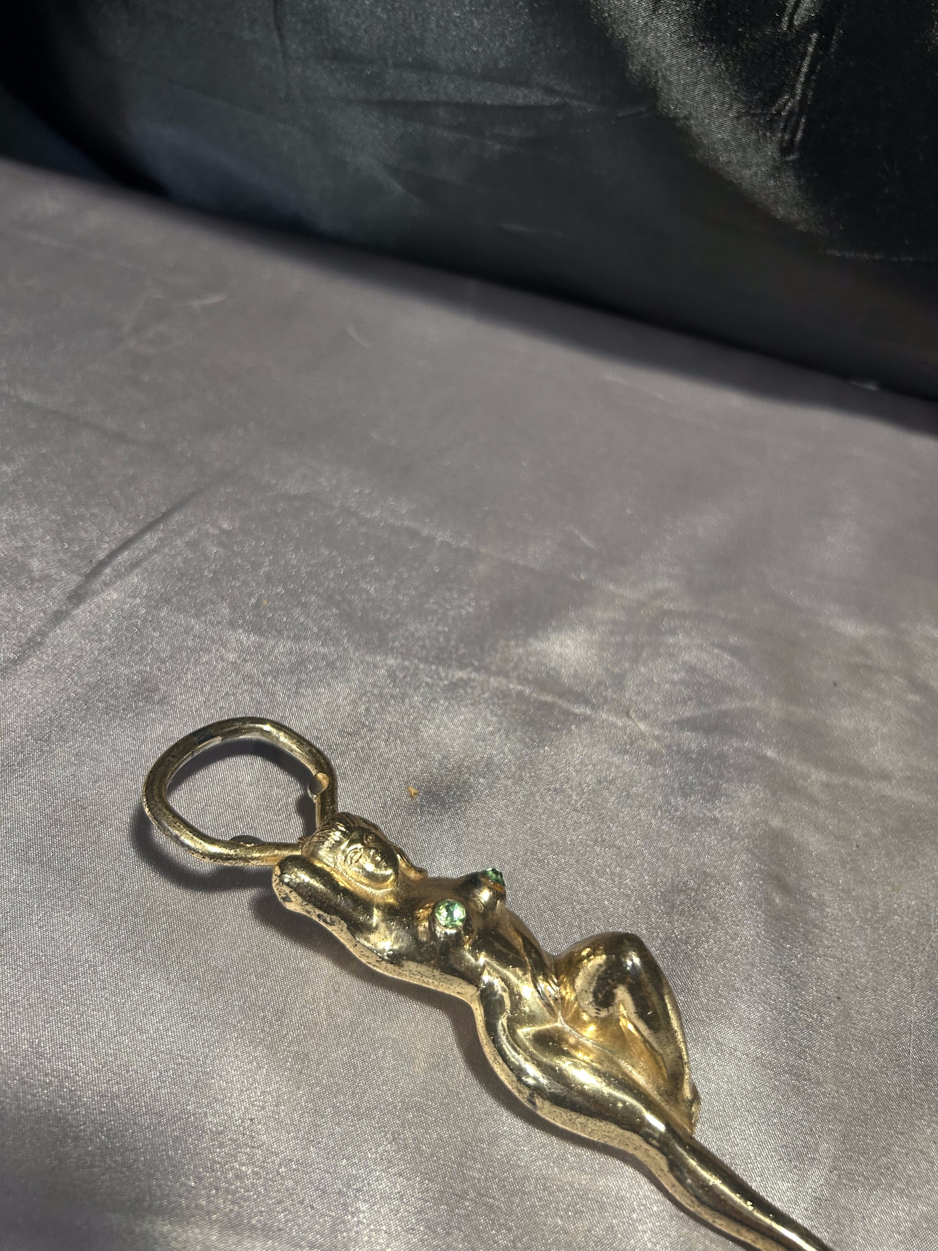 Przedstawiam elegancki otwieracz do butelek wykonany z mosiądzu, w formie sylwetki kobiety ozdobionej dekoracyjnymi cyrkoniami.