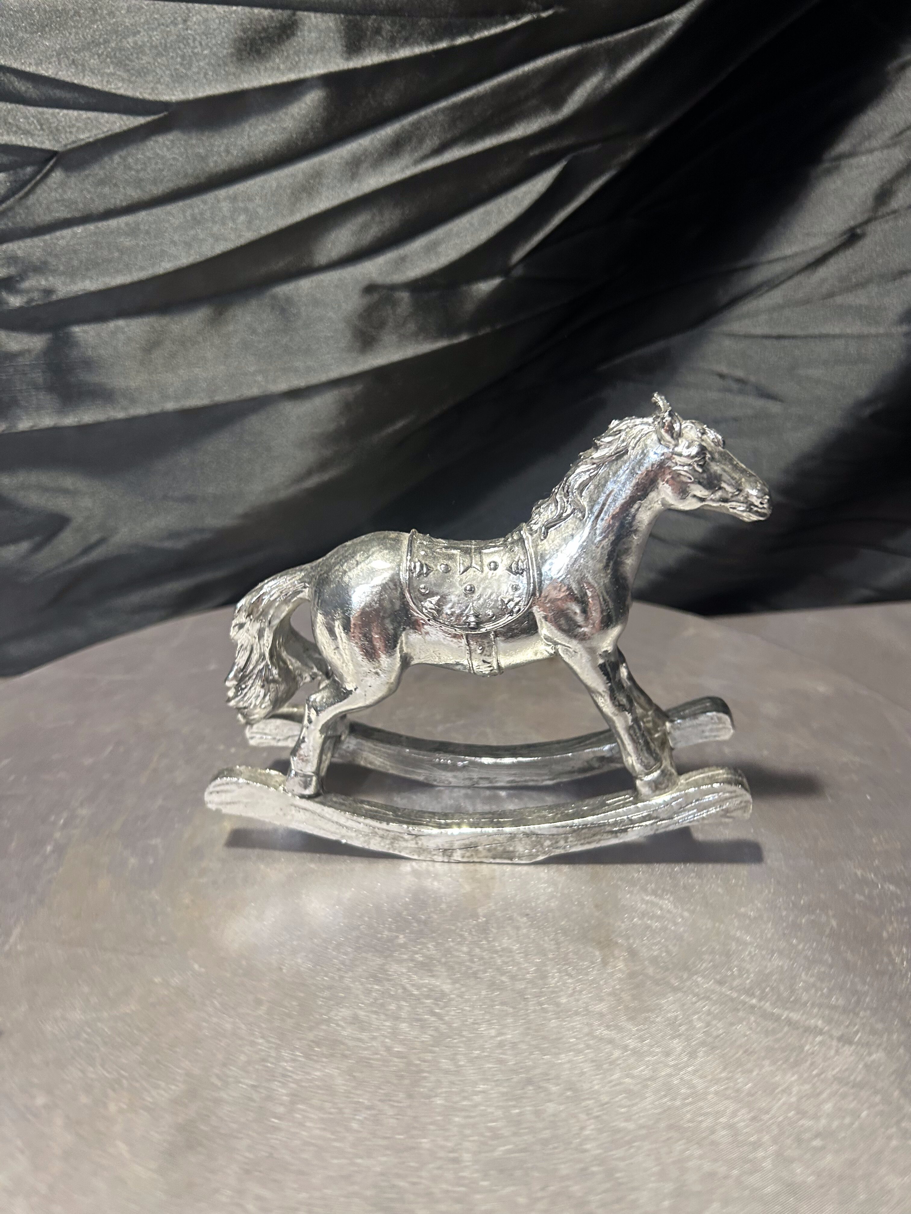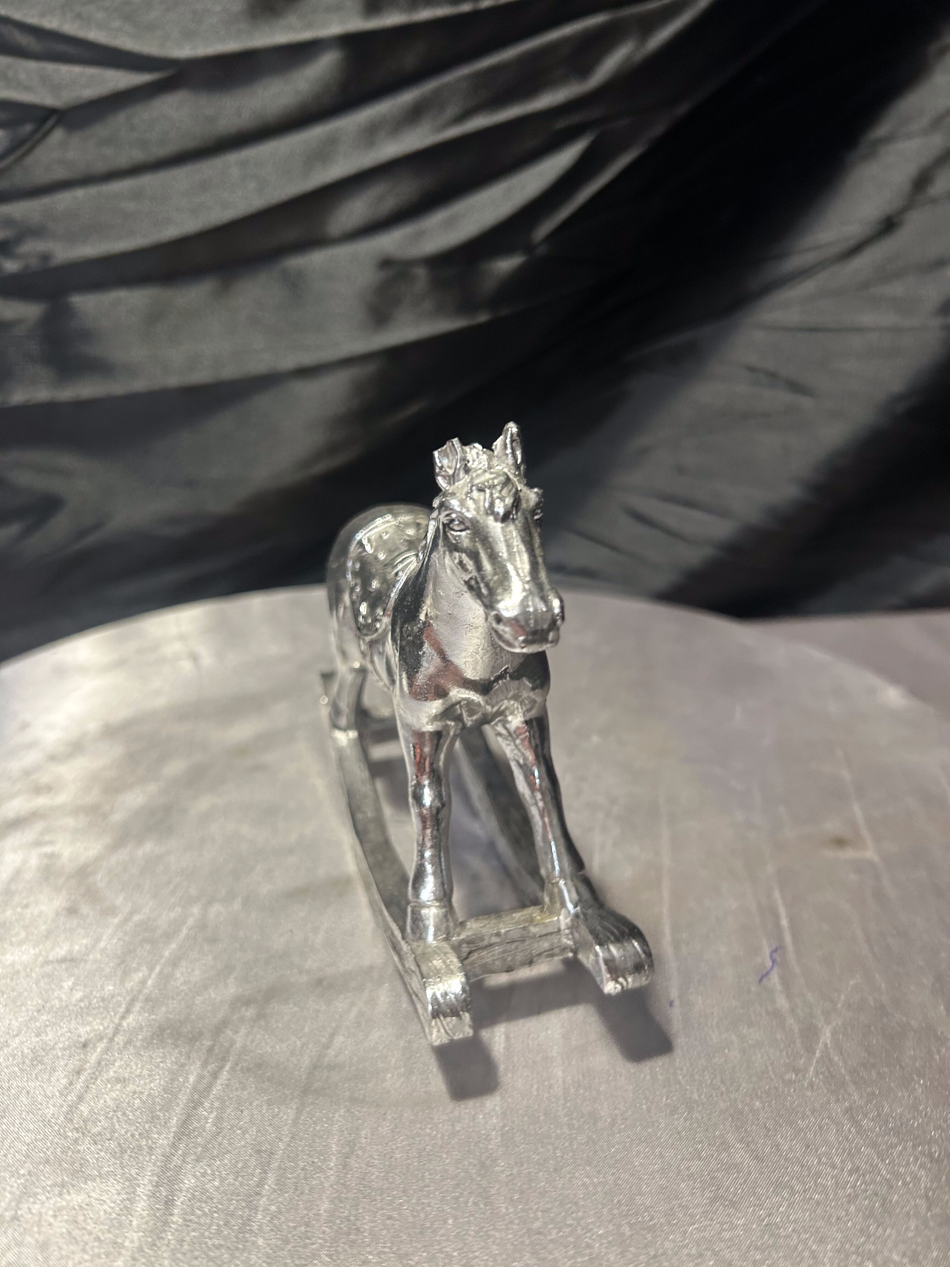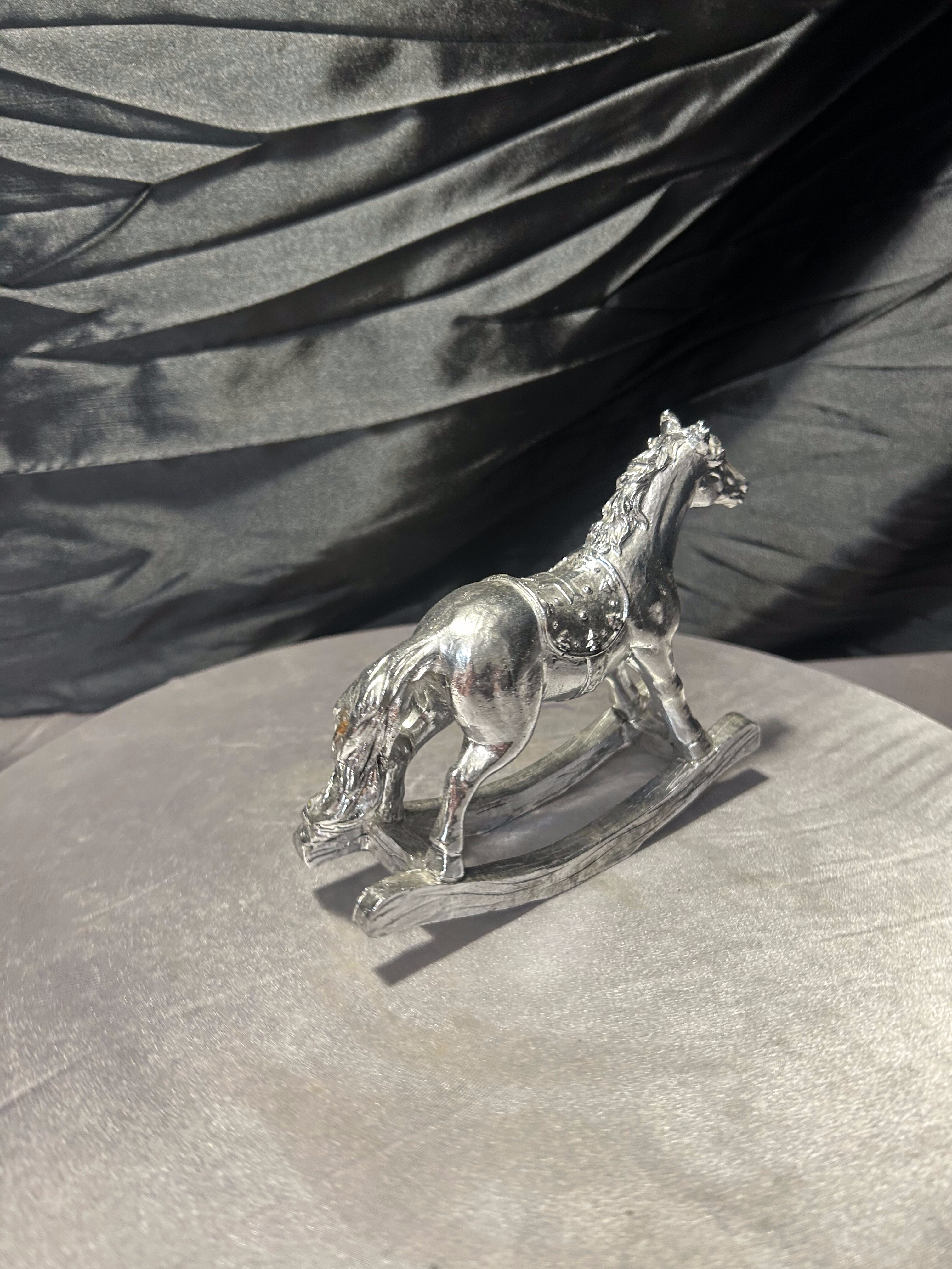 Urokliwa figurka przedstawiająca konia na biegunach, inspirowana klasycznymi zabawkami dziecięcymi znanymi od wielu pokoleń. Wykonana z metalu w eleganckim, srebrnym kolorze, przyciąga uwagę starannym odwzorowaniem detali – widoczna jest stylizowana uprząż, grzywa oraz charakterystyczna forma biegunów, na których osadzona jest figurka.