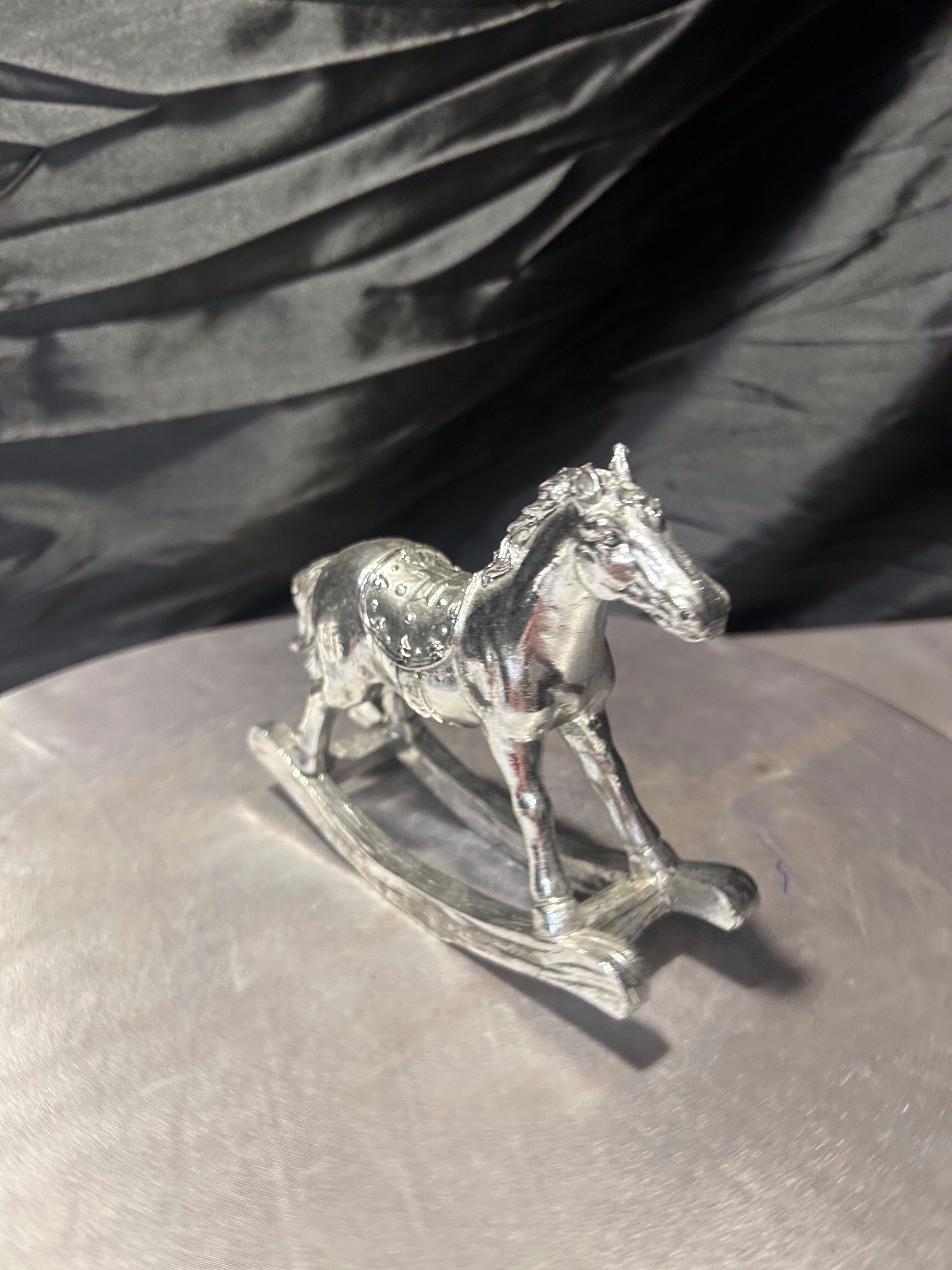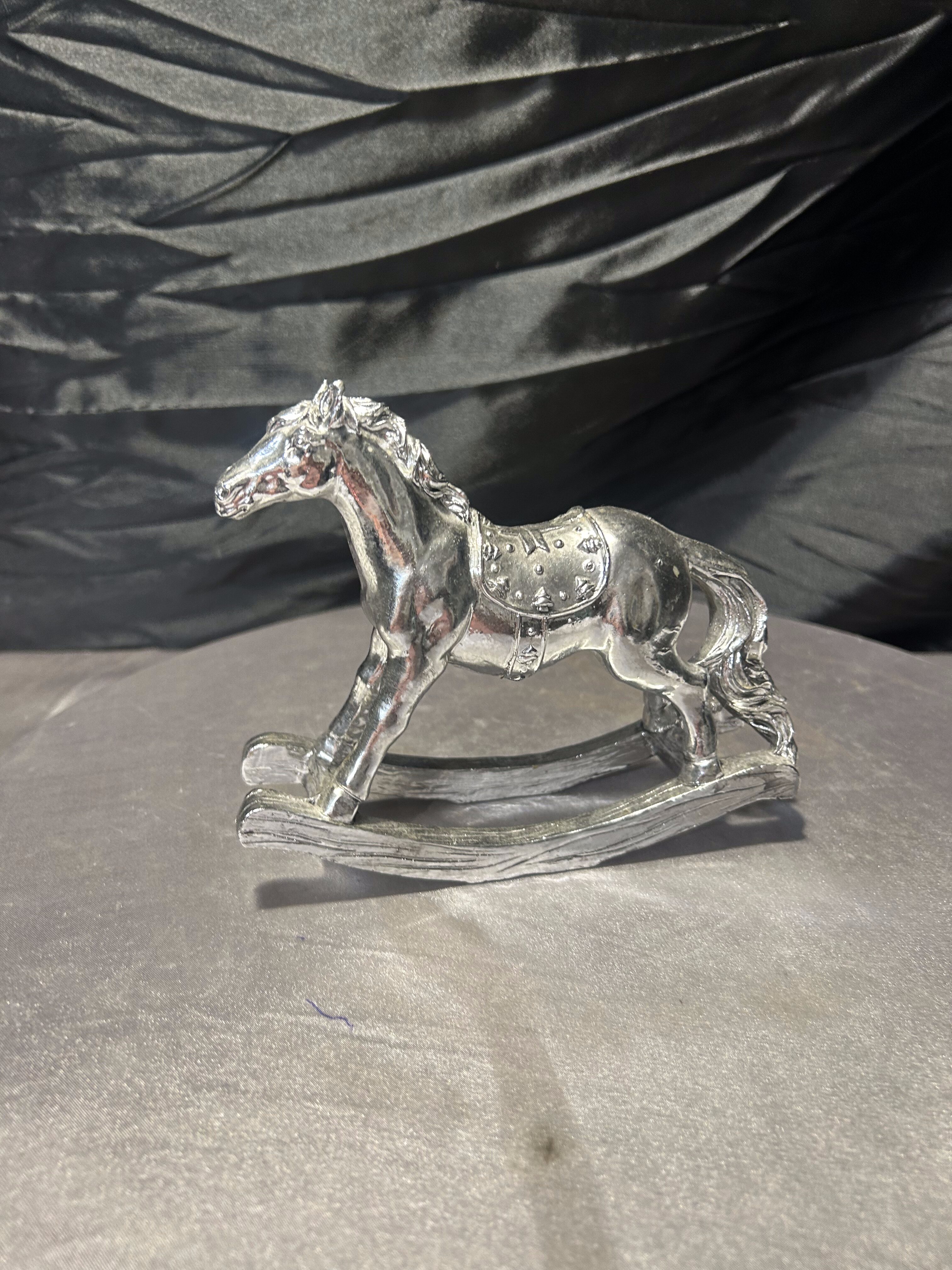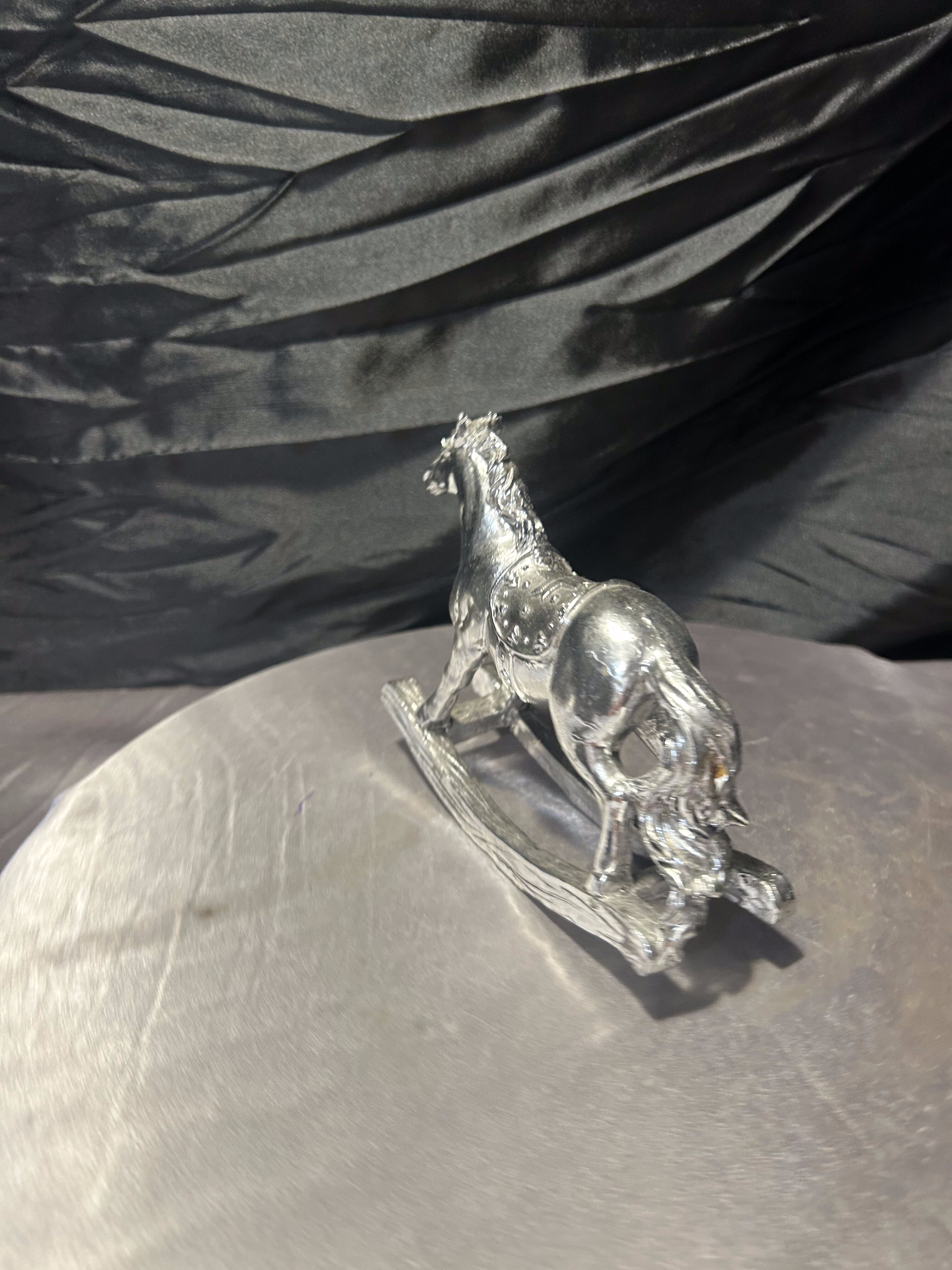 Urokliwa figurka przedstawiająca konia na biegunach, inspirowana klasycznymi zabawkami dziecięcymi znanymi od wielu pokoleń. Wykonana z metalu w eleganckim, srebrnym kolorze, przyciąga uwagę starannym odwzorowaniem detali – widoczna jest stylizowana uprząż, grzywa oraz charakterystyczna forma biegunów, na których osadzona jest figurka.