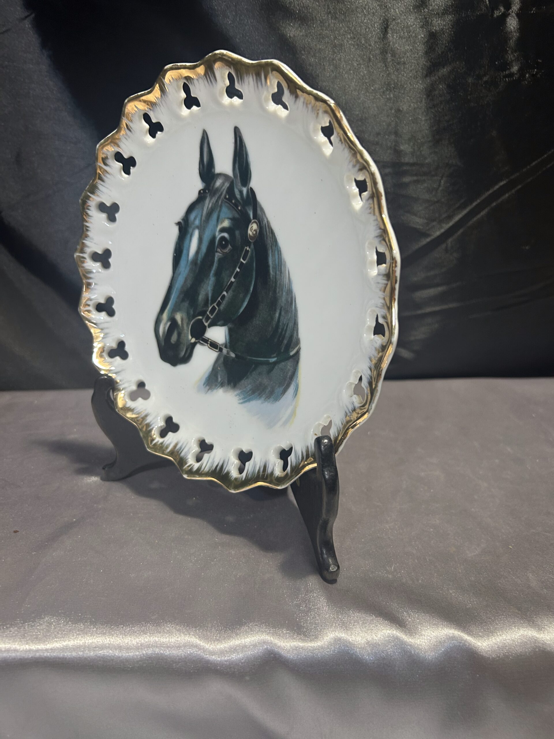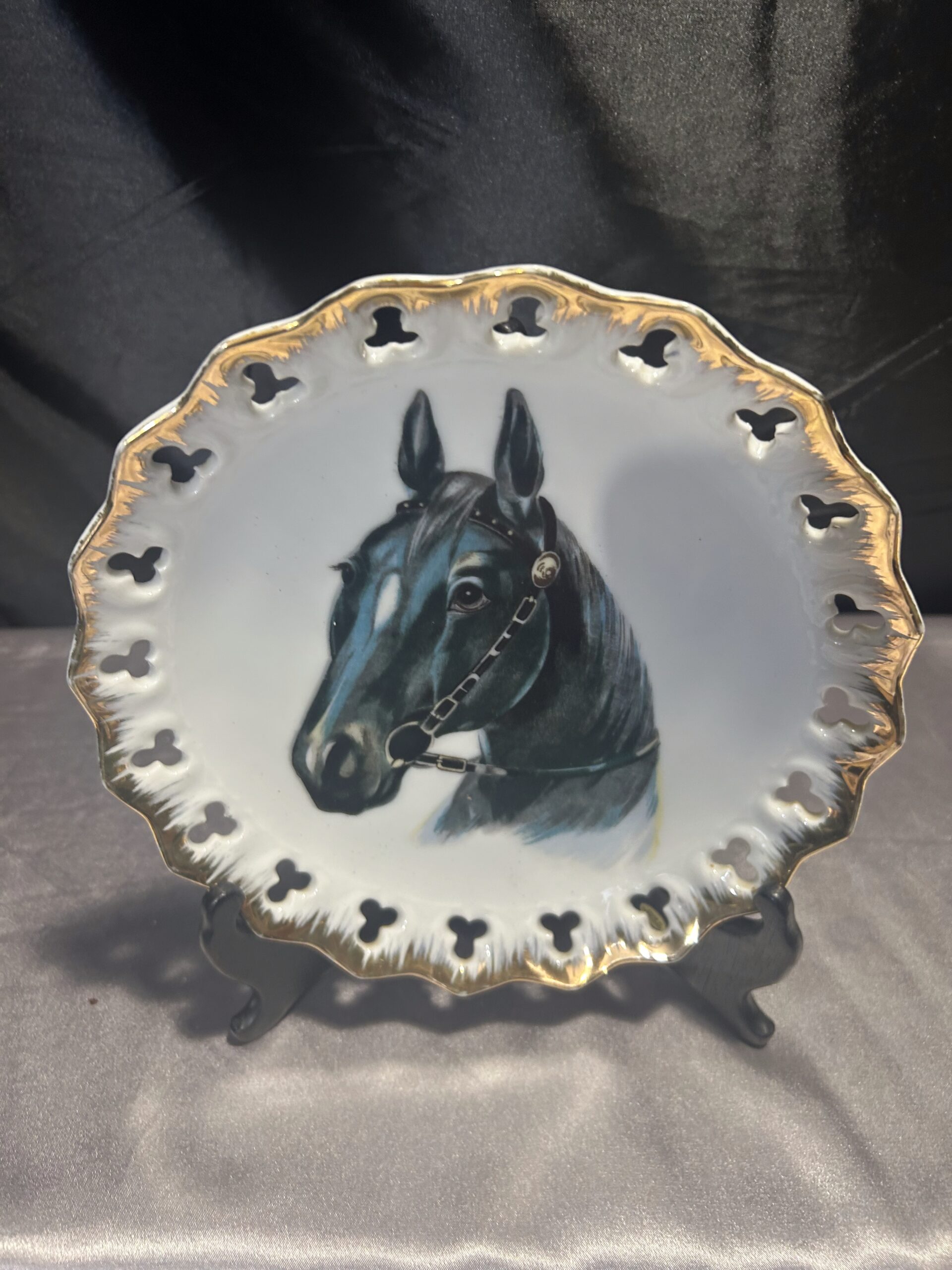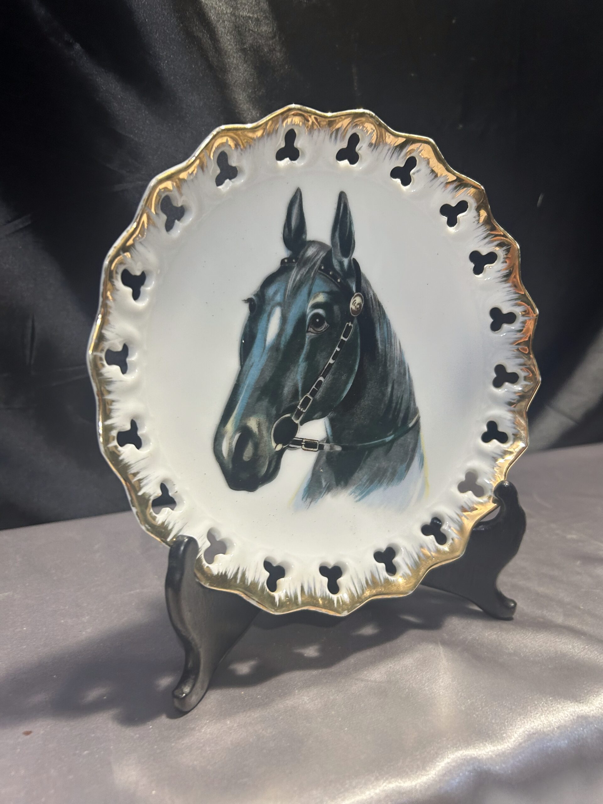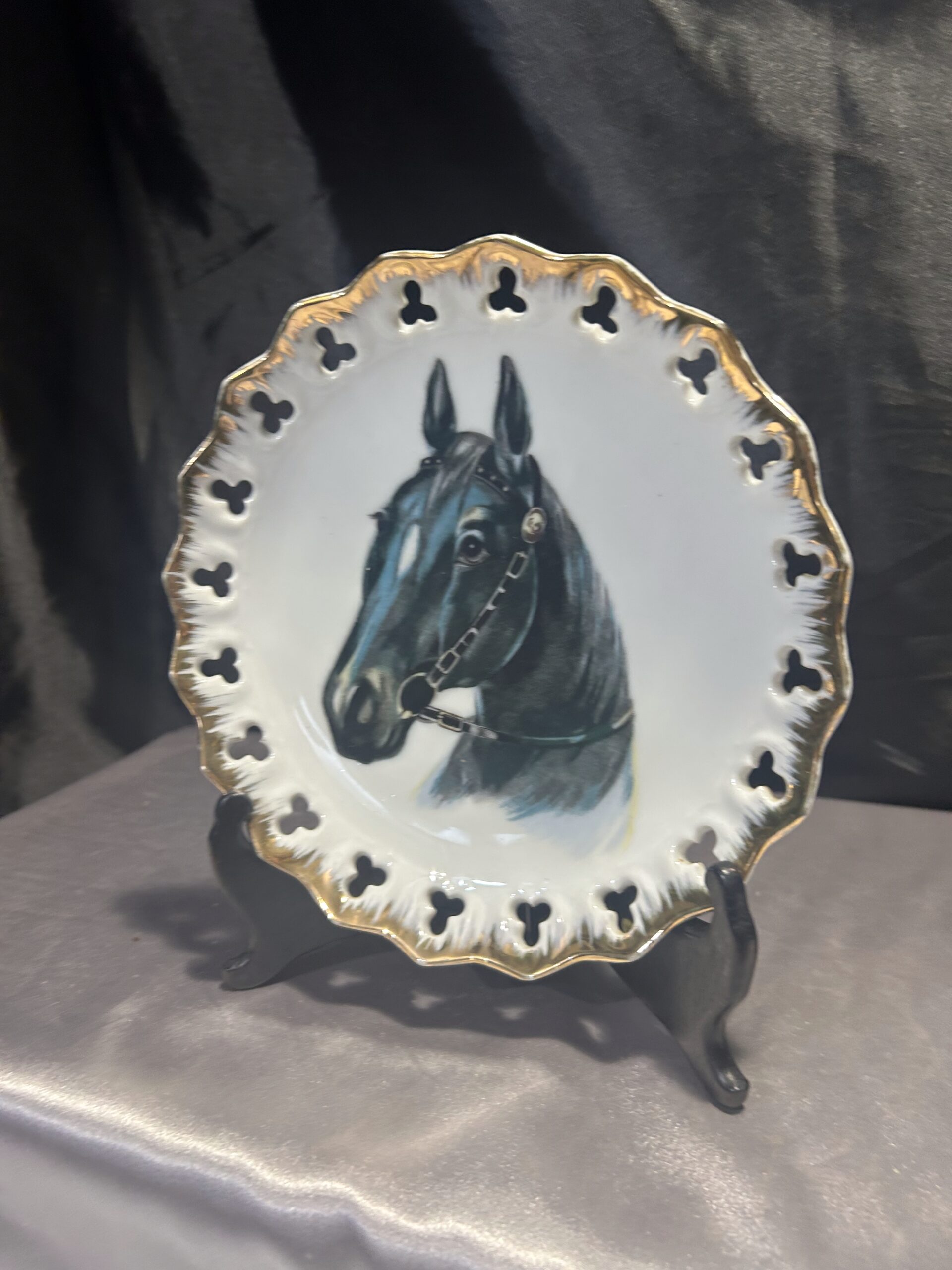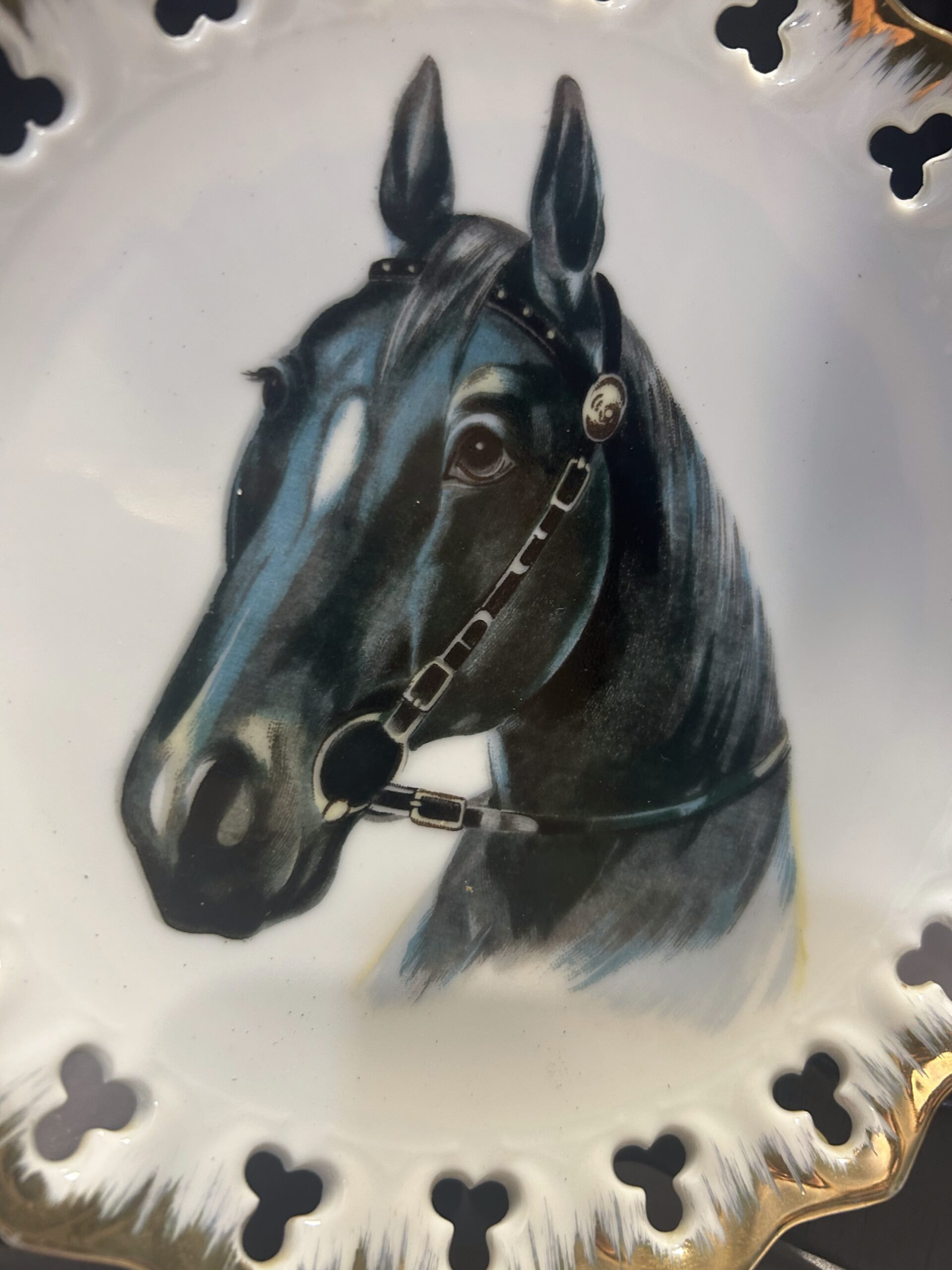 Stylowy ozdobny talerz przedstawiający głowę czarnego konia, doskonały jako dekoracja do powieszenia. Talerz wykonany z białej ceramiki, zdobiony złotą obwódką i ażurowymi dziurkami na krawędzi, co nadaje mu eleganckiego charakteru. Idealny dla miłośników jeździectwa lub wyszukanych dekoracji.