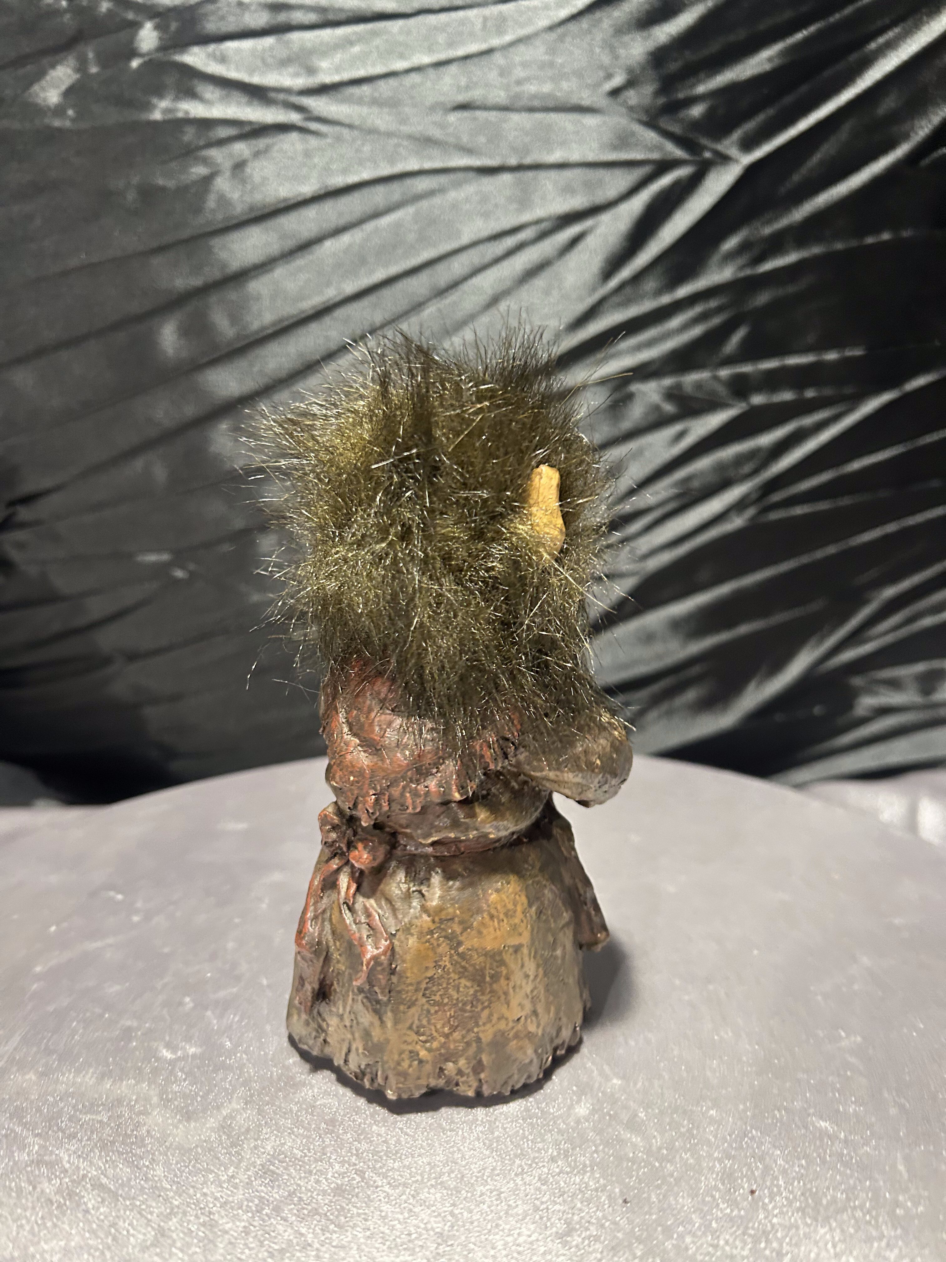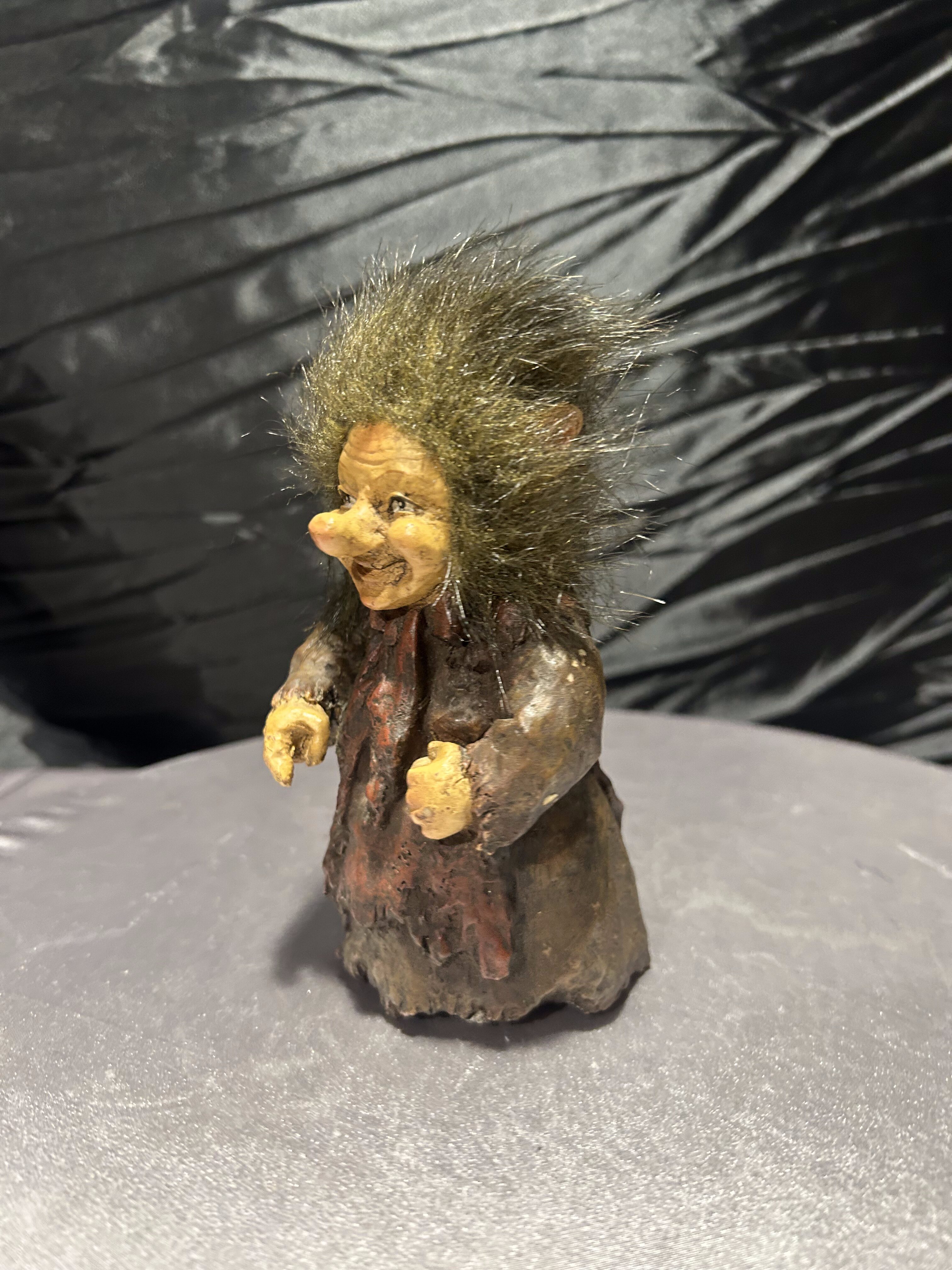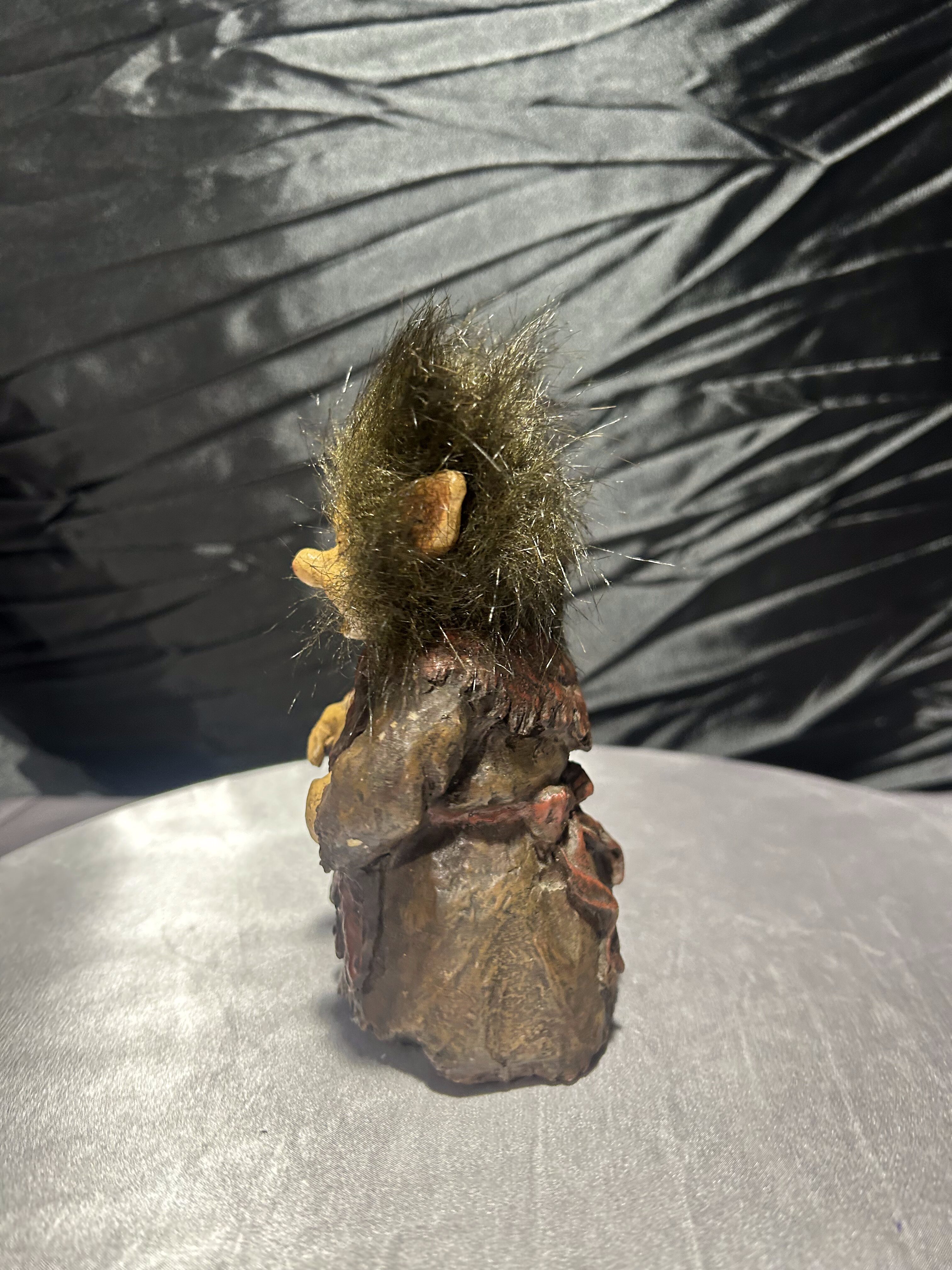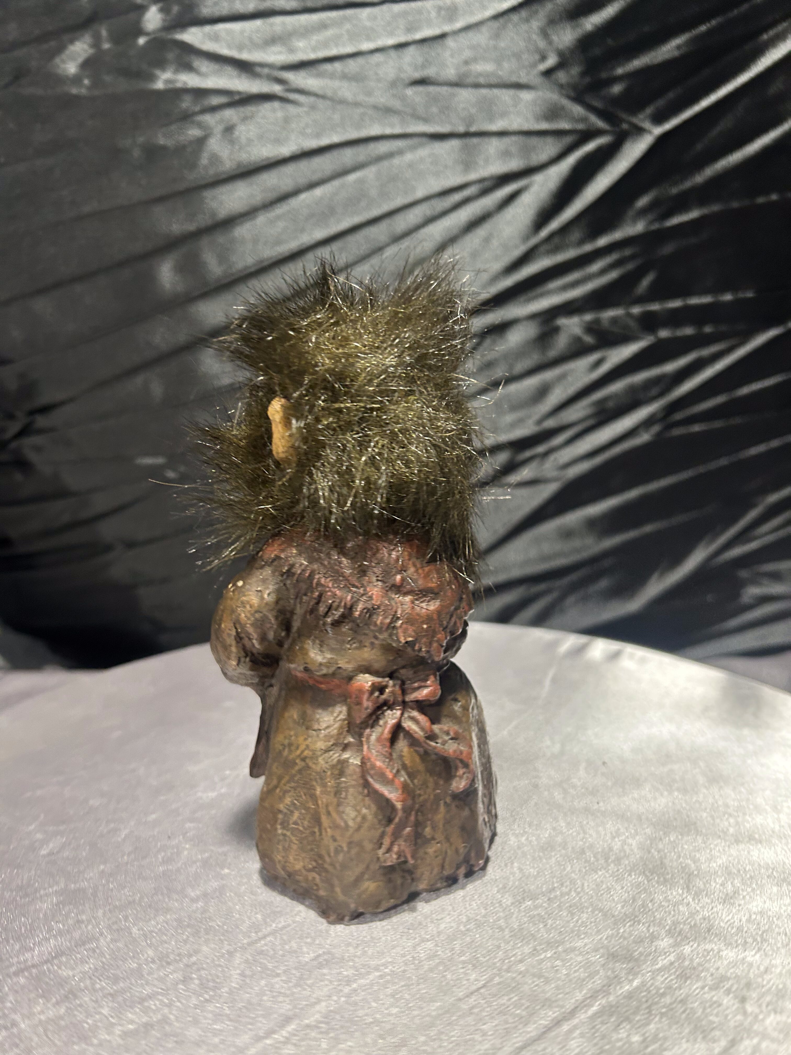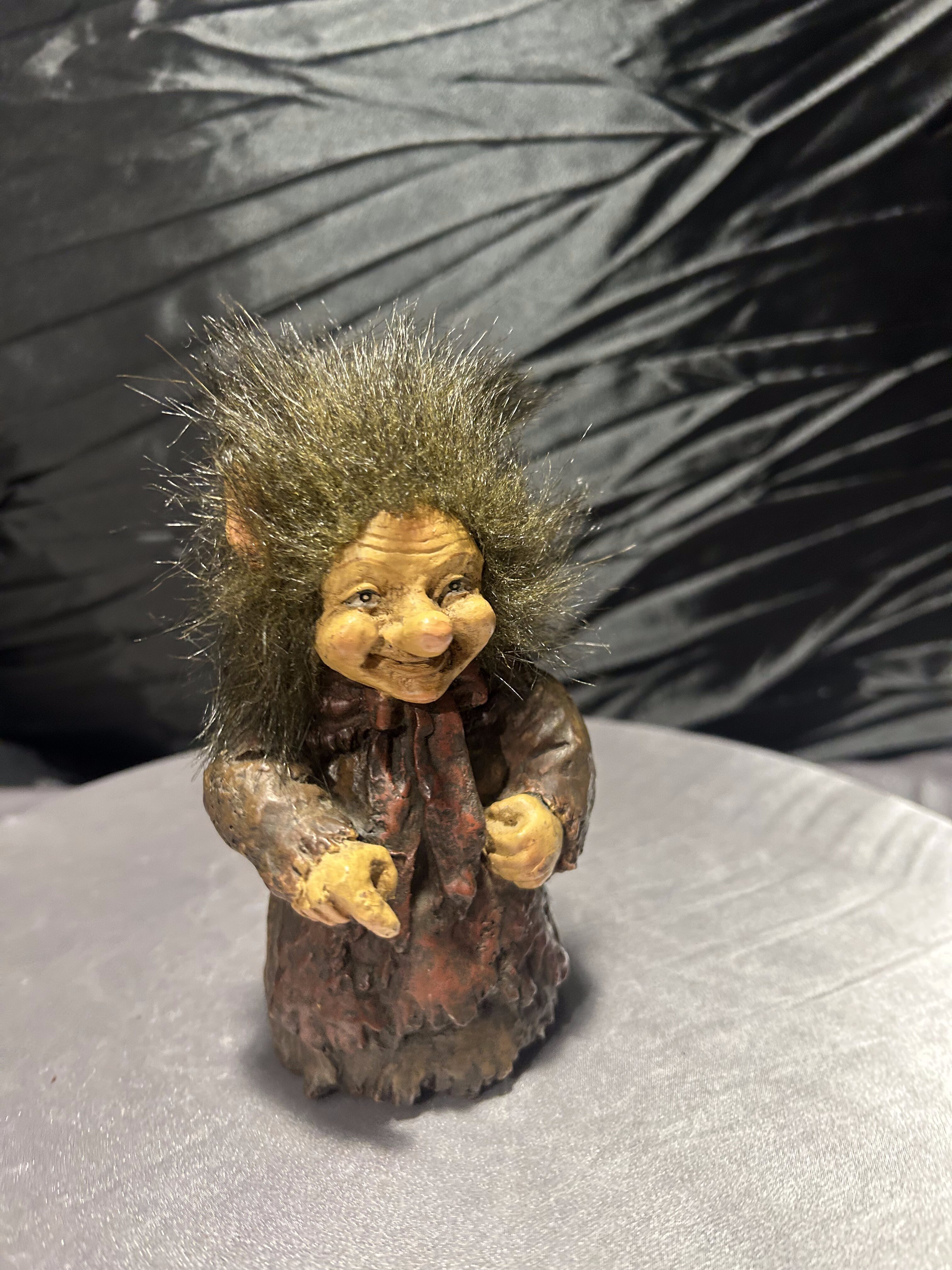 Urocza figurka Pani Troll, charakterystyczna dla norweskiego rzemiosła artystycznego, z oryginalną naklejką Troubs od spodu. Wykonana z niezwykłą dbałością o szczegóły – z włosami z naturalnego włókna, szerokim uśmiechem i klasycznym strojem w ciepłych odcieniach ziemi.