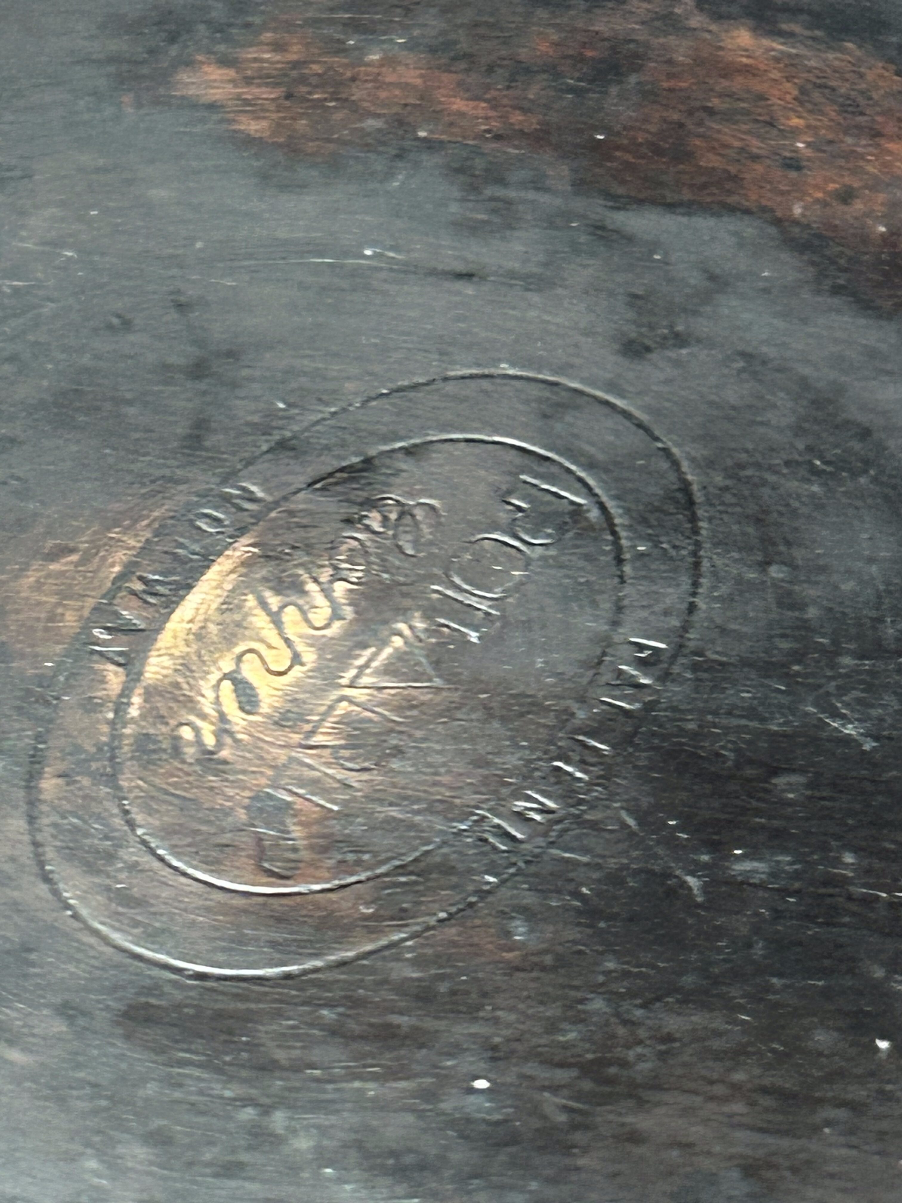 Miedziana misa z uchwytami – sygnowana – średnica 34 cm – oryginalna patelnia vintage