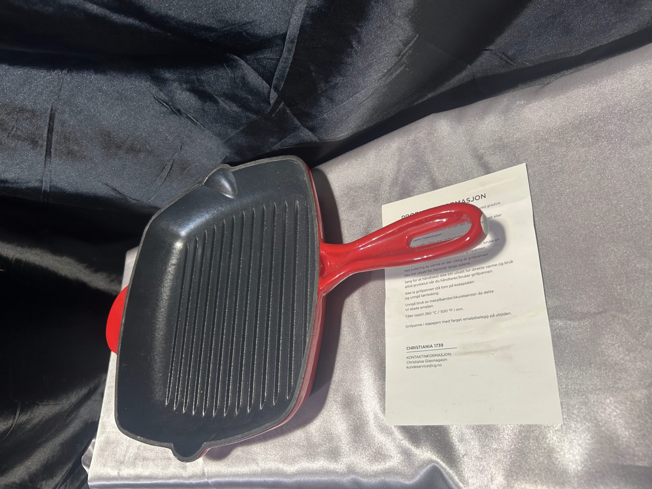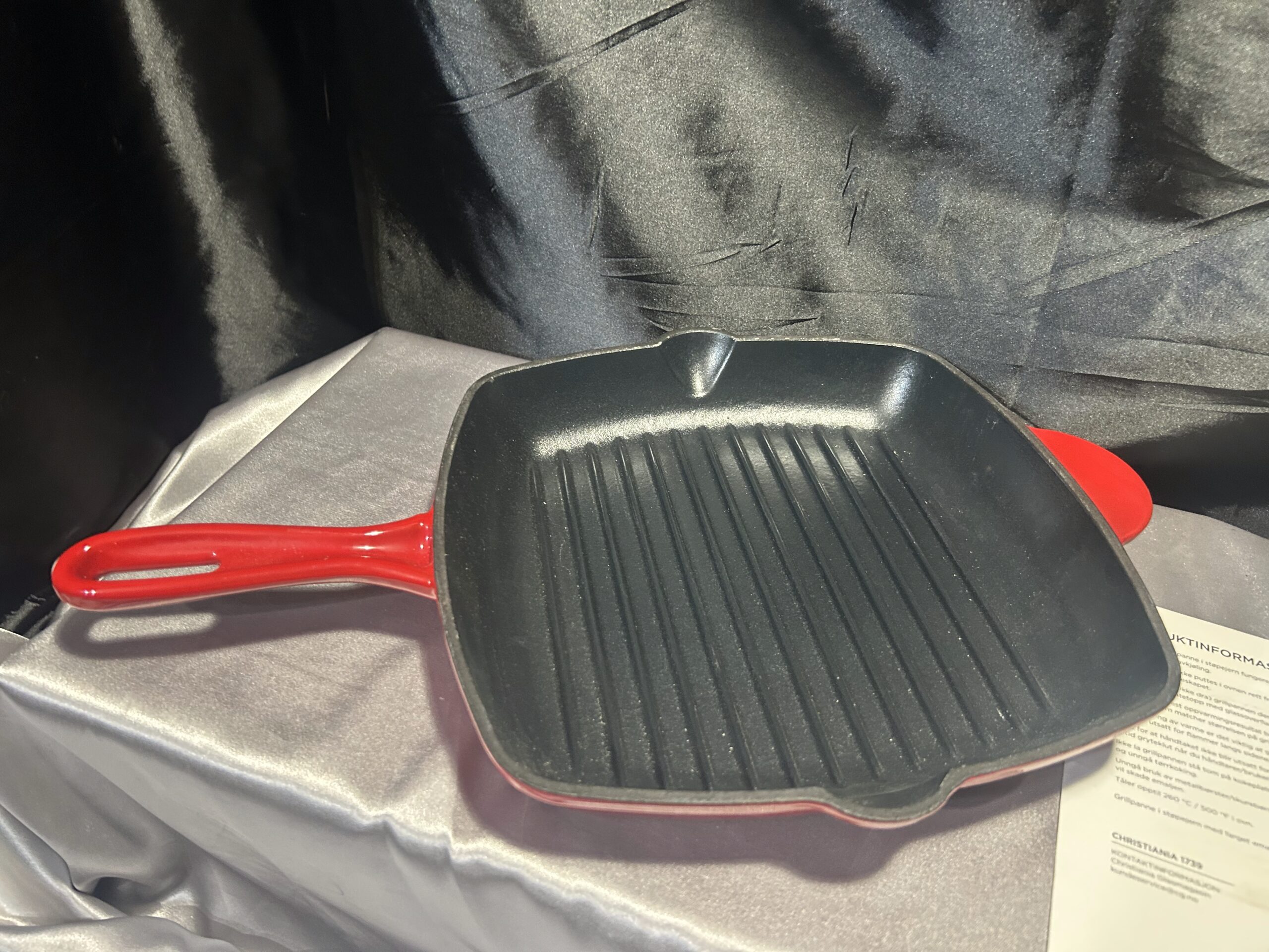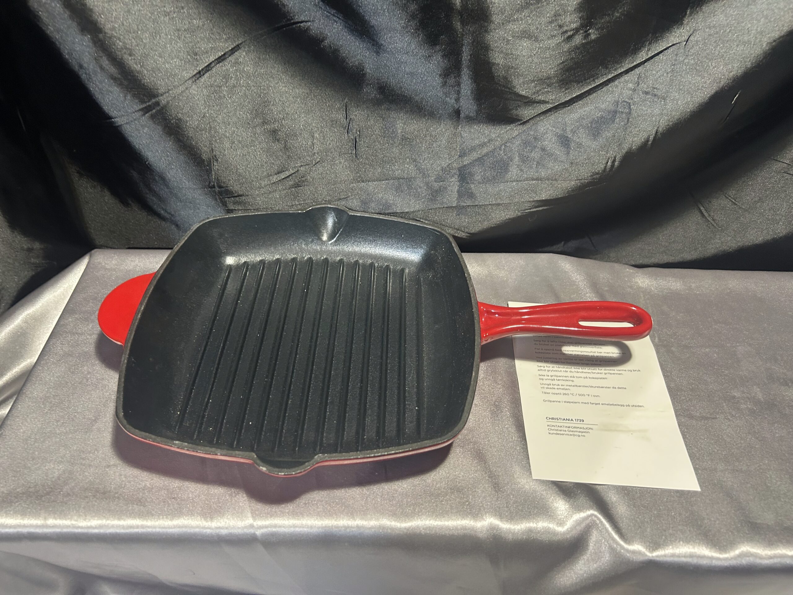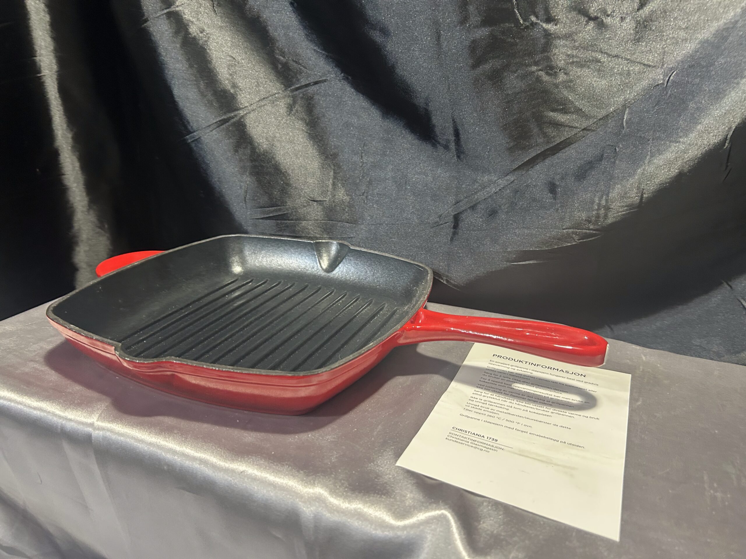 Solidna patelnia żeliwna grillowa o kwadratowym kształcie, idealna do smażenia i grillowania potraw. Wewnętrzna powierzchnia z charakterystycznymi rowkami pozwala na uzyskanie efektu grillowania, a czerwona emalia na zewnątrz dodaje elegancji i ułatwia czyszczenie. Patelnia jest jak nowa i posiada oryginalną instrukcję w języku norweskim. Doskonały wybór do kuchni domowej oraz profesjonalnego użytku.