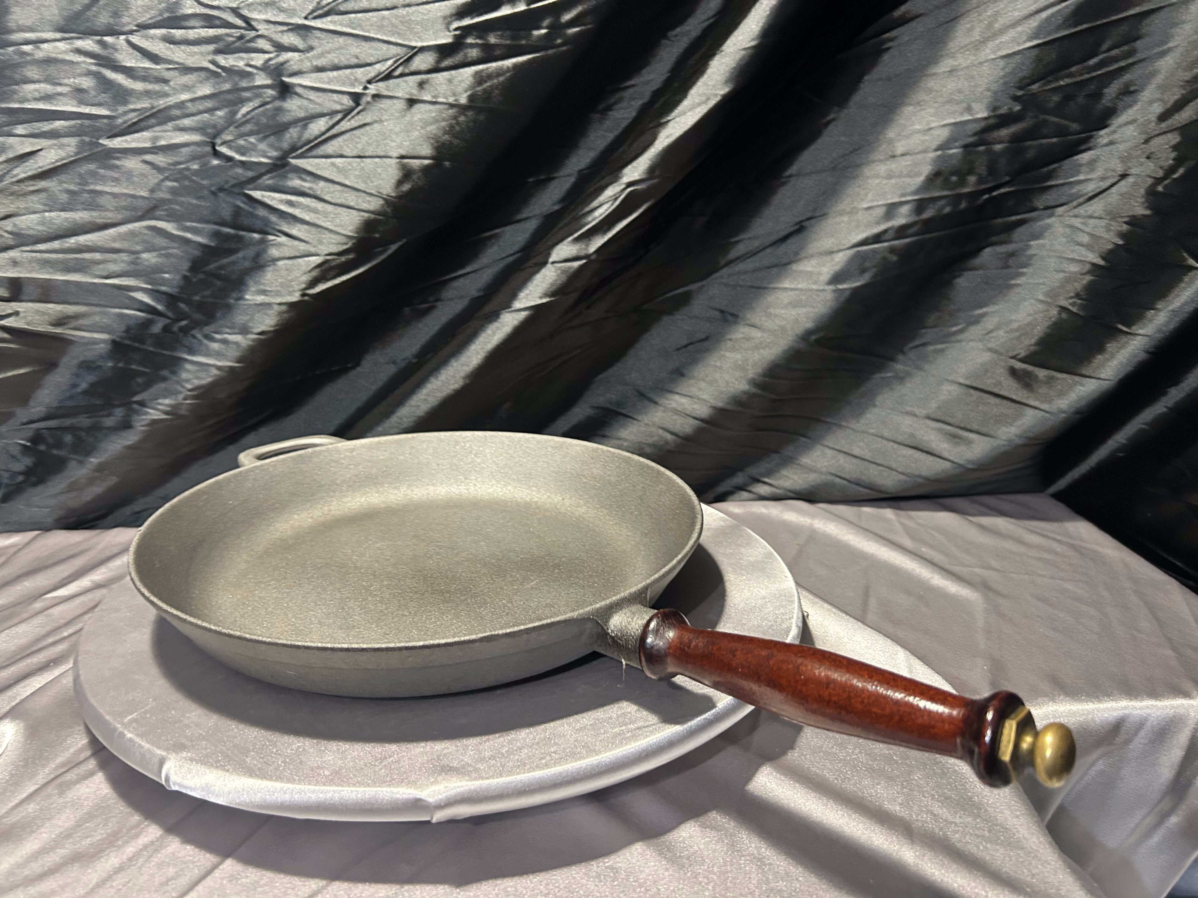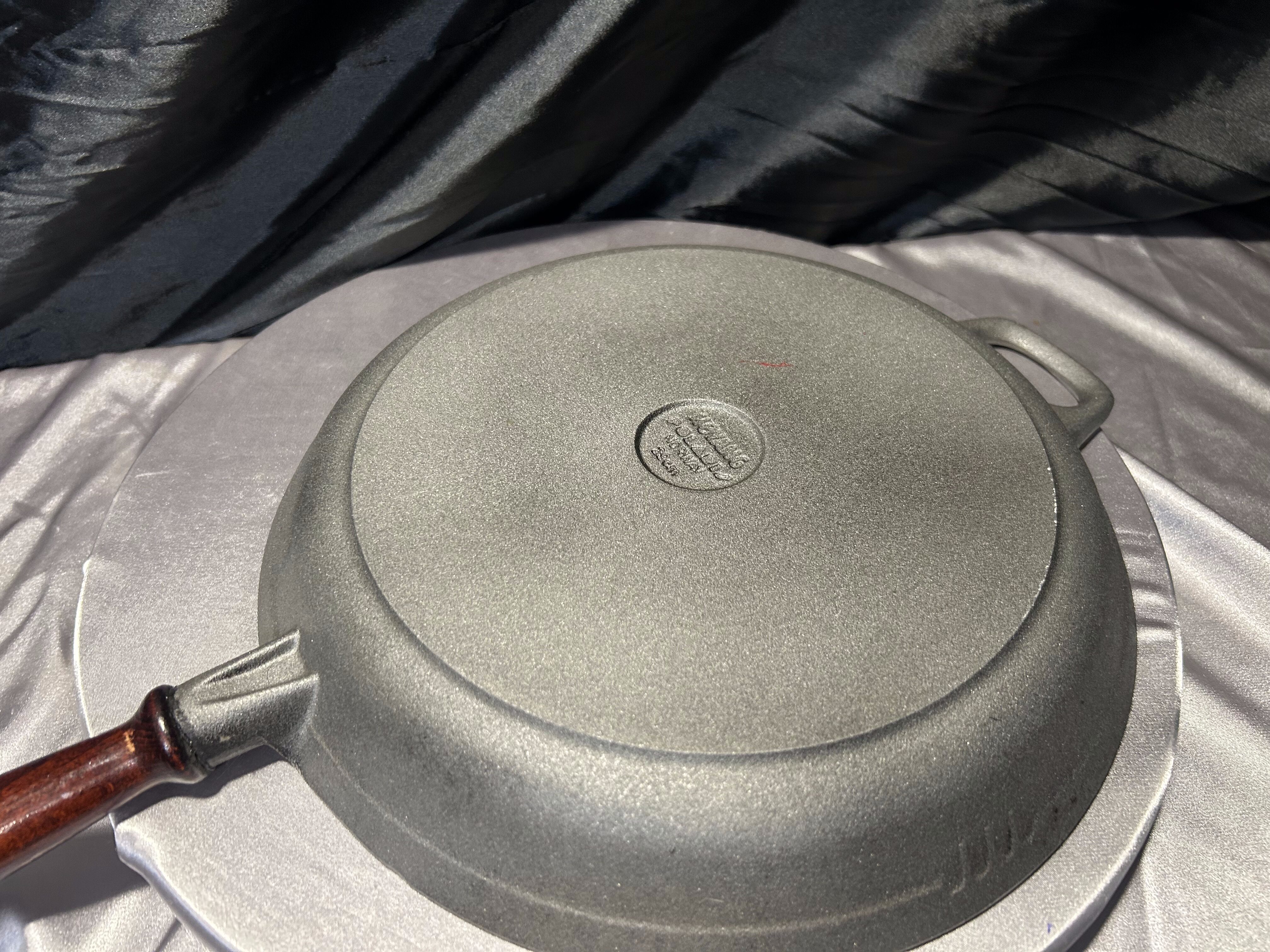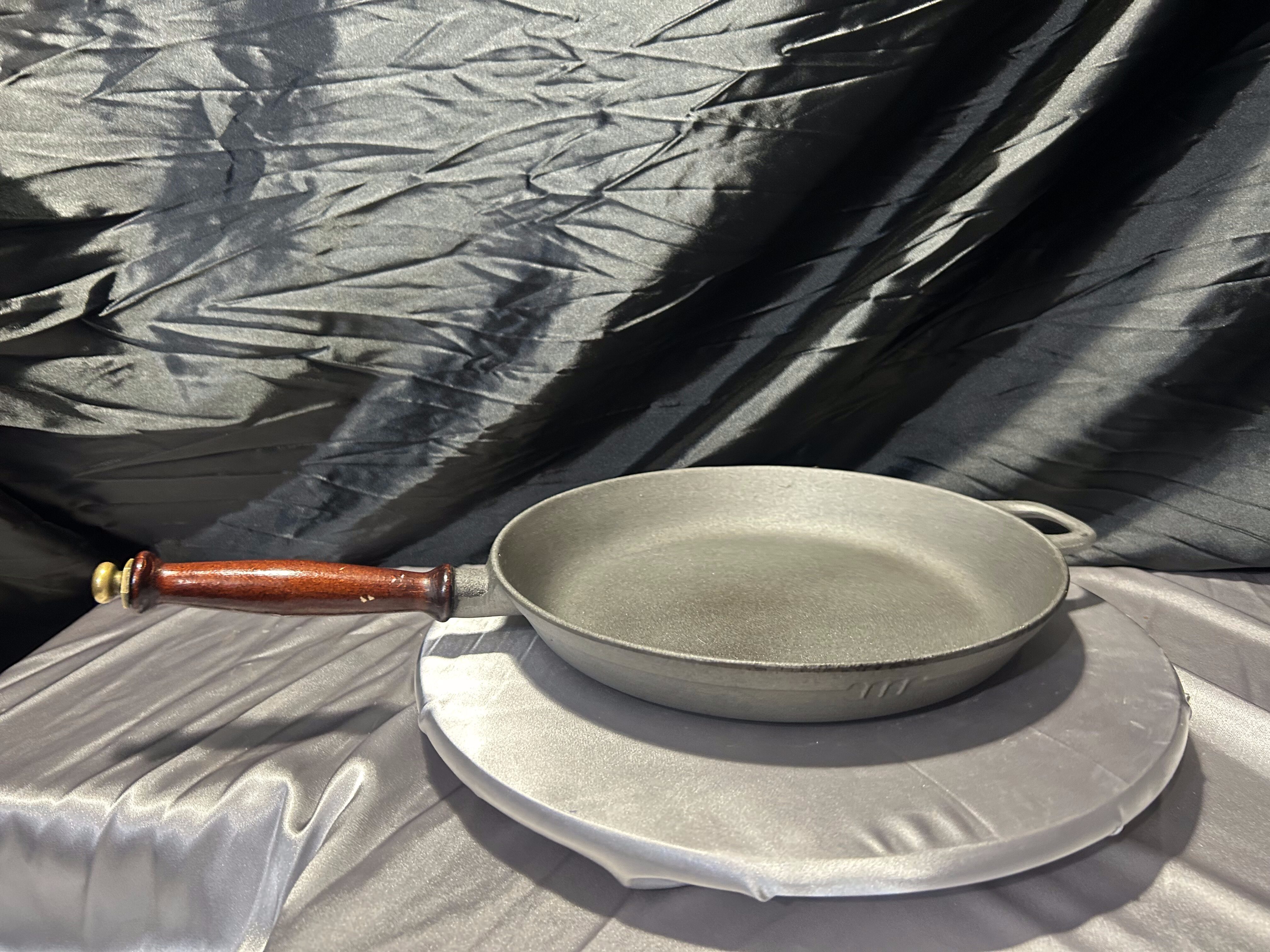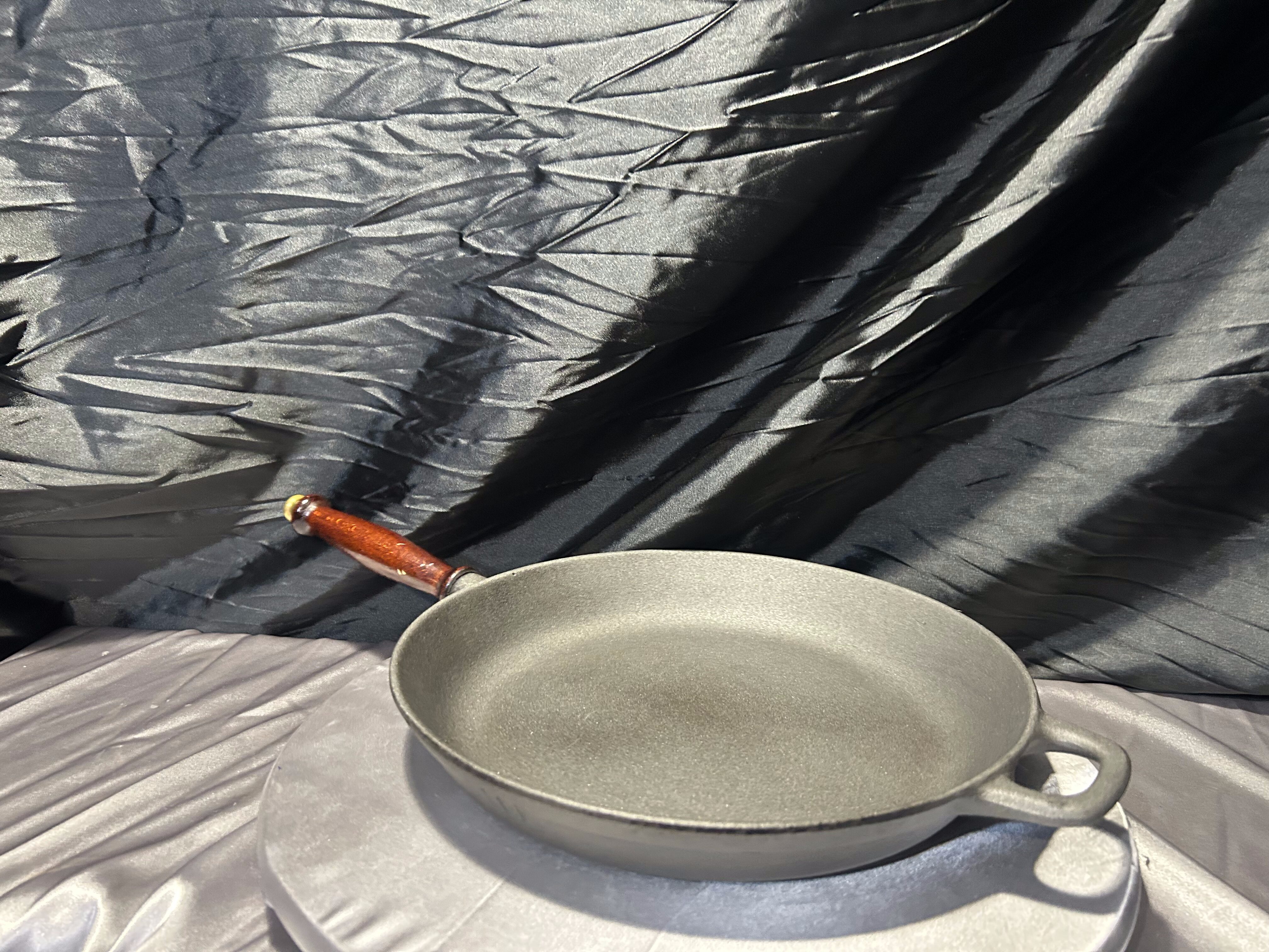 Ta patelnia to połączenie funkcjonalności i tradycyjnego rzemiosła – masywne żeliwo i stylowa drewniana rączka tworzą naczynie, które sprawdzi się w każdej kuchni, zapewniając doskonałe rezultaty gotowania.