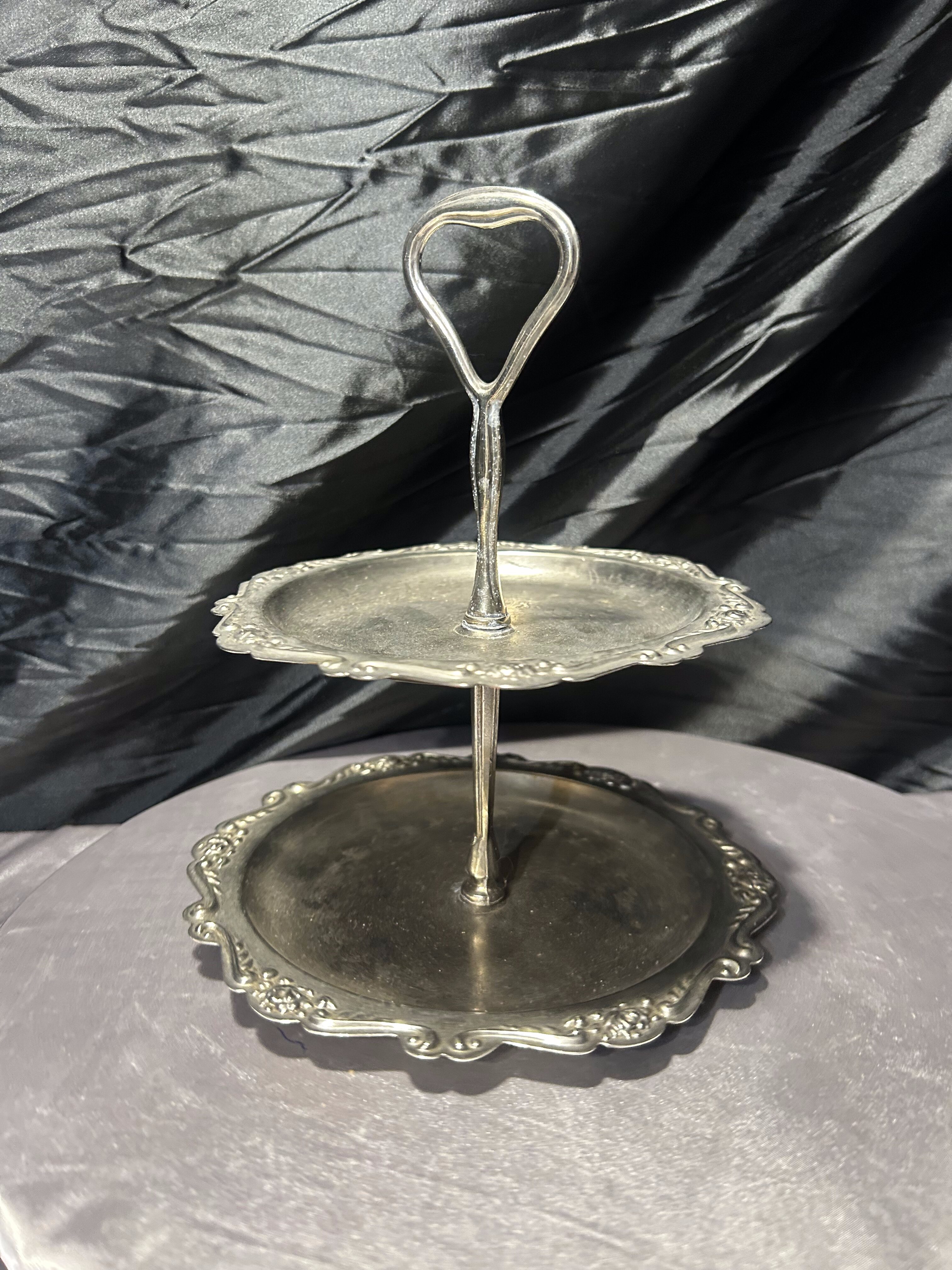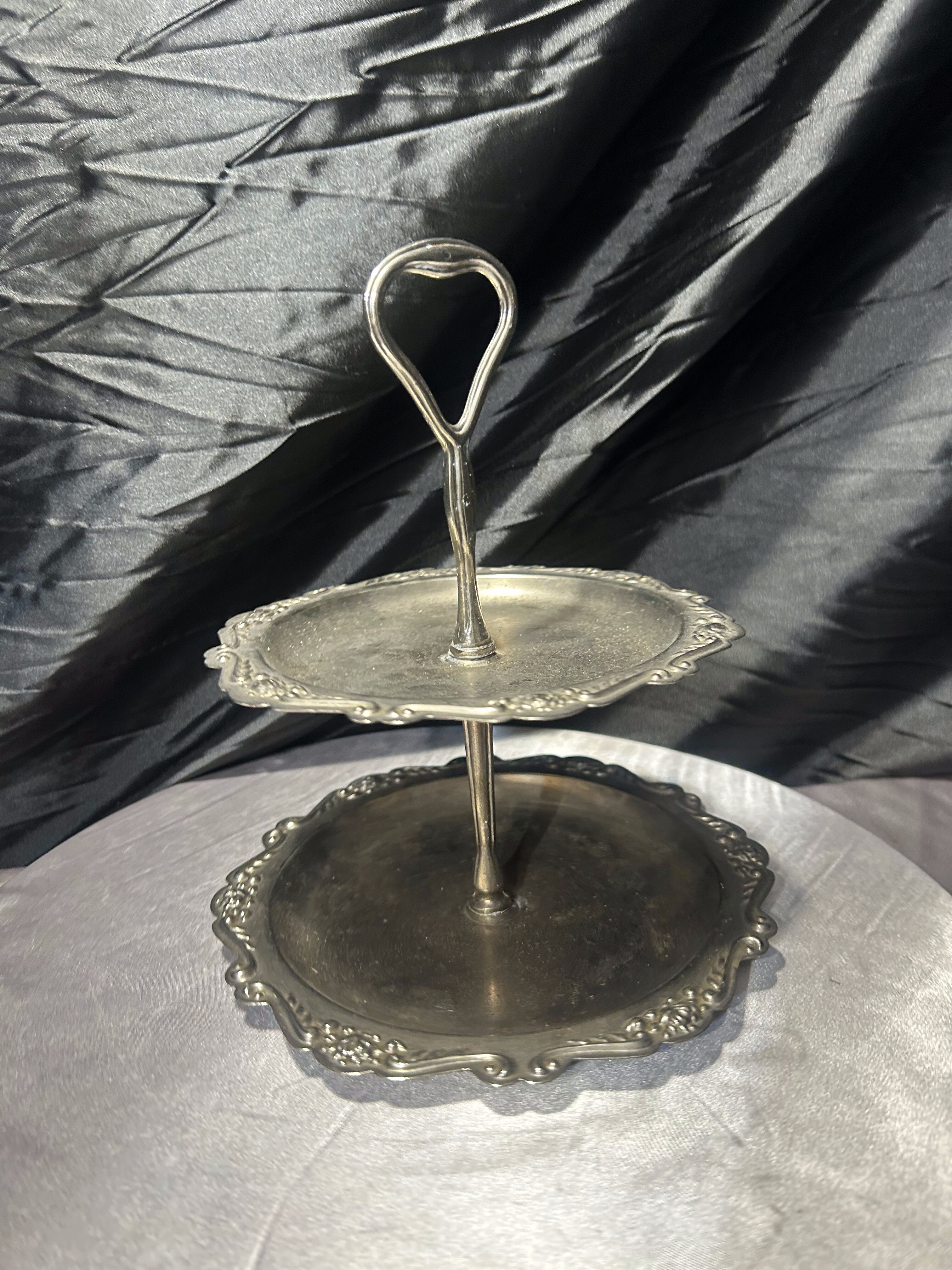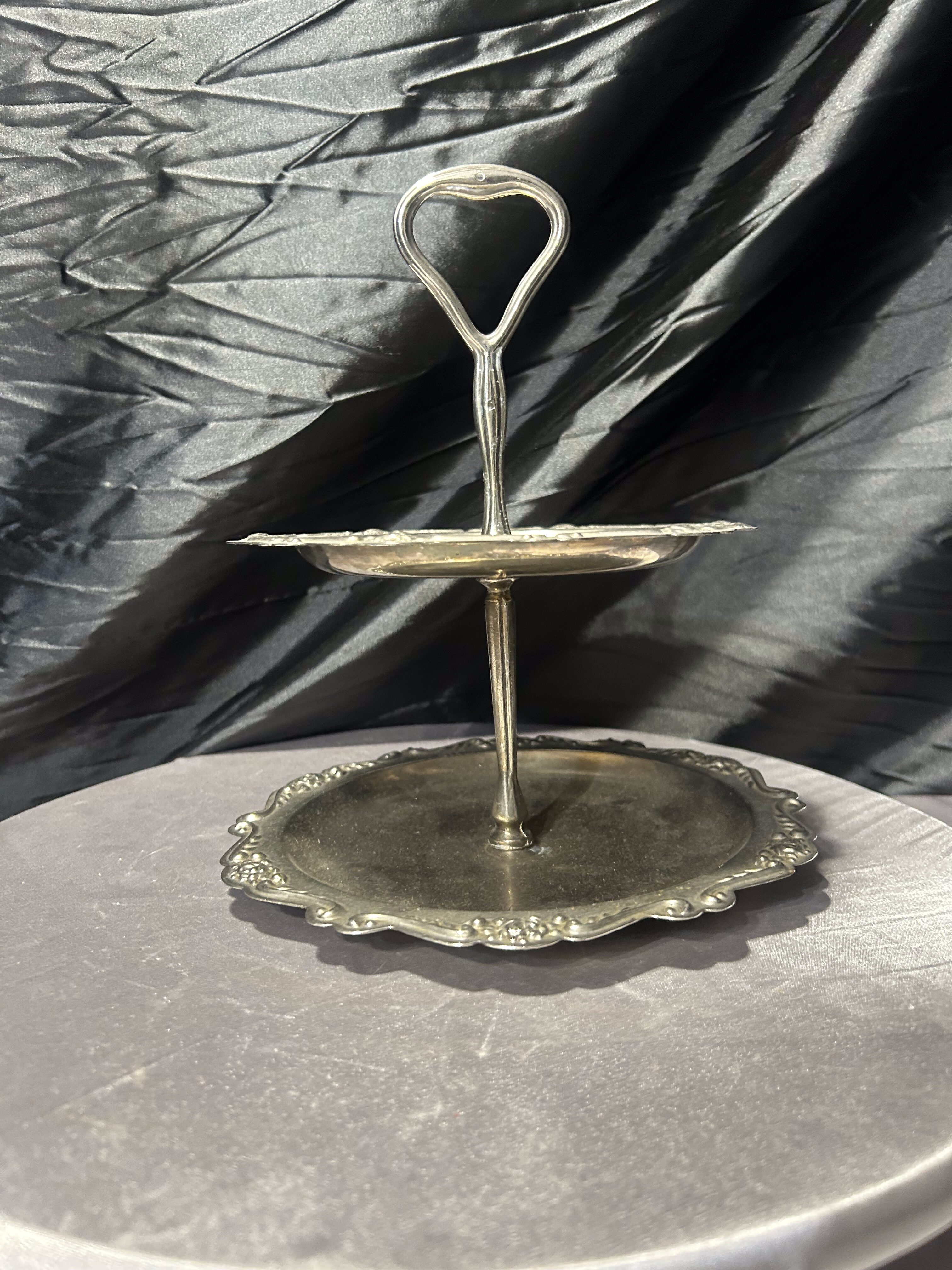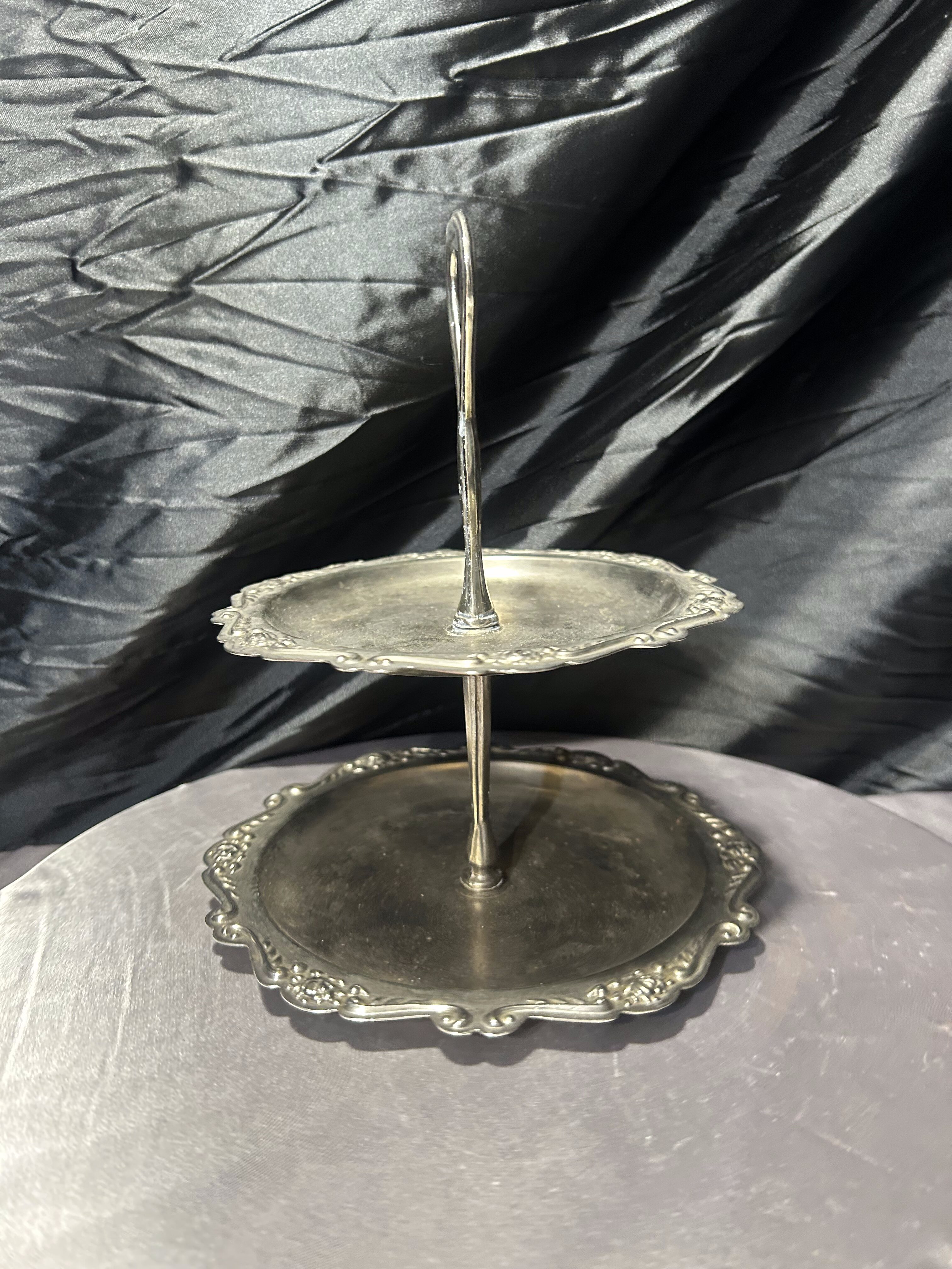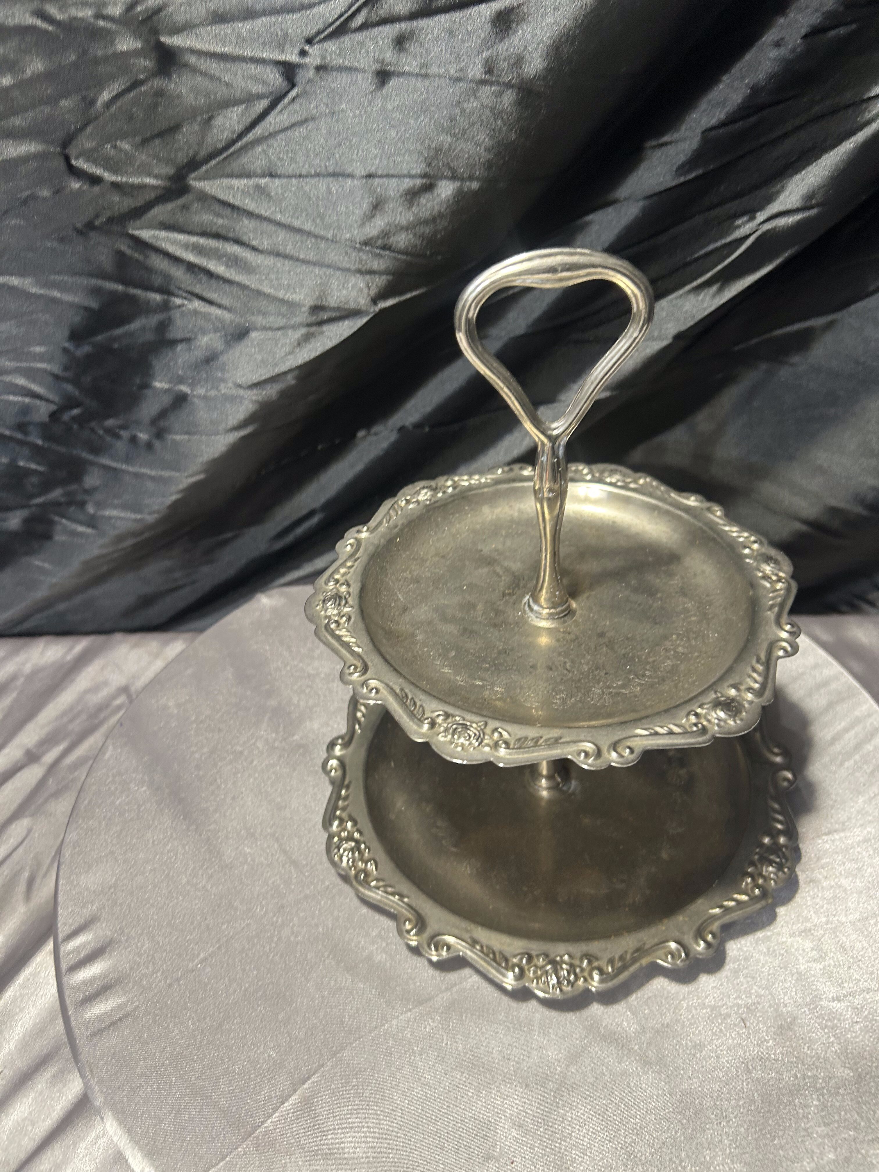 Przedstawiam elegancką, dwupoziomową paterę wykonaną w srebrnym kolorze, z dekoracyjnym uchwytem umożliwiającym wygodne przenoszenie. Jej klasyczna, lekko ornamentalna forma oraz delikatnie falowane ranty sprawiają, że pięknie prezentuje się na stole, komodzie lub jako element zastawy podczas rodzinnych spotkań. Idealna do serwowania ciast, owoców, słodkości lub jako ozdobna patera stojąca na stałe w kuchni czy salonie.