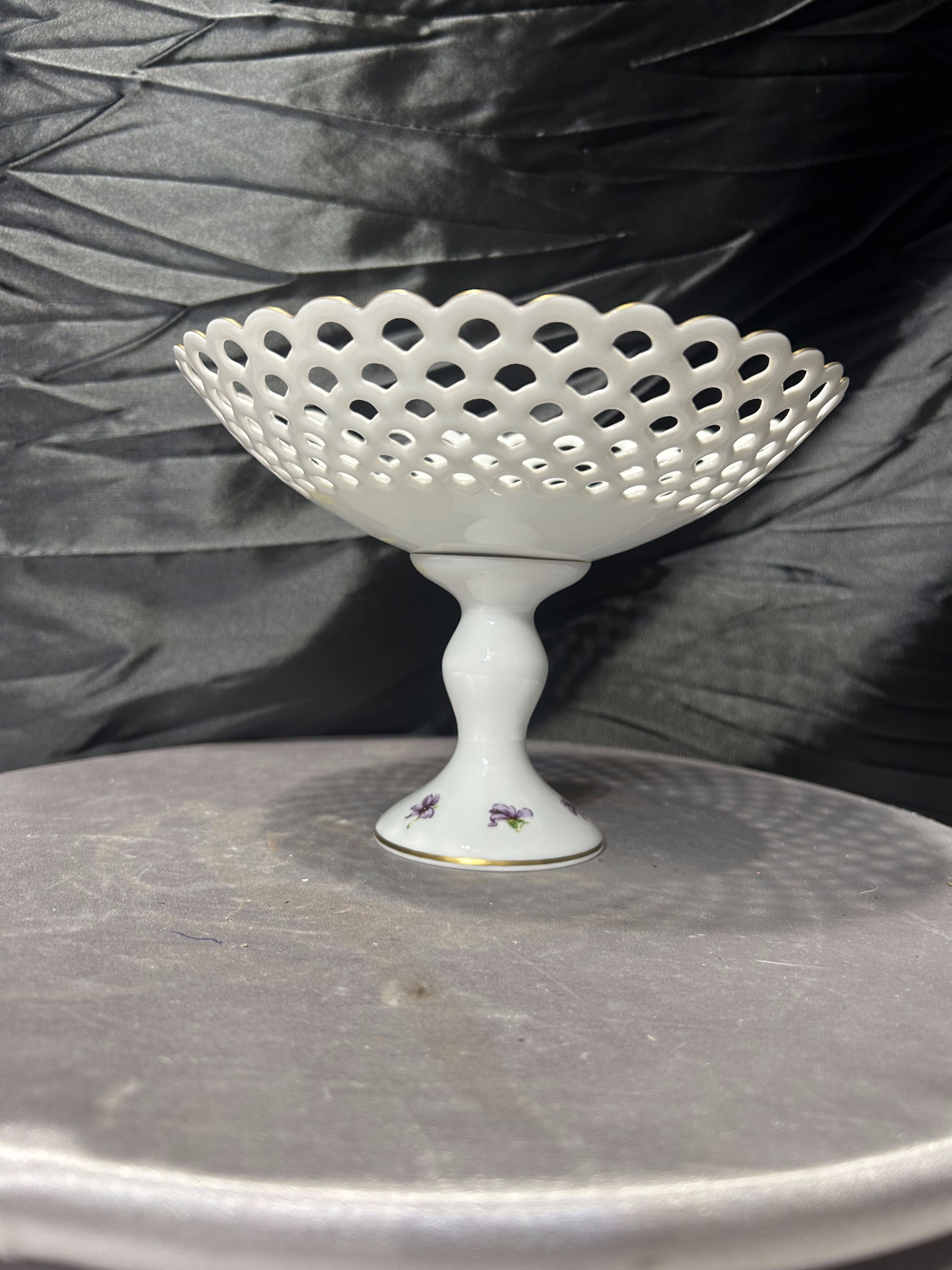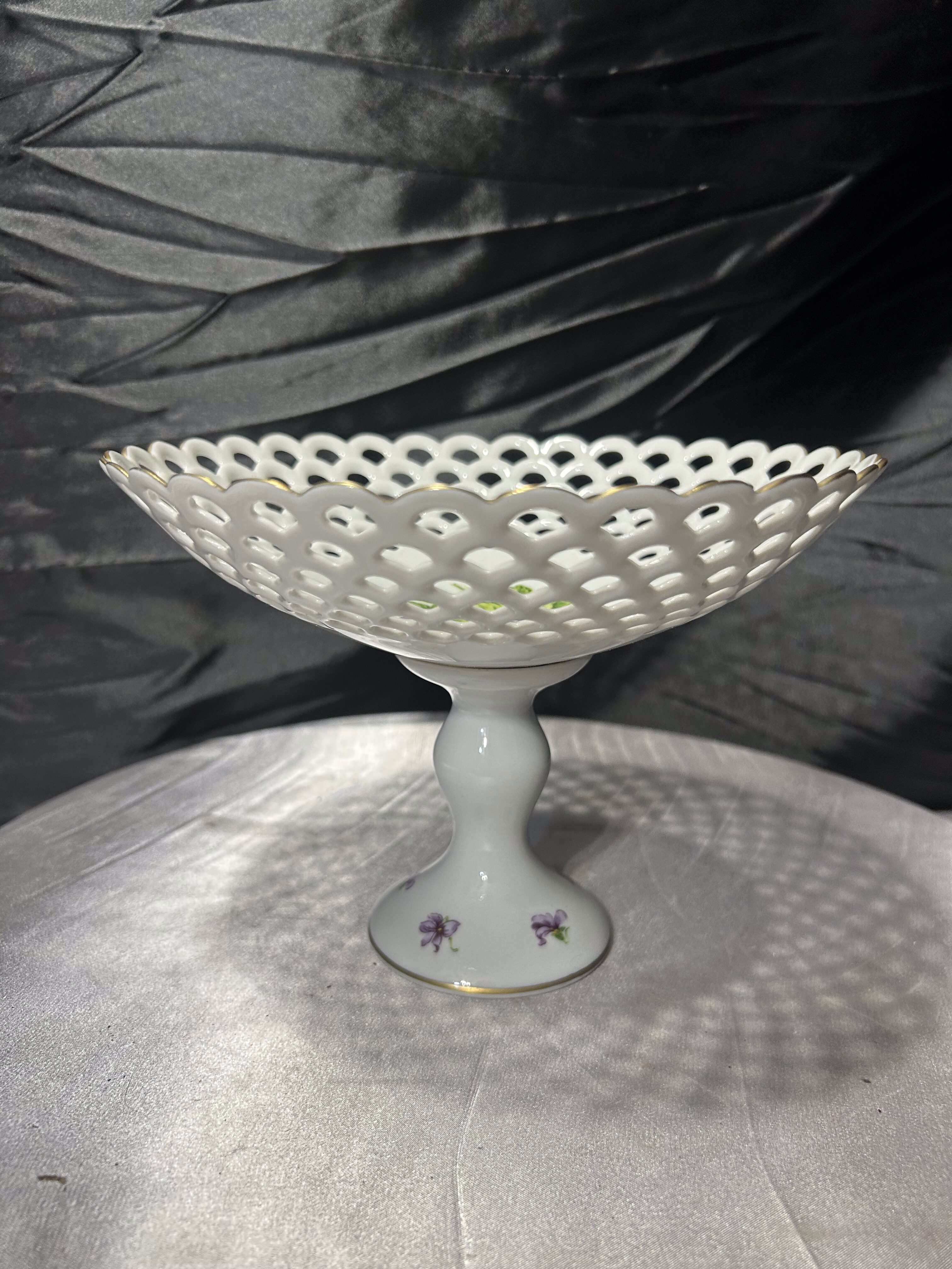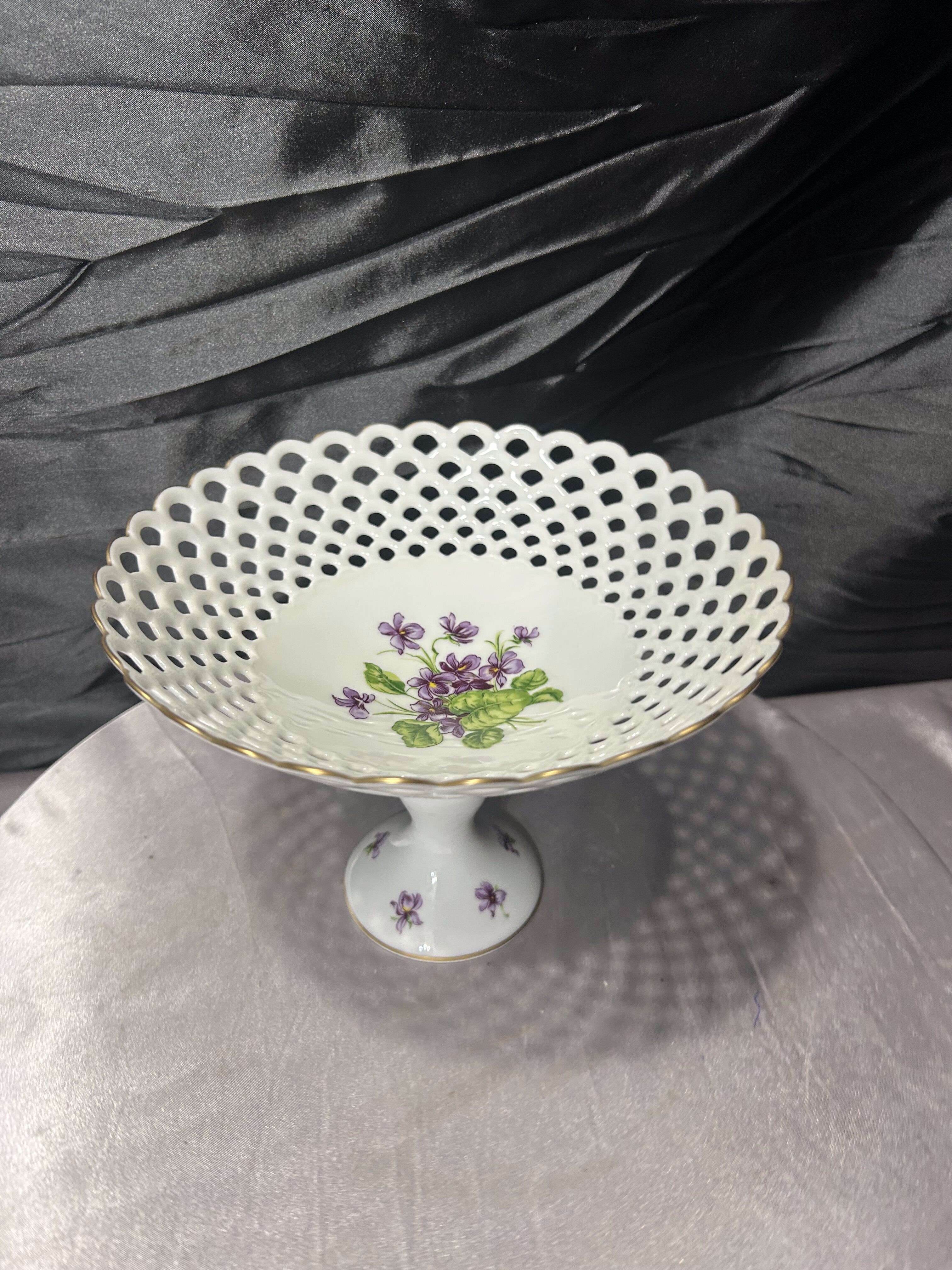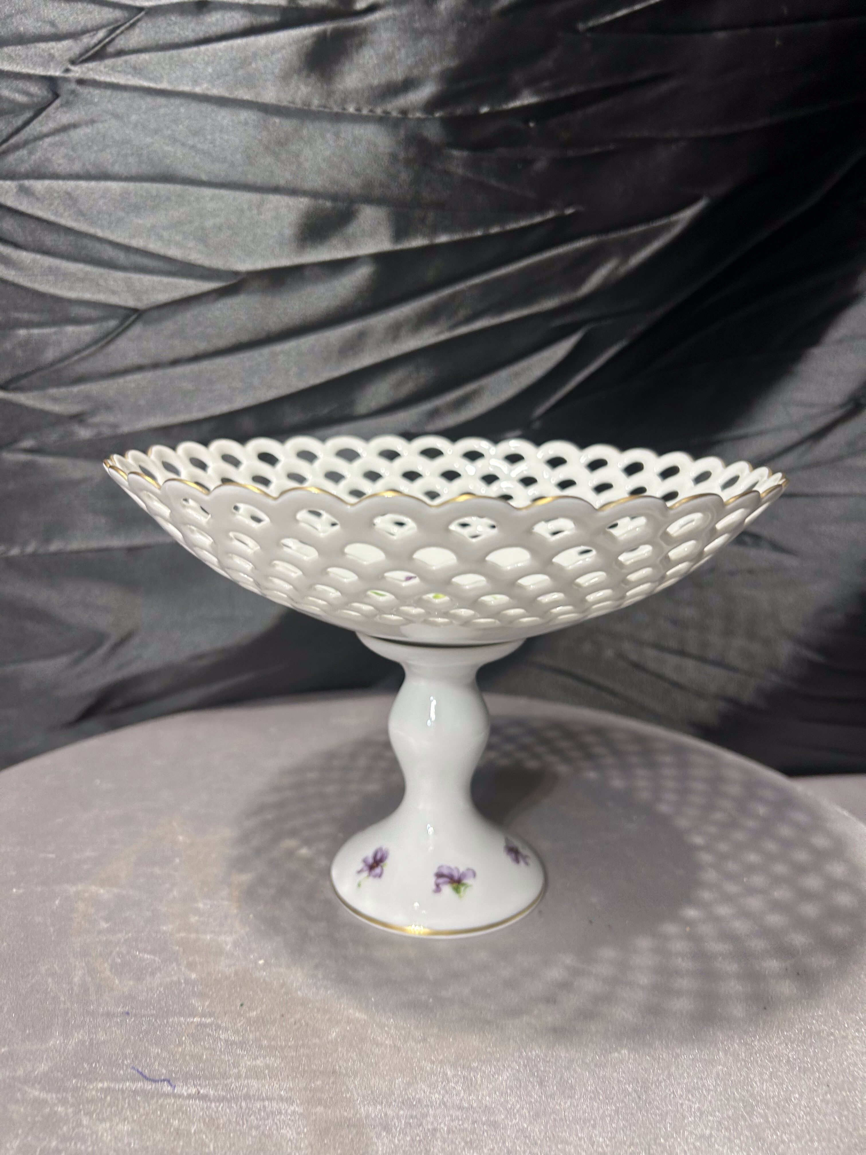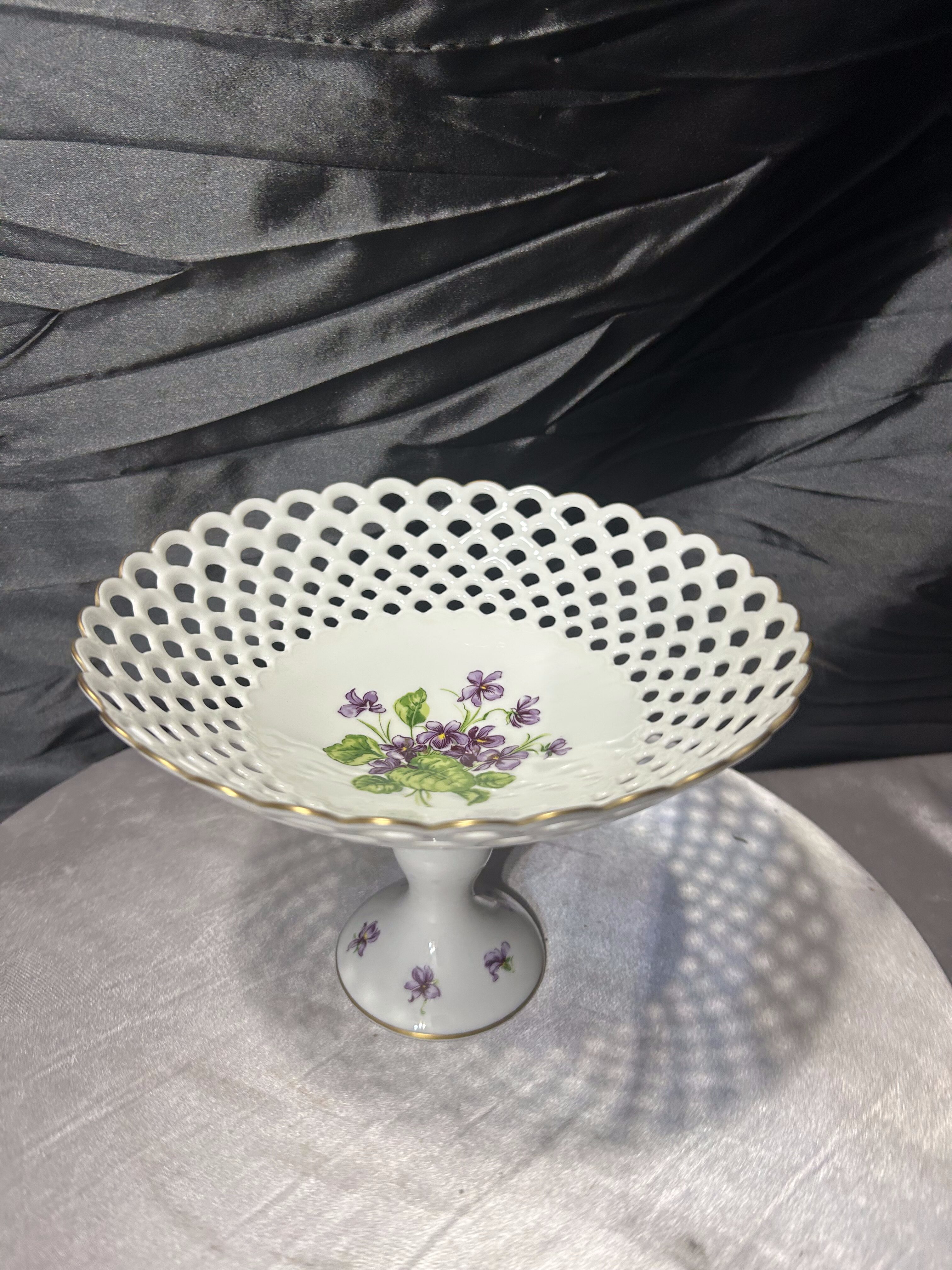 - Patera porcelanowa na nóżce – fioletowe kwiaty, ażurowy brzeg