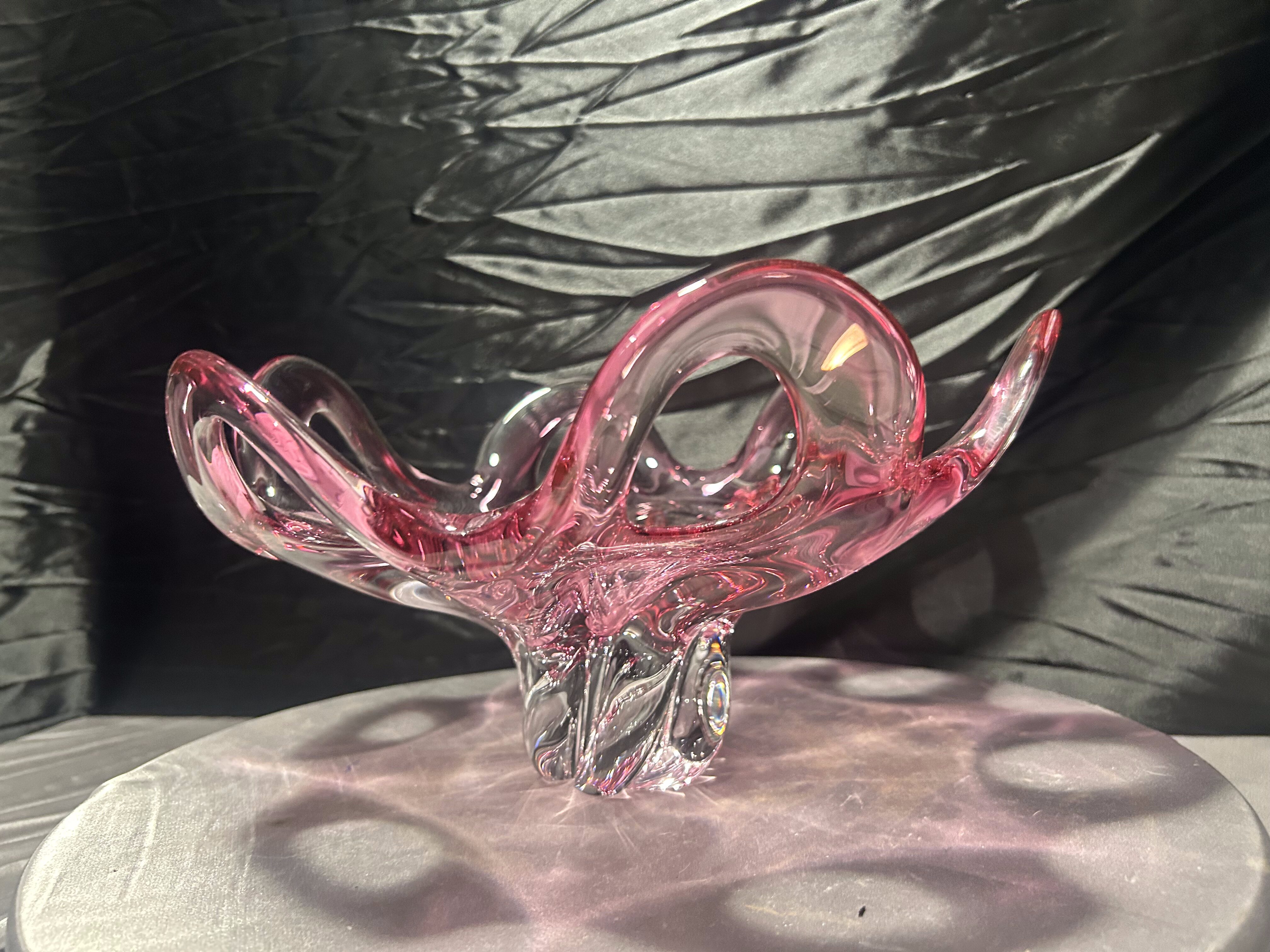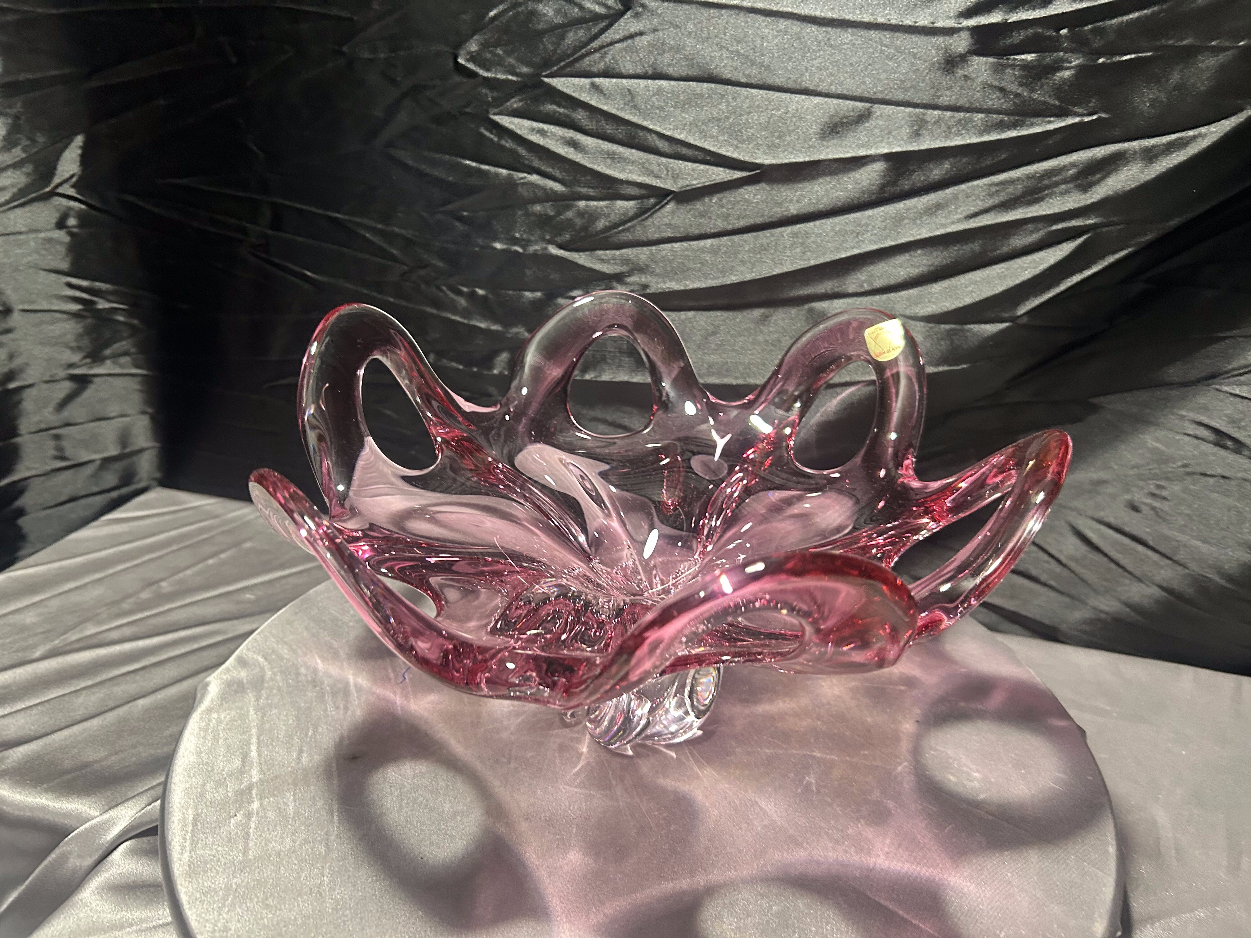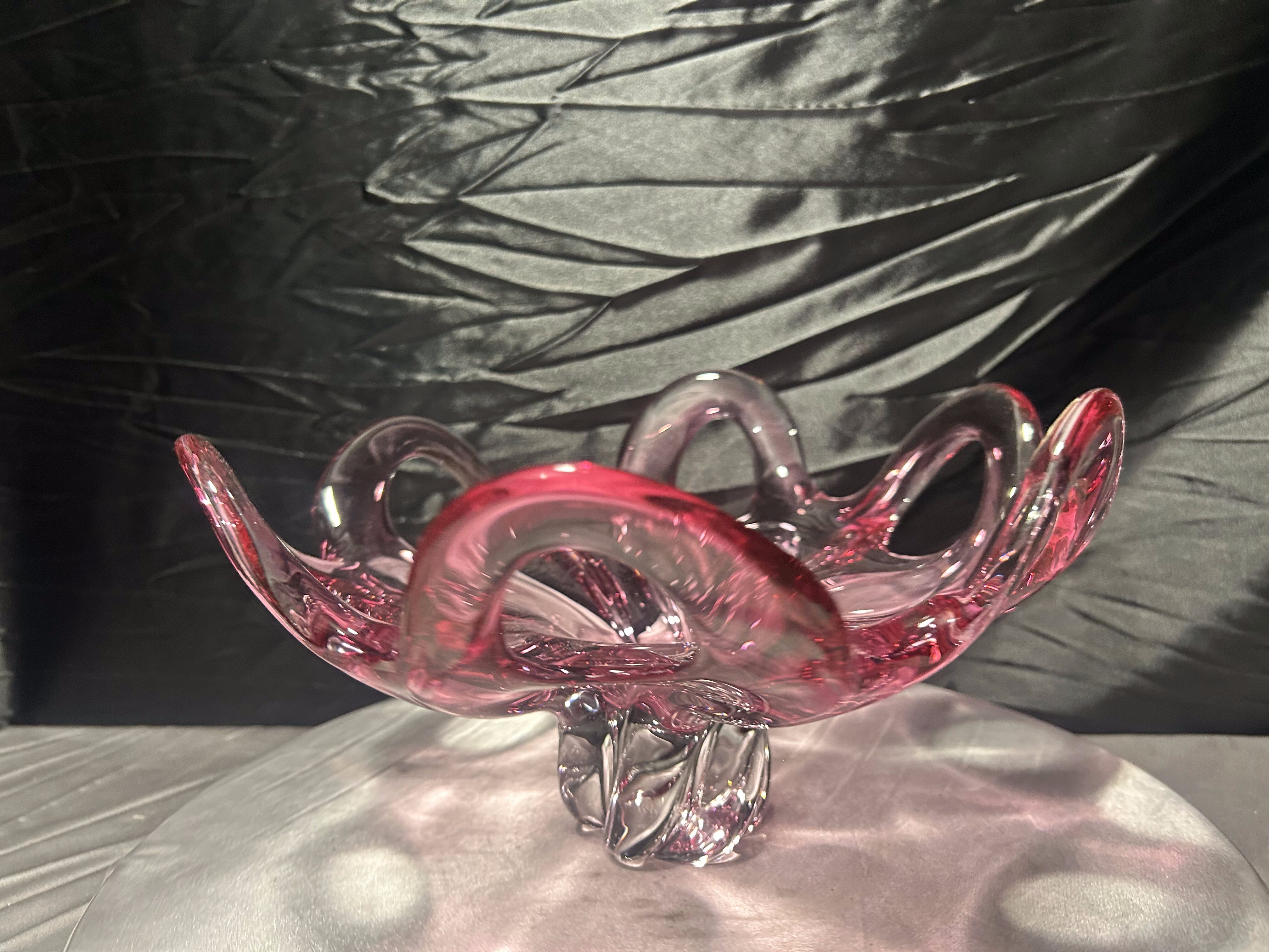Wyjątkowa, dekoracyjna patera wykonana z czeskiego szkła artystycznego typu Rubin Glass. Intensywny, różowo-rubinowy odcień w połączeniu z dynamiczną, falującą formą nadaje jej niezwykle efektowny charakter.