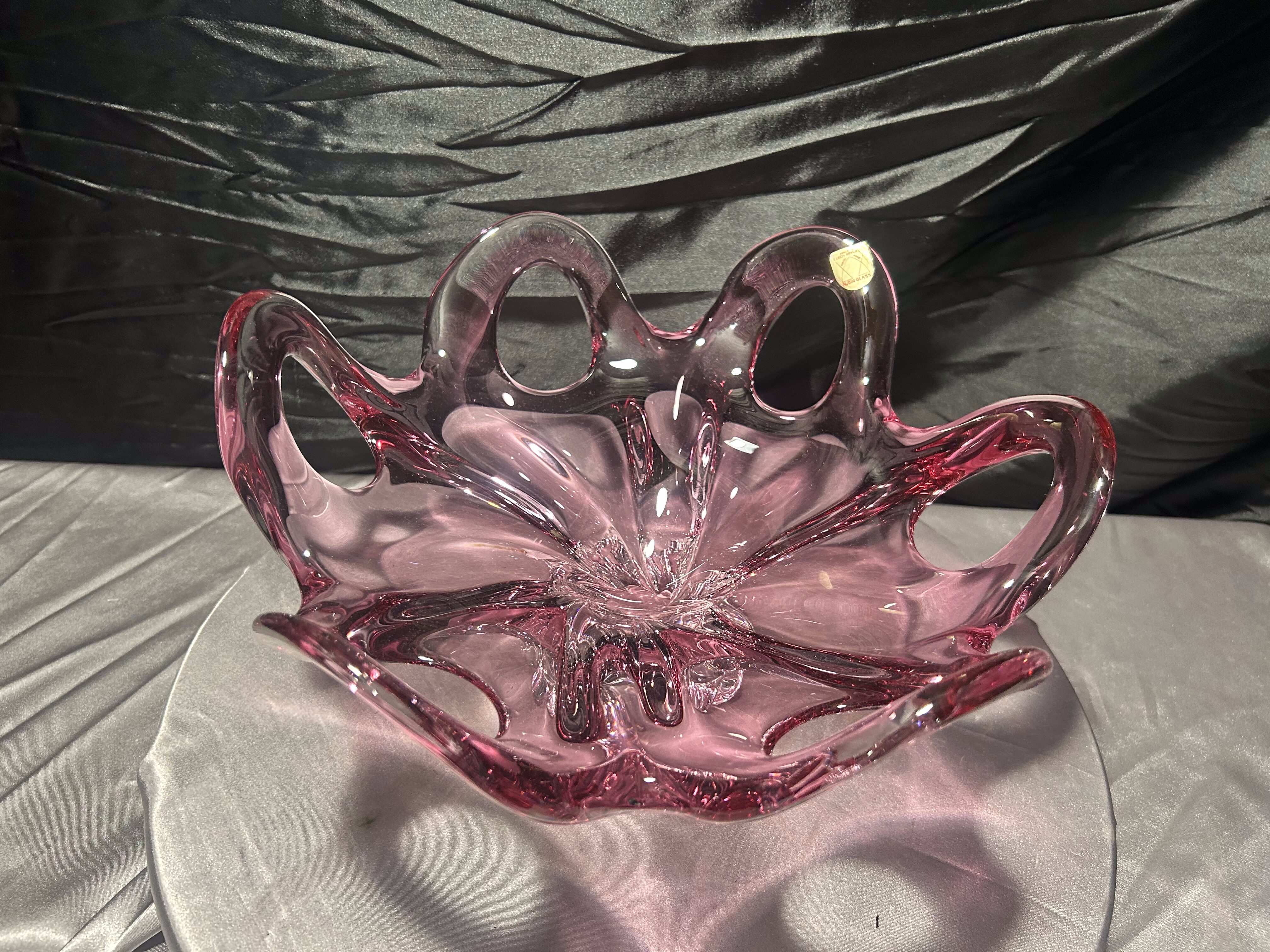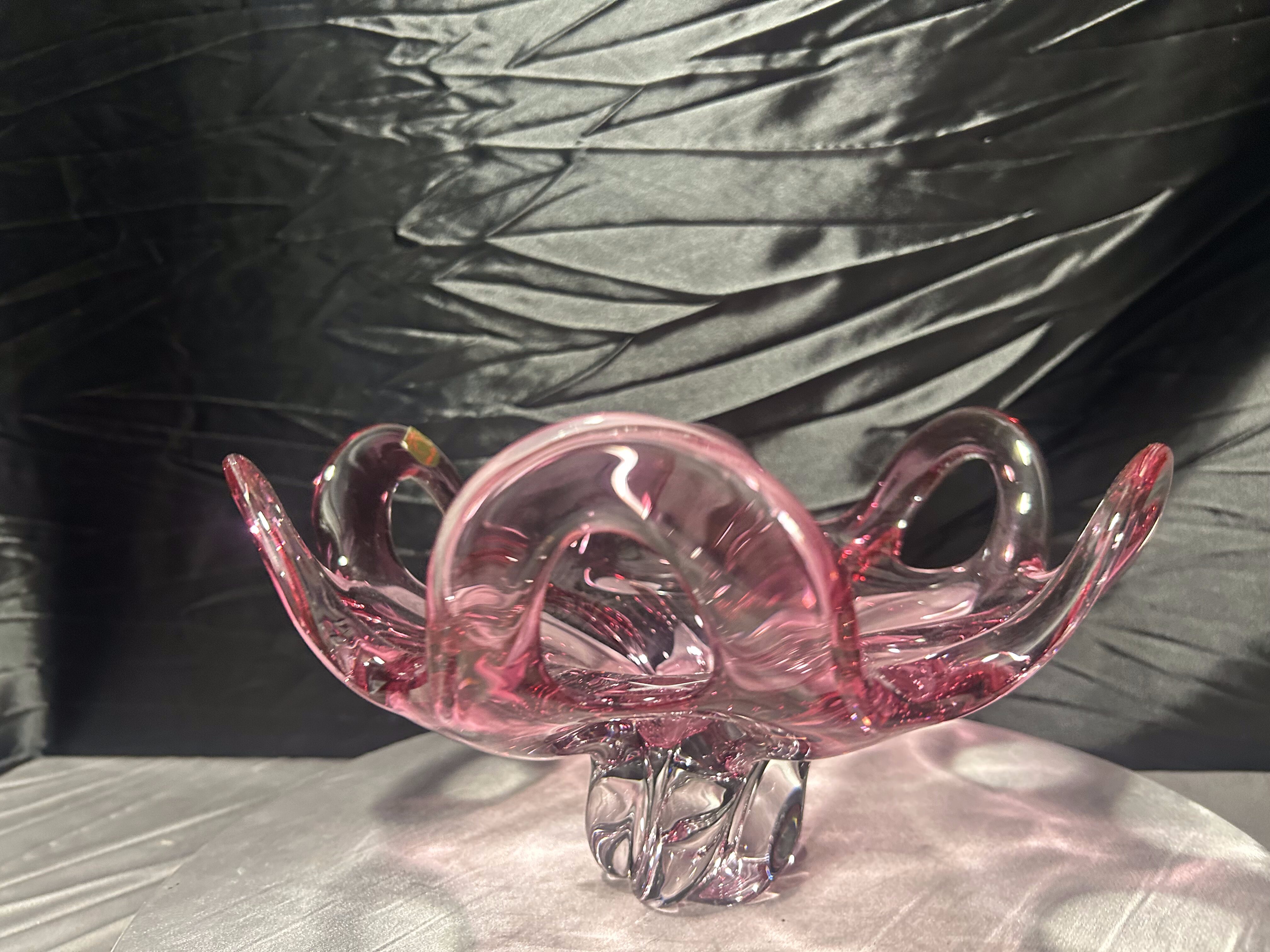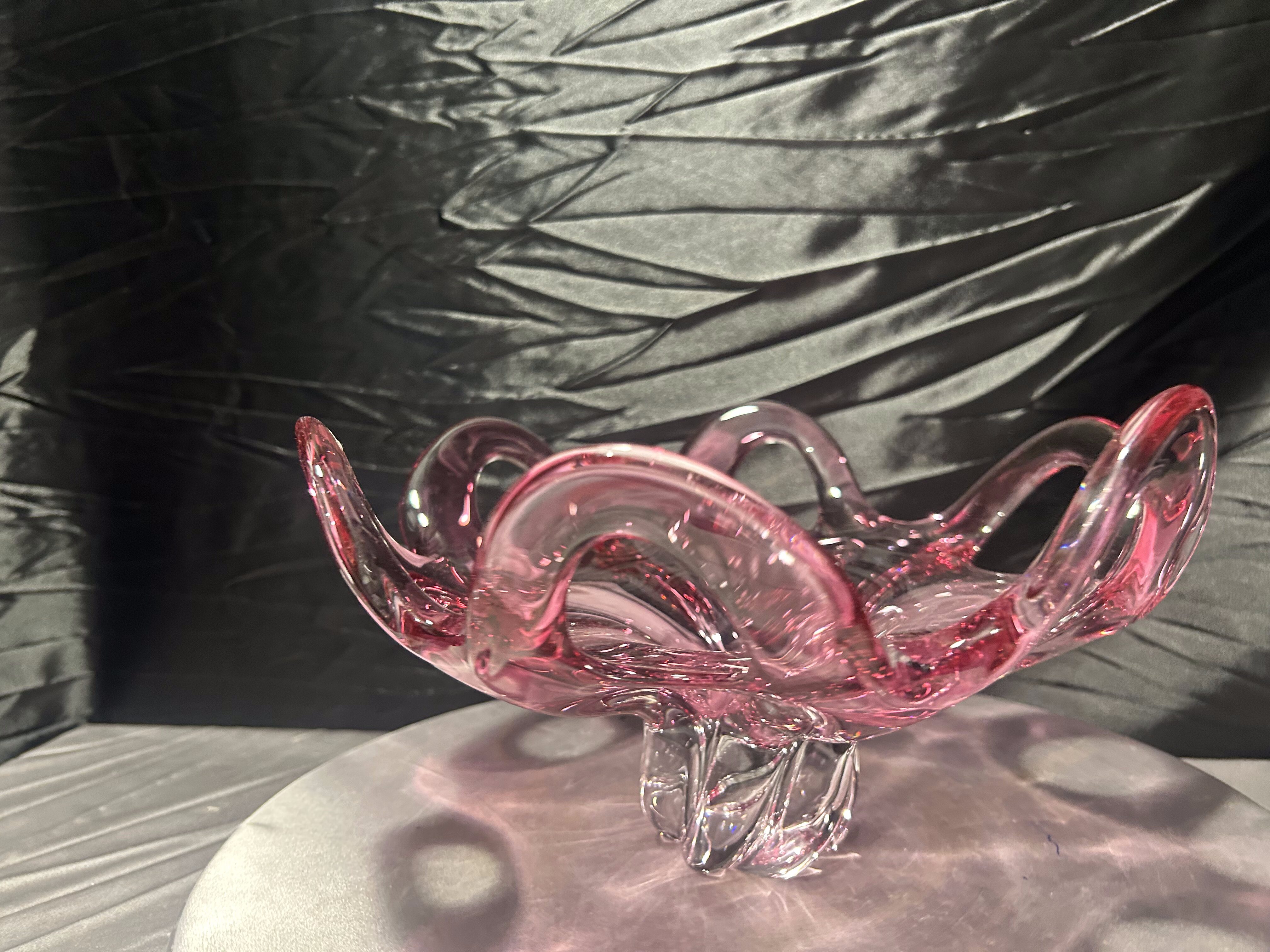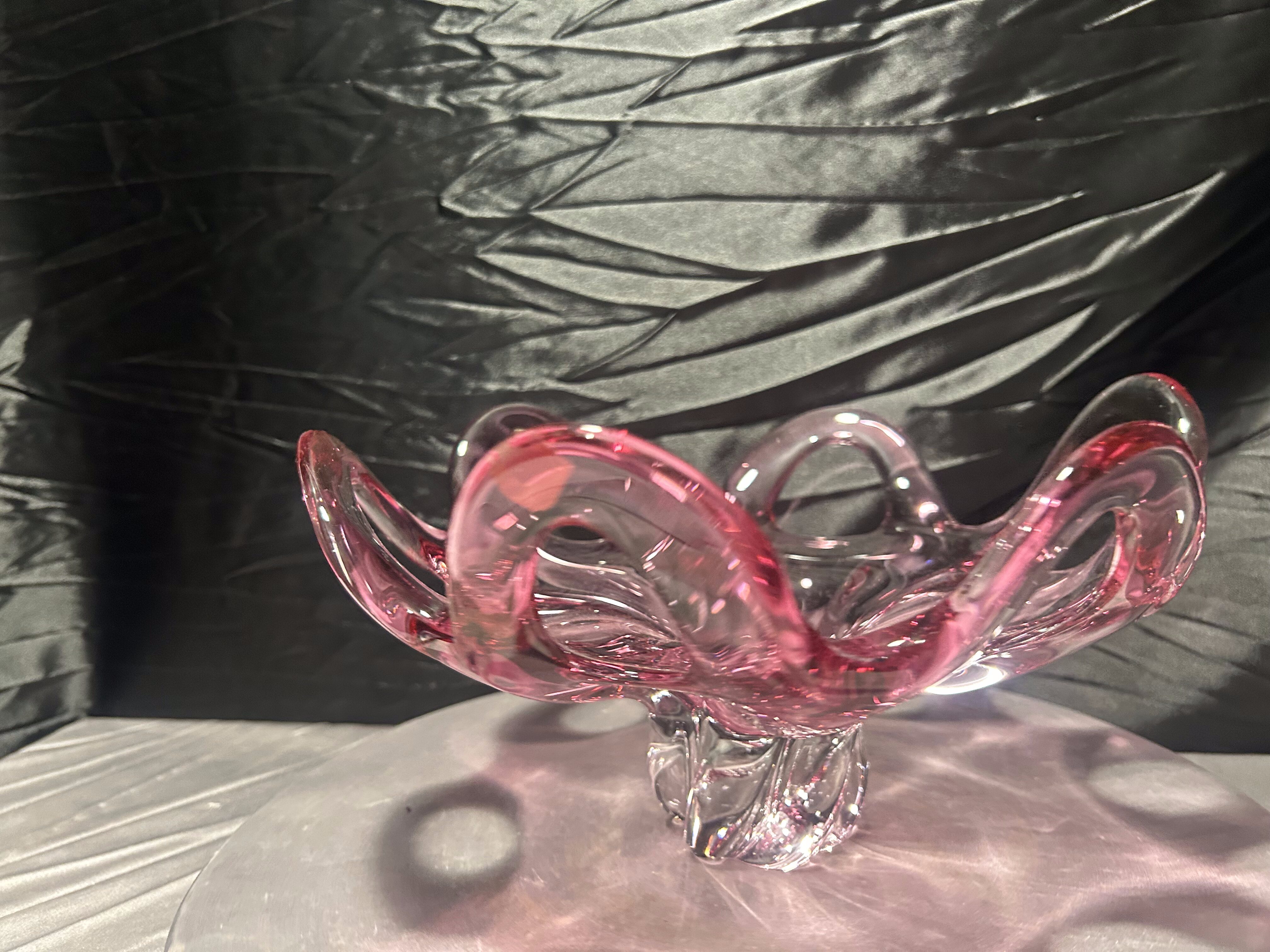 Wyjątkowa, dekoracyjna patera wykonana z czeskiego szkła artystycznego typu Rubin Glass. Intensywny, różowo-rubinowy odcień w połączeniu z dynamiczną, falującą formą nadaje jej niezwykle efektowny charakter.