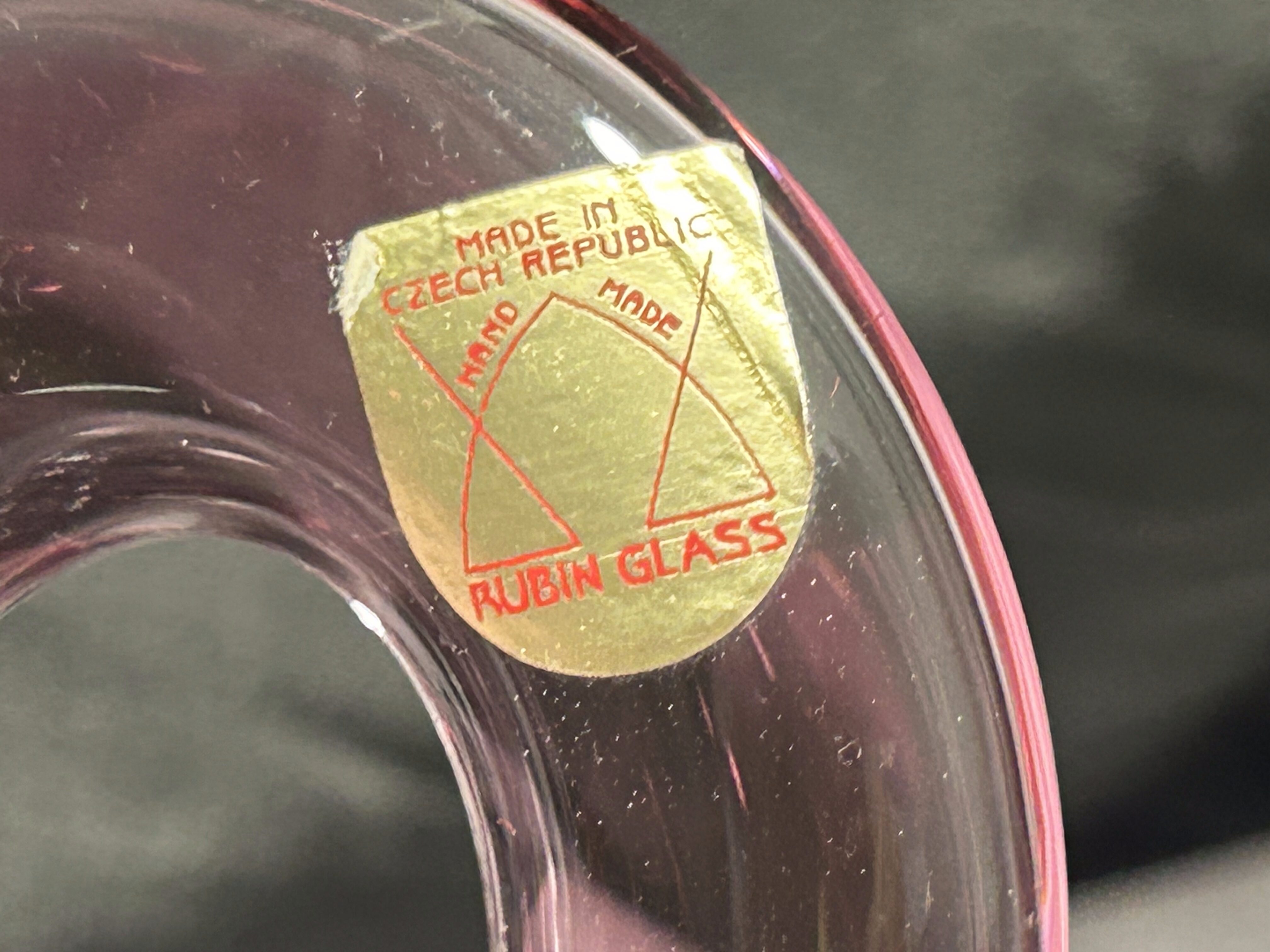 Zachowana oryginalna naklejka „Made in Czech Republic – Rubin Glass” potwierdza pochodzenie i podnosi wartość kolekcjonerską przedmiotu.