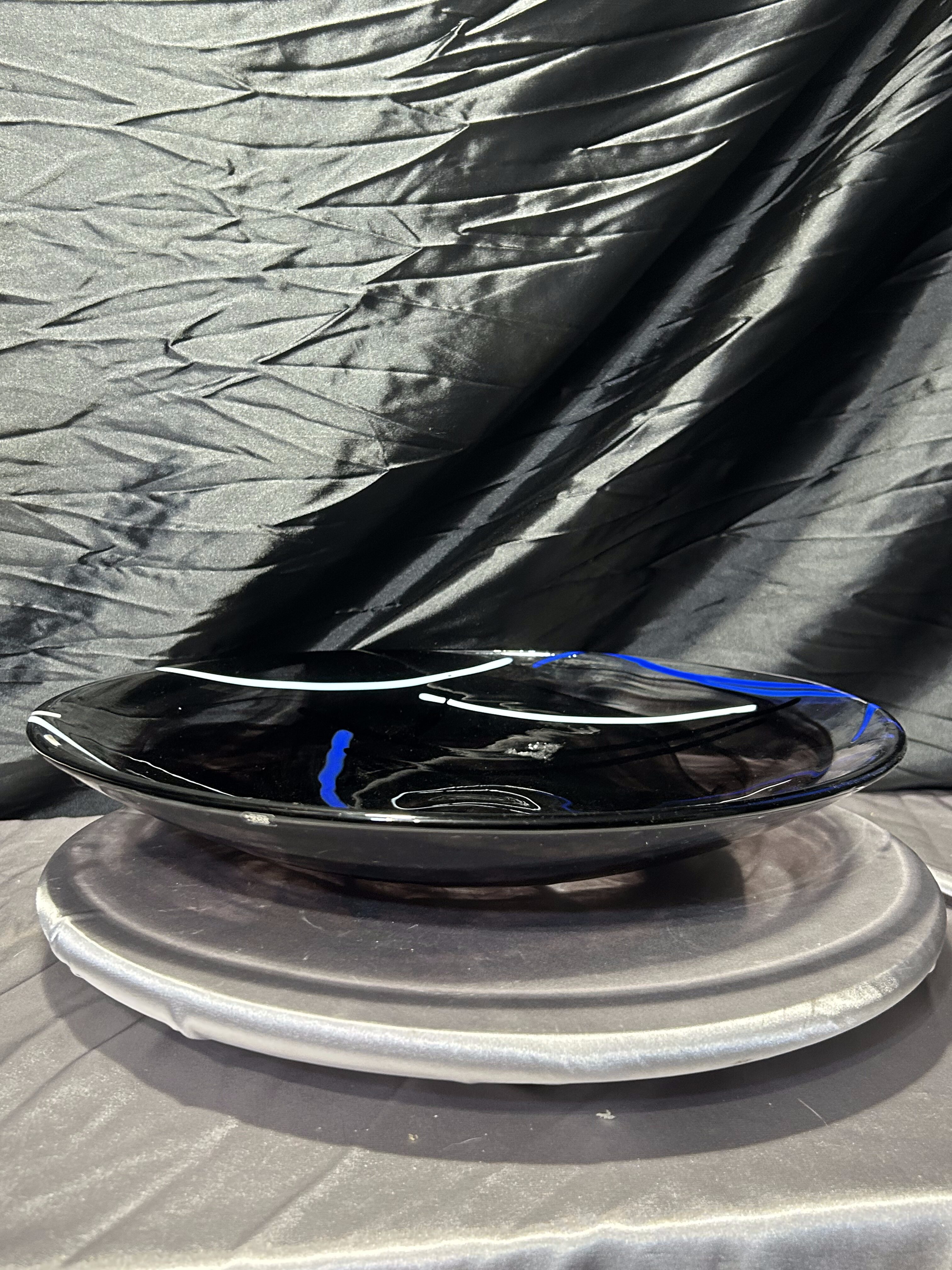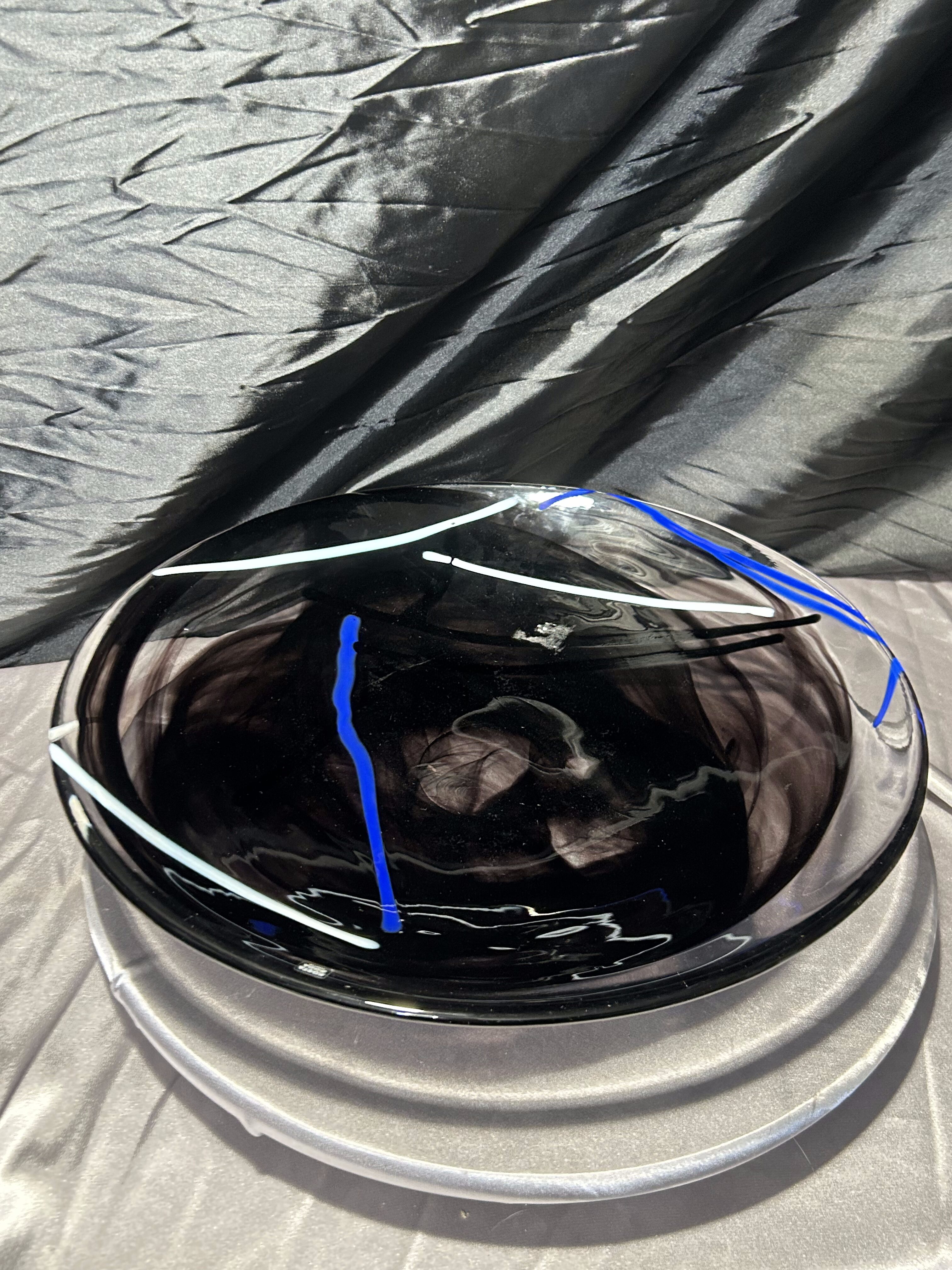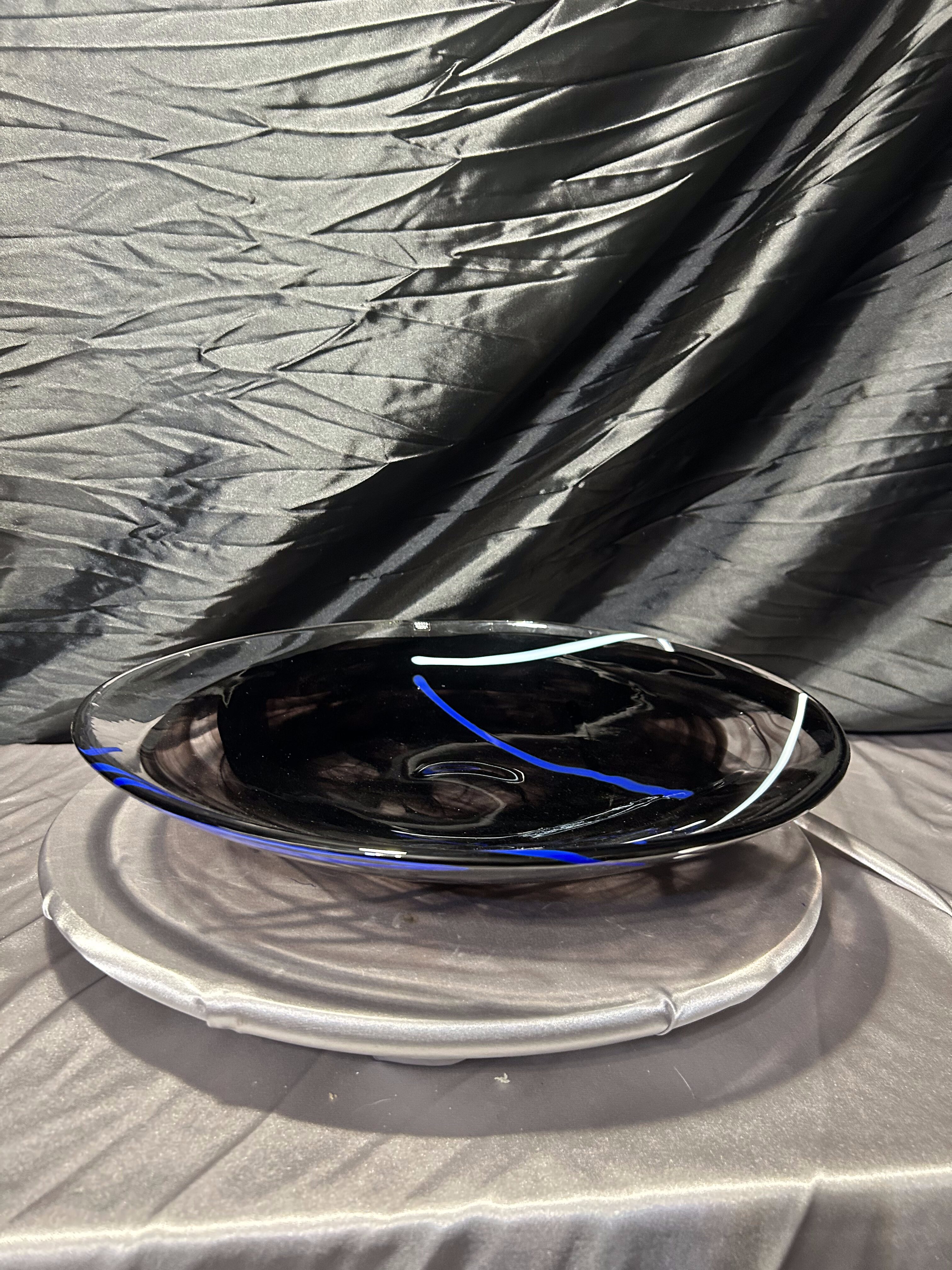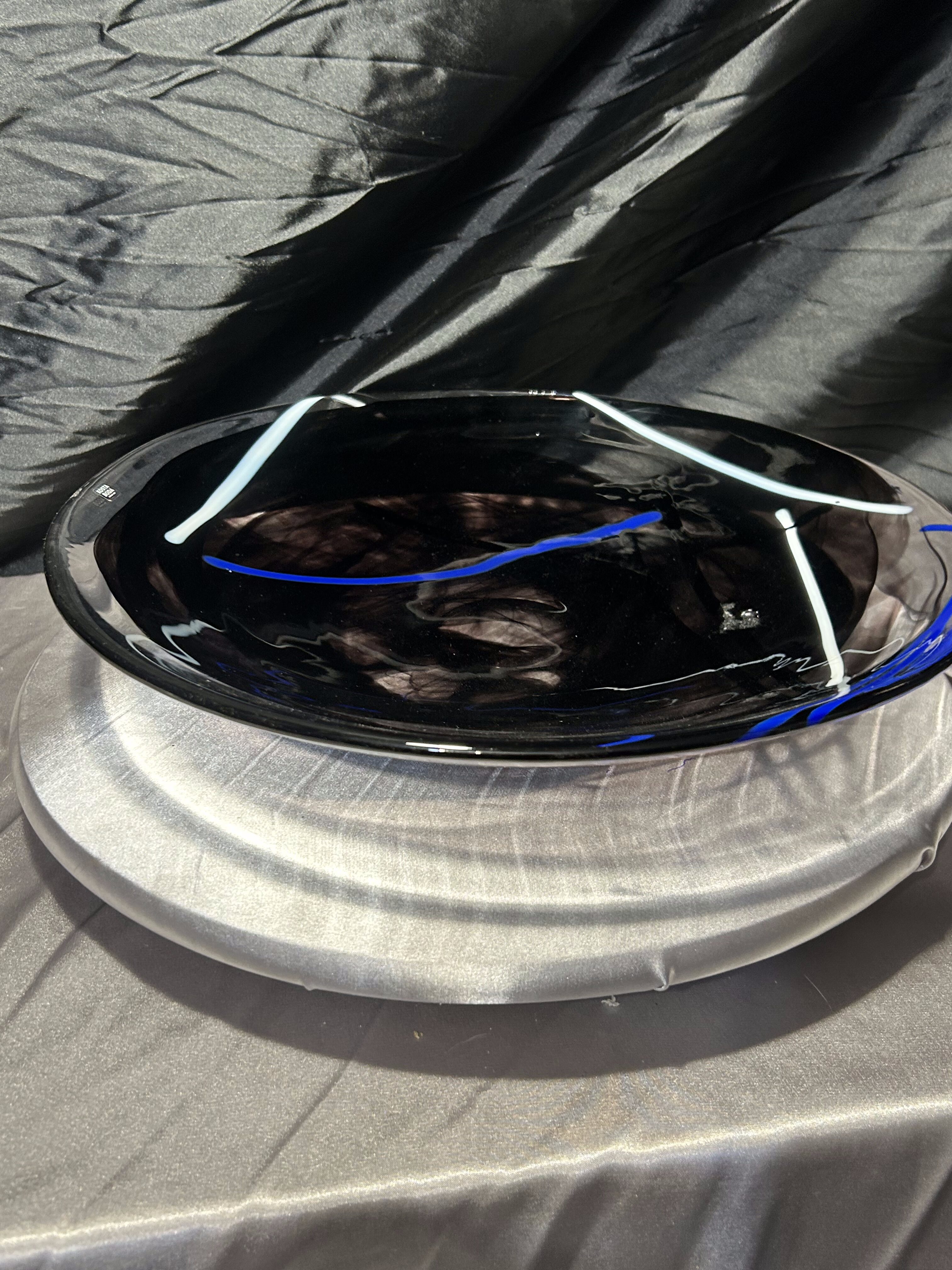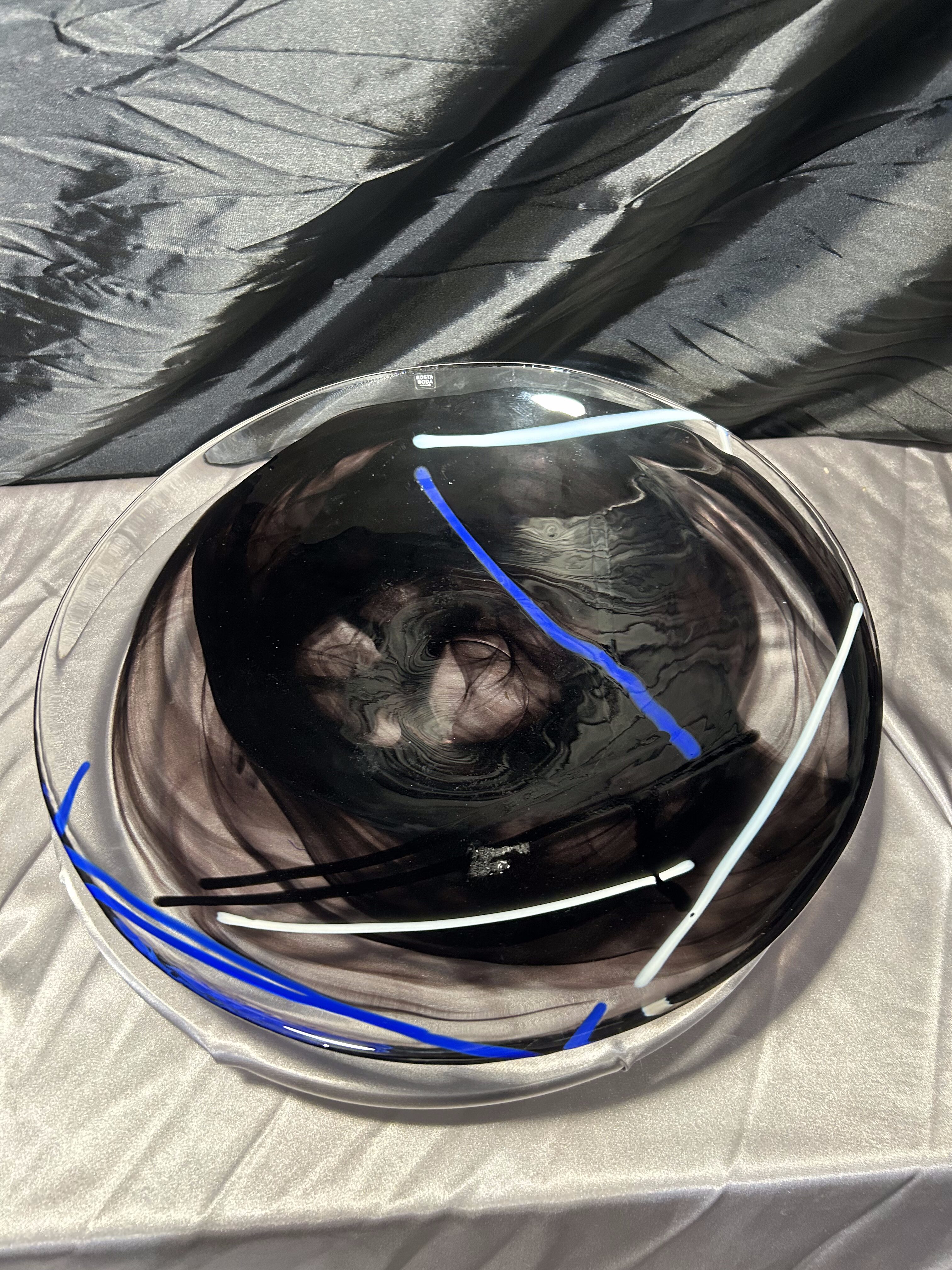 Oferuję wyjątkową paterę dekoracyjną renomowanej szwedzkiej huty szkła Kosta Boda, słynącej z ręcznie formowanego szkła artystycznego o unikalnym charakterze. Ten imponujący talerz o średnicy 37,5 cm prezentuje się niezwykle nowocześnie dzięki głębokiej czerni przełamanej dynamicznymi, kobaltowo–błękitnymi i białymi akcentami, zatopionymi w masie szklanej podczas procesu wytwarzania.