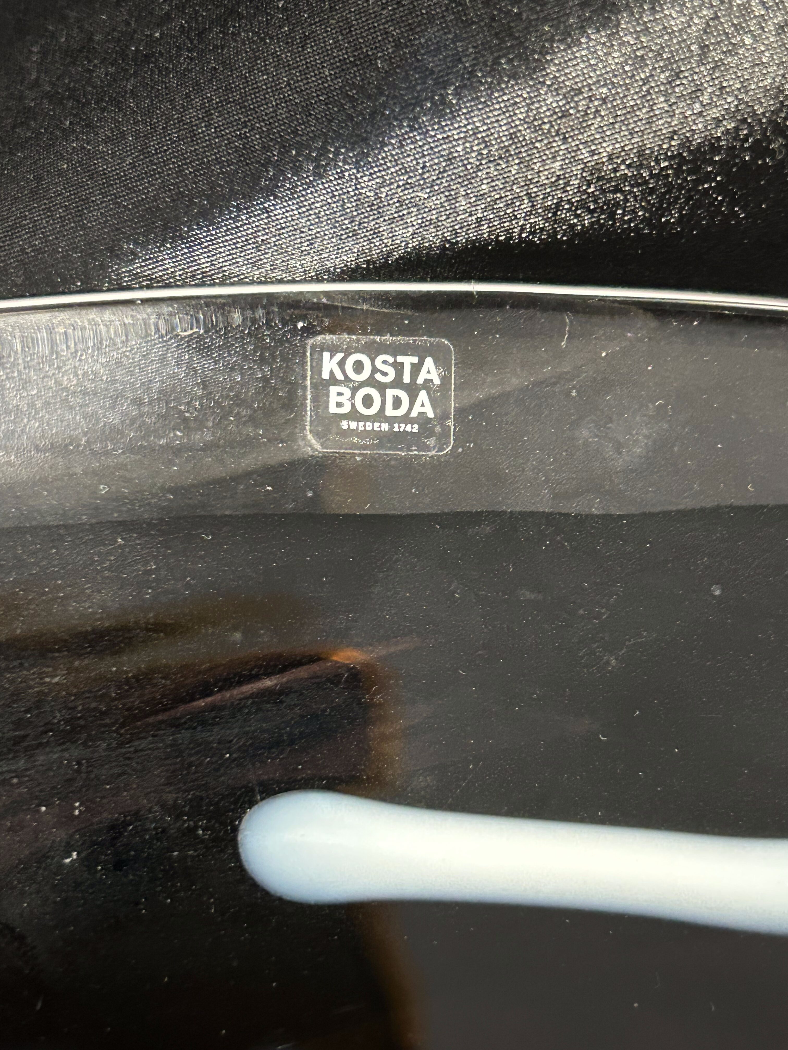 Marka Kosta Boda to najstarsza, wciąż działająca huta szkła w Szwecji – została założona w 1742 roku. Jej wyroby wyróżniają się ręcznym wykonaniem, artystycznym podejściem do formy i koloru oraz kolekcjonerską wartością. Patera pochodzi z serii powstających w drugiej połowie XX wieku, tworzonych przez mistrzów szkła Kosta Boda, znanych z odważnych połączeń barw i szkła dekoracyjnego.