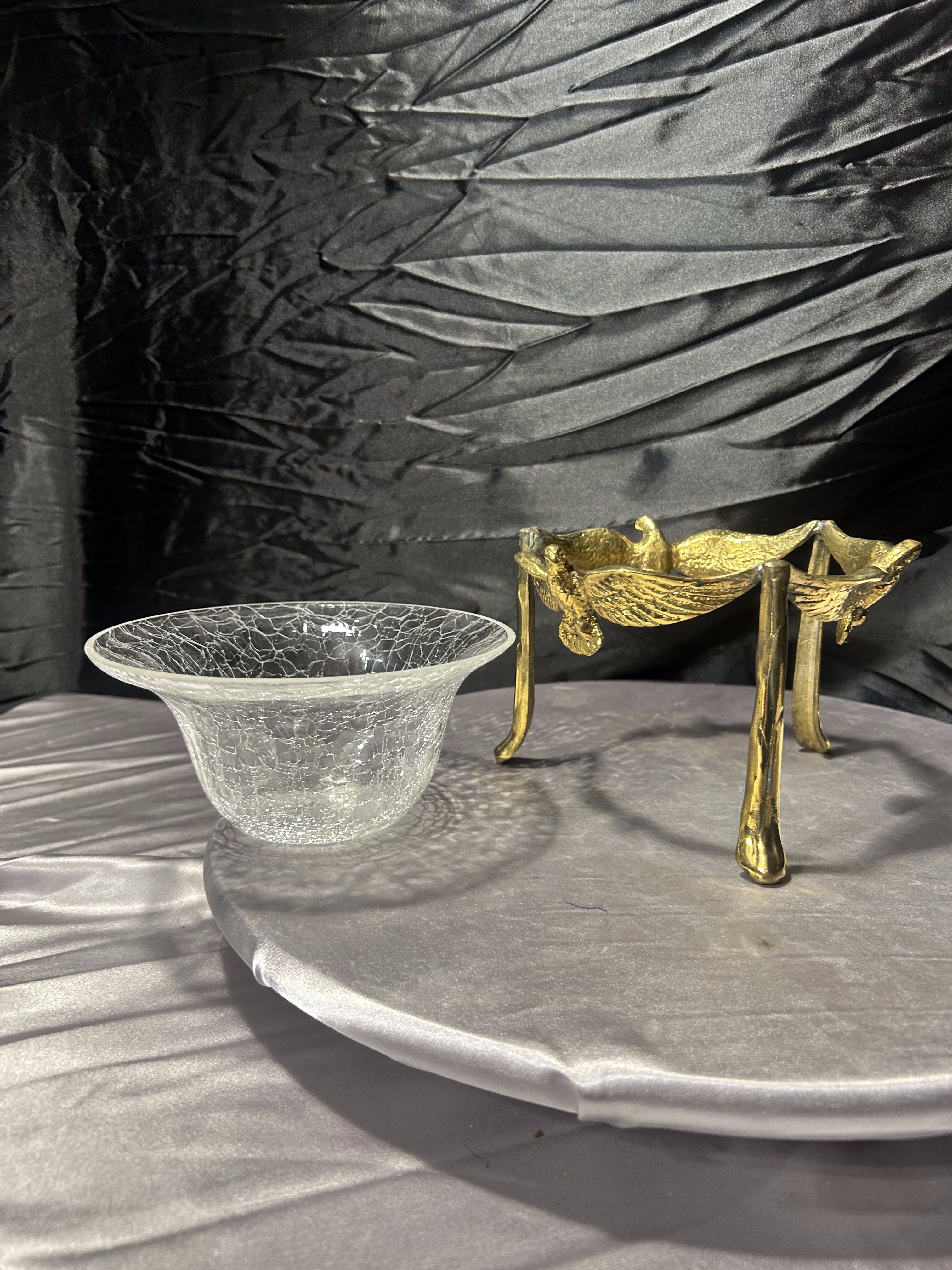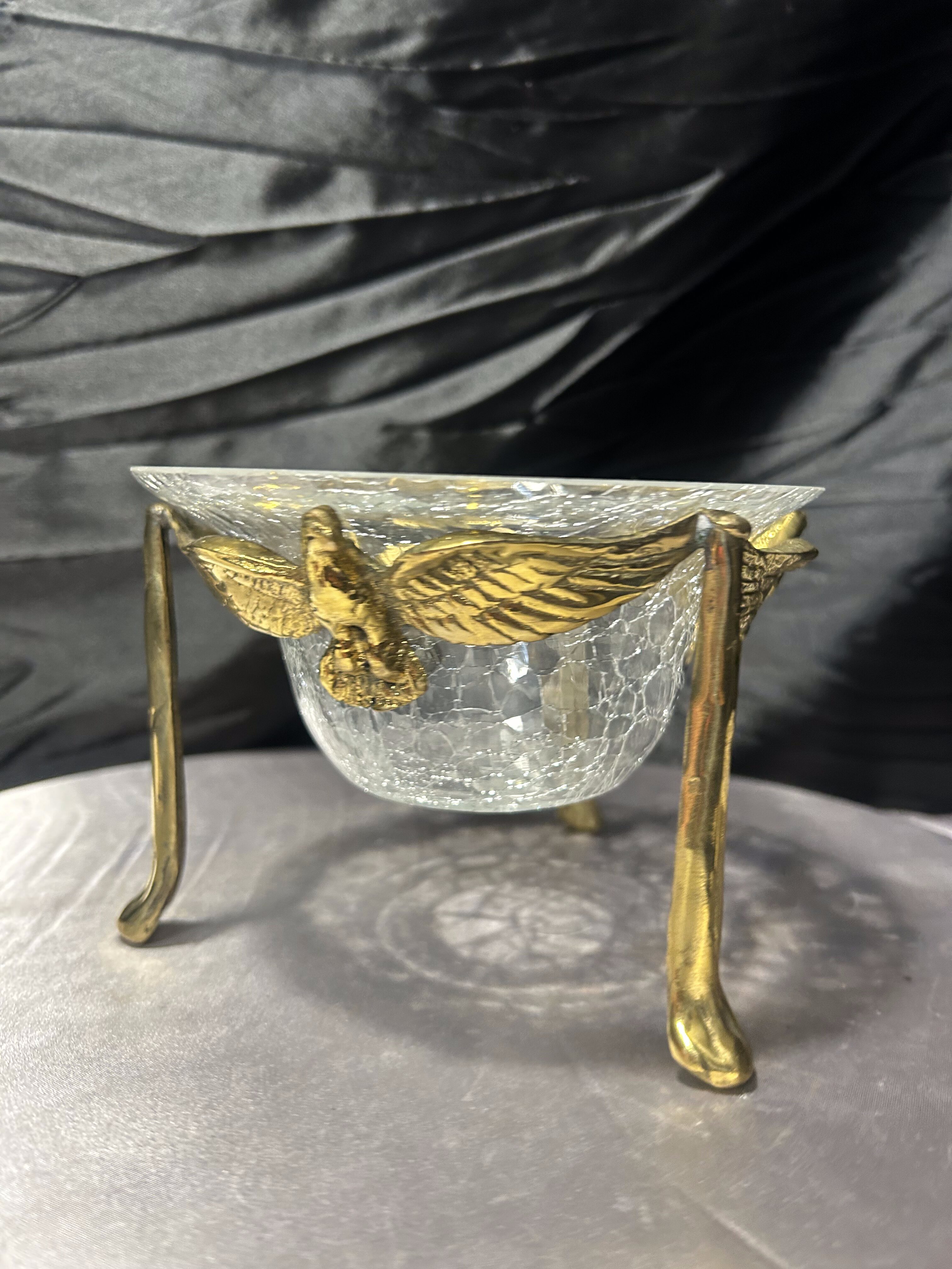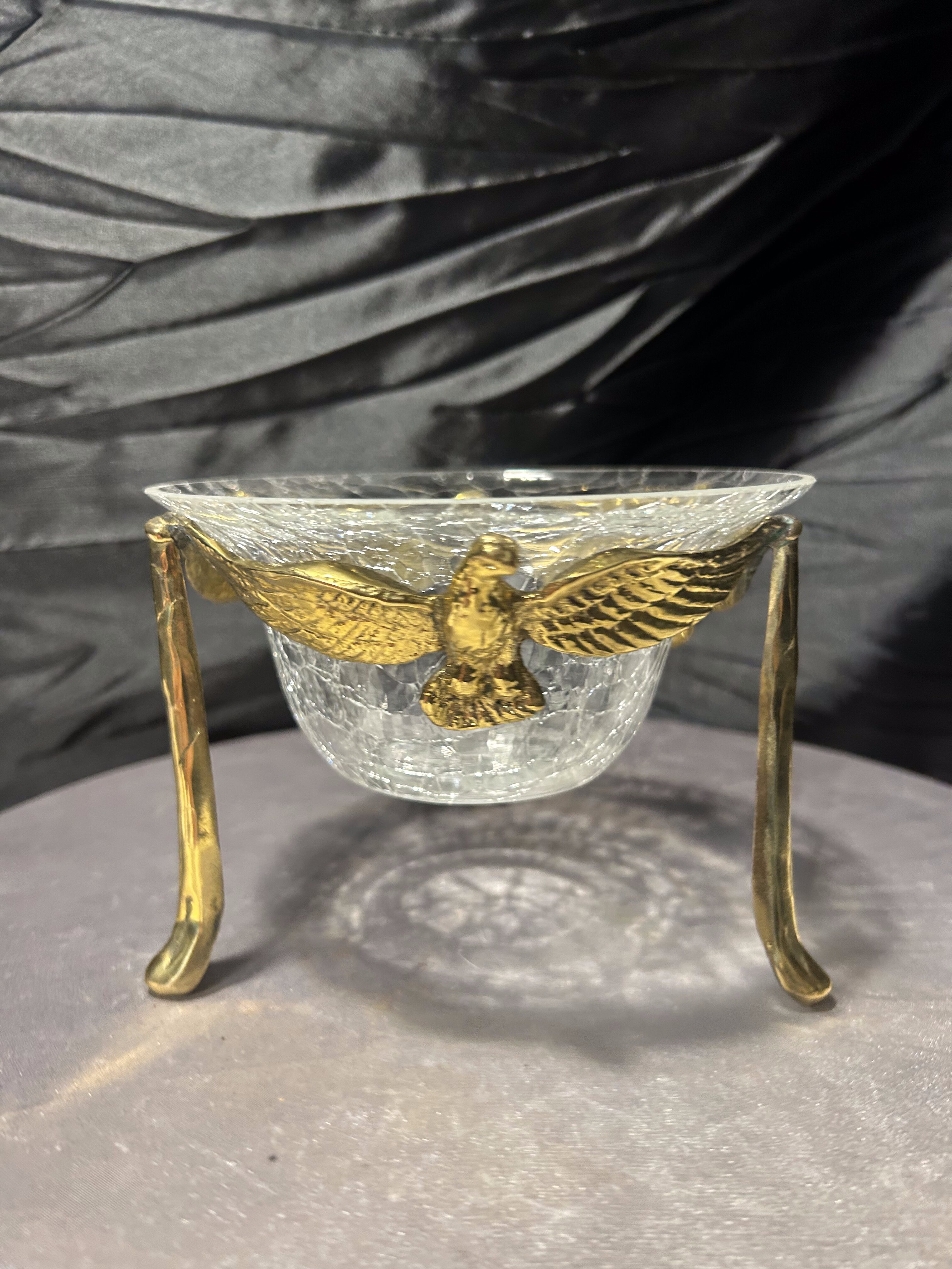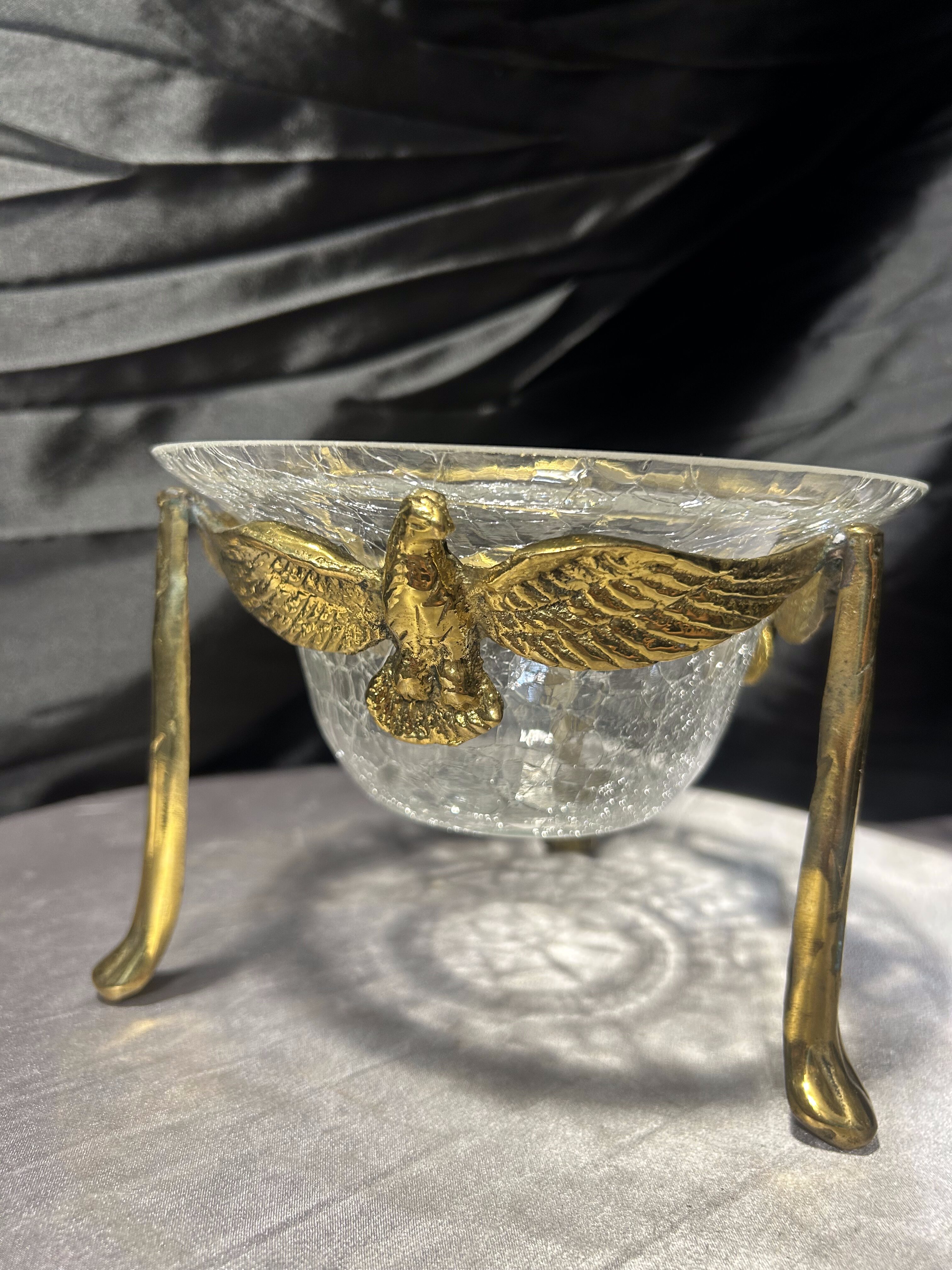Dekoracyjna misa łącząca szkło artystyczne z masywnym stelażem z mosiądzu. Szklana czarka o charakterystycznej, spękanej strukturze została osadzona w solidnej konstrukcji na trzech nogach. Elementem wyróżniającym całość są trzy dekoracyjne orły wykonane z mosiądzu, nadające paterze wyrazisty, klasyczny charakter.