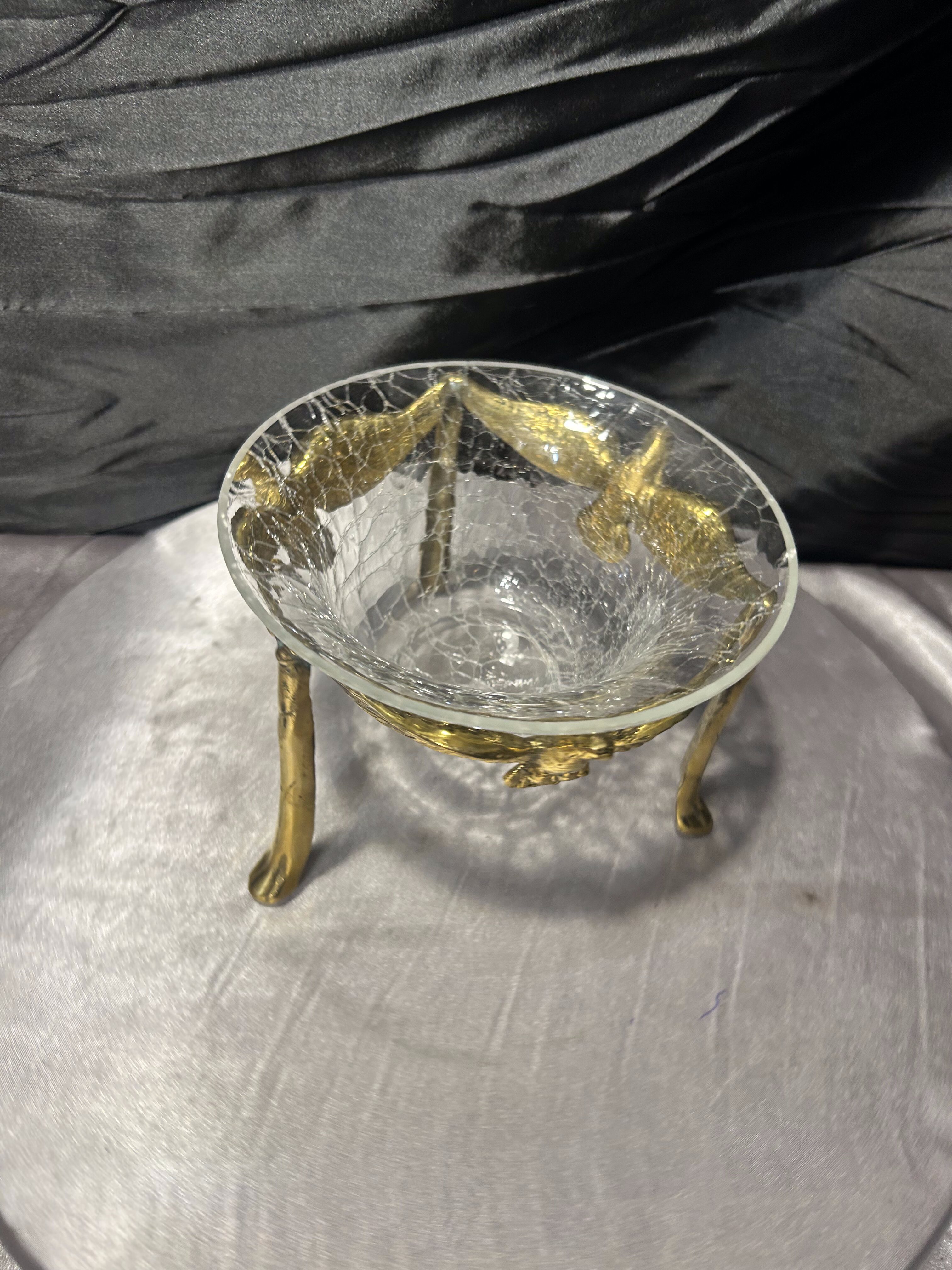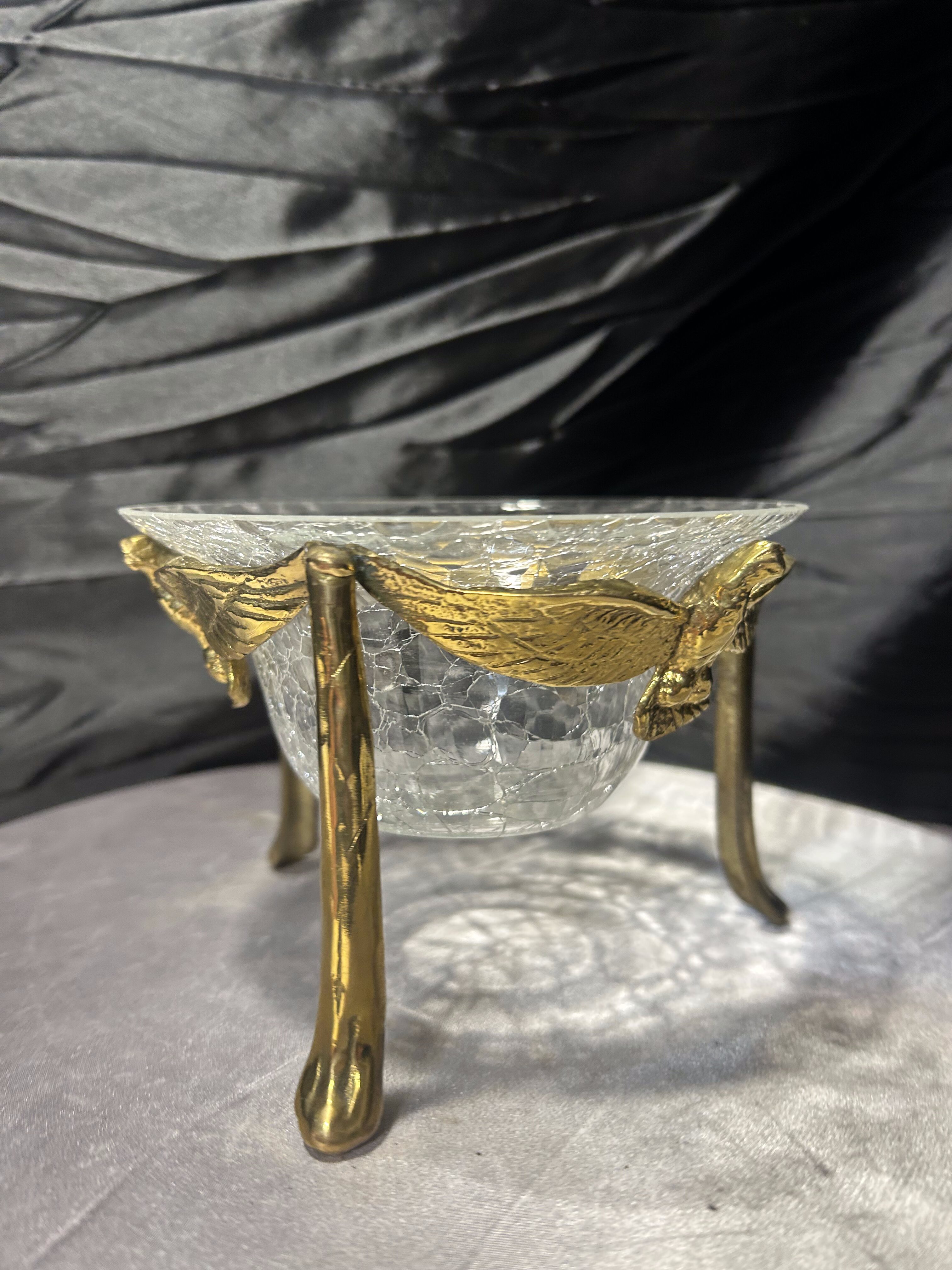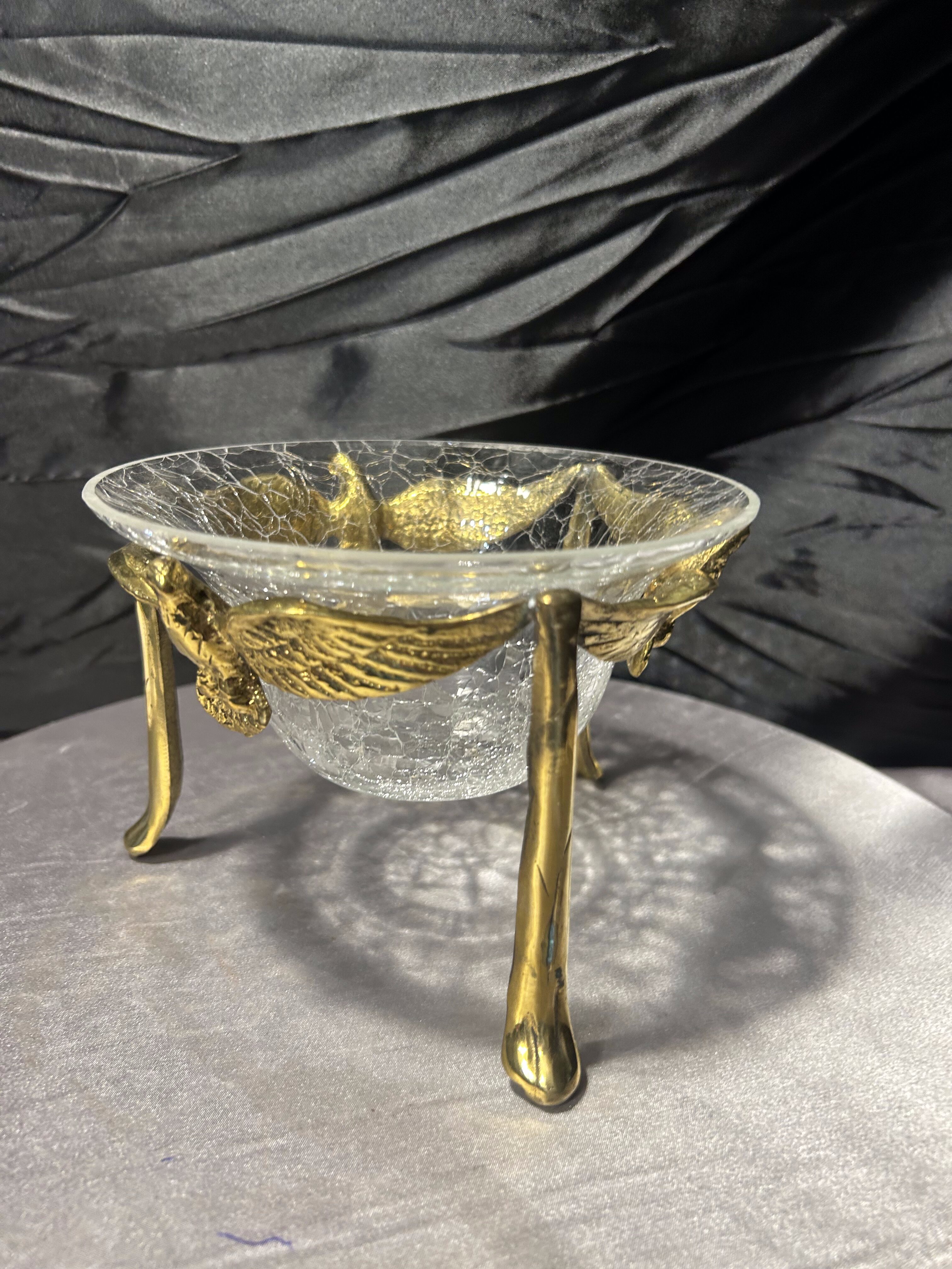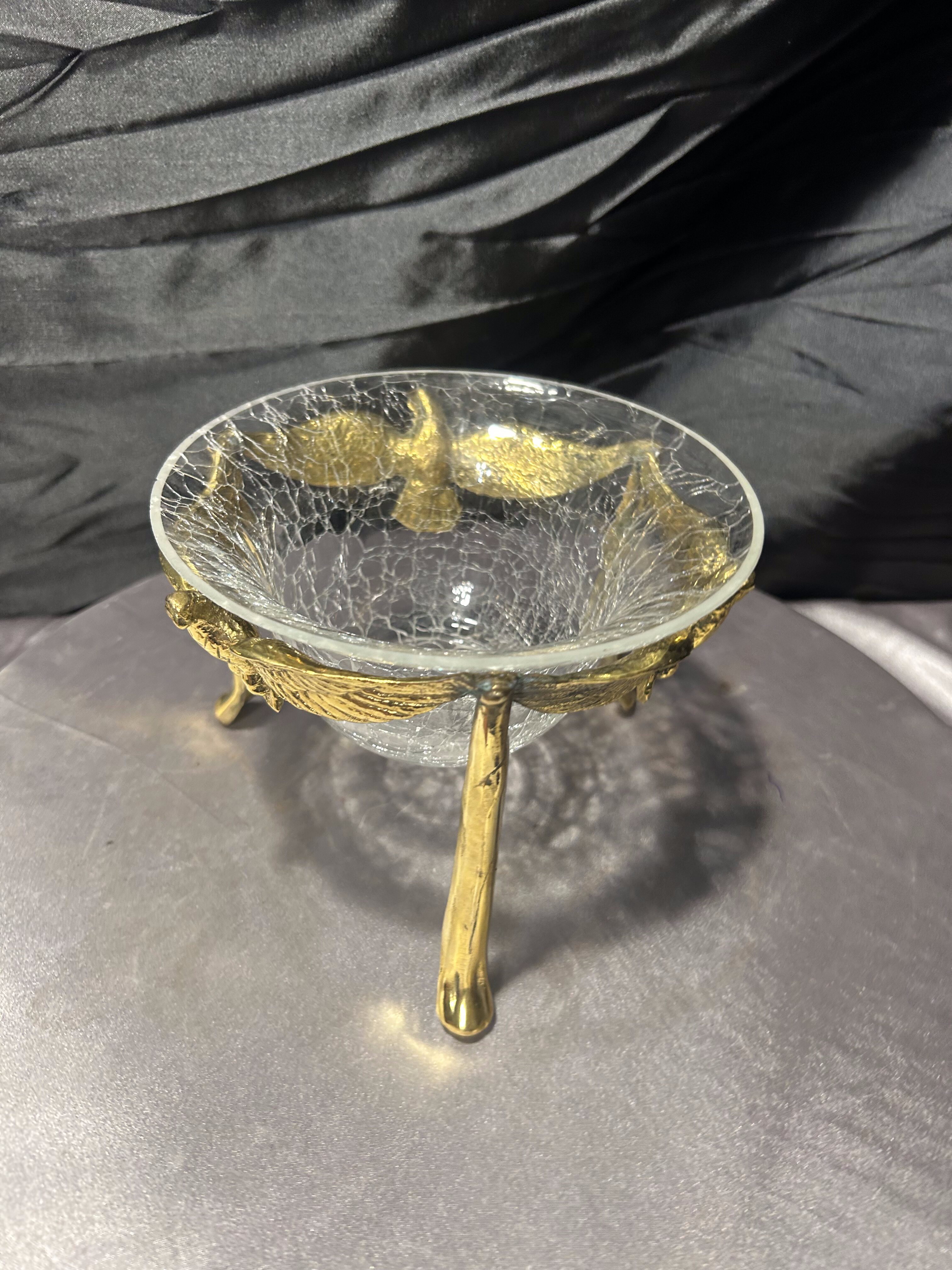 Dekoracyjna misa łącząca szkło artystyczne z masywnym stelażem z mosiądzu. Szklana czarka o charakterystycznej, spękanej strukturze została osadzona w solidnej konstrukcji na trzech nogach. Elementem wyróżniającym całość są trzy dekoracyjne orły wykonane z mosiądzu, nadające paterze wyrazisty, klasyczny charakter.