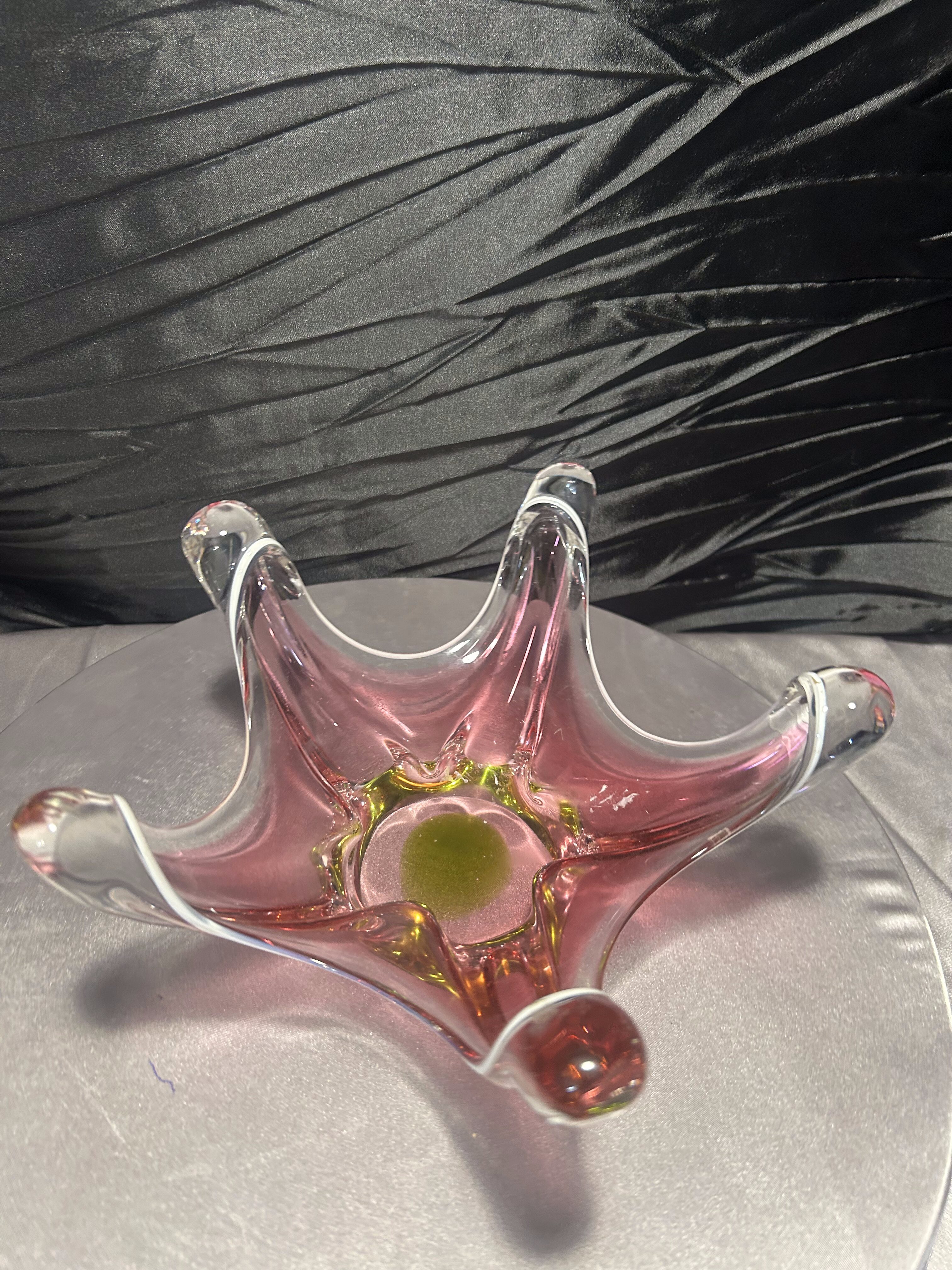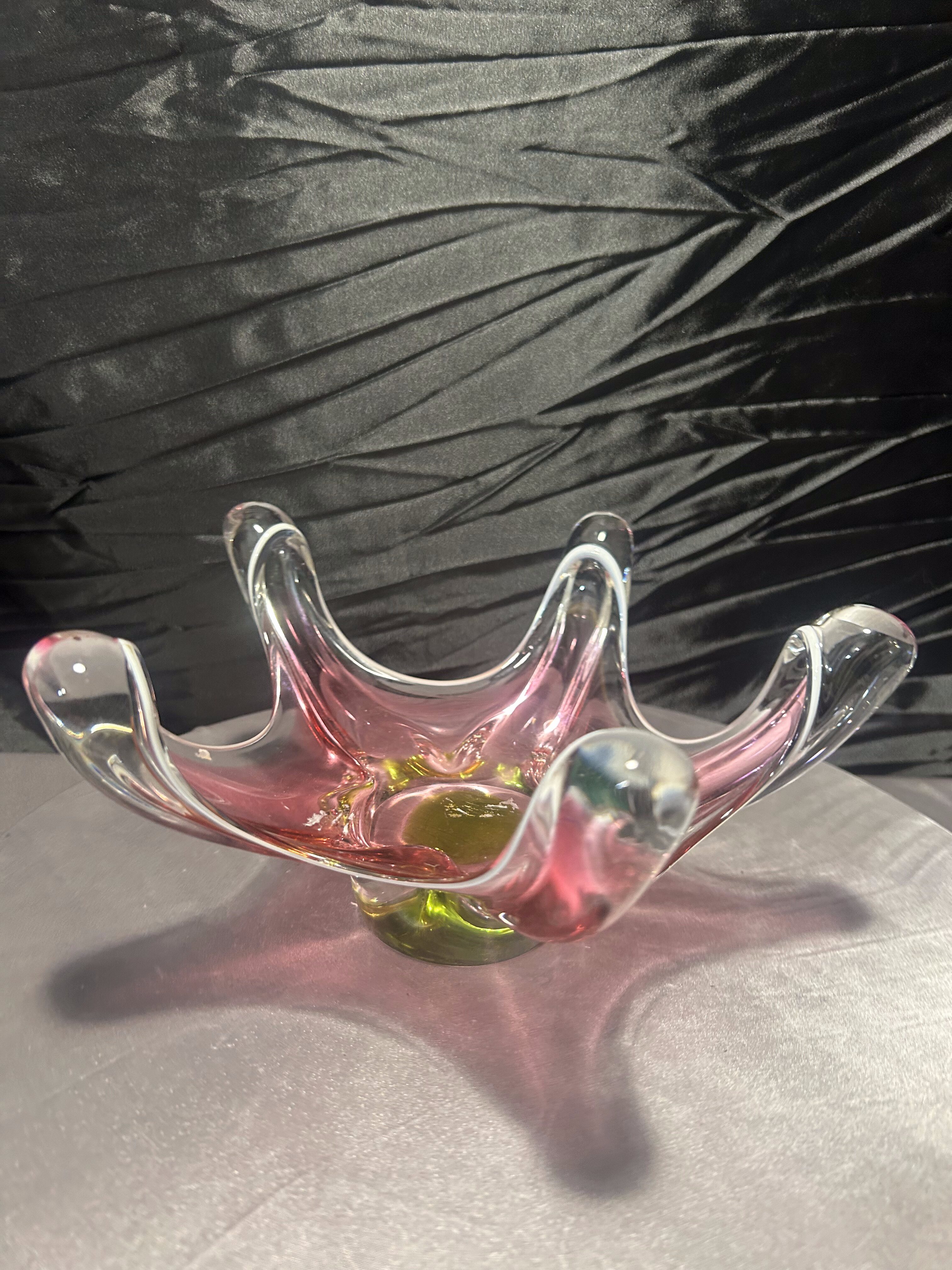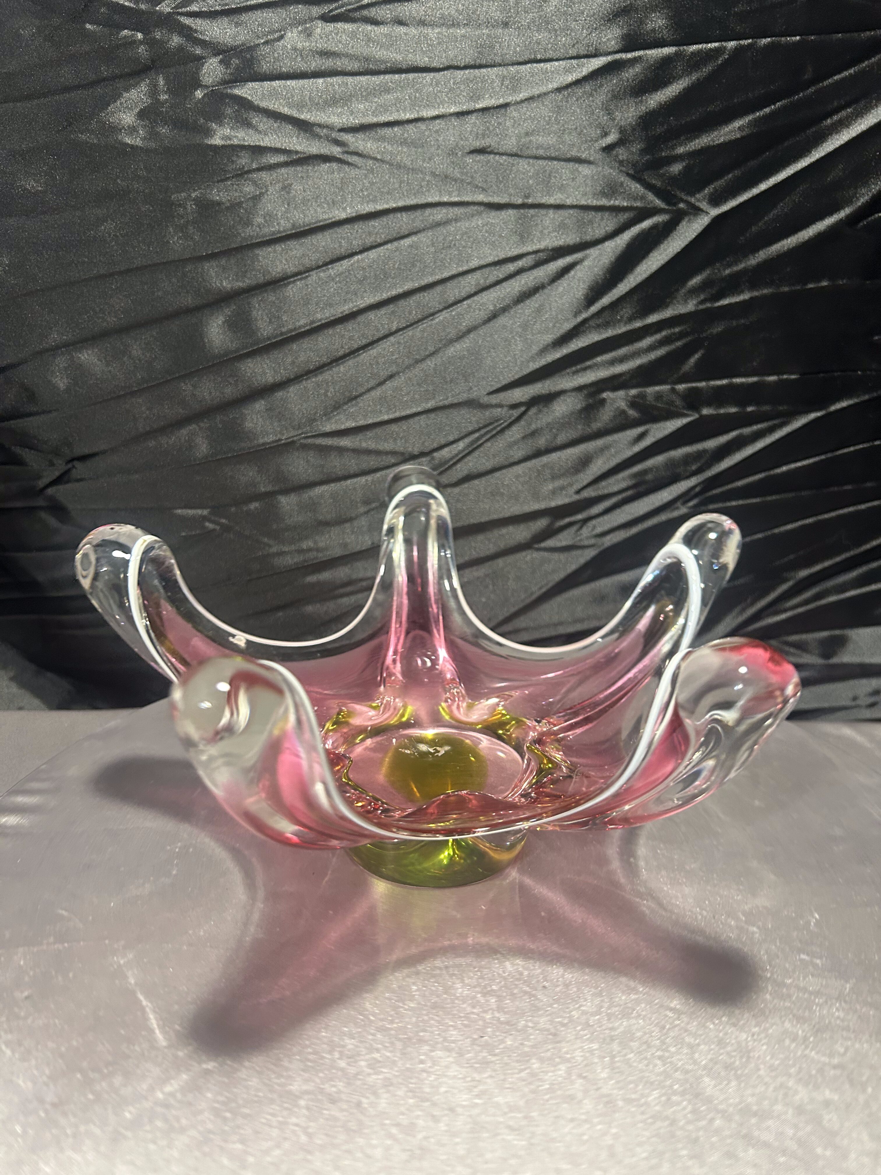 Zjawiskowa patera ze szkła artystycznego w stylu Murano, wykonana techniką warstwowego szkła (somerso). Jej unikalna forma o miękkich, płynnych liniach oraz harmonijne połączenie kolorów – różu, zieleni, bieli i transparentnych refleksów – tworzą niezwykłą grę światła i barwy.