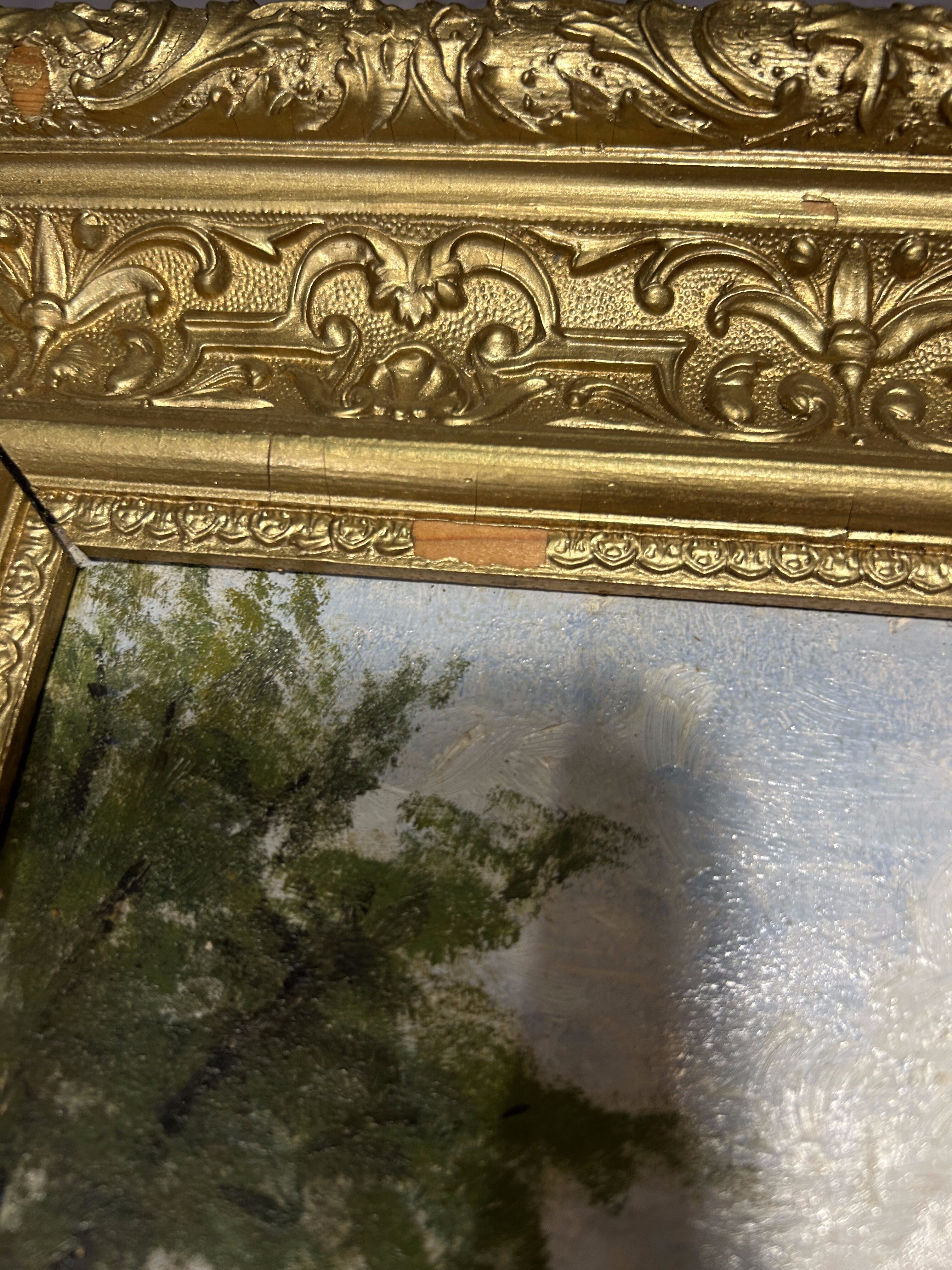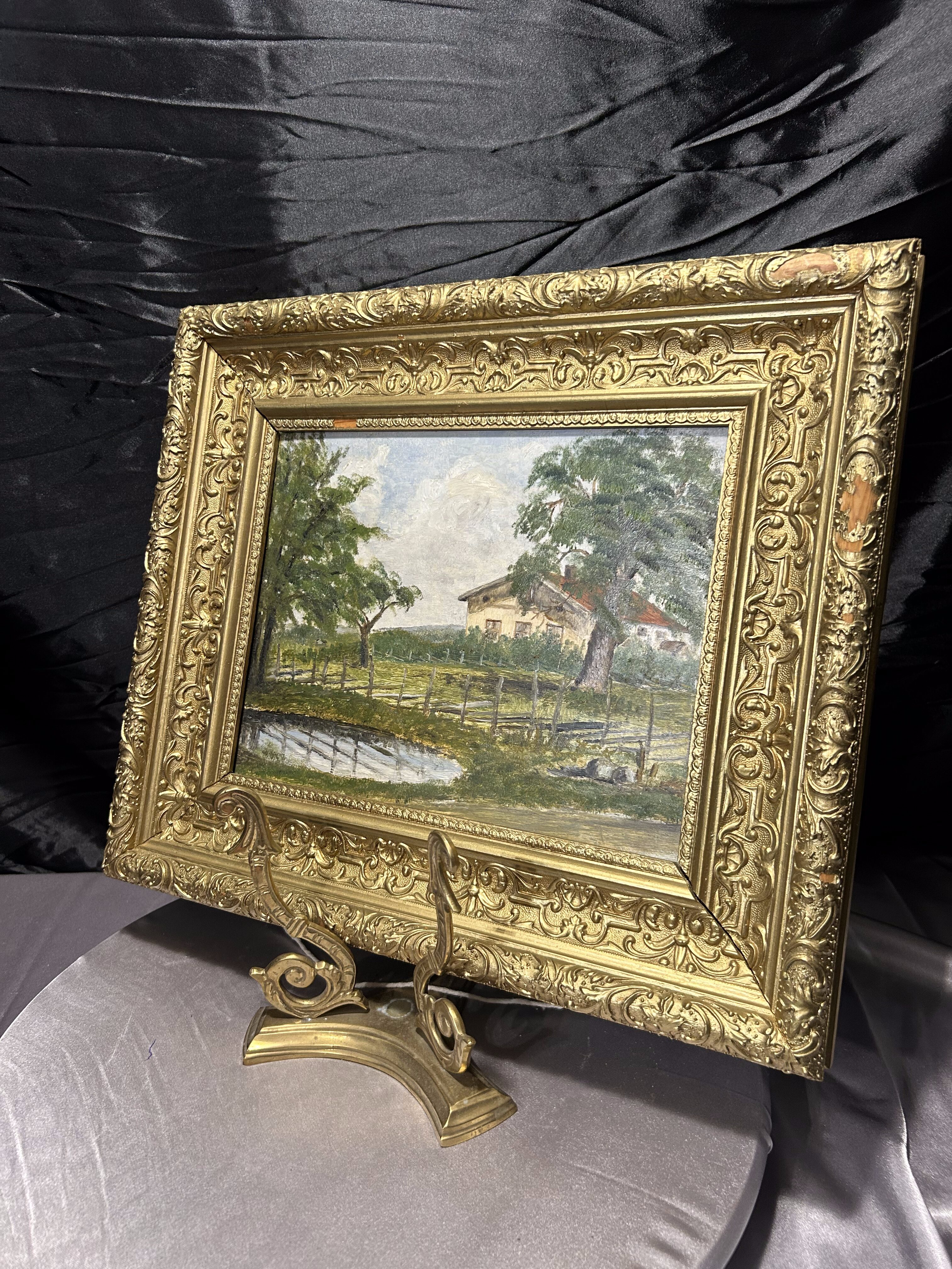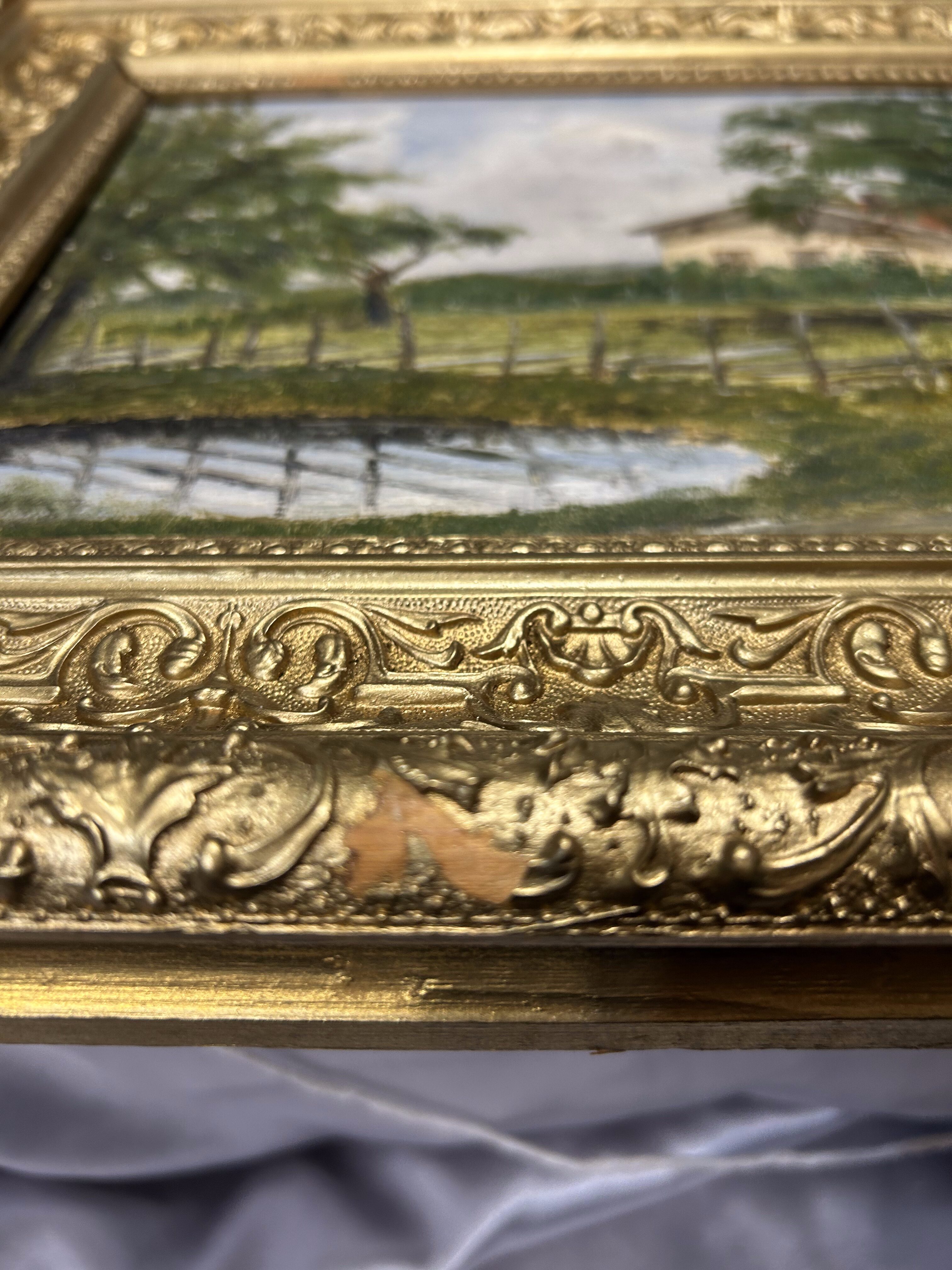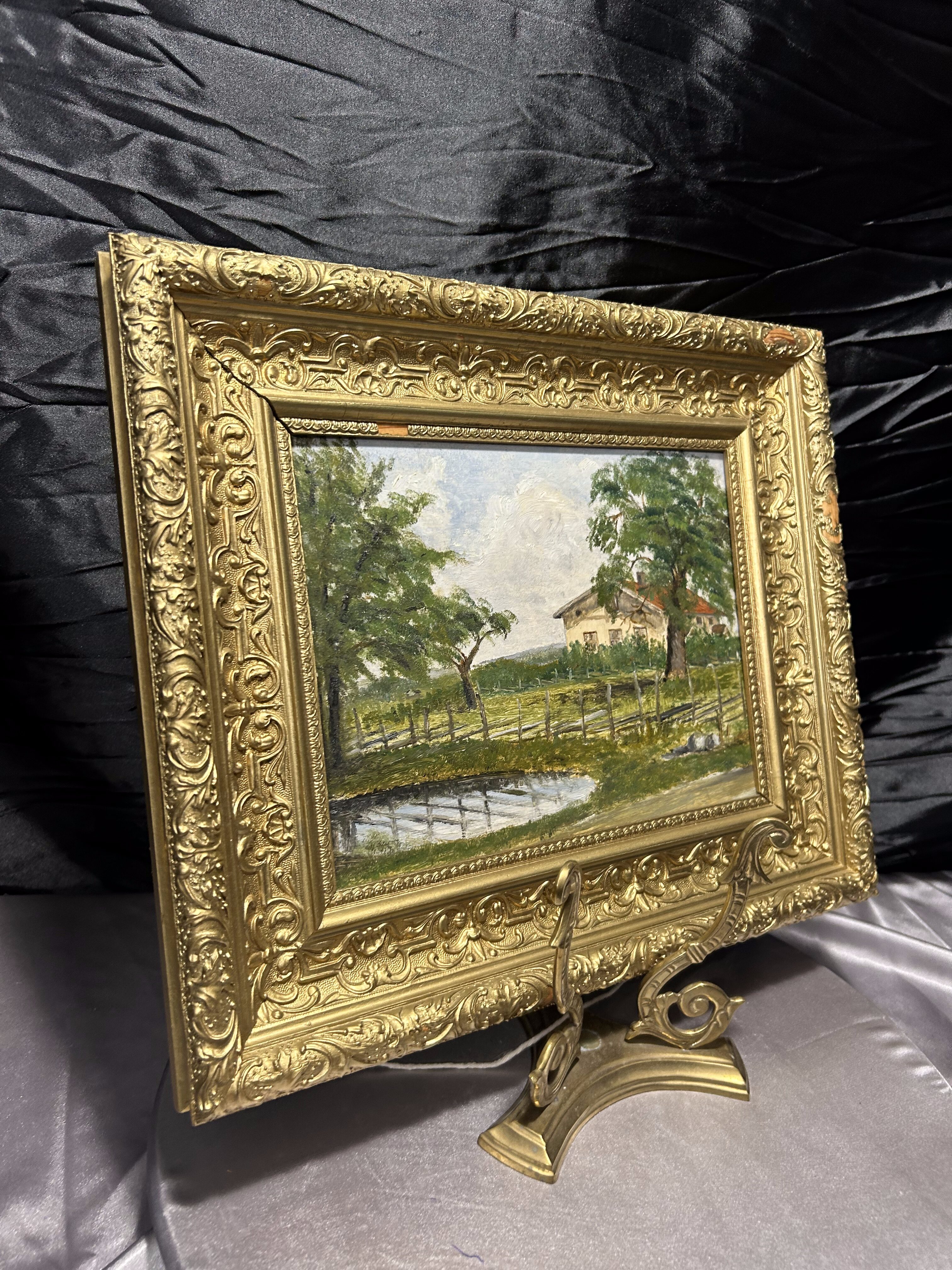 - Pejzaż olejny na desce – obraz w ozdobnej ramie – vintage