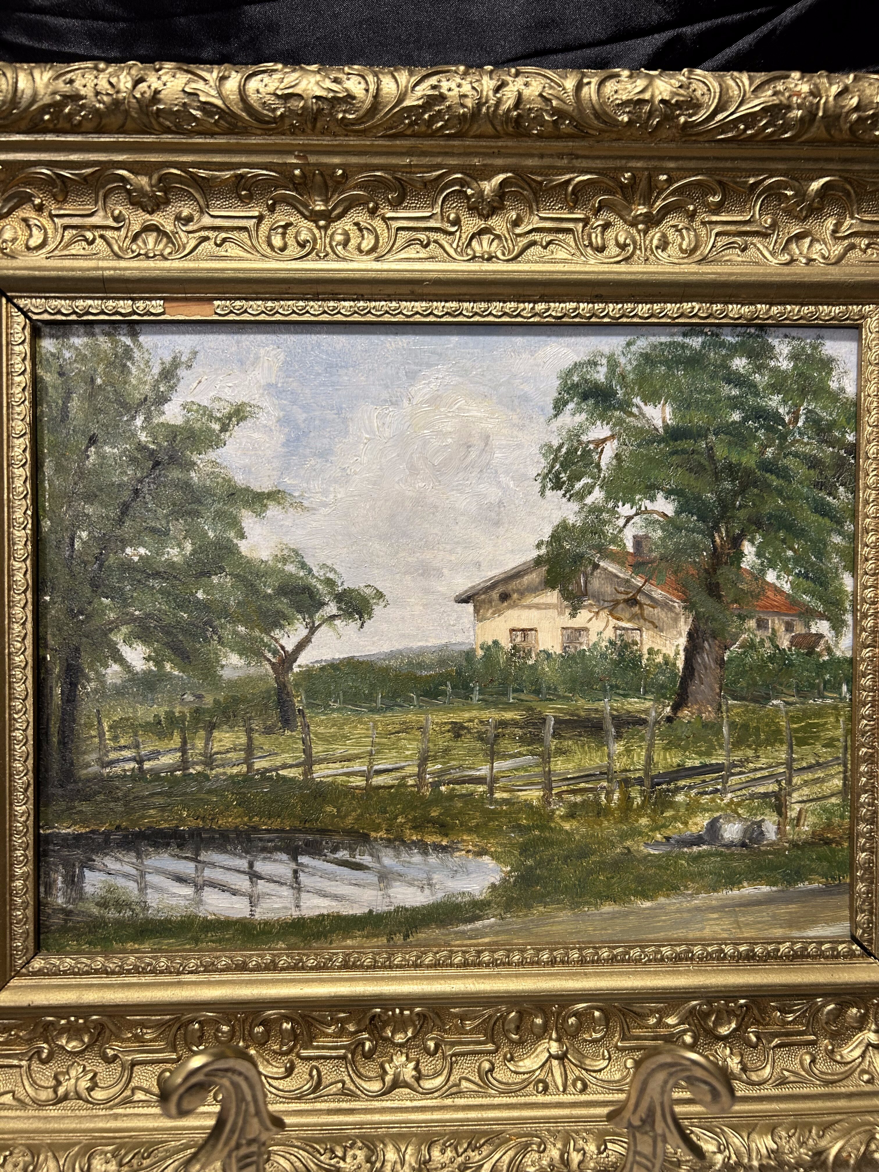 Dekoracyjny obraz przedstawiający spokojny pejzaż z wiejskim domem, drzewami oraz odbiciem w wodzie. Malowany techniką oleju na desce, co nadaje mu wyrazistej faktury i klasycznego charakteru.