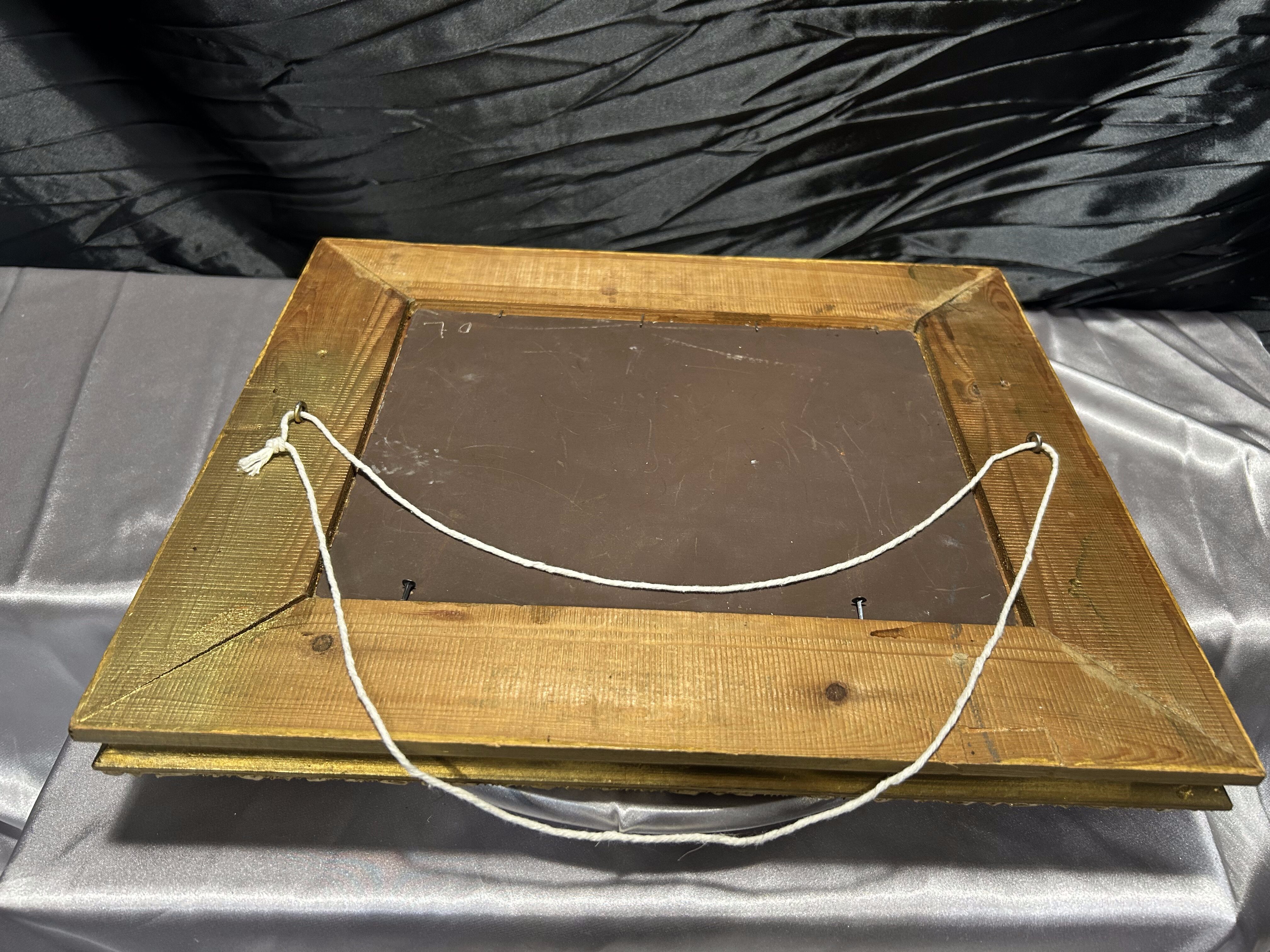 Całość oprawiona w ornamentalną ramę, która jest wyraźnie podrapana, z widocznymi ubytkami — tak jak na zdjęciach. Rama może nadawać się do renowacji, co pozwoli przywrócić jej pierwotny blask lub podkreślić jej starodawny wygląd.