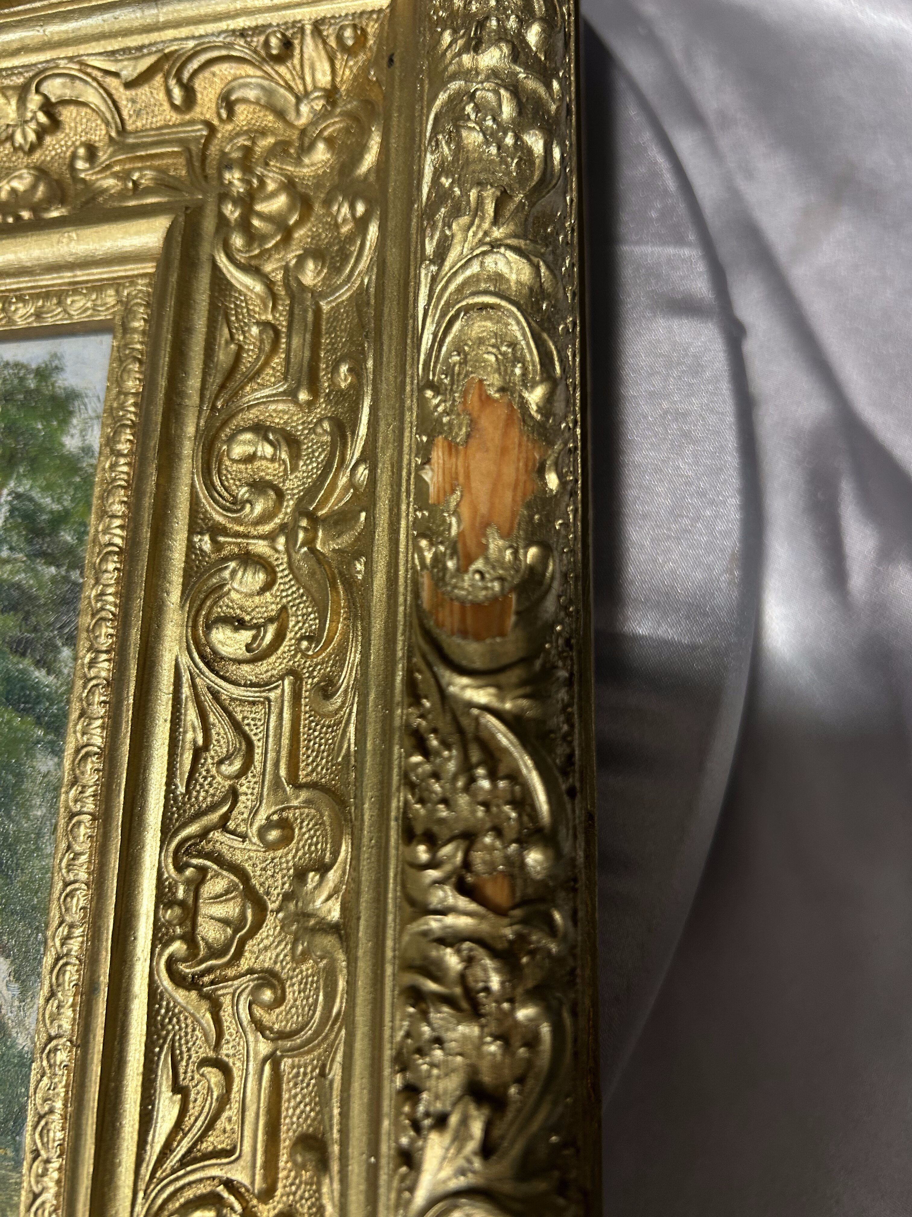Obraz w klasycznej, bogato zdobionej ramie to wyjątkowy element dekoracyjny. Mimo podrapanej ramy, całość prezentuje się okazale i wprowadza charakterystyczny klimat dawnych wnętrz.
