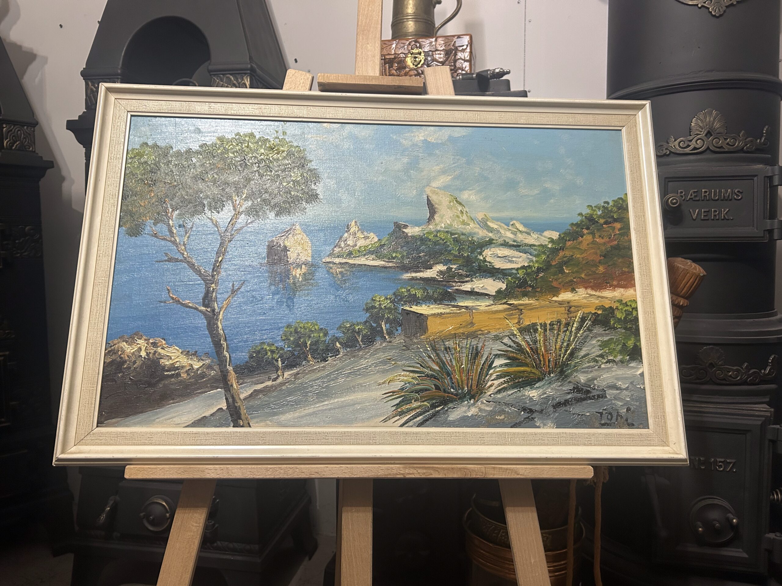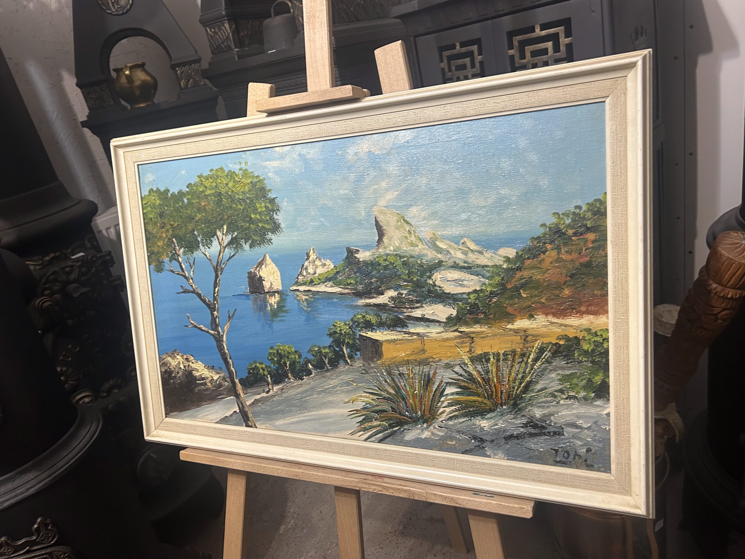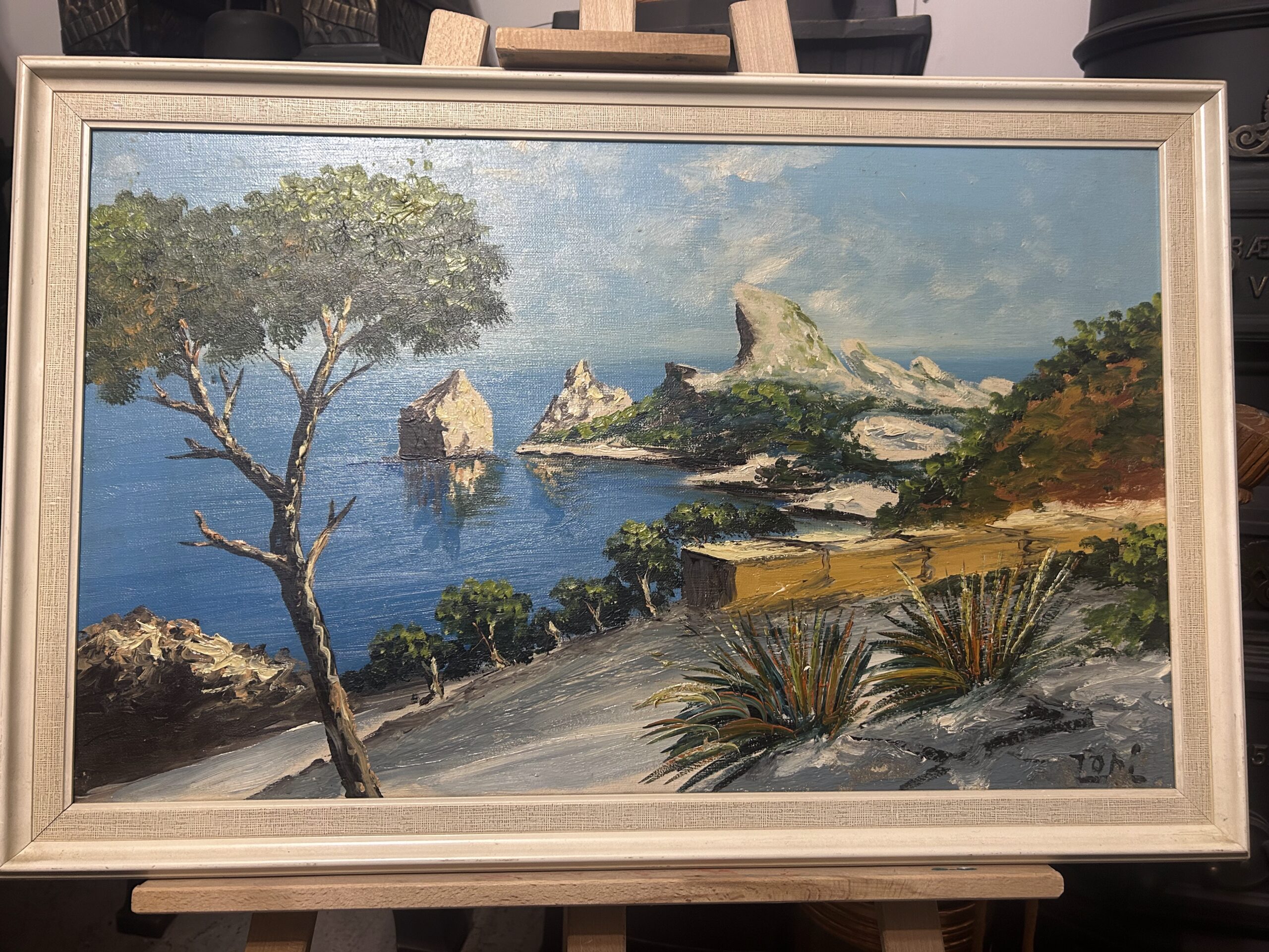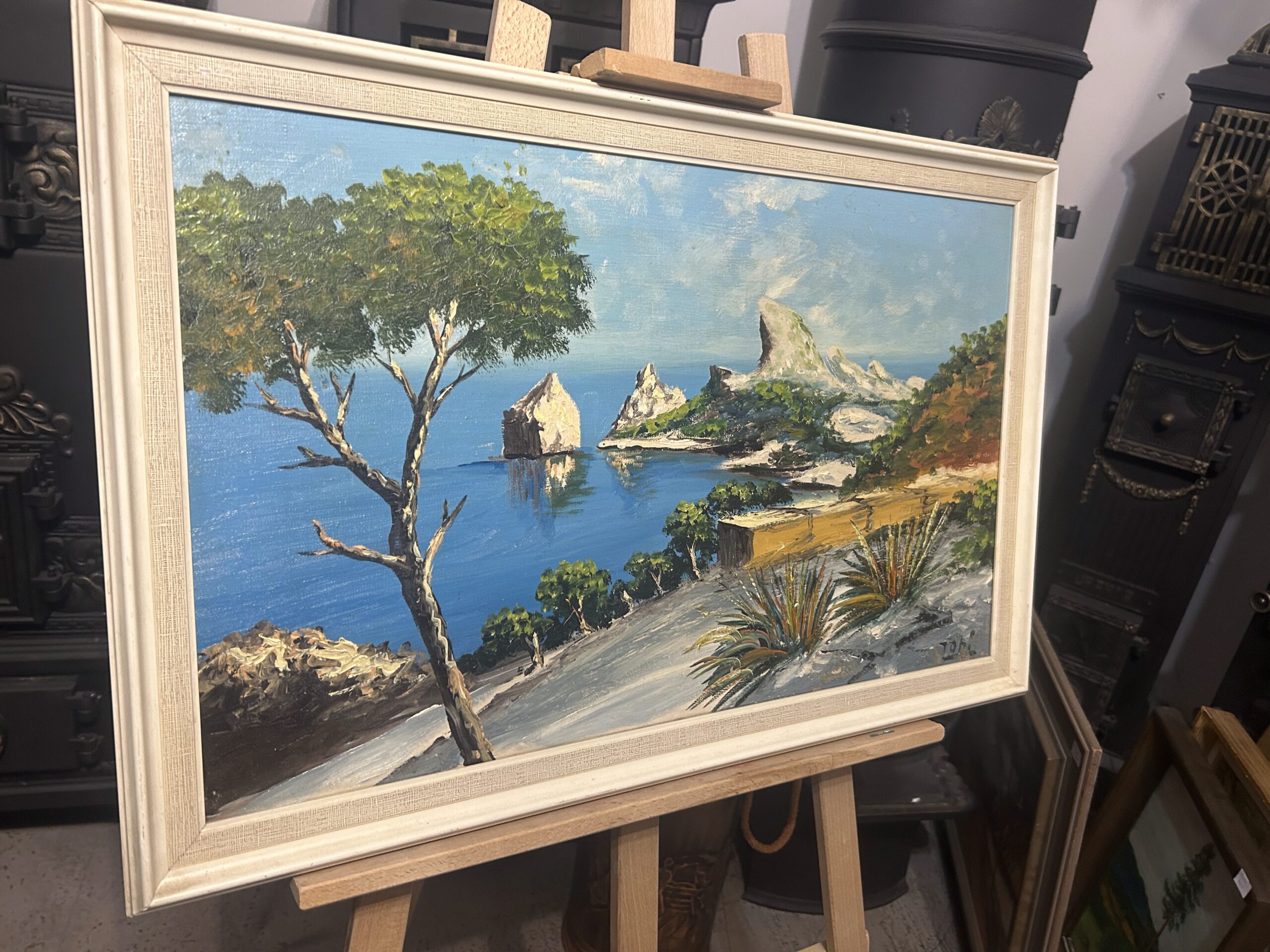 Wyjątkowy obraz przedstawiający malowniczy krajobraz skalistego brzegu, pełen żywych kolorów i artystycznego wyrazu. Malowany techniką olejną na płótnie, dzieło oddaje naturalne piękno i energię przybrzeżnej scenerii. Obraz sygnowany podpisem autora ZOMI.