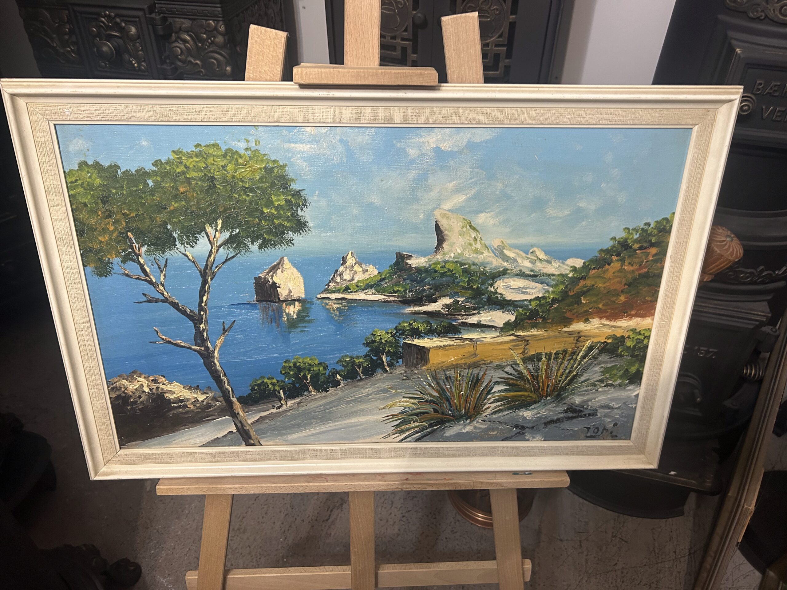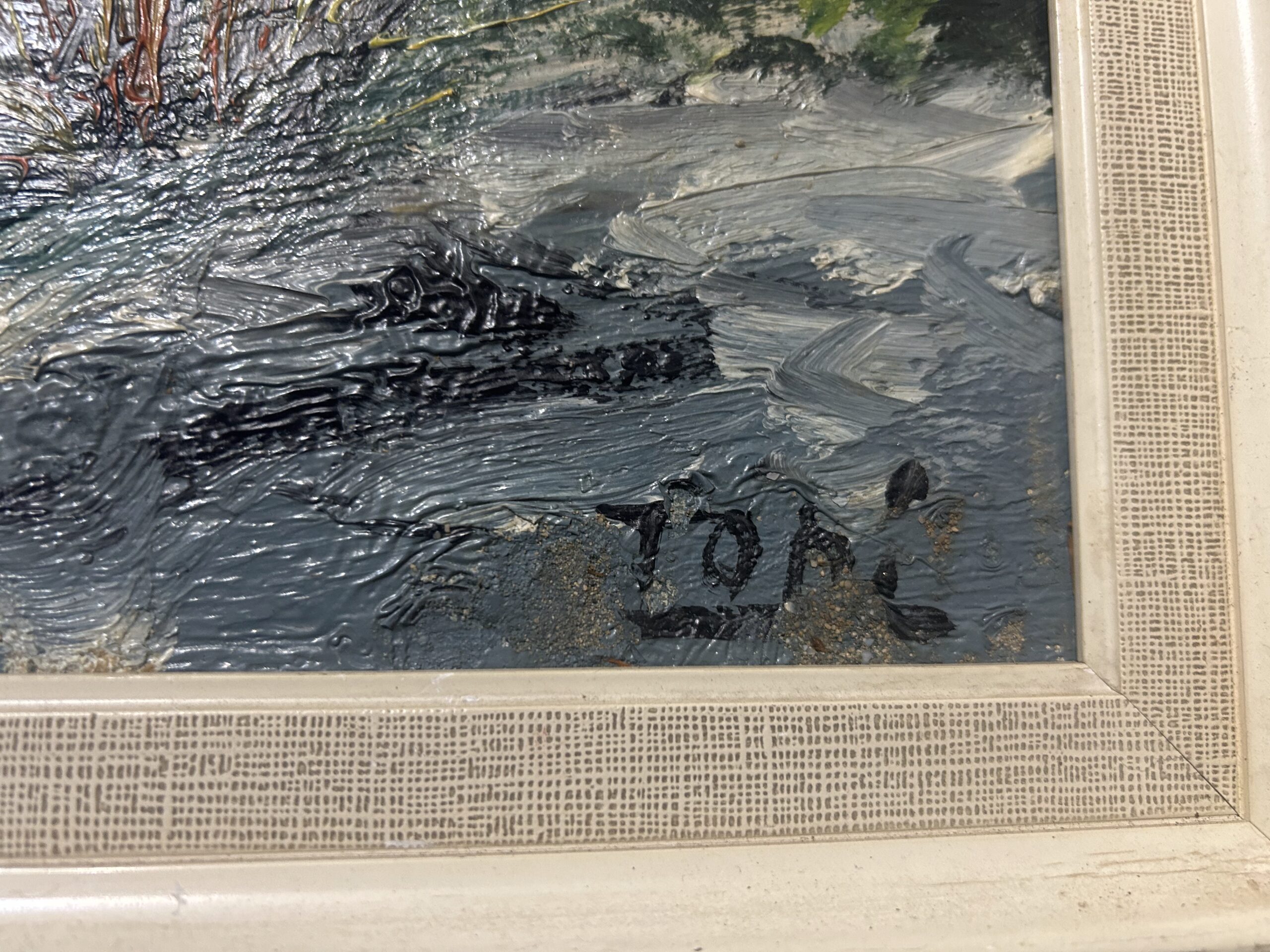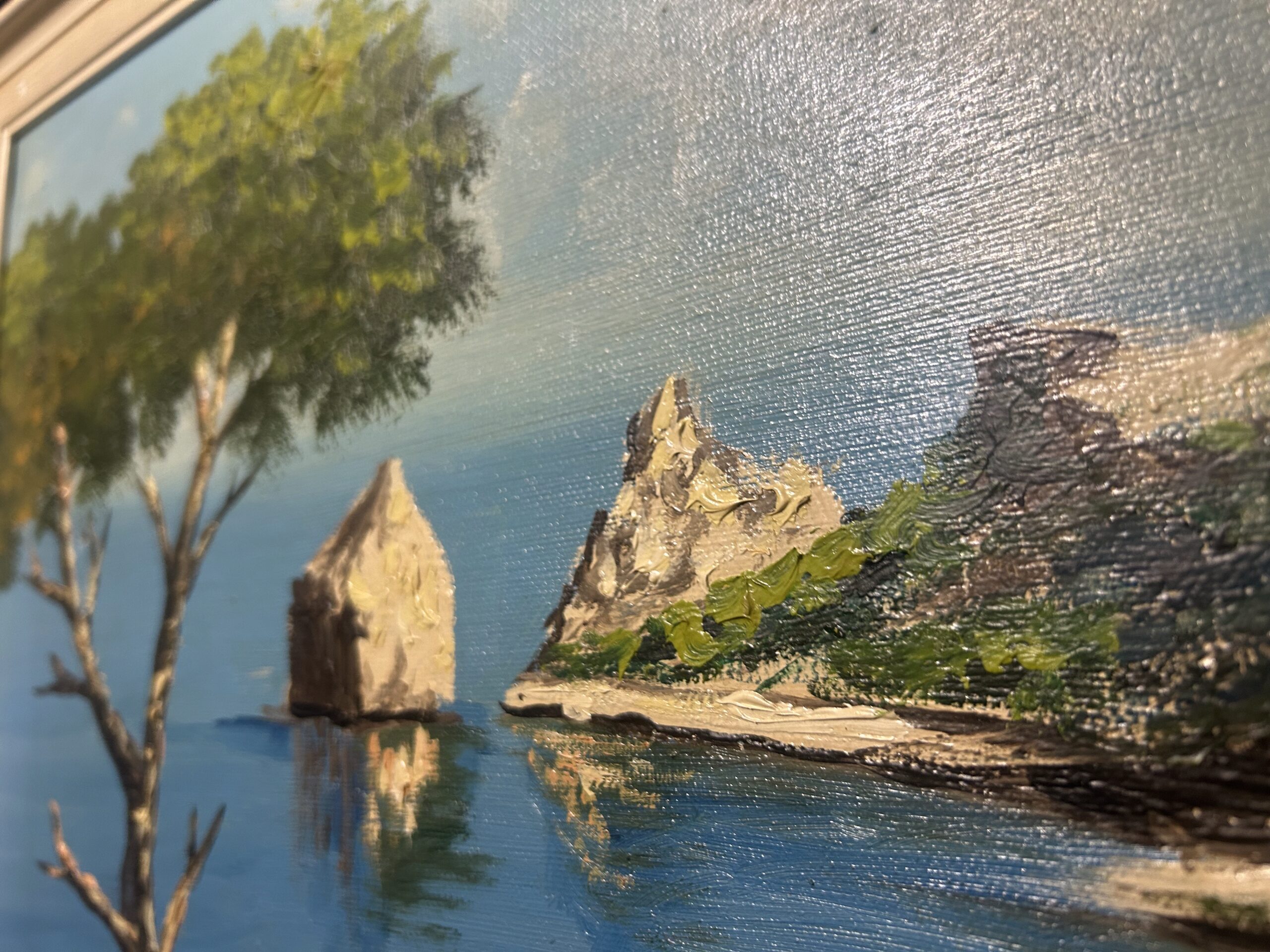 Wyjątkowy obraz przedstawiający malowniczy krajobraz skalistego brzegu, pełen żywych kolorów i artystycznego wyrazu. Malowany techniką olejną na płótnie, dzieło oddaje naturalne piękno i energię przybrzeżnej scenerii. Obraz sygnowany podpisem autora ZOMI.