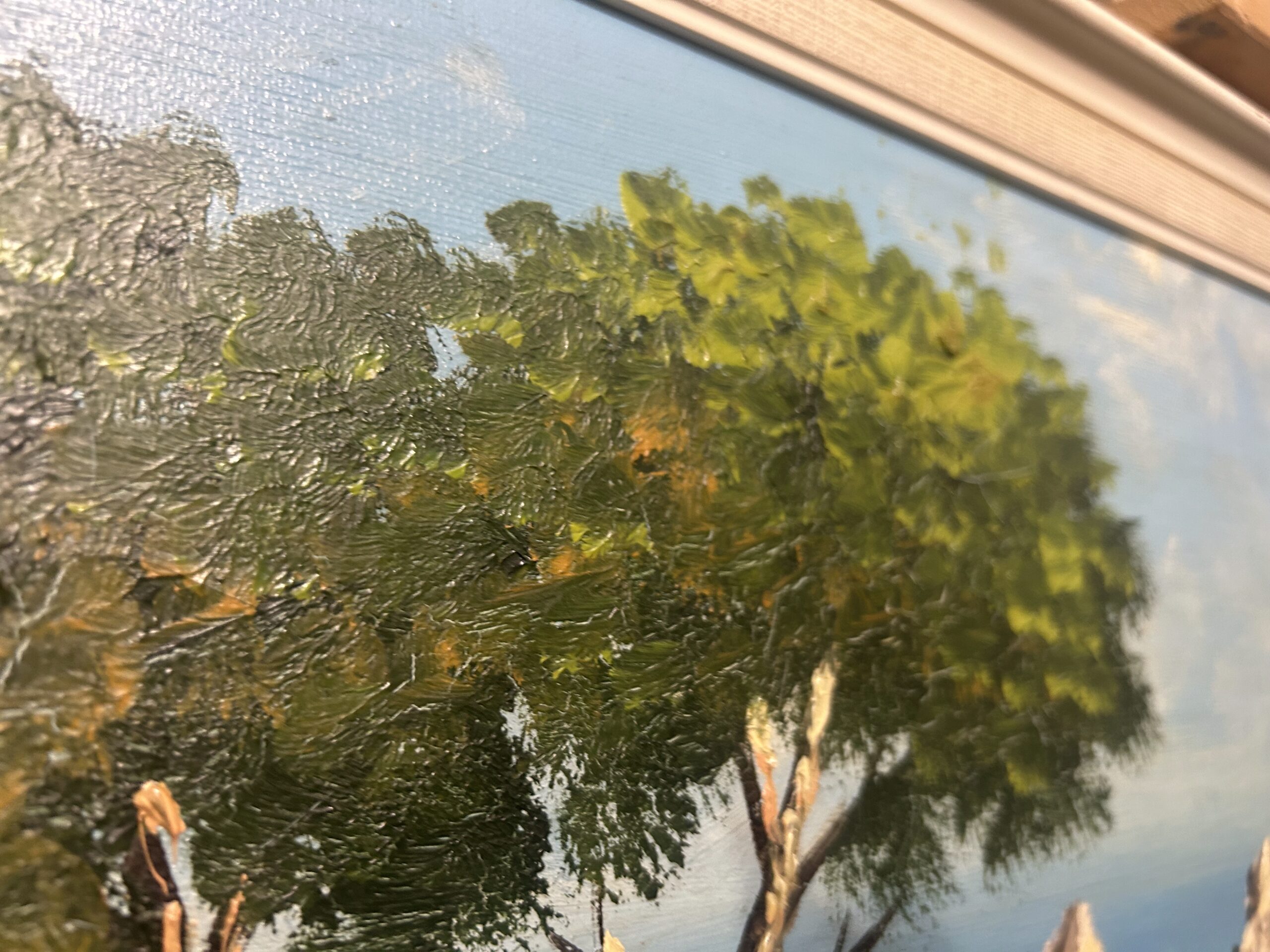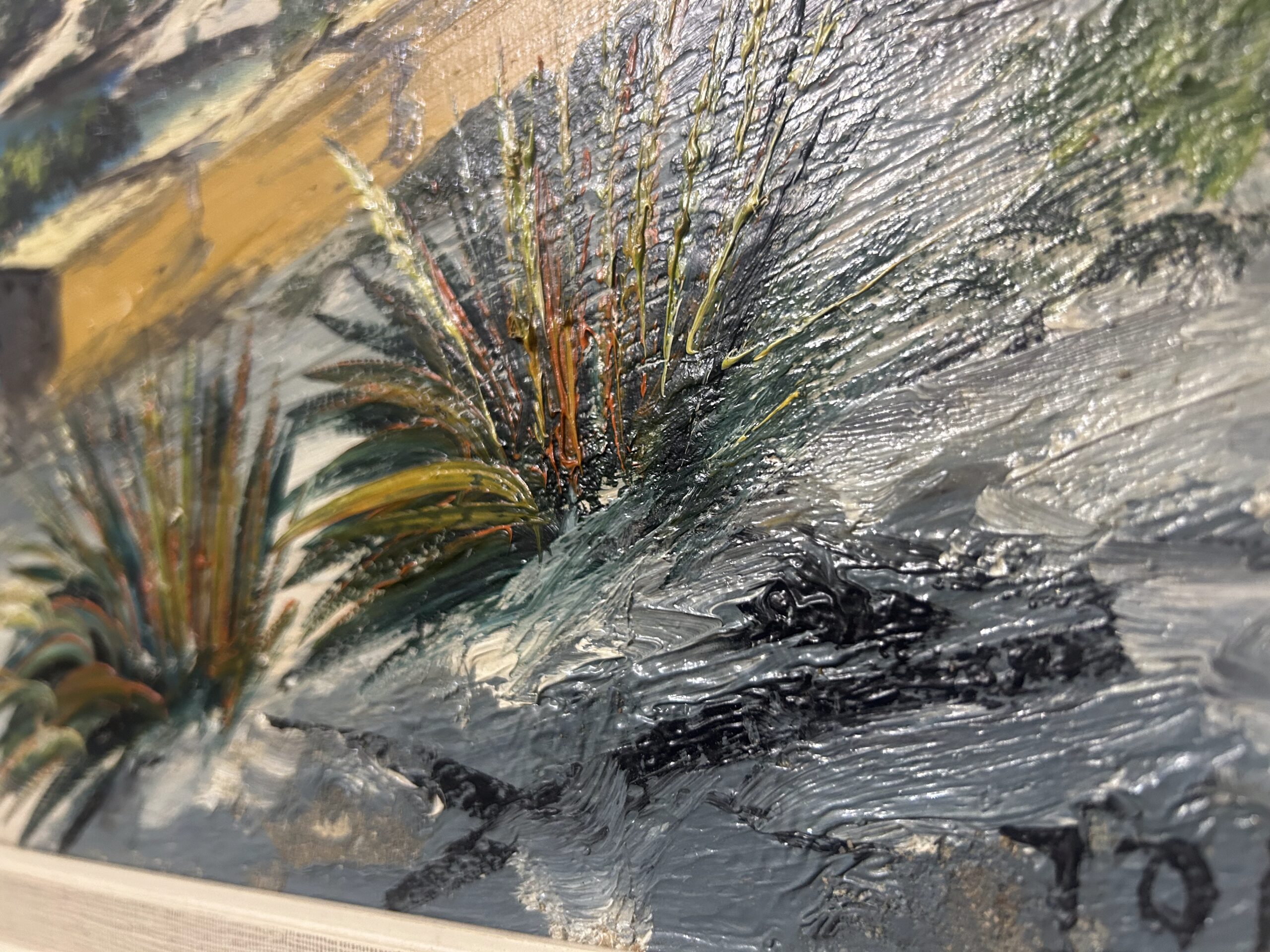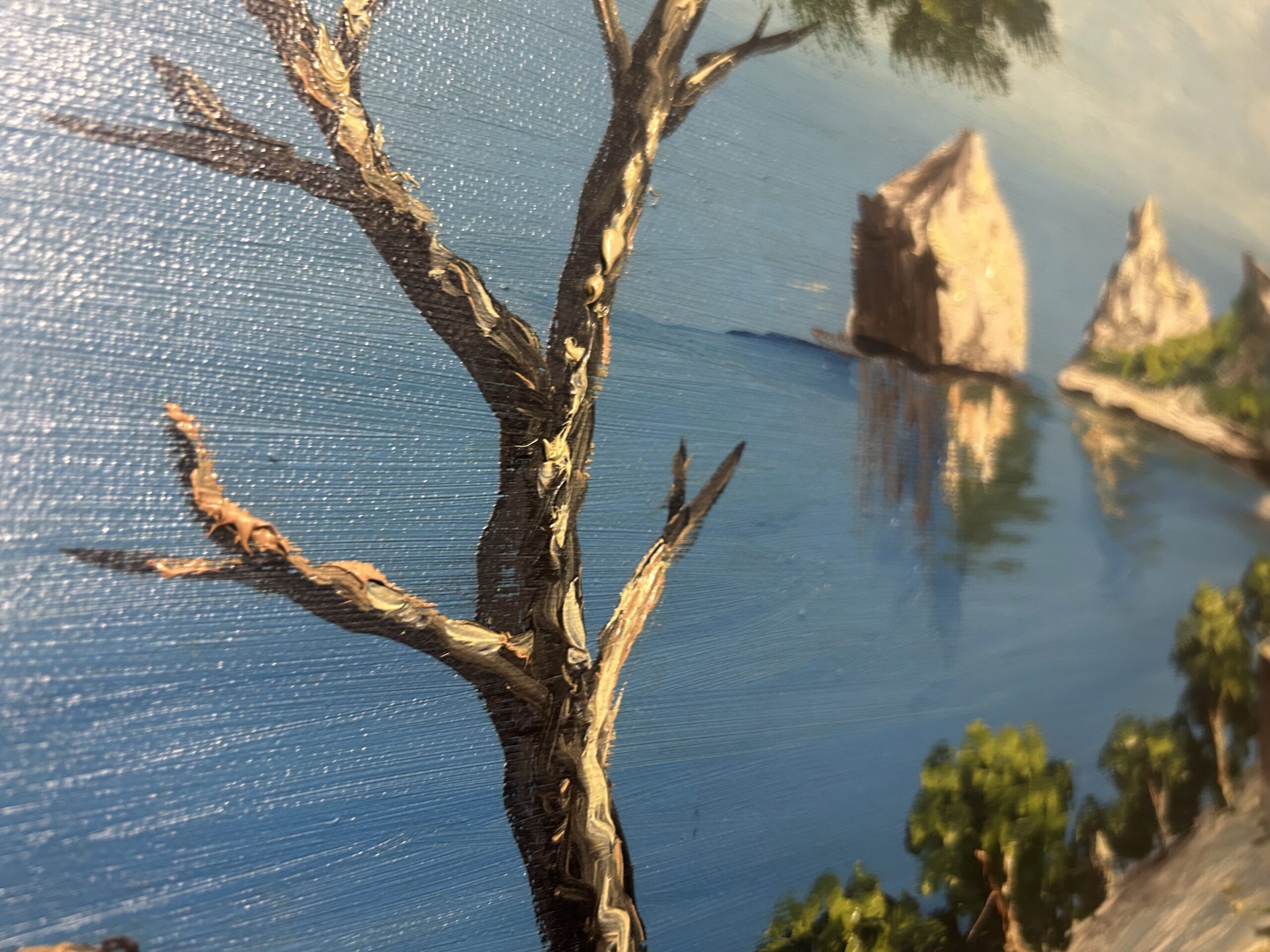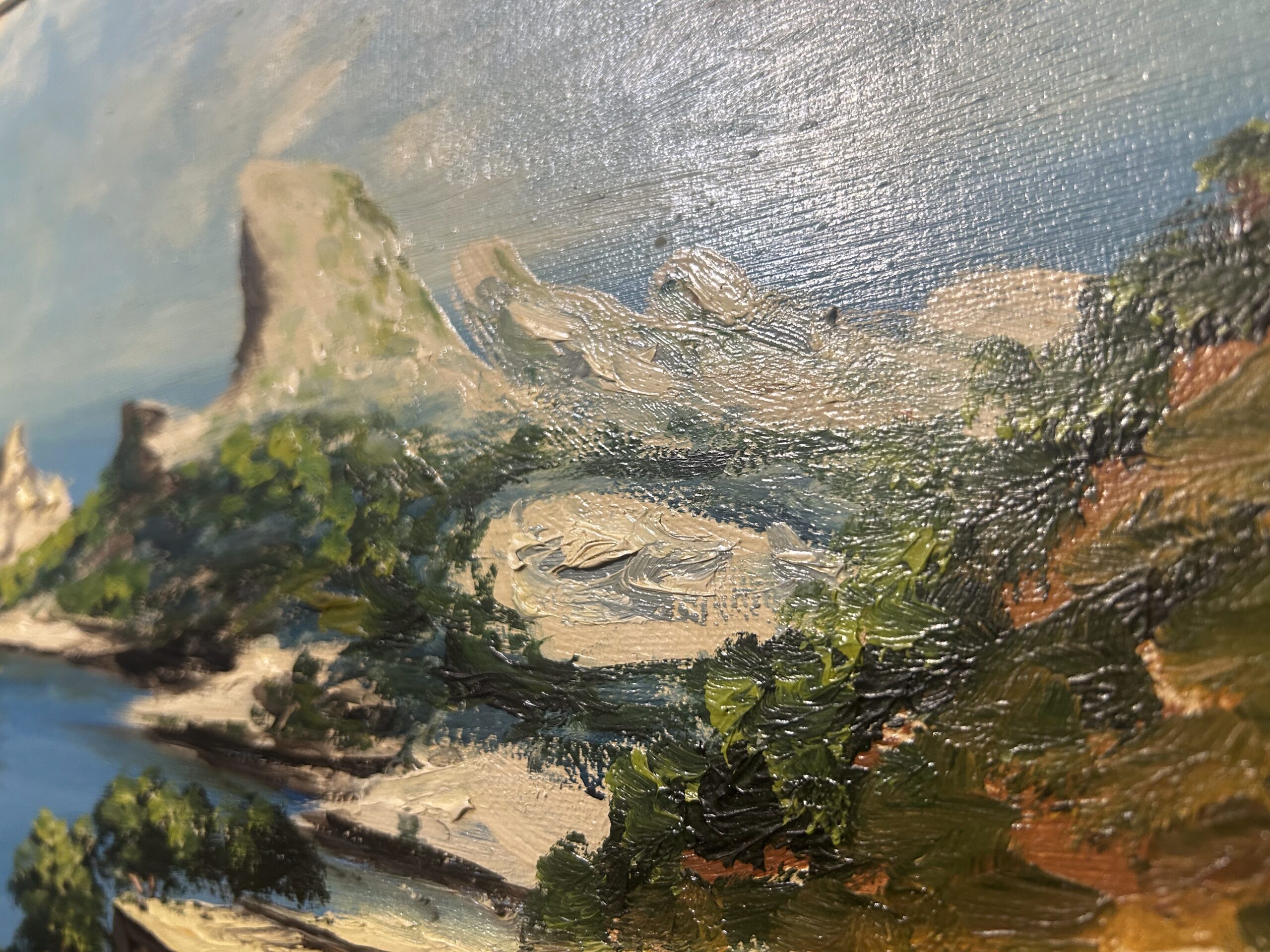 Wyjątkowy obraz przedstawiający malowniczy krajobraz skalistego brzegu, pełen żywych kolorów i artystycznego wyrazu. Malowany techniką olejną na płótnie, dzieło oddaje naturalne piękno i energię przybrzeżnej scenerii. Obraz sygnowany podpisem autora ZOMI.