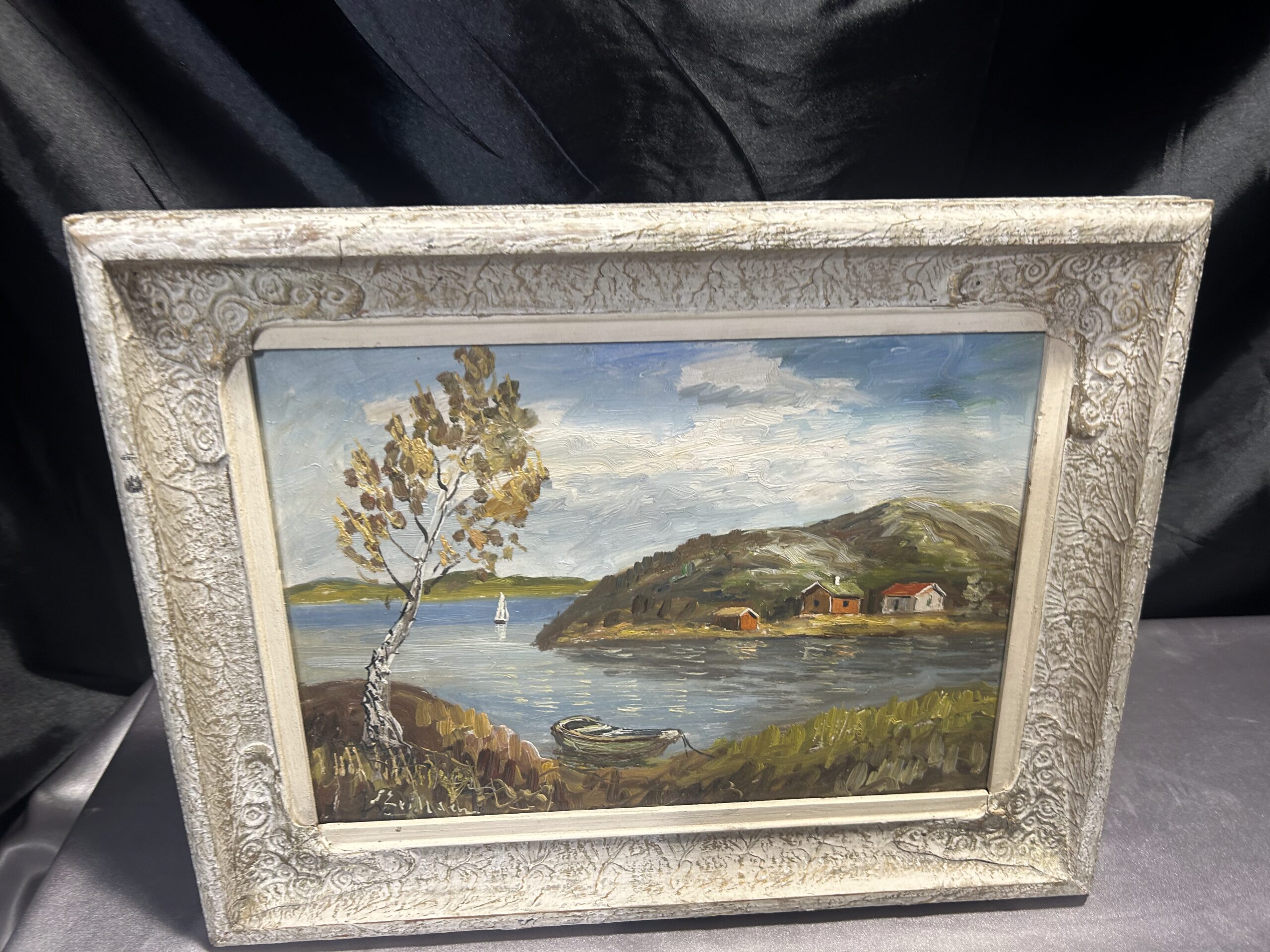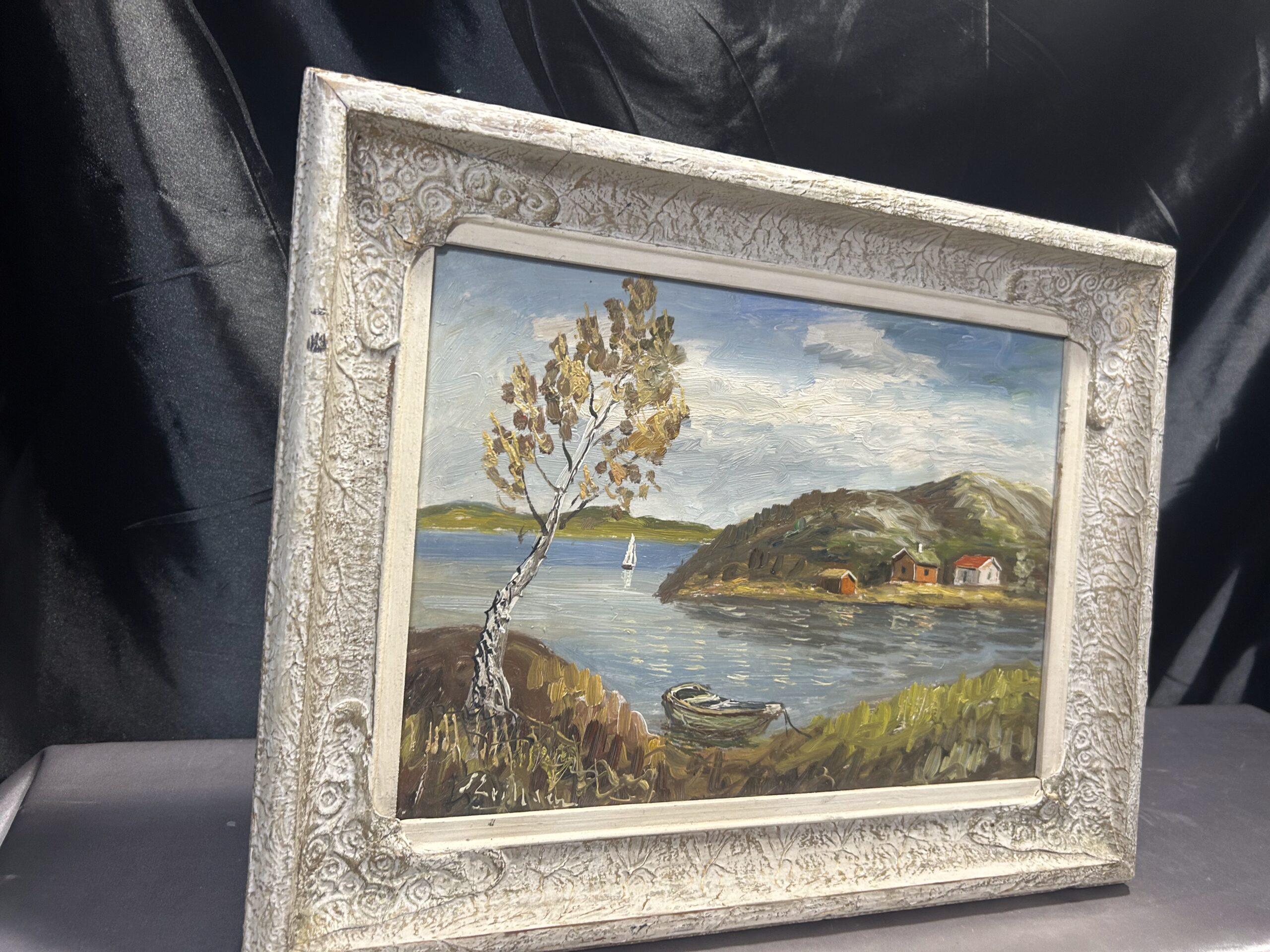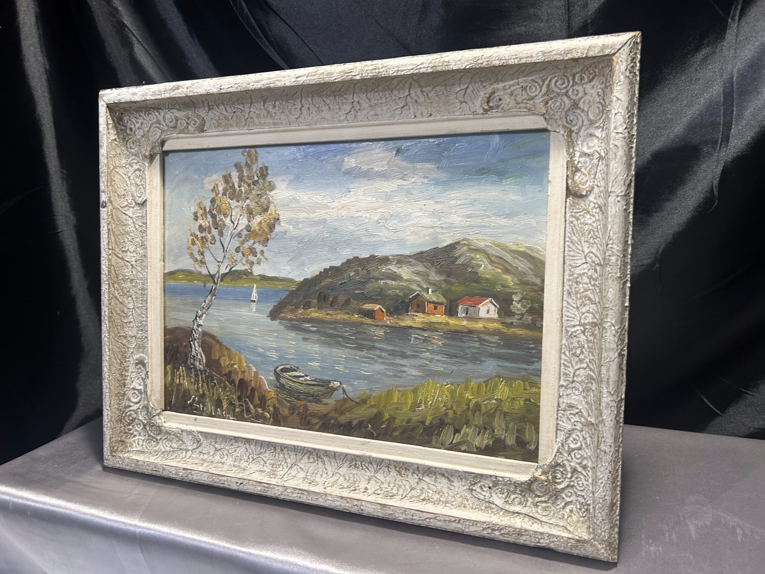 Urokliwy pejzaż przedstawiający malownicze domki nad jeziorem, utrzymany w ciepłej, nostalgicznej tonacji. Obraz został namalowany techniką olejną na desce, co nadaje mu wyjątkową trwałość i głębię kolorów. Oprawiony w stylową, biało-złotą ramę z delikatnymi przecierkami, która podkreśla jego klasyczny charakter. Autor pozostaje nieczytelny, co dodaje kompozycji nuty tajemniczości.