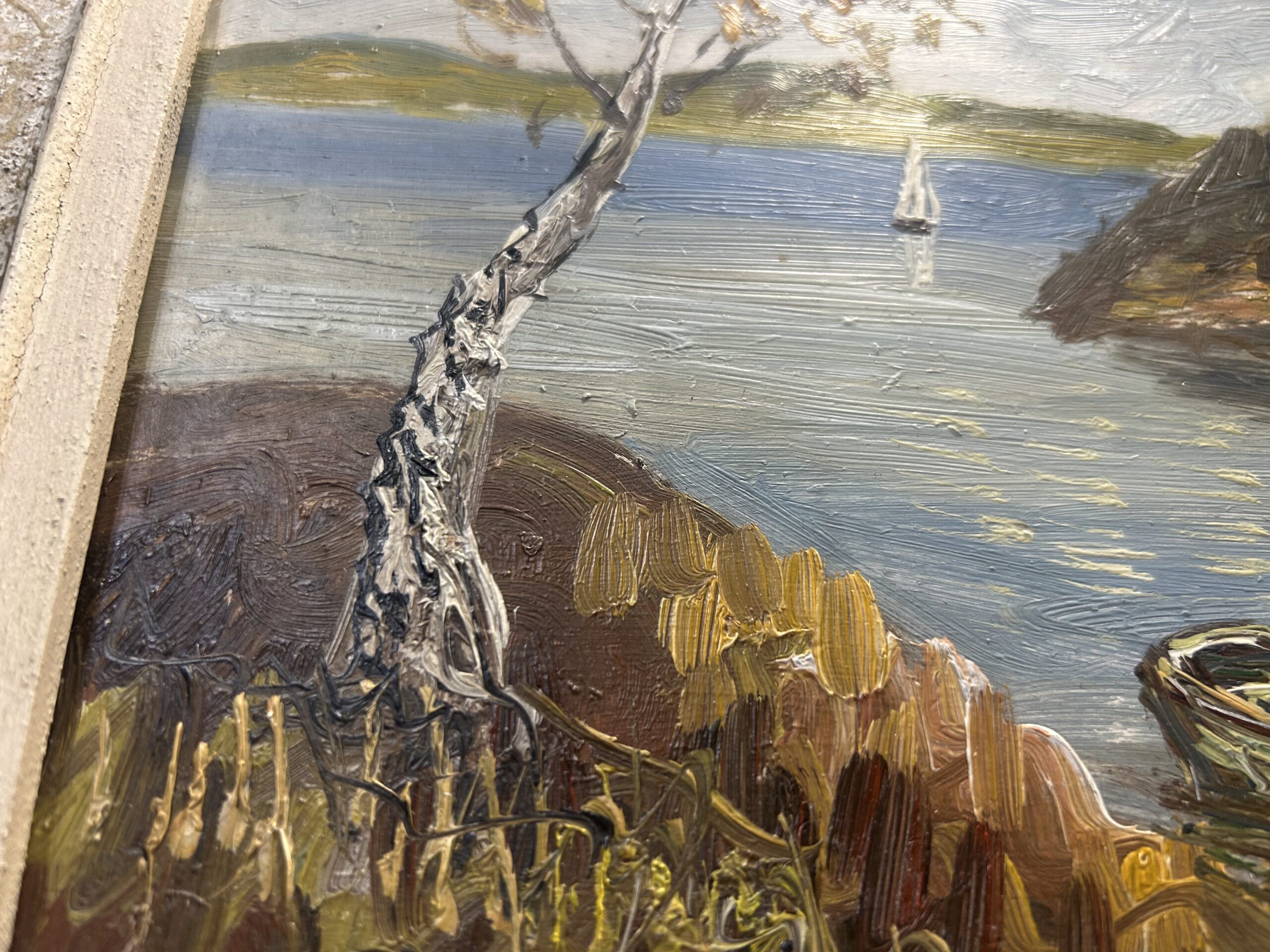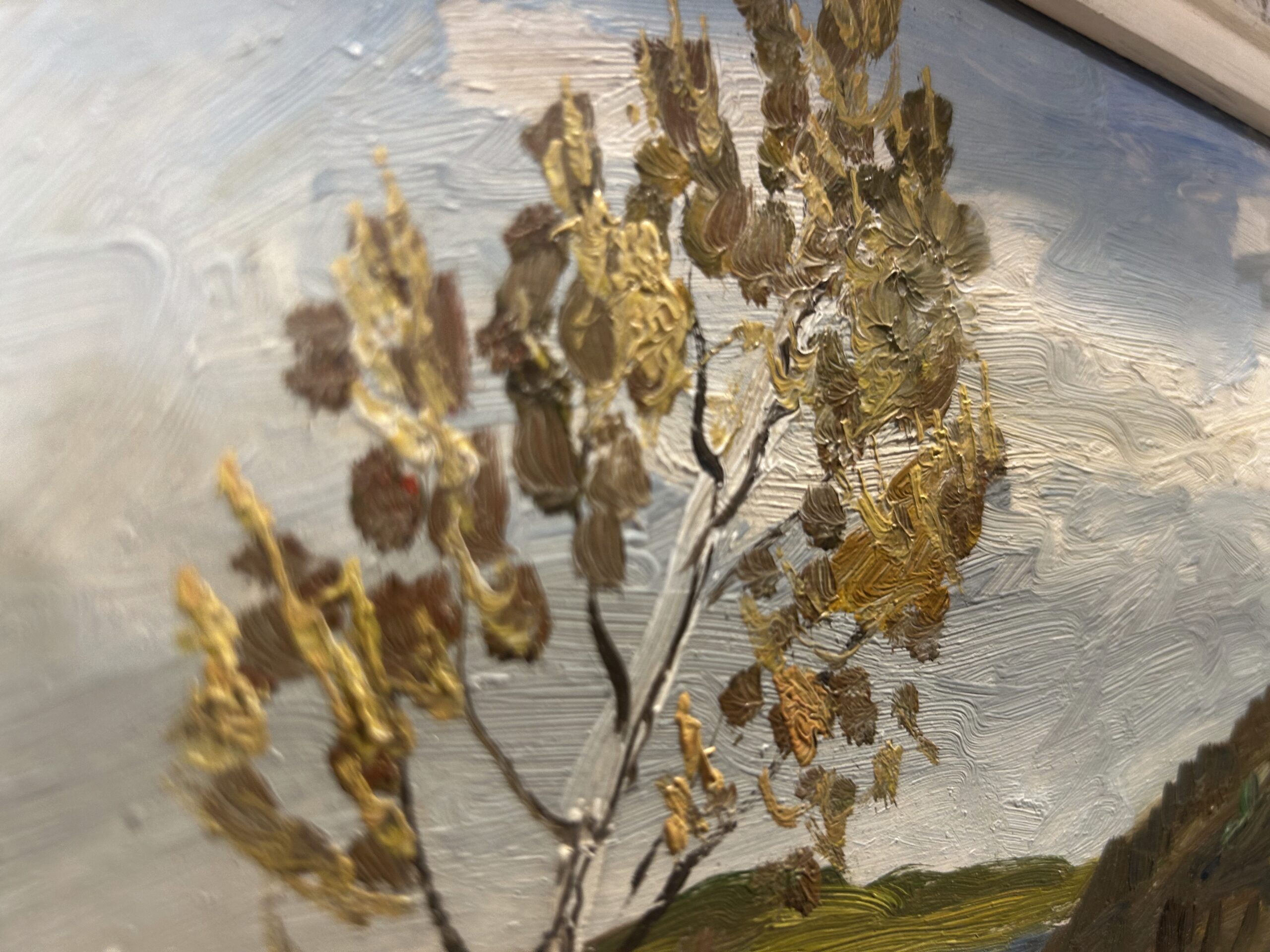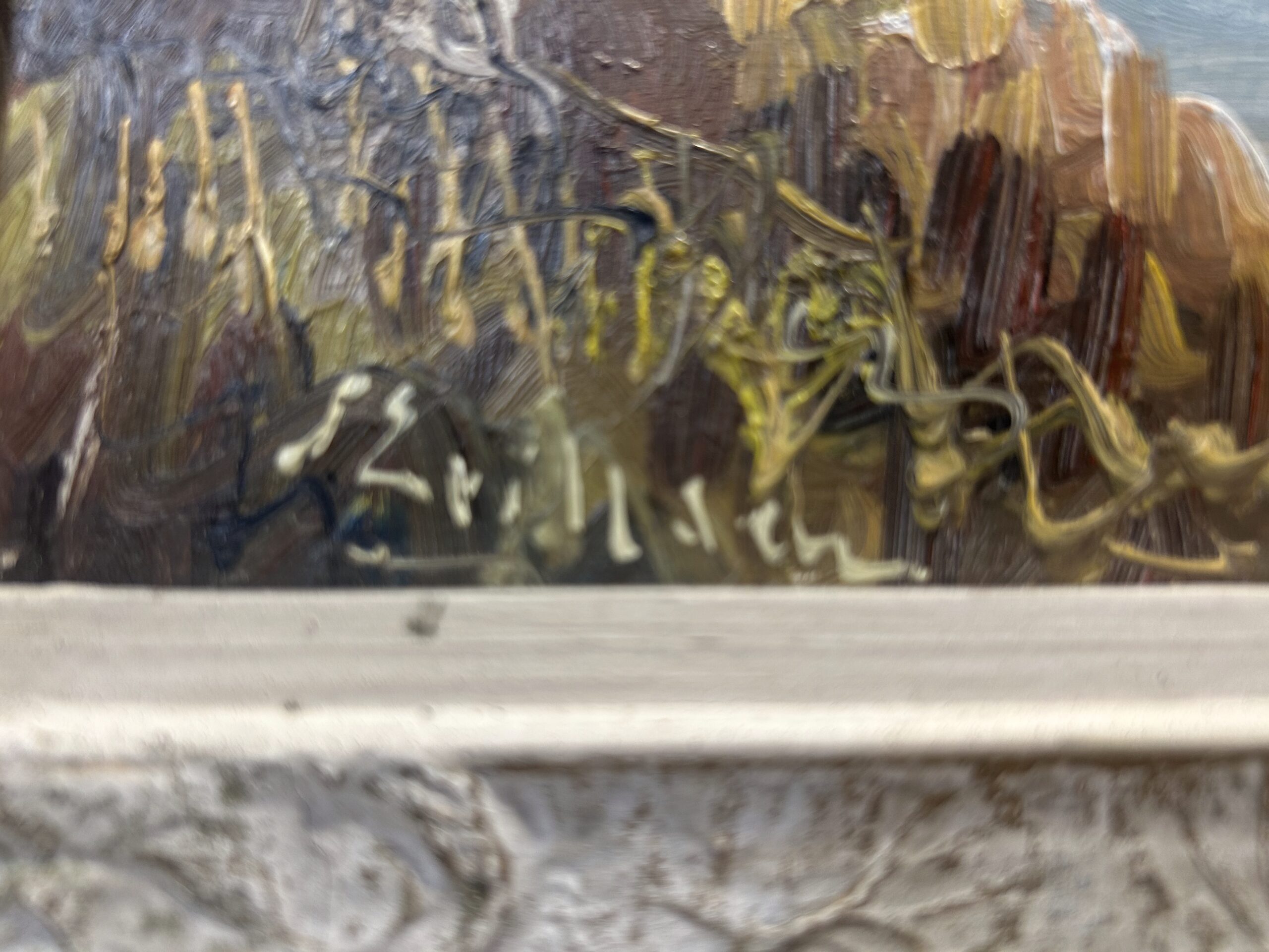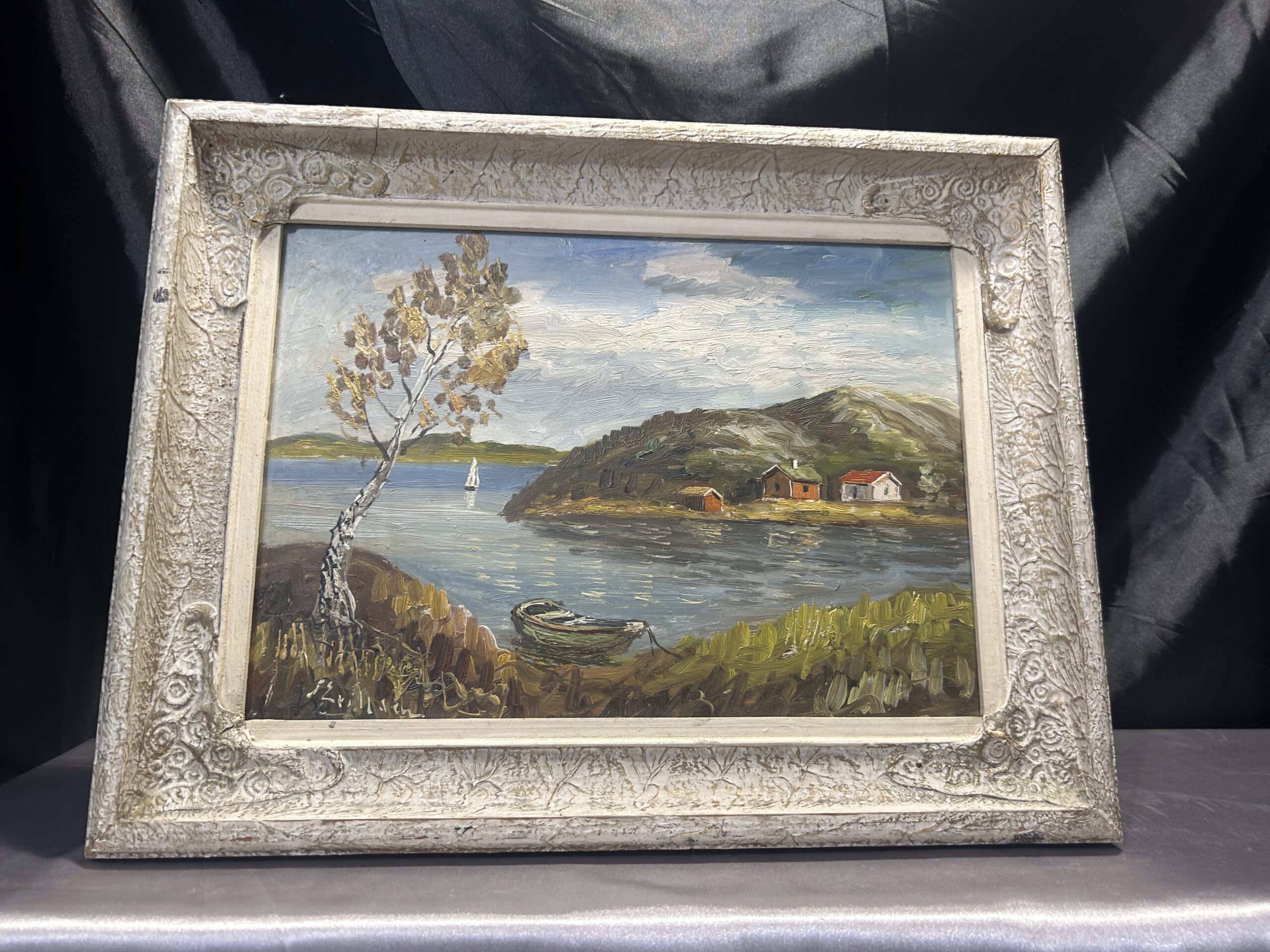 Urokliwy pejzaż przedstawiający malownicze domki nad jeziorem, utrzymany w ciepłej, nostalgicznej tonacji. Obraz został namalowany techniką olejną na desce, co nadaje mu wyjątkową trwałość i głębię kolorów. Oprawiony w stylową, biało-złotą ramę z delikatnymi przecierkami, która podkreśla jego klasyczny charakter. Autor pozostaje nieczytelny, co dodaje kompozycji nuty tajemniczości.