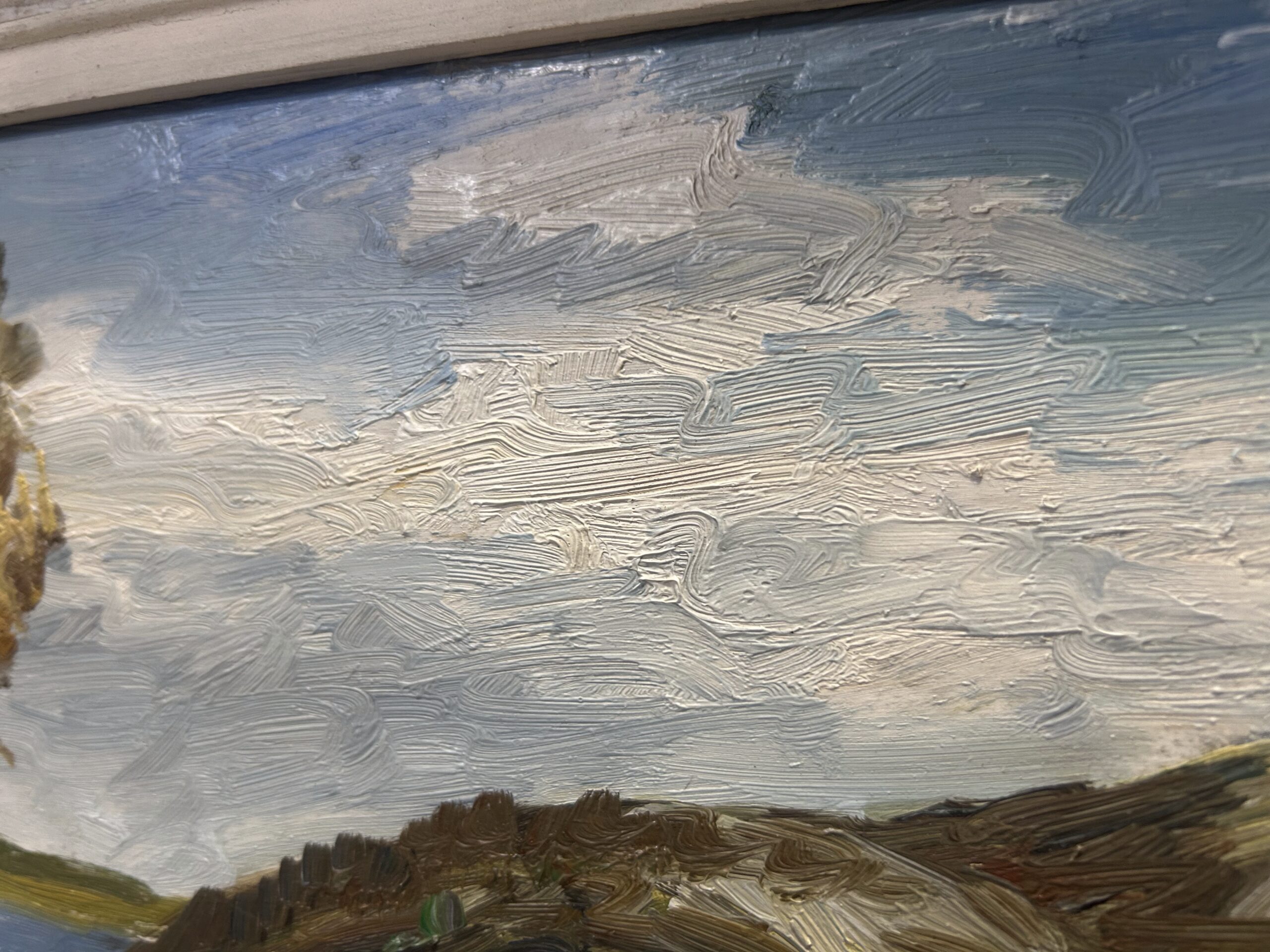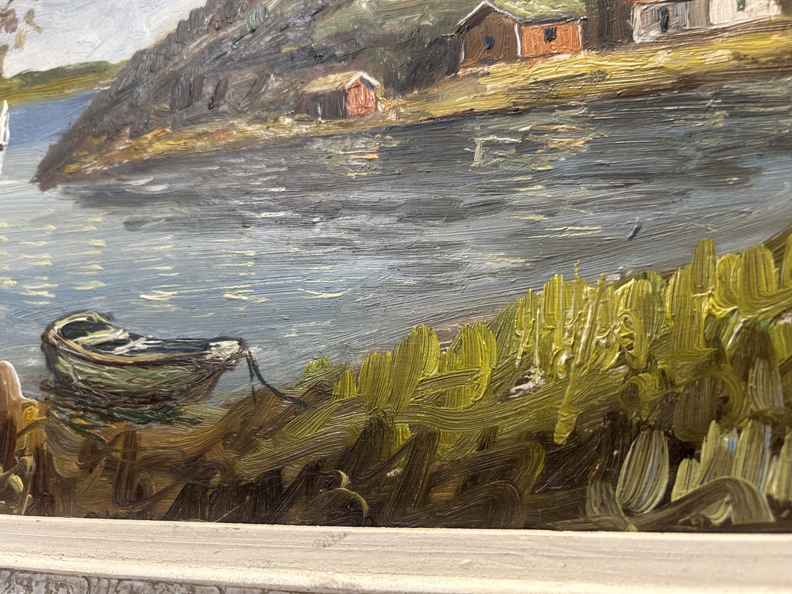 Pejzaż z Domkami nad Jeziorem – Olej na Desce, Biało-Złota Rama