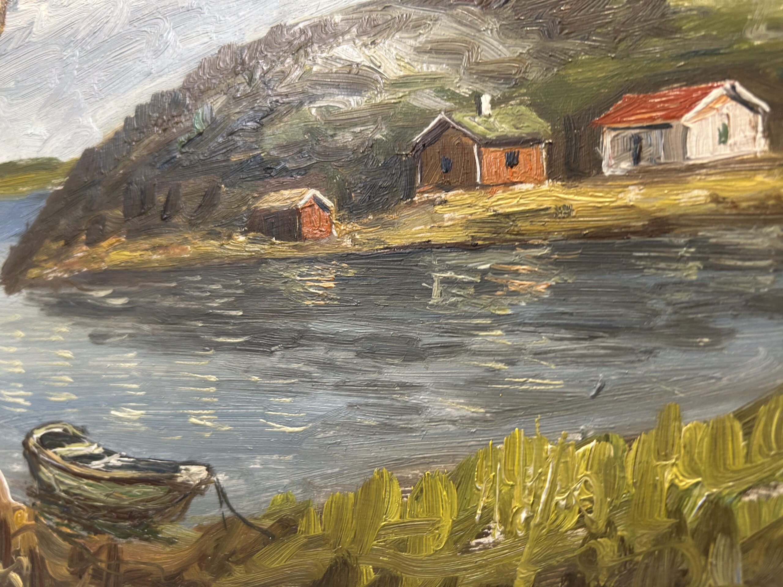 - Pejzaż z Domkami nad Jeziorem – Olej na Desce, Biało-Złota Rama
