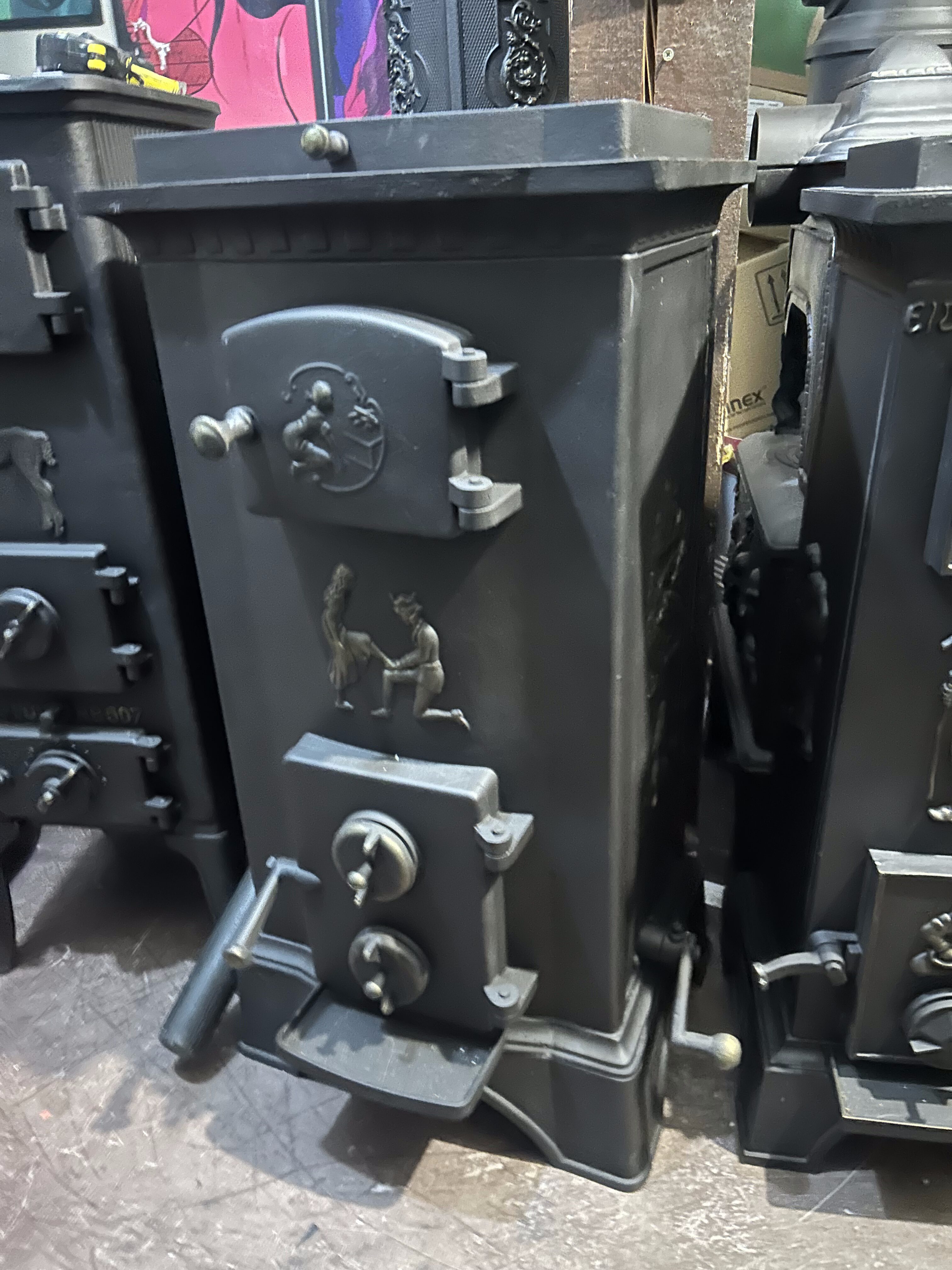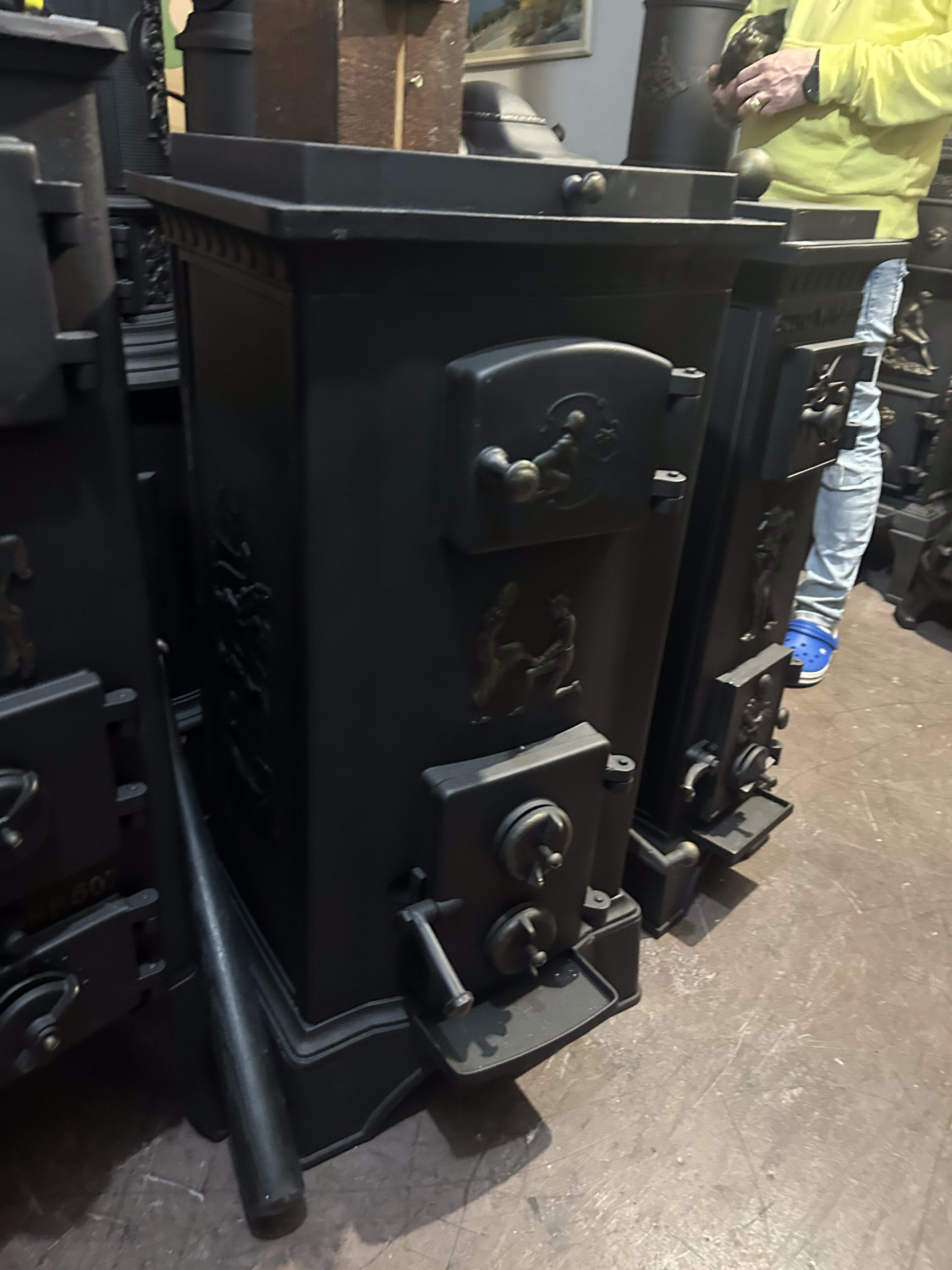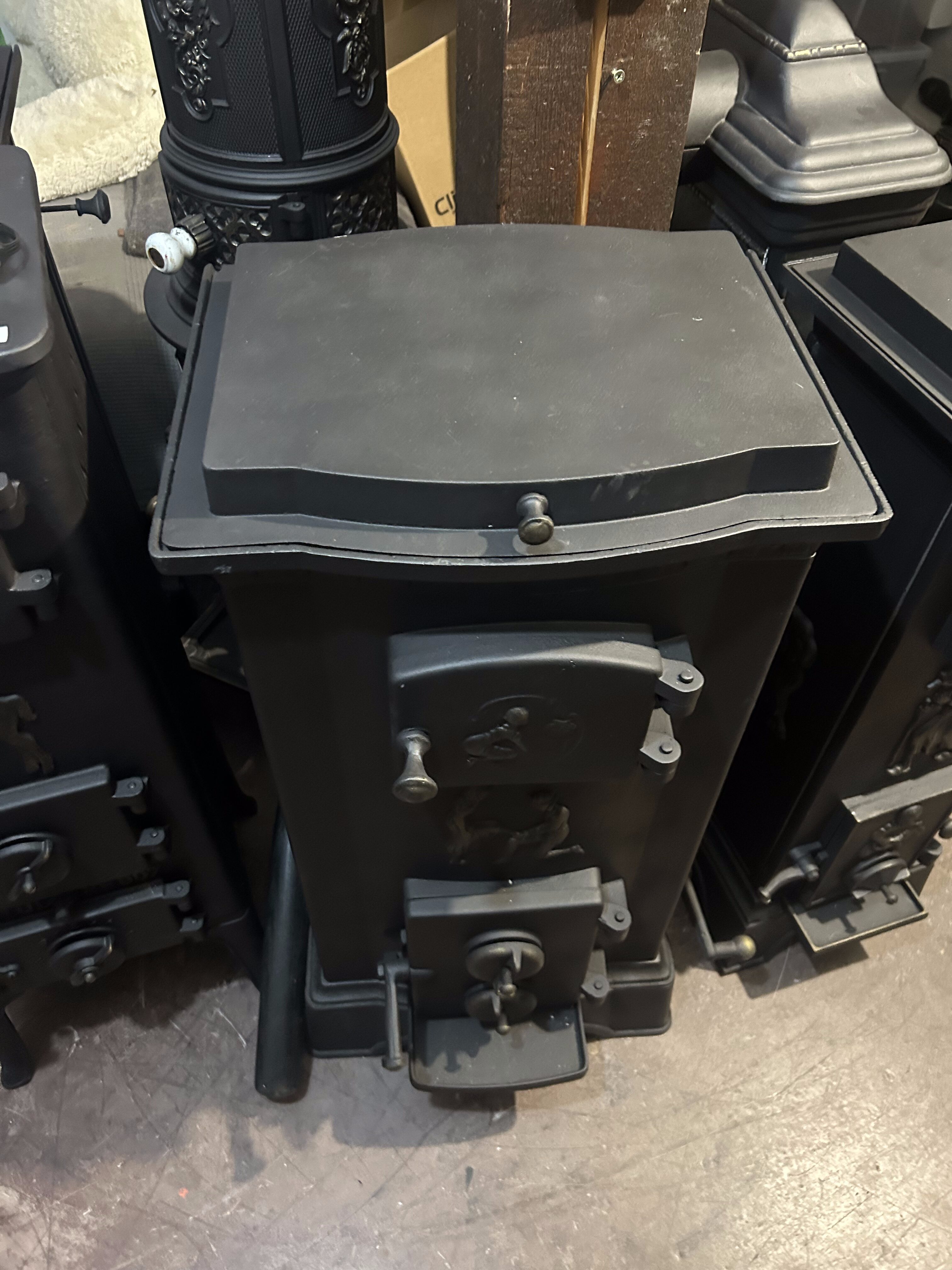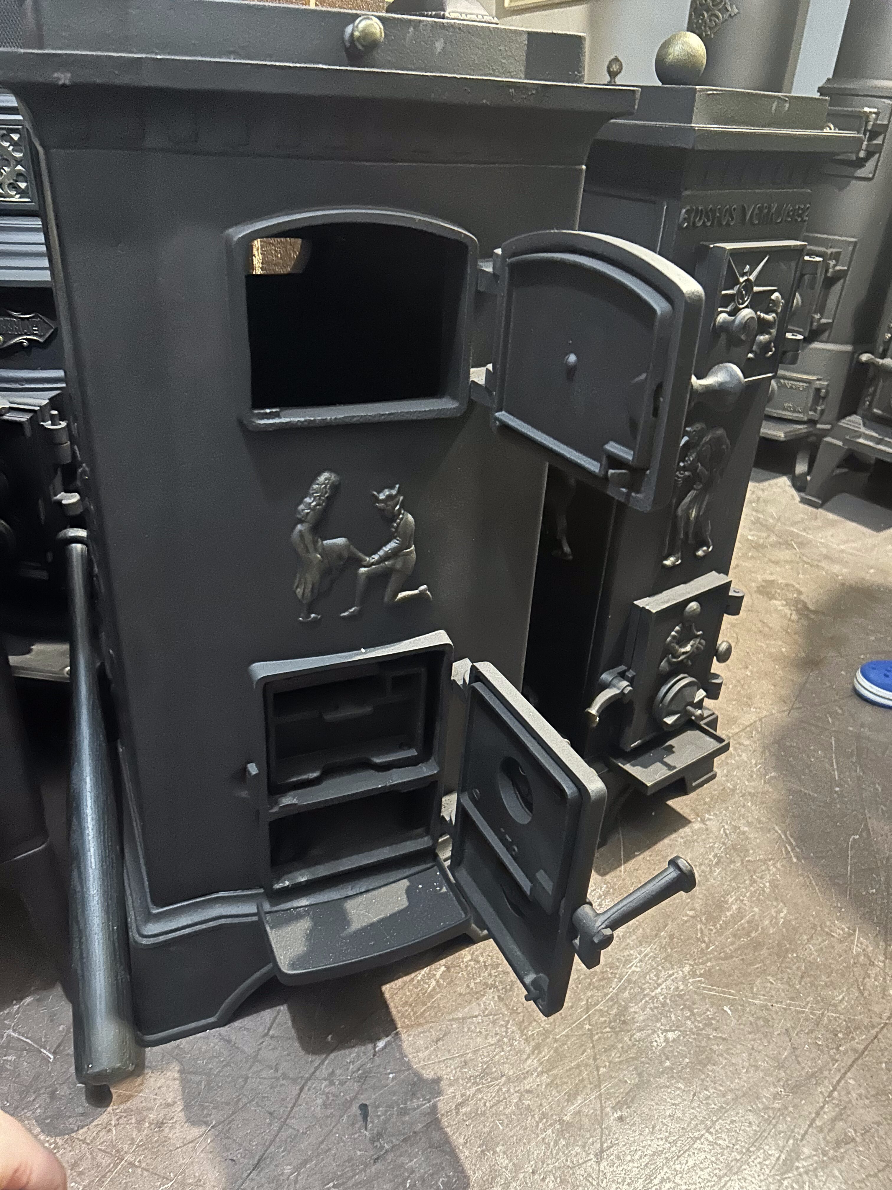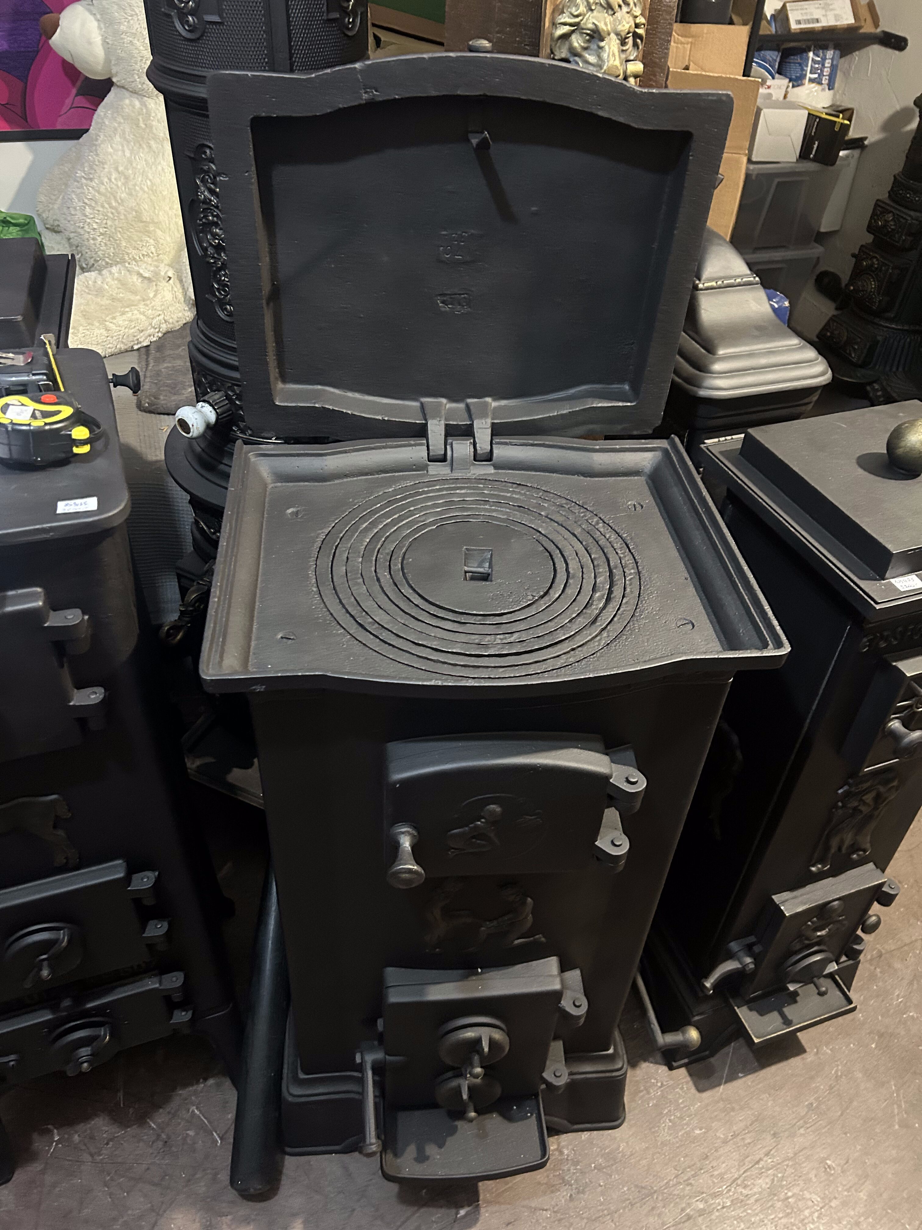 Piec po pełnym procesie renowacji, przygotowany do dalszego użytkowania. Pod górną pokrywą znajduje się fajerka, umożliwiająca gotowanie. Konstrukcja bez szamotu, z wylotem spalin umieszczonym z tyłu.