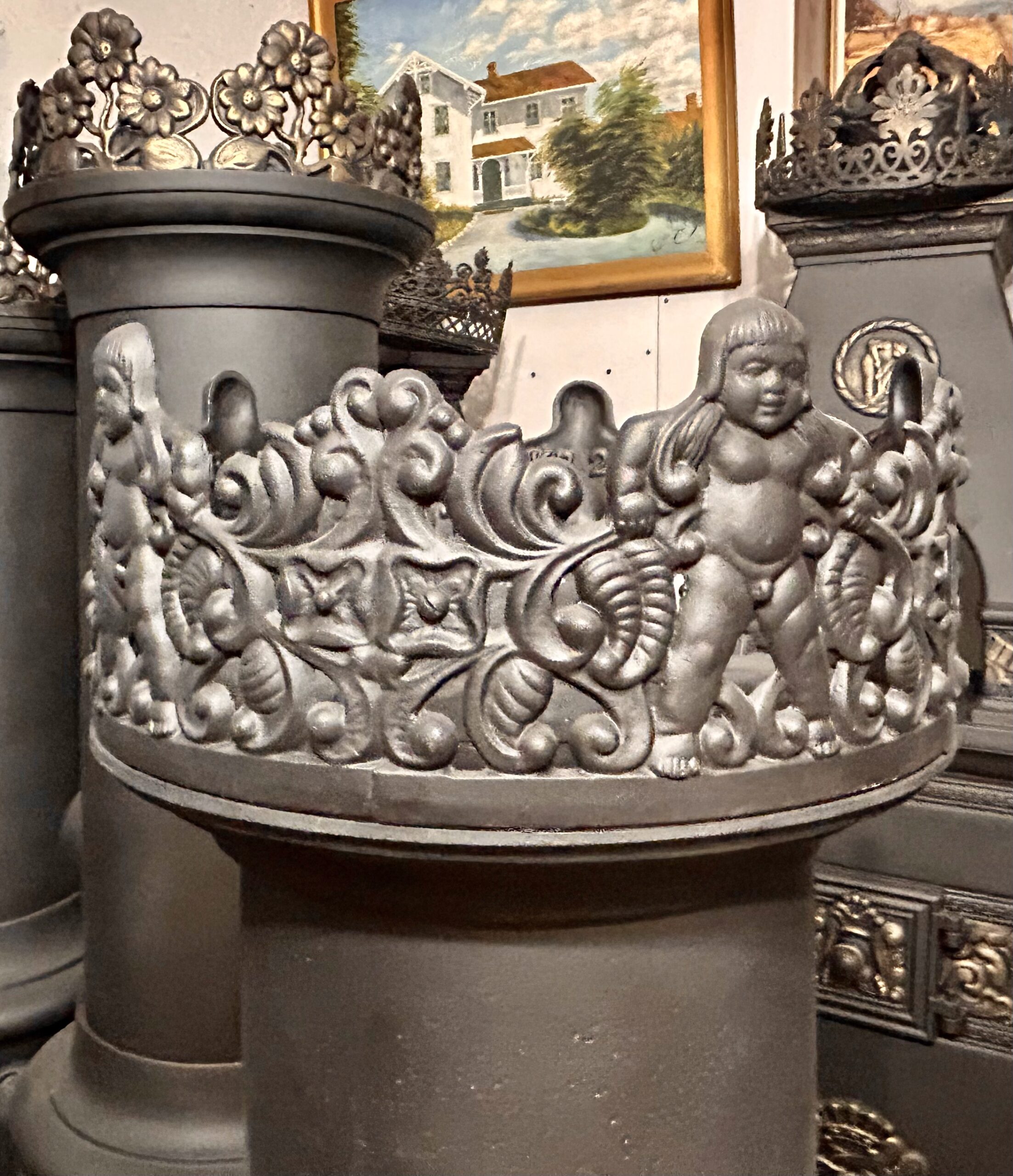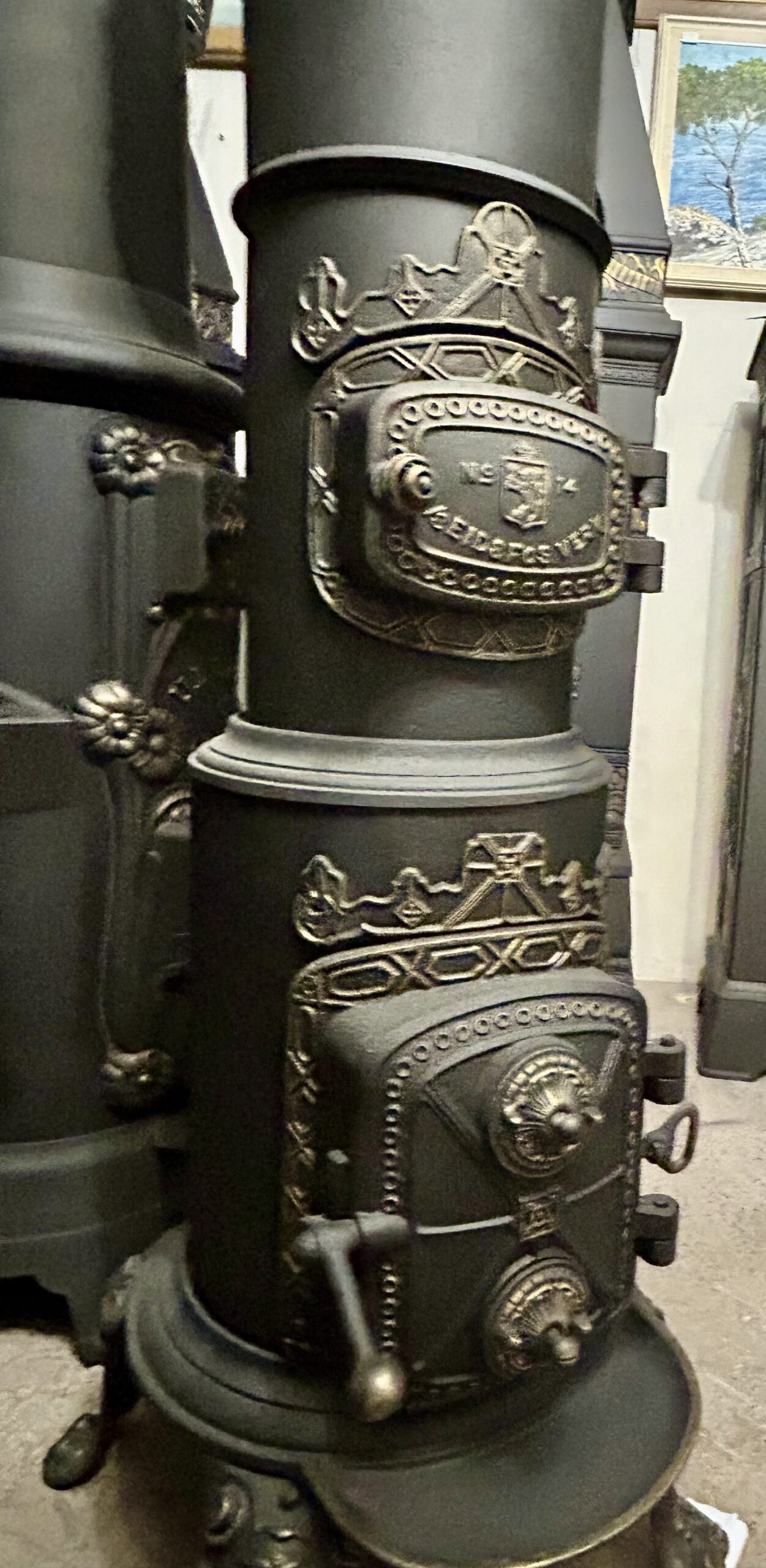 Elegancki piec żeliwny firmy A/S EIDSFOS VERK (model NO 14) to przykład kunsztownego rzemiosła i funkcjonalności. Wypiaskowany, trzykrotnie pomalowany farbą żaroodporną w czarnym kolorze oraz ozdobiony złotymi akcentami, zachwyca detalami, w tym koroną z motywem chłopca na szczycie.