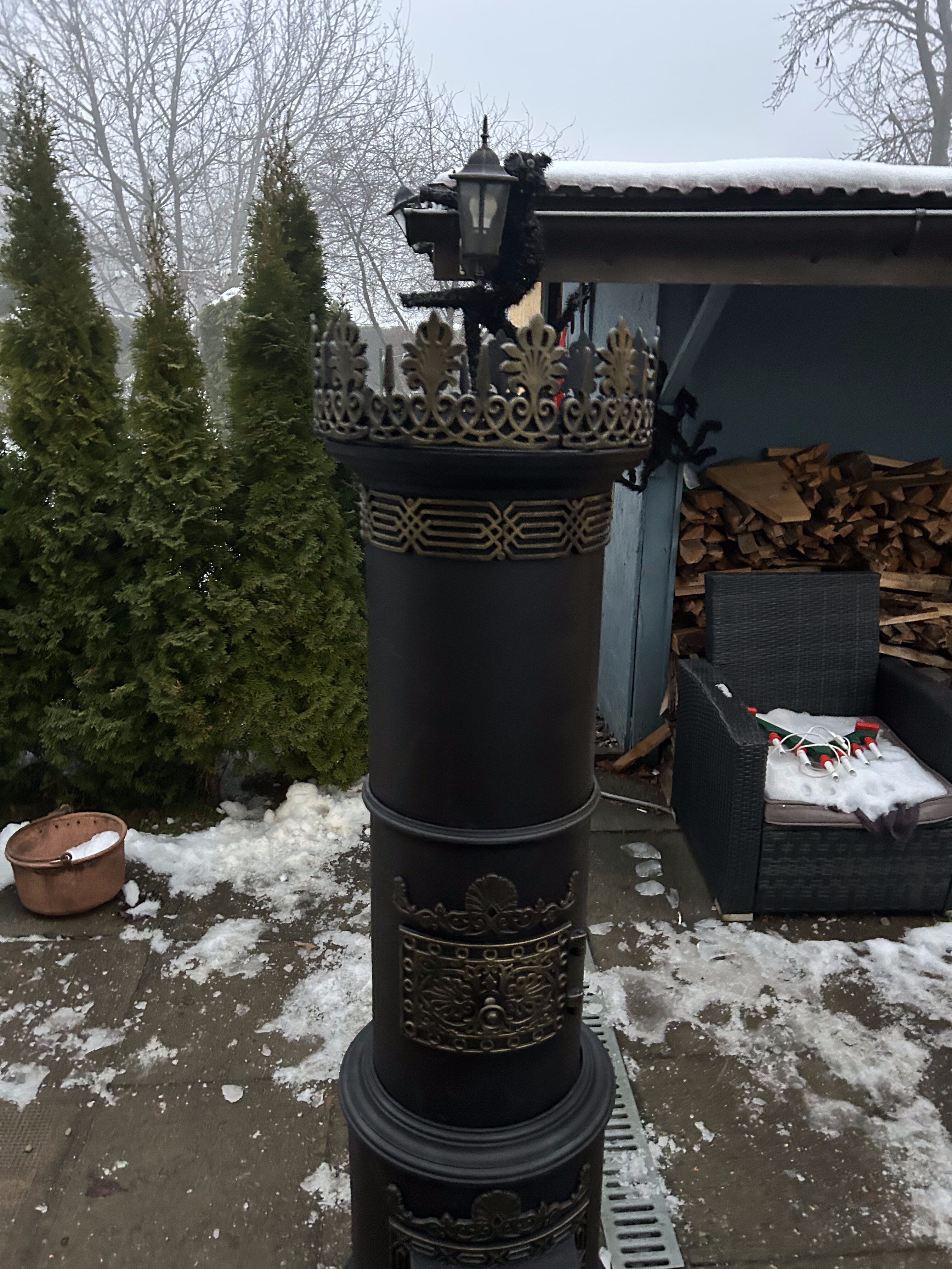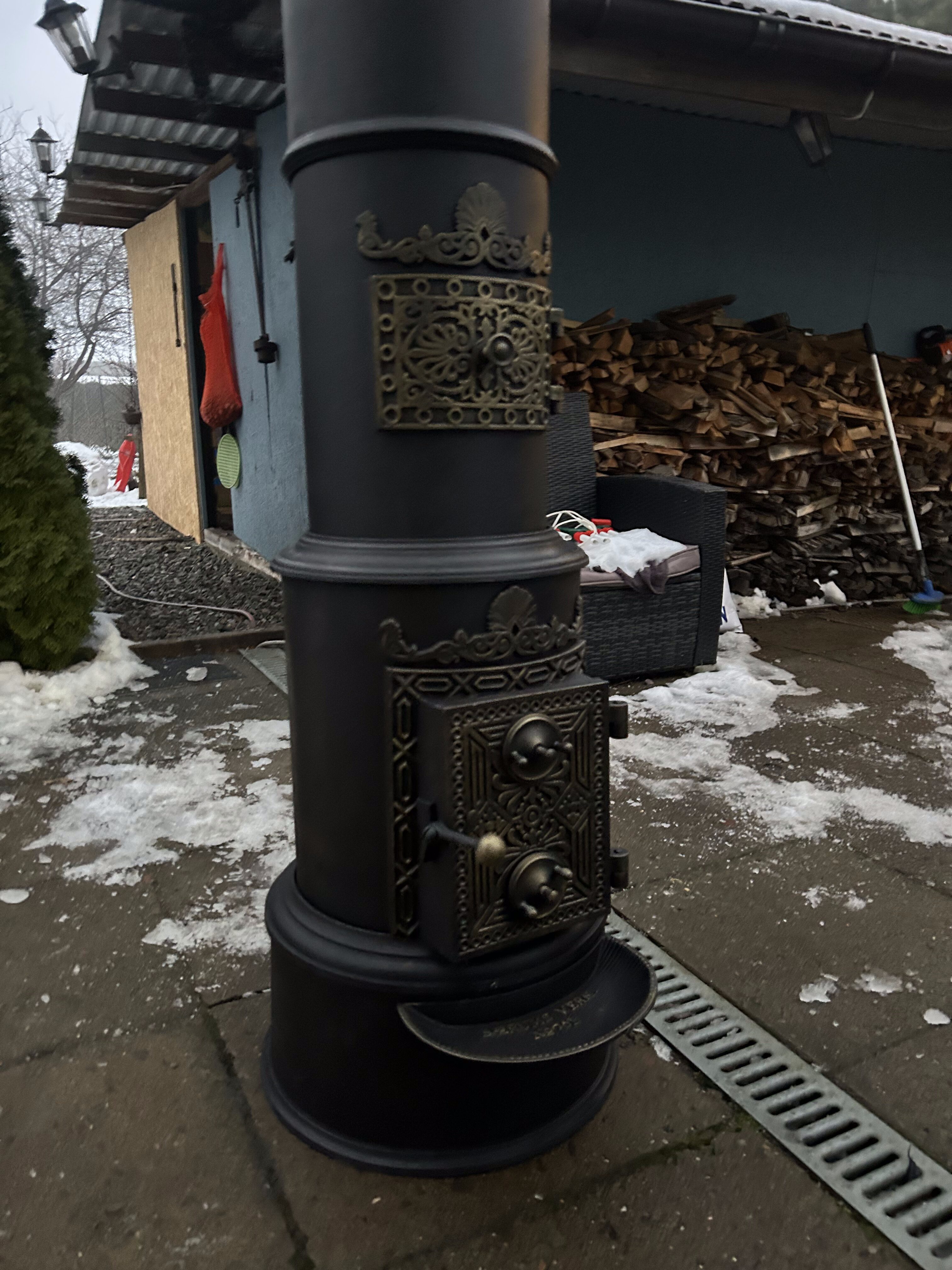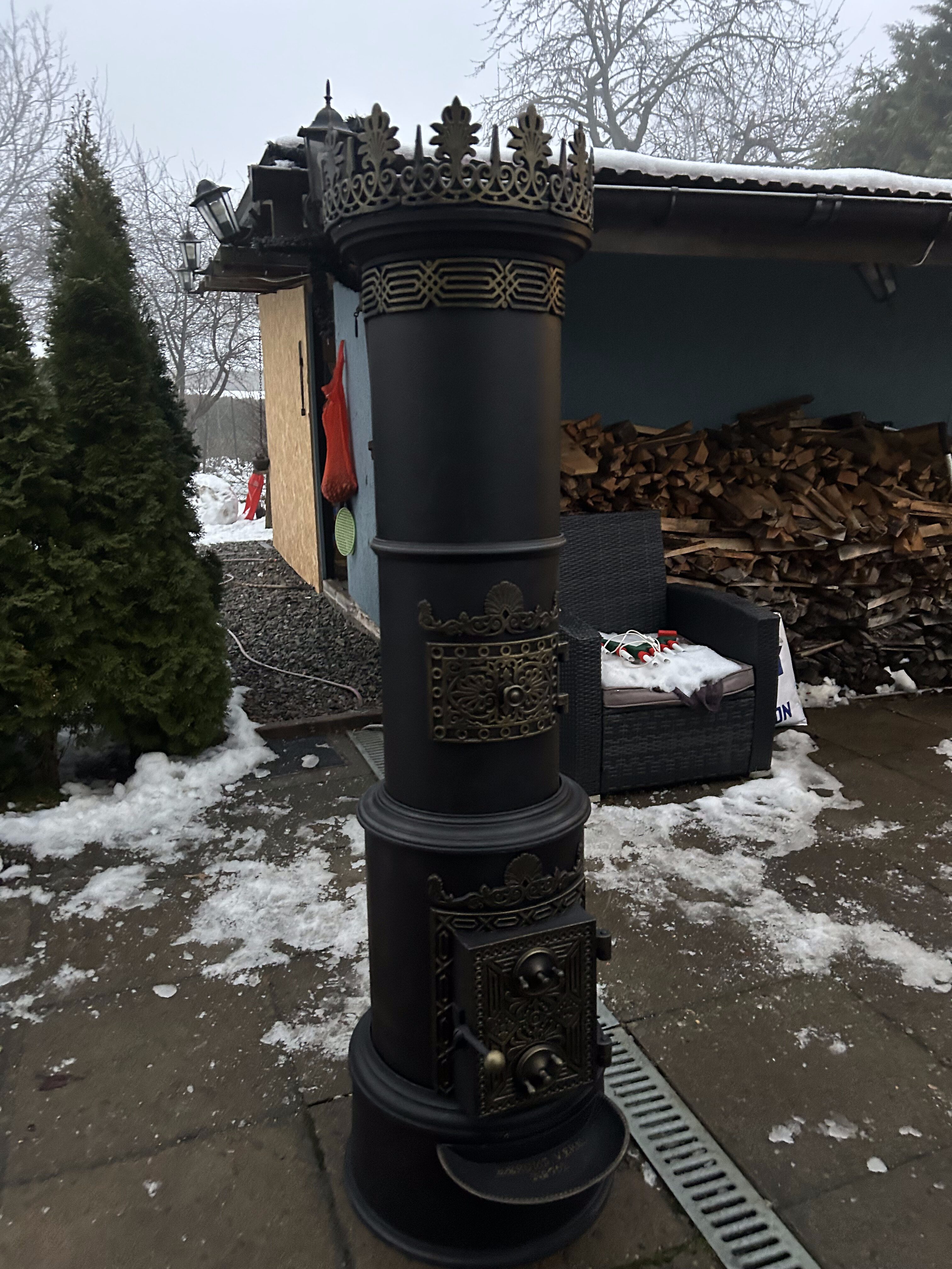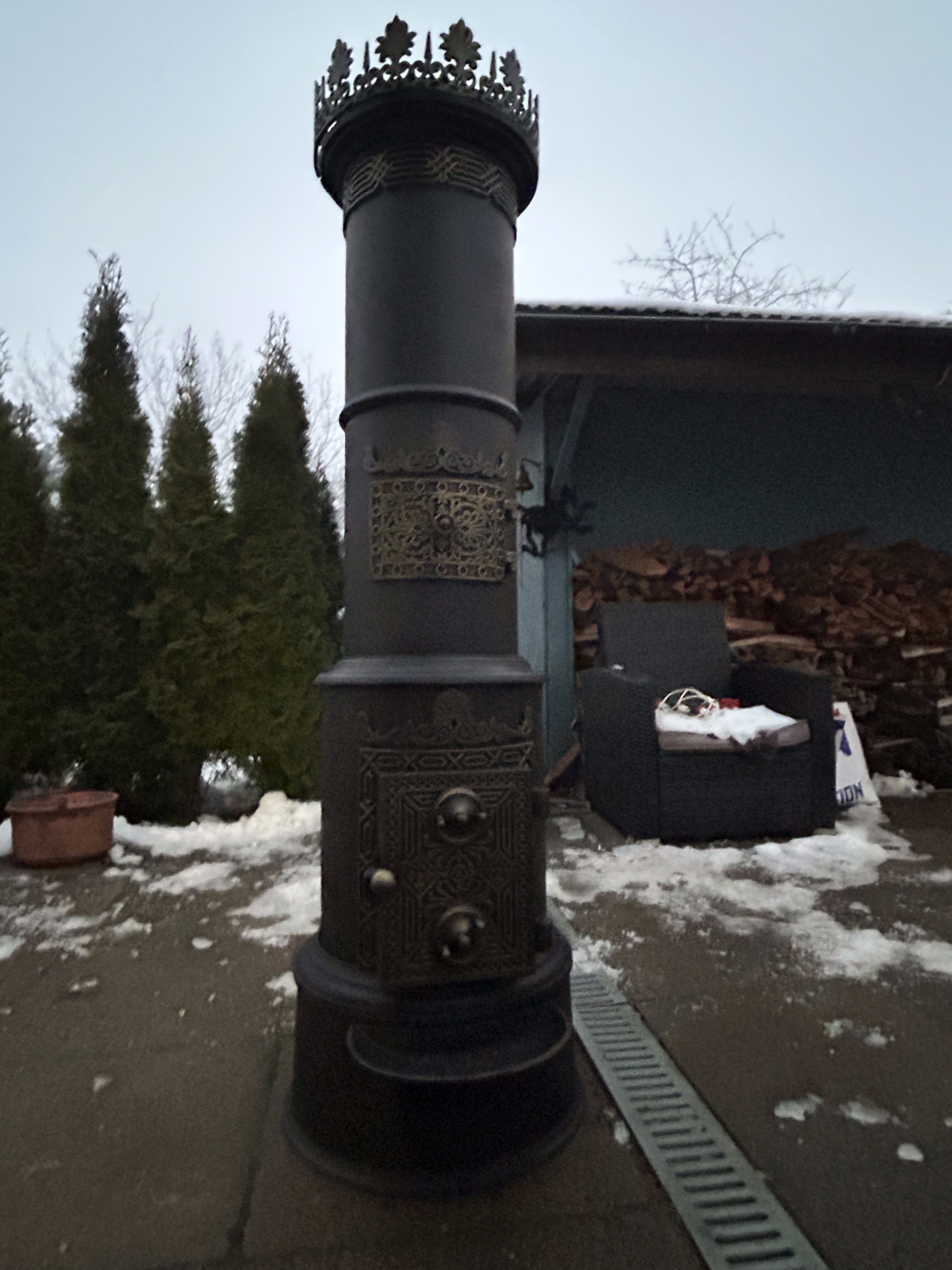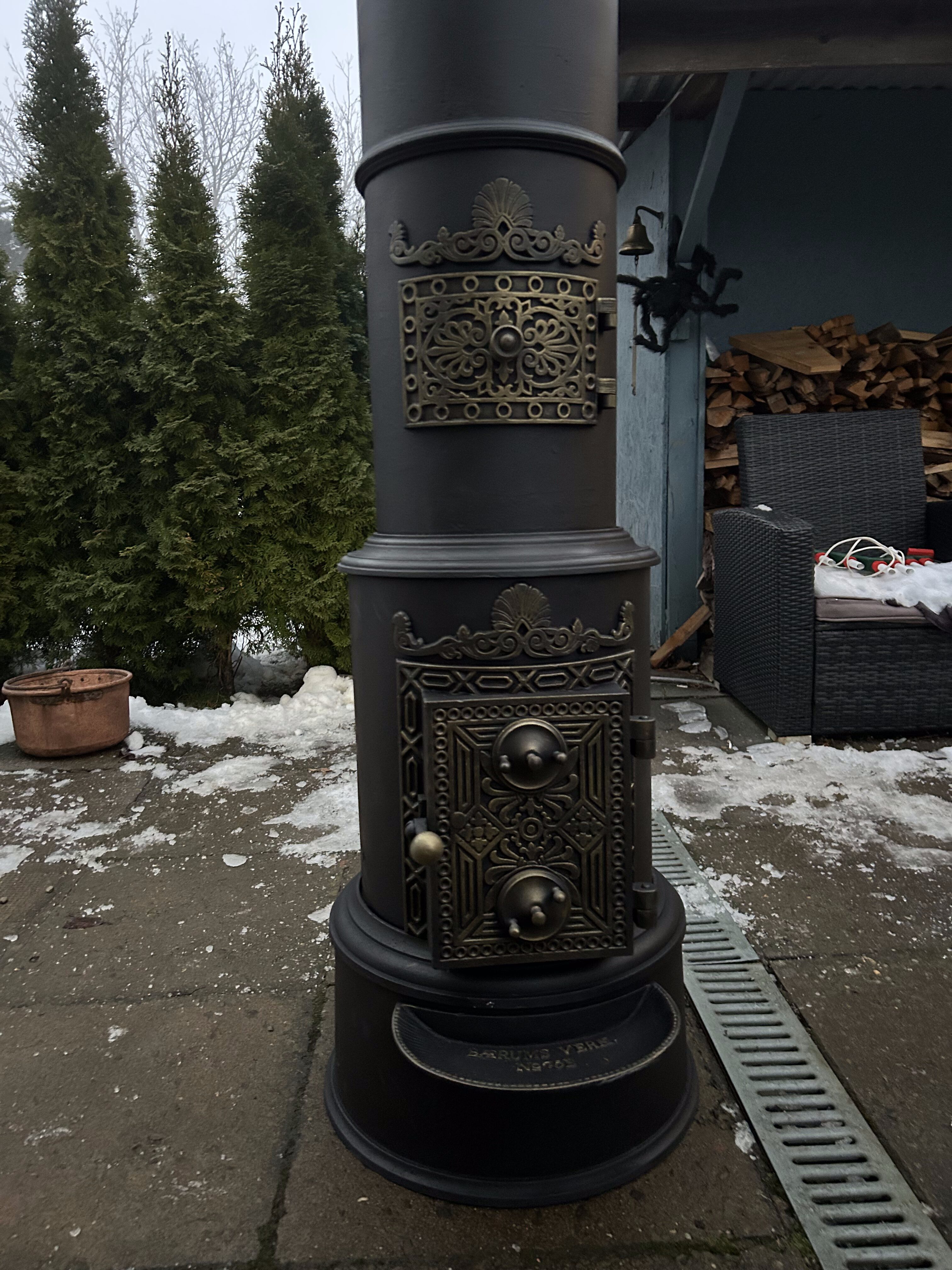 Piec został odrestaurowany z najwyższą starannością: wypiaskowany, trzykrotnie pokryty czarną farbą żaroodporną i subtelnie wykończony złotą farbą żaroodporną. Ozdobna korona – dostępna jako element dodatkowy – dodaje mu majestatycznego wyglądu i podkreśla jego antyczny charakter.