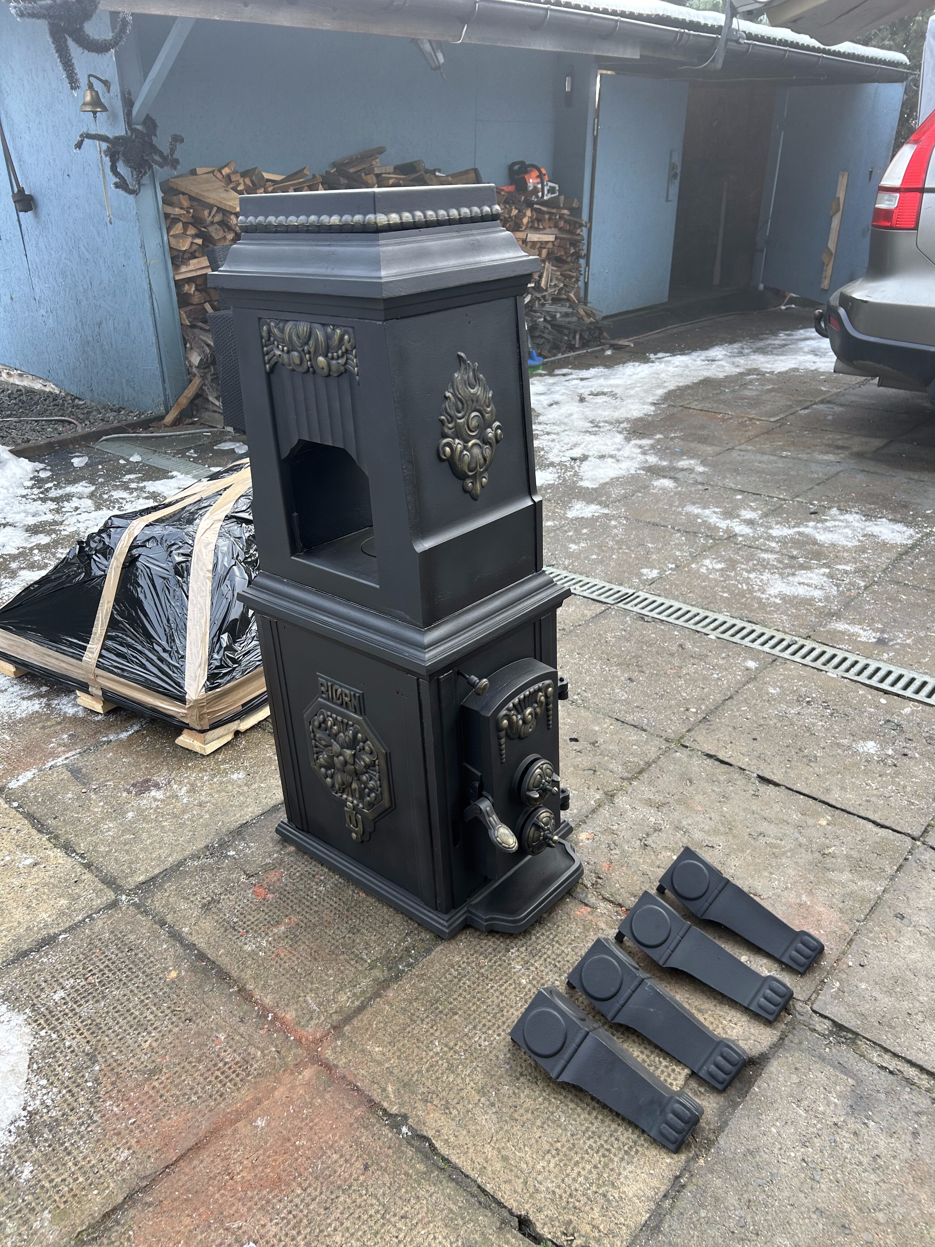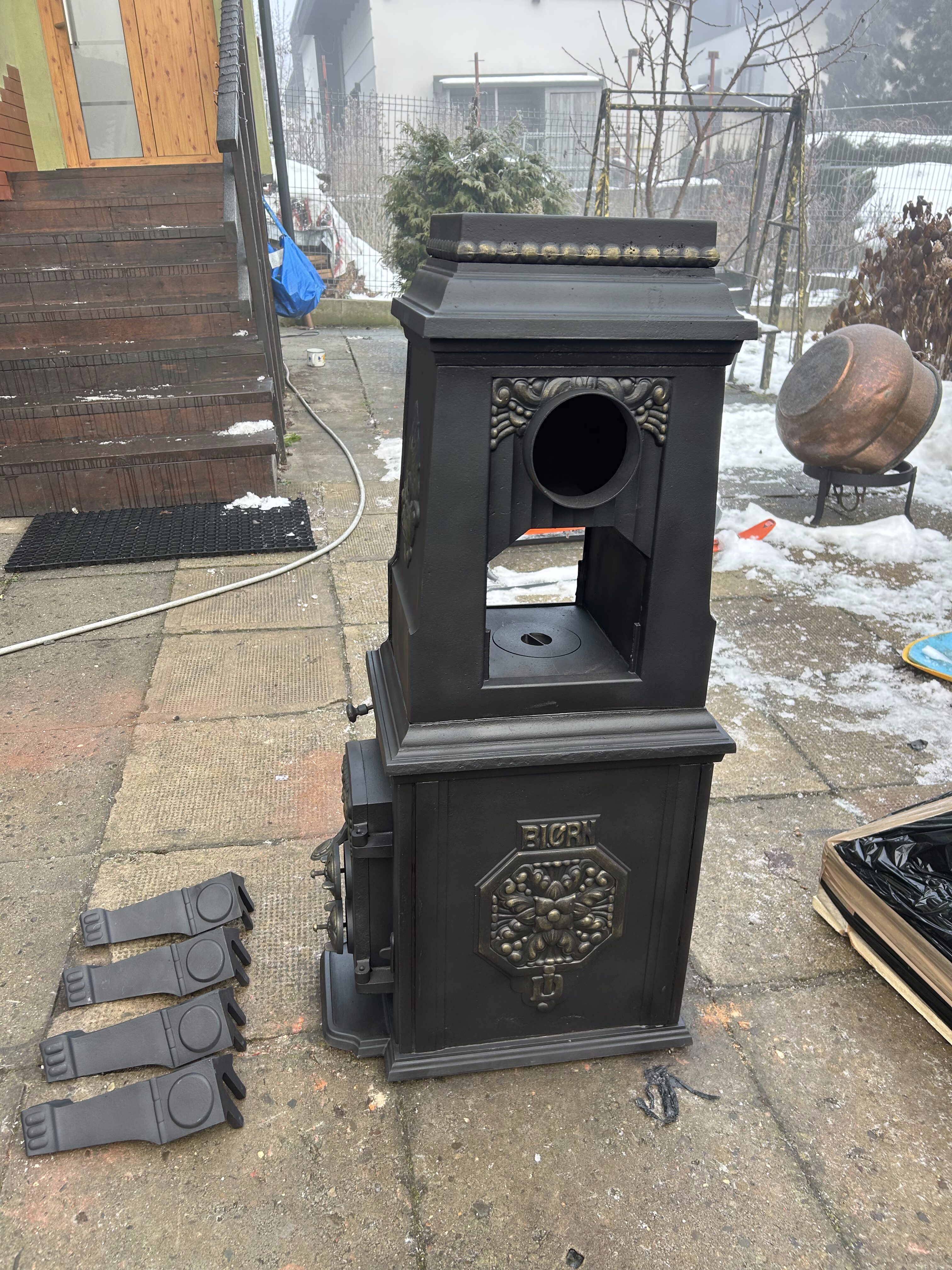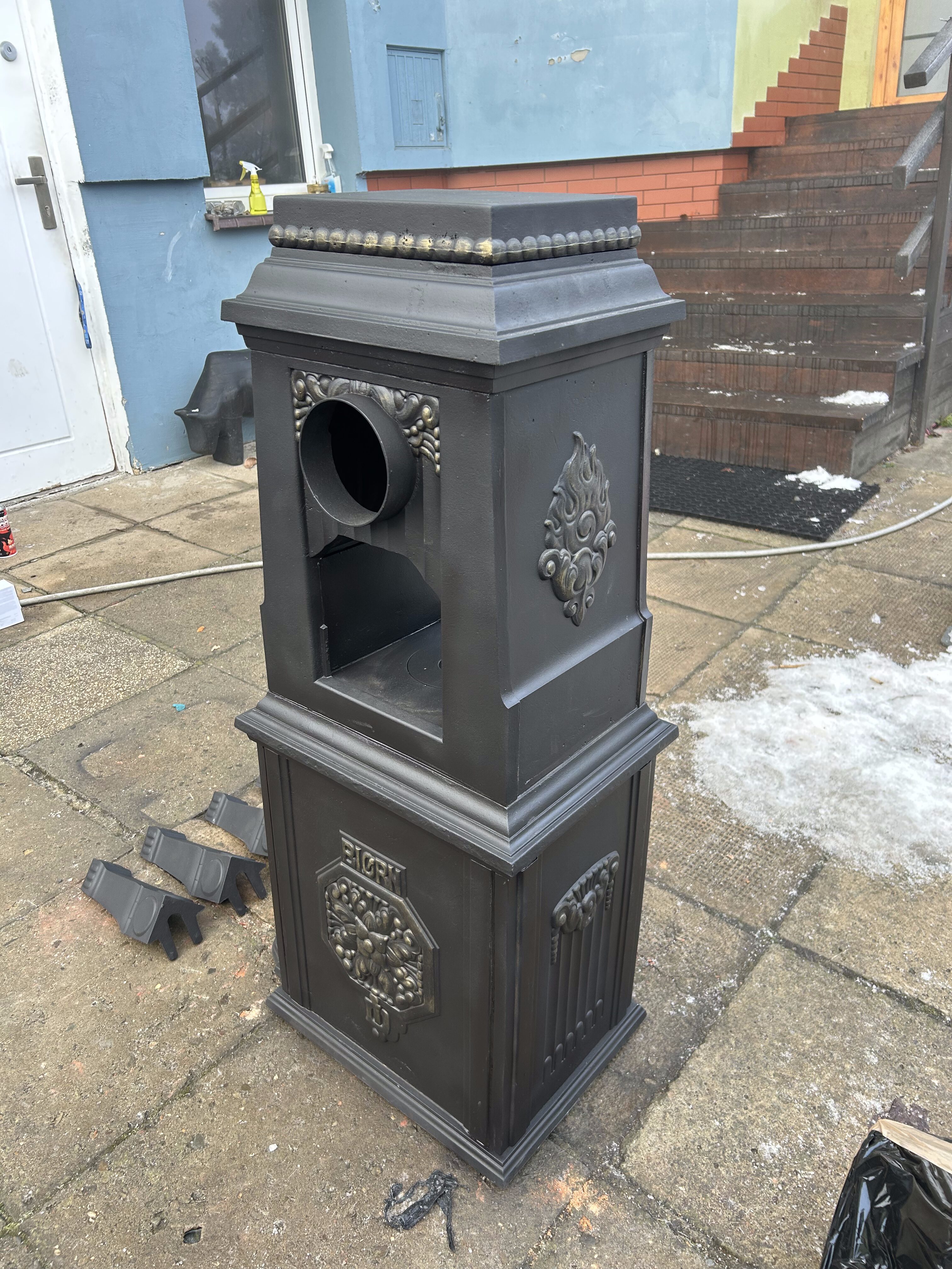 Piec został starannie wypiaskowany, trzykrotnie pomalowany czarną farbą żaroodporną oraz ozdobiony złotą farbą żaroodporną, która elegancko podkreśla motywy zdobnicze na drzwiczkach oraz panelach bocznych. Boczny wylot spalin zwiększa możliwości ustawienia pieca we wnętrzu i ułatwia montaż.