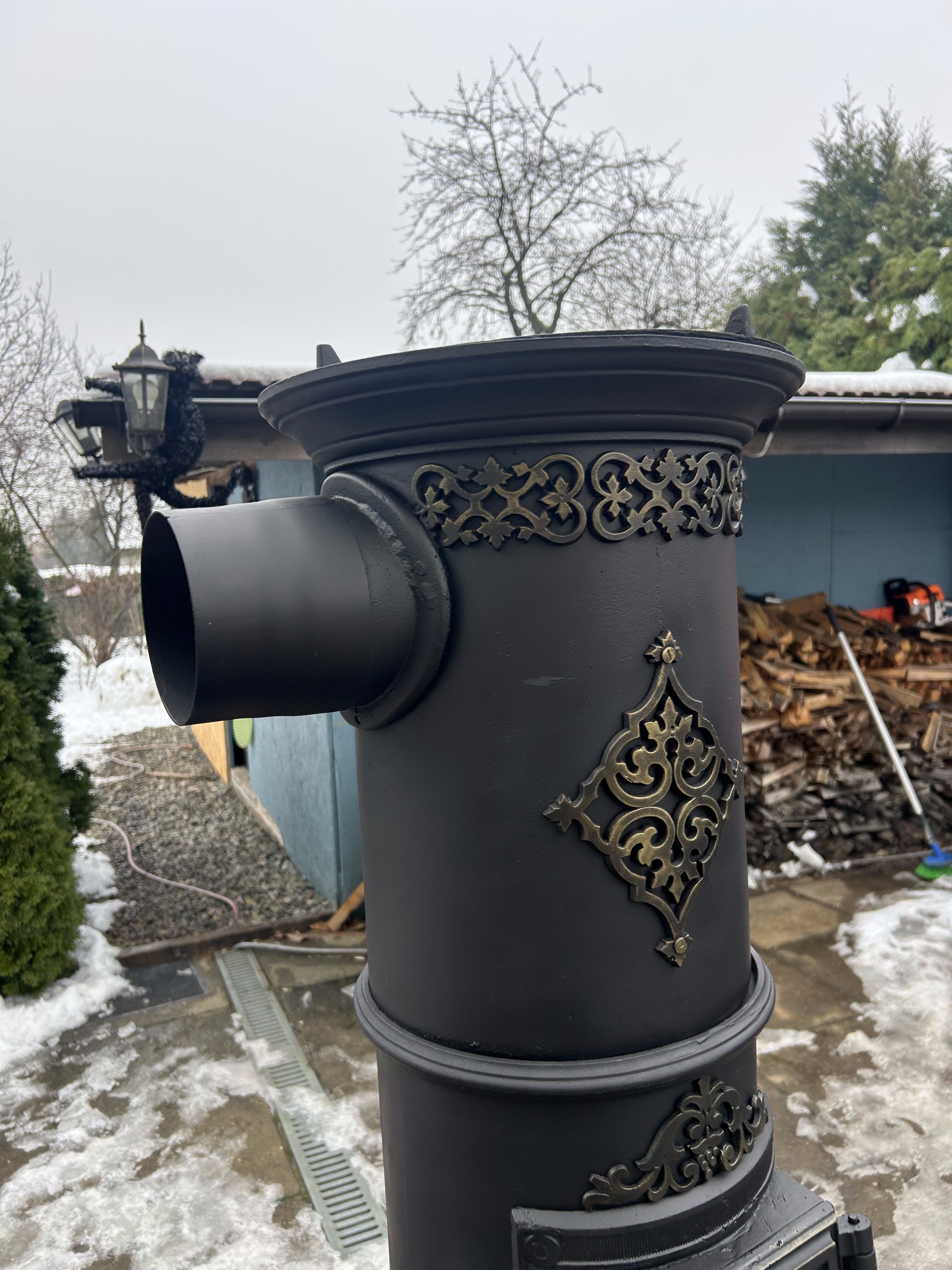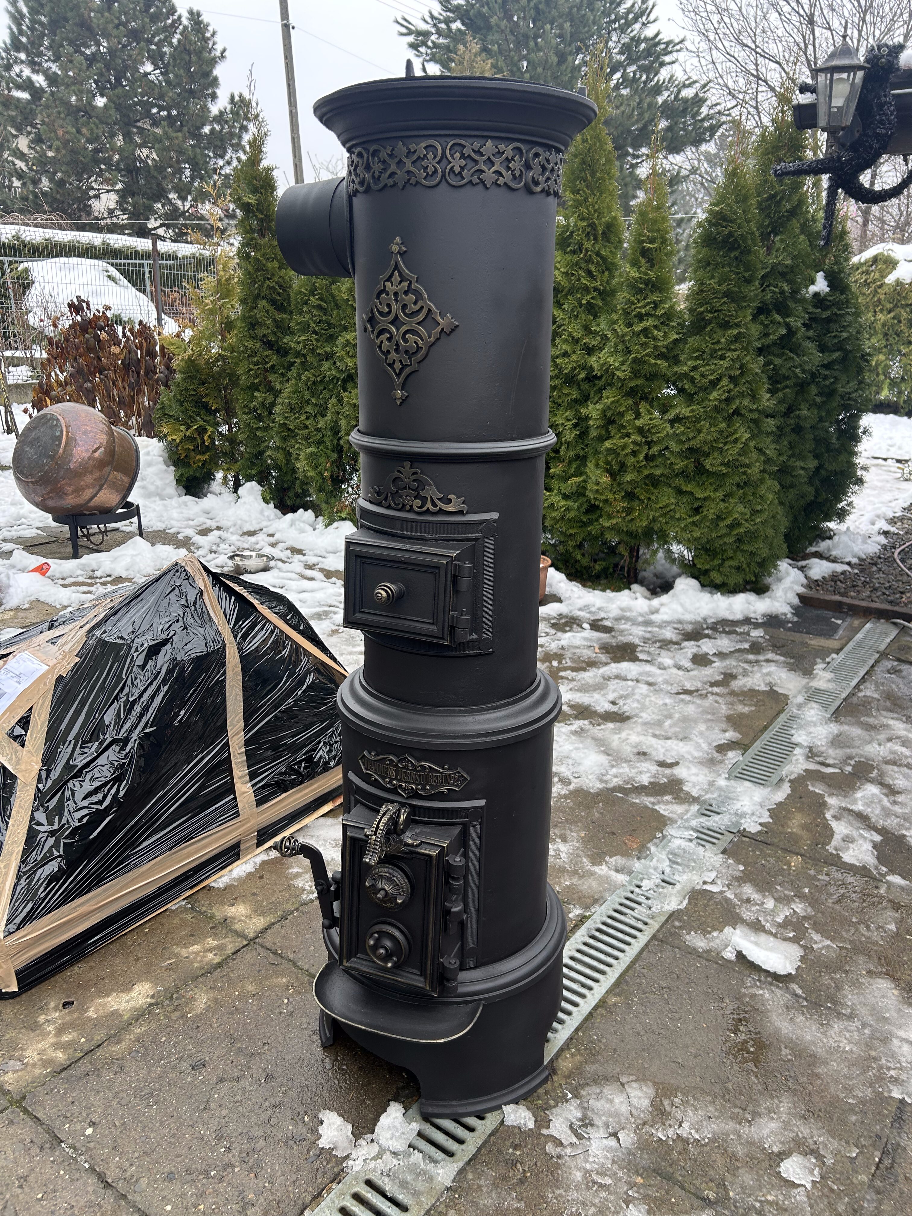 Piec został starannie odrestaurowany, wypiaskowany i trzykrotnie pomalowany czarną farbą żaroodporną, a detale zostały dopracowane złotą farbą żaroodporną. Model posiada boczny wylot spalin, co czyni go funkcjonalnym w aranżacji różnego typu pomieszczeń. Na szczególną uwagę zasługuje oryginalna rączka dolnych drzwiczek – nietypowy element dekoracyjny, który nadaje piecowi indywidualnego charakteru.