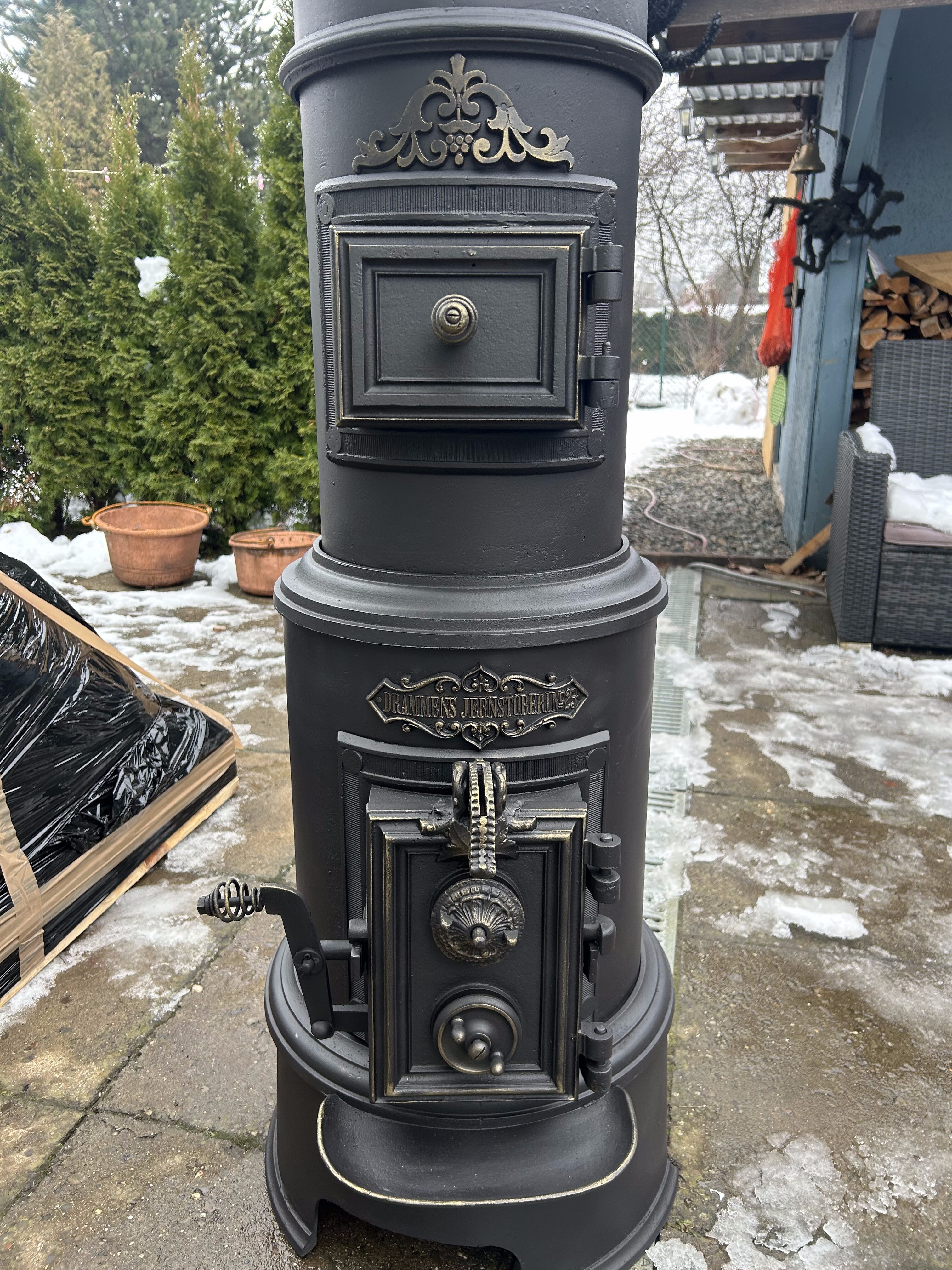 Oryginalny piec żeliwny Jotul Drammens Jernstøberi, model nr 23, należący do najbardziej cenionych norweskich konstrukcji dawnych odlewni. Ten egzemplarz wyróżnia się wyjątkowo bogatymi zdobieniami – zarówno na drzwiczkach, jak i na cylindrycznym korpusie – które podkreślają secesyjny charakter i mistrzostwo rzemiosła skandynawskiego.