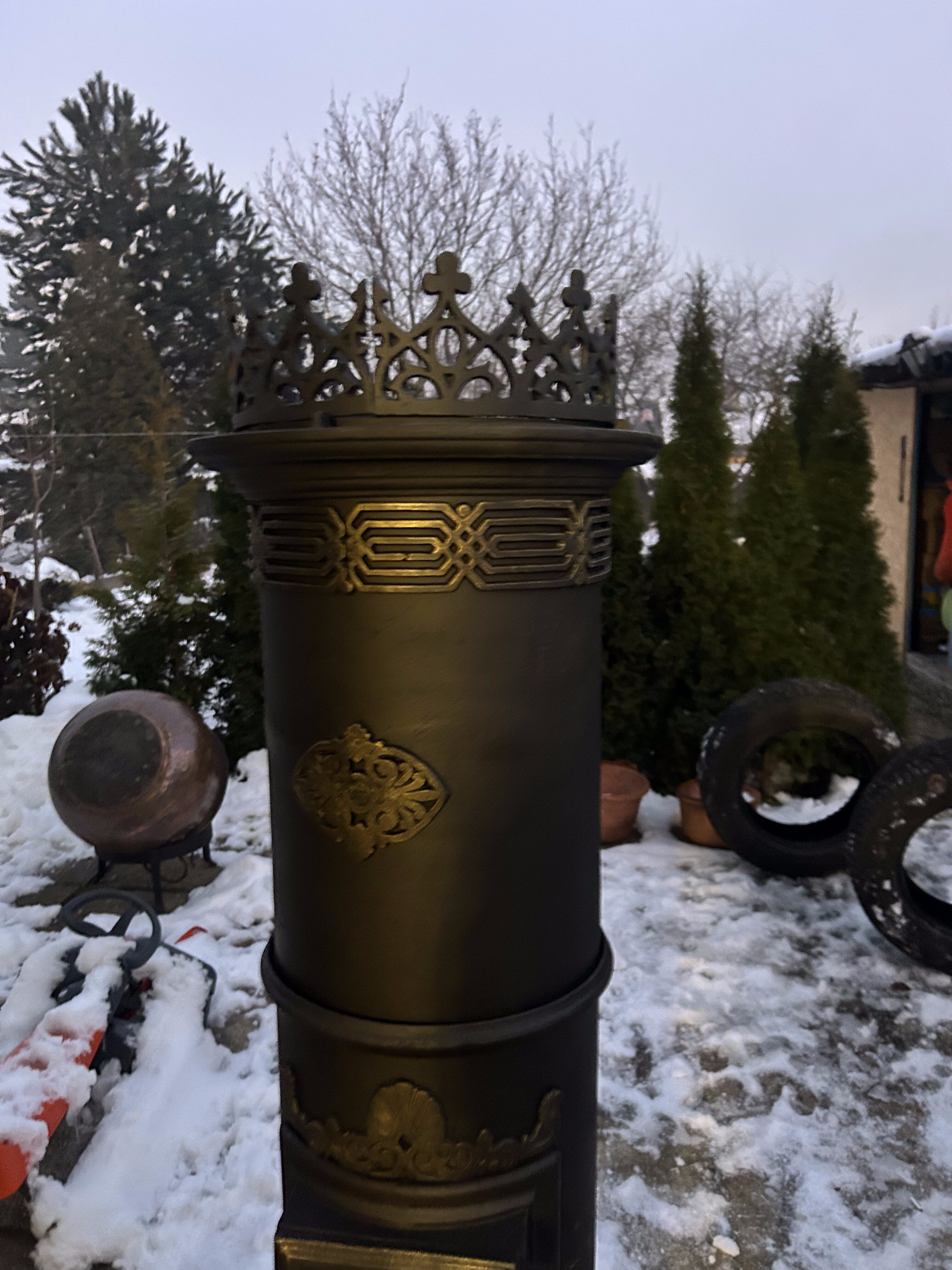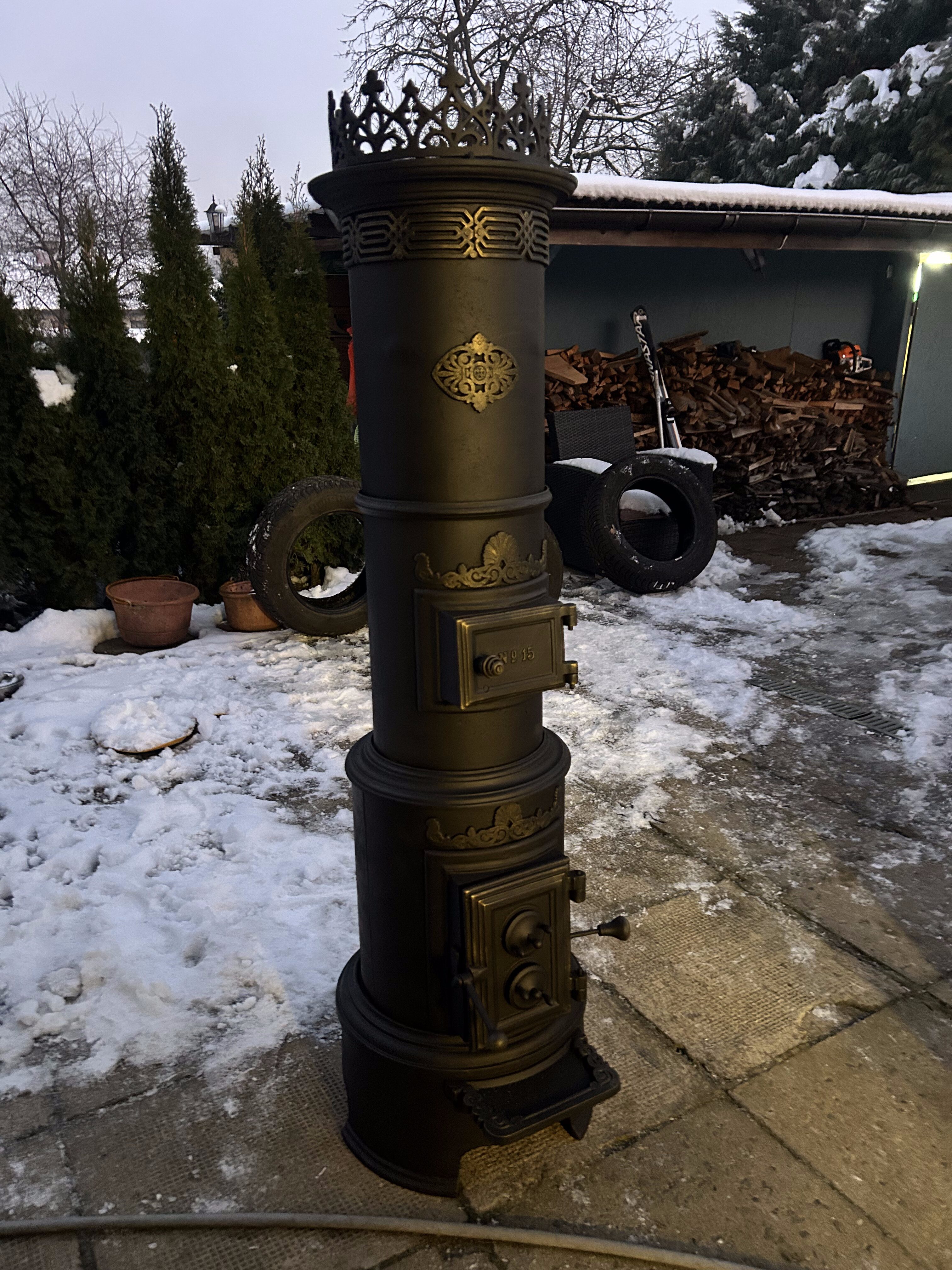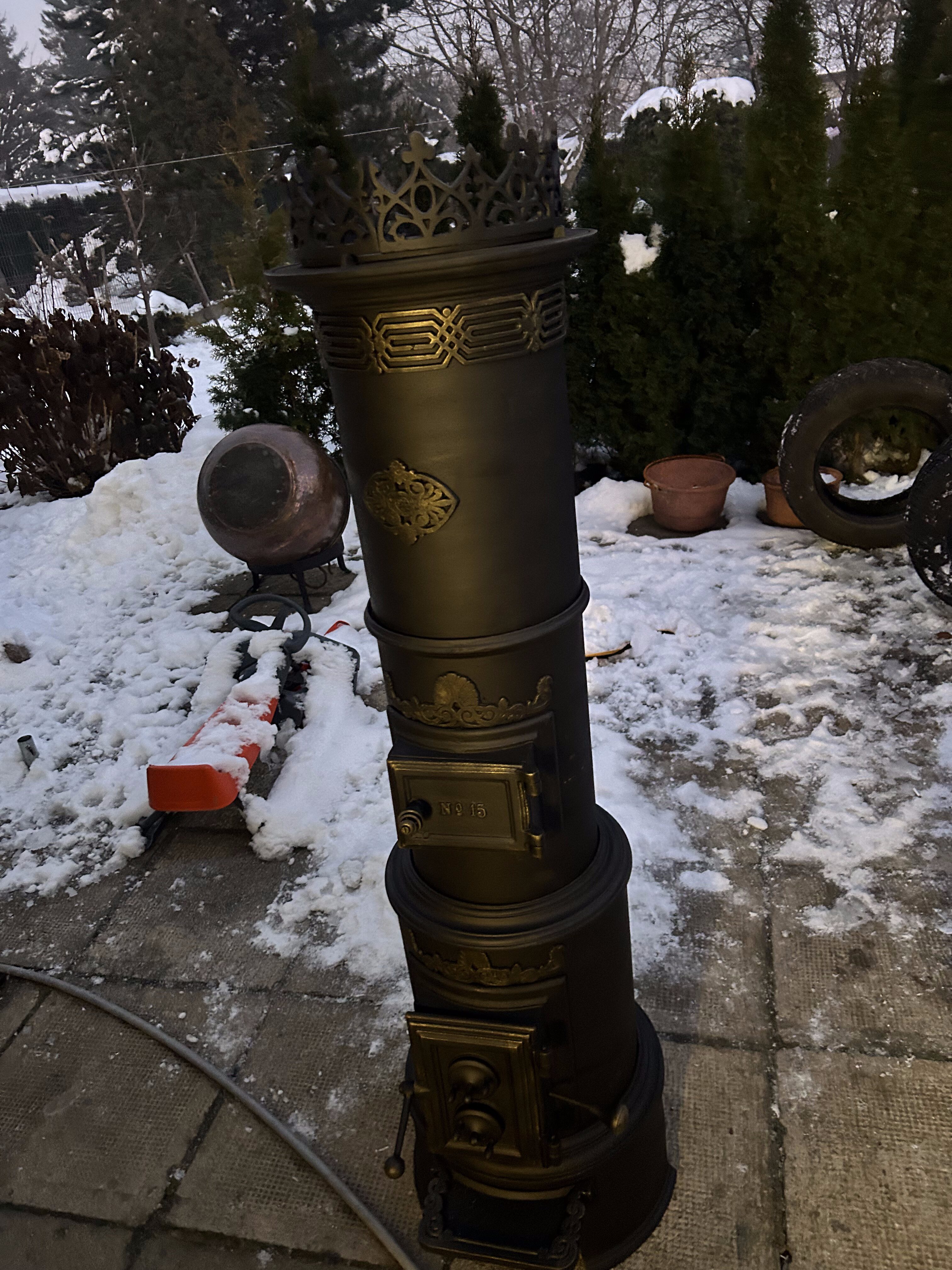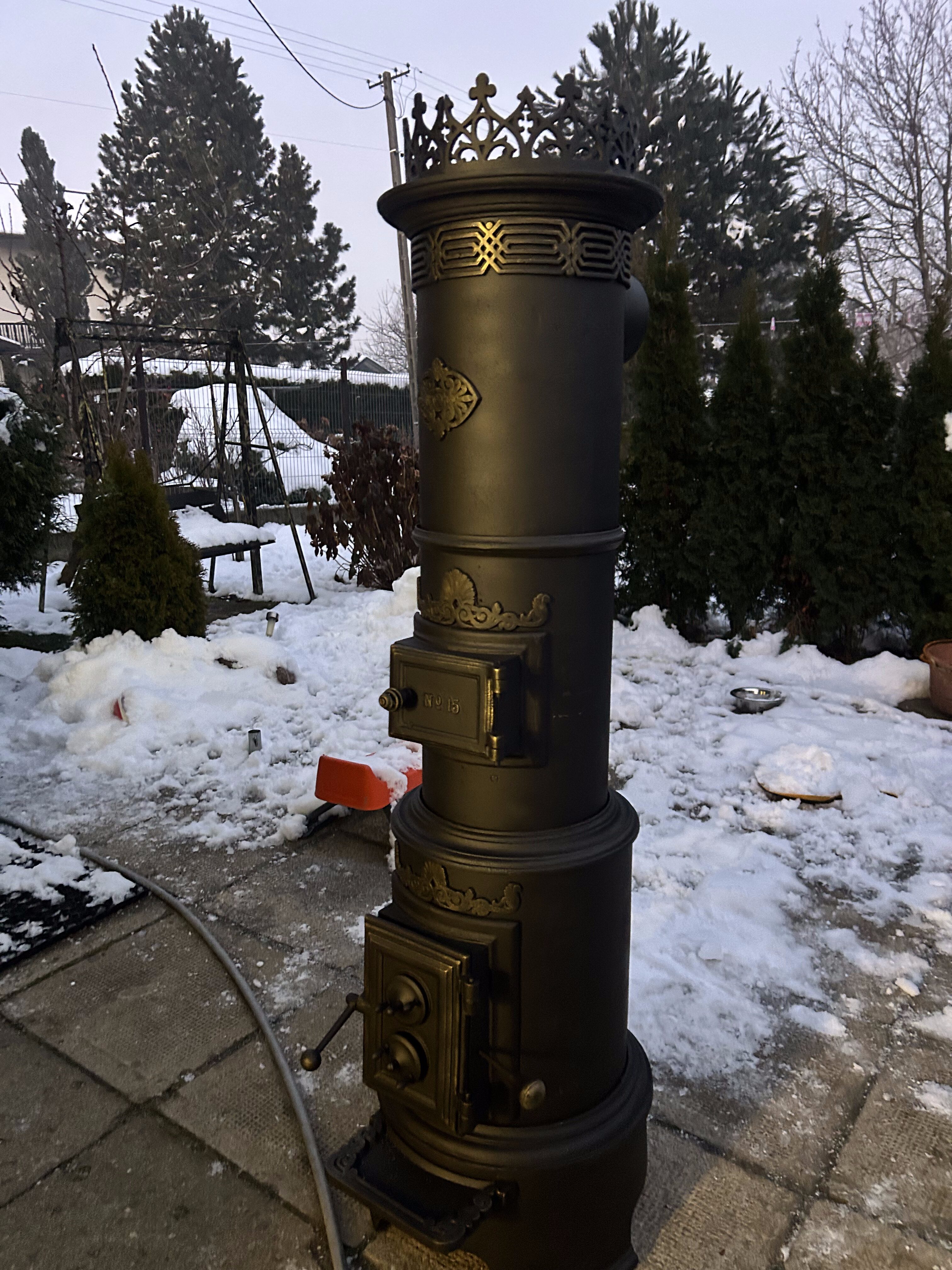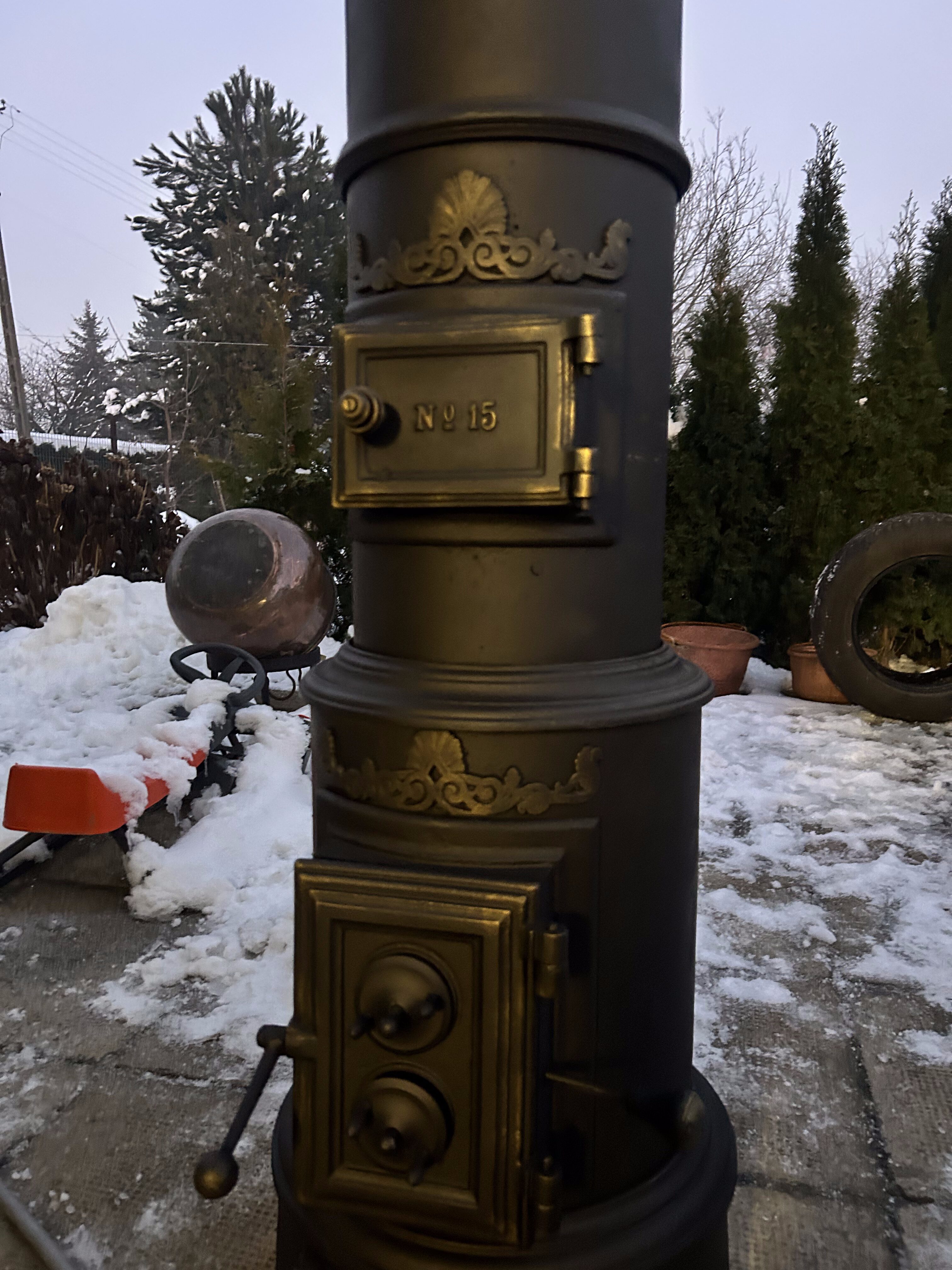 Piec został odrestaurowany z zachowaniem najwyższej staranności: wypiaskowany, trzykrotnie pomalowany czarną farbą żaroodporną oraz ozdobiony subtelnymi akcentami złotej farby żaroodpornej. Korona (opcjonalna, za dopłatą) nadaje całości efektownego charakteru, pozostając jednocześnie spójną z oryginalnym stylem pieca.