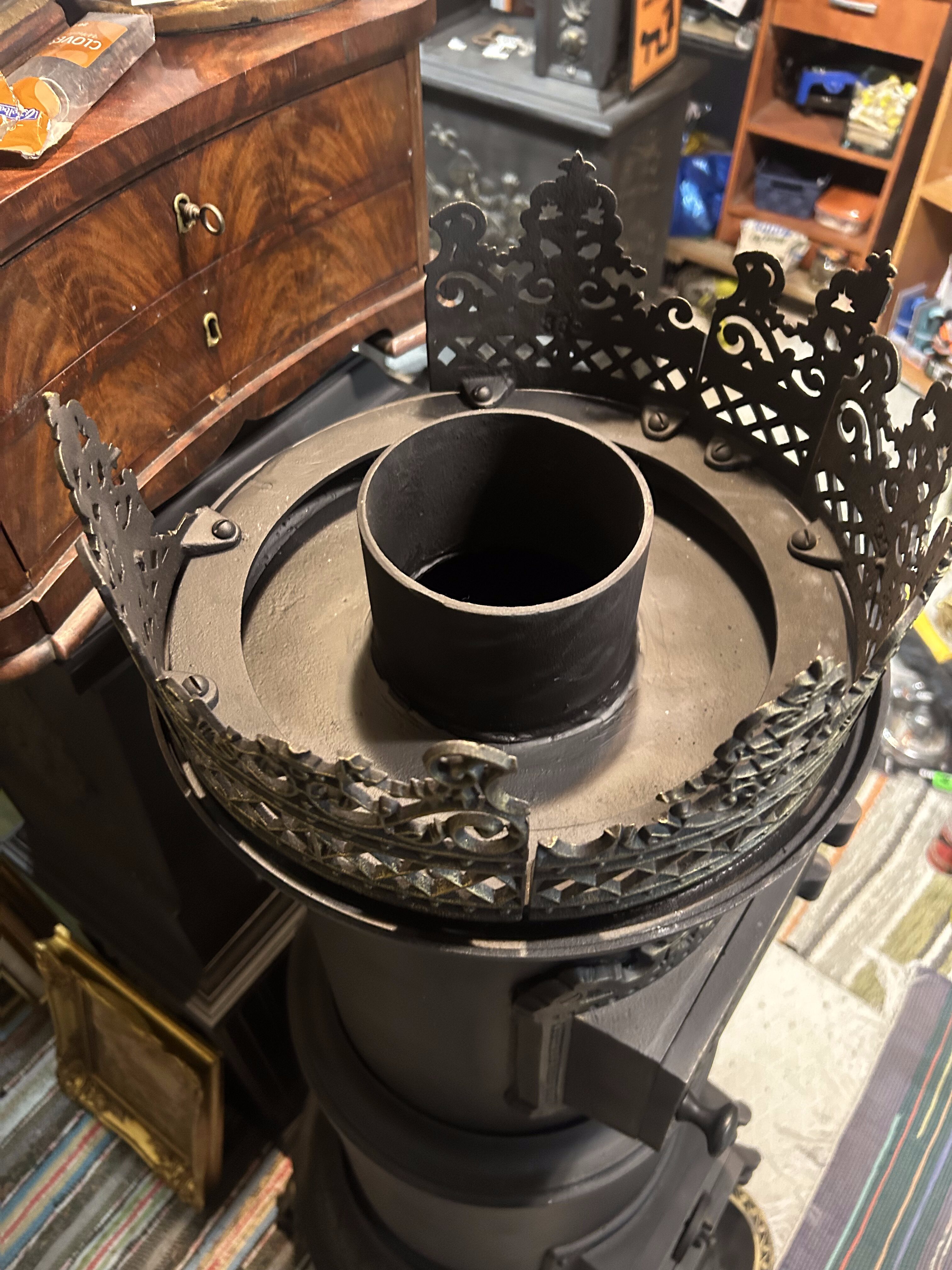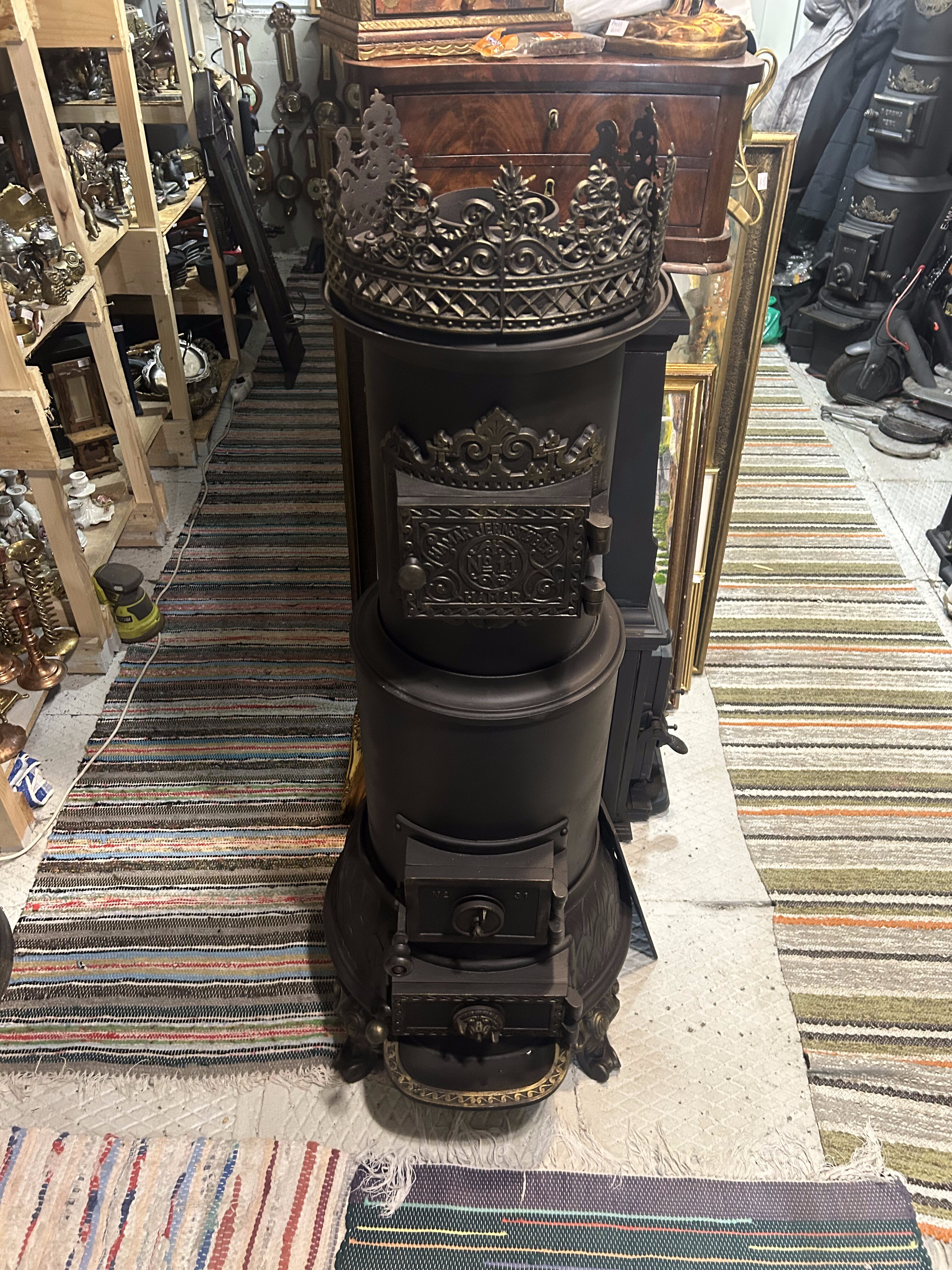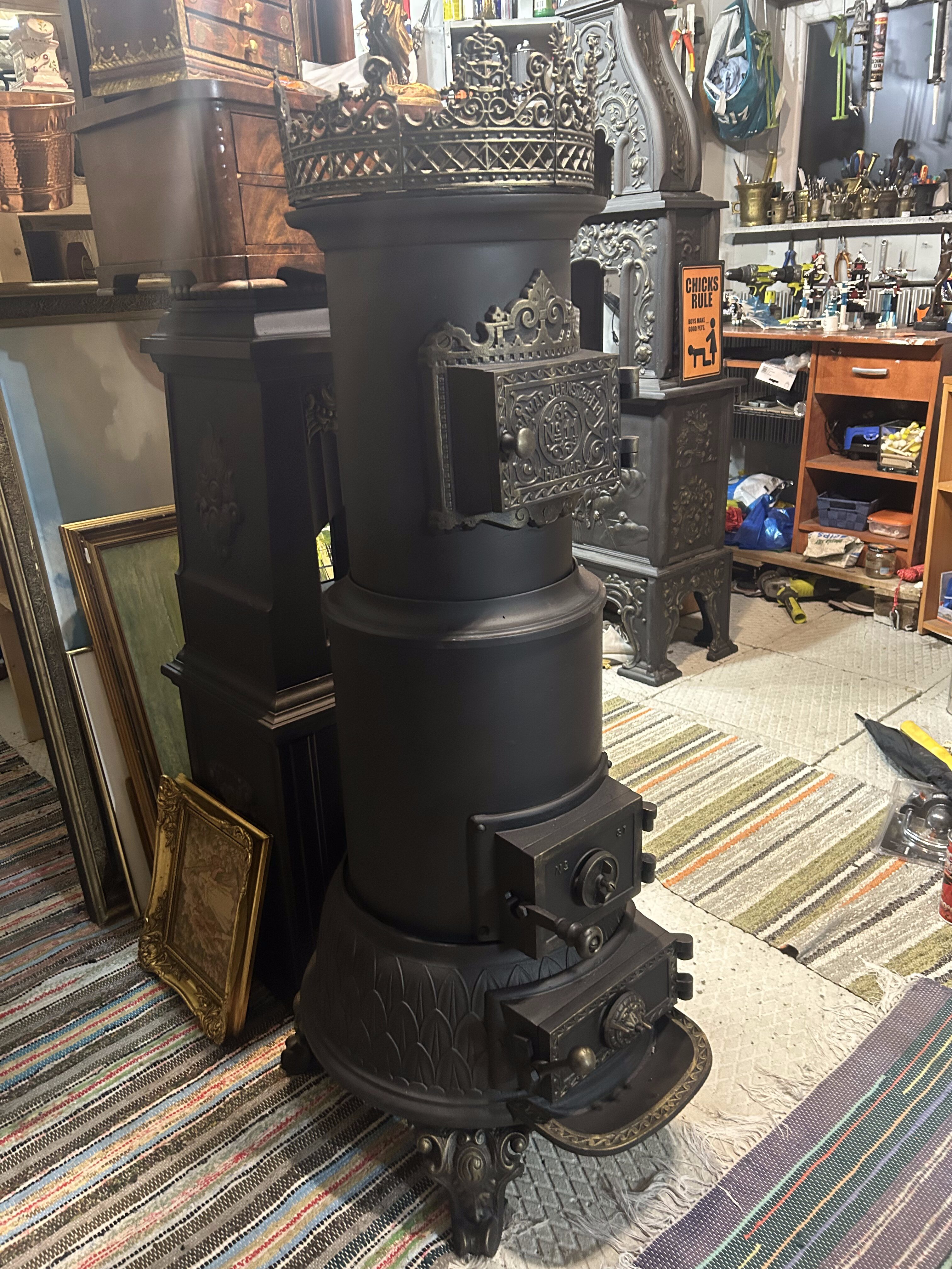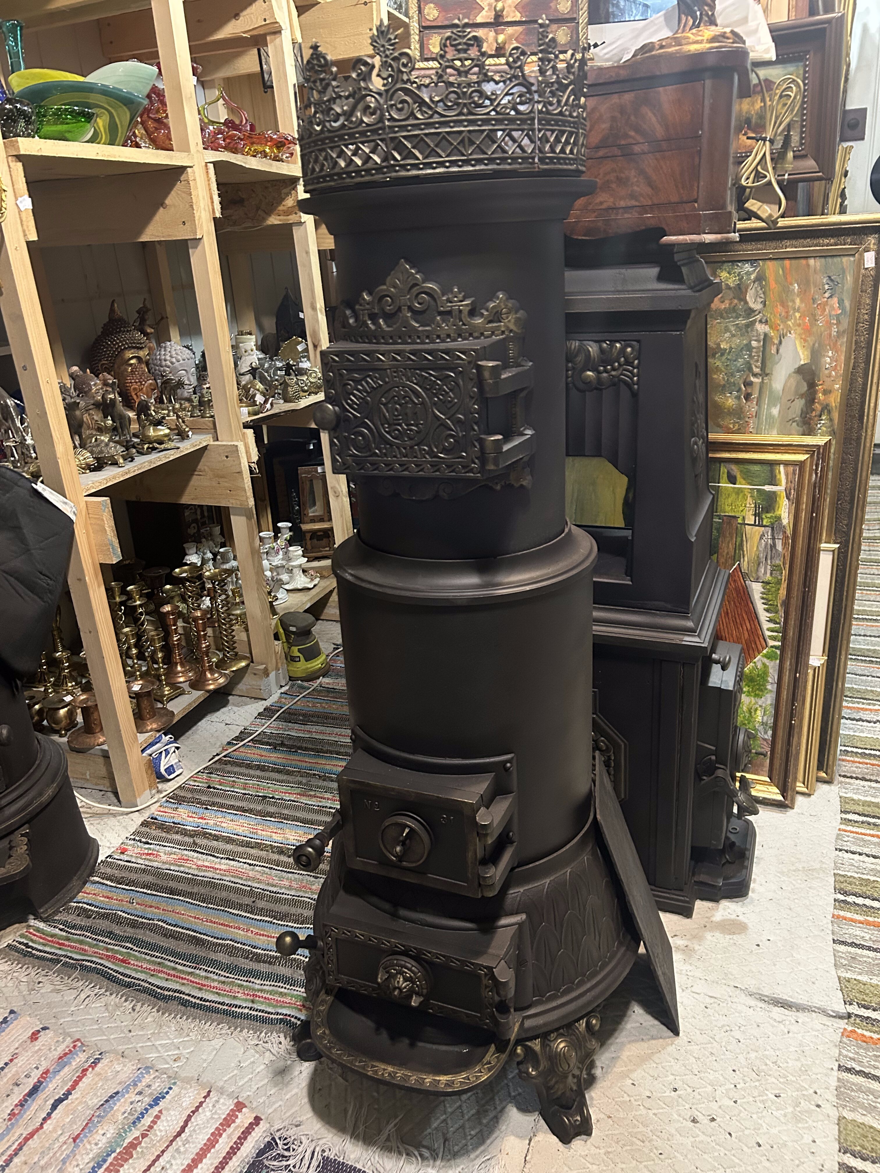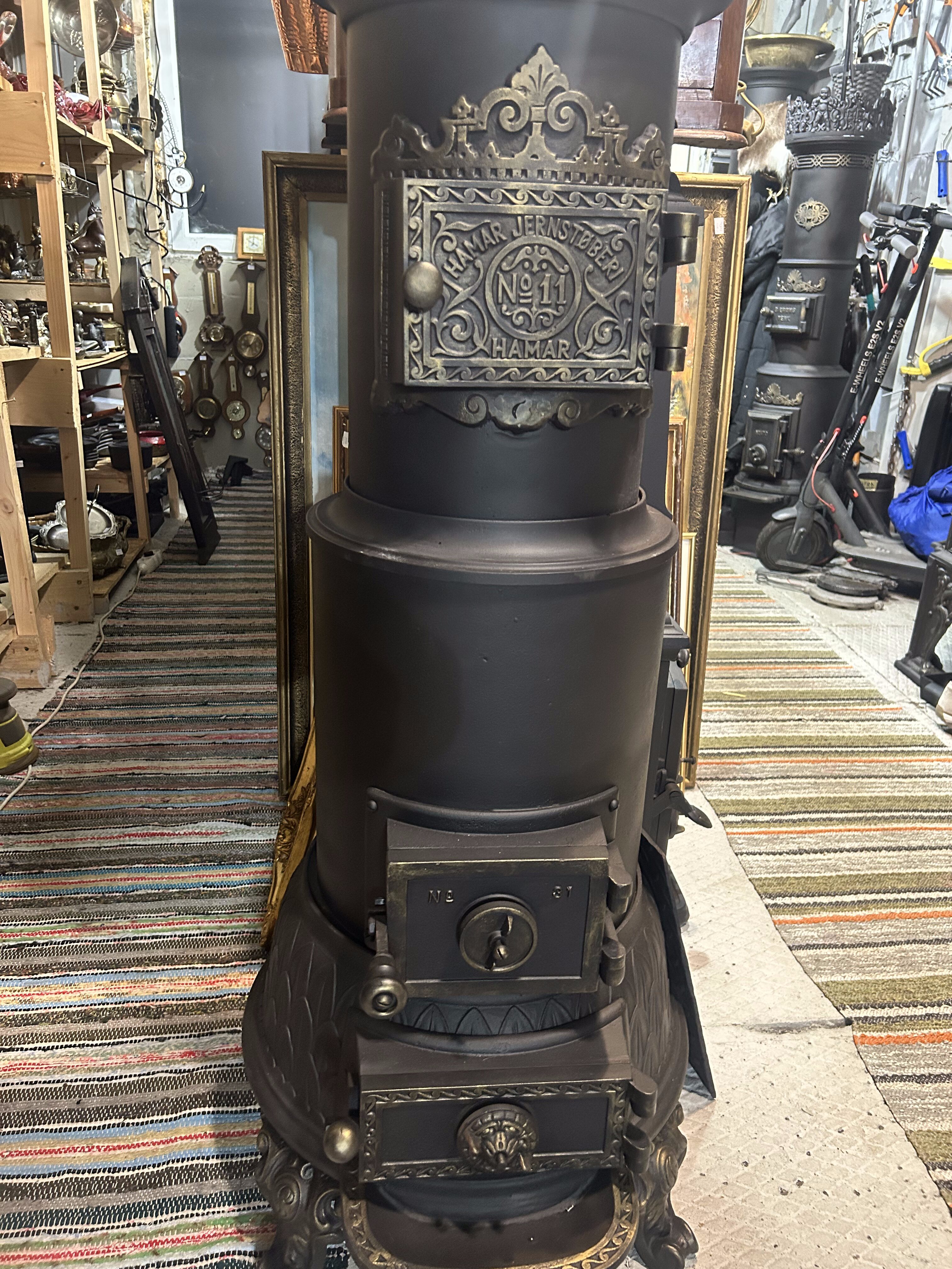 Oryginalny, zabytkowy piec żeliwny pochodzenia norweskiego, sygnowany napisem Hamar Jernstøberi nr 11. Solidna, masywna forma oraz bogate zdobienia czynią z niego nie tylko wydajne źródło ciepła, ale również wyjątkowy element wystroju wnętrza. Piec zachowany w bardzo dobrym stanie, po kompleksowej renowacji, gotowy do dalszego użytkowania lub ekspozycji.